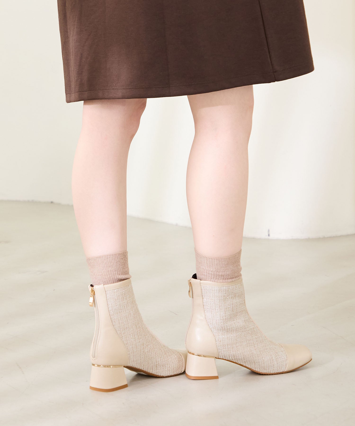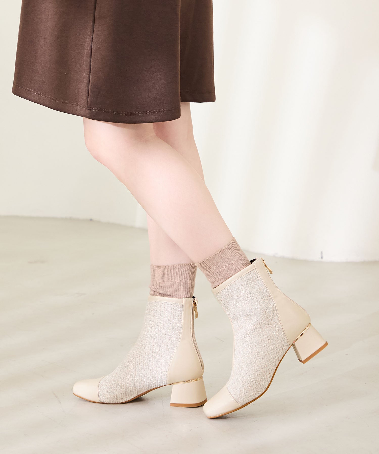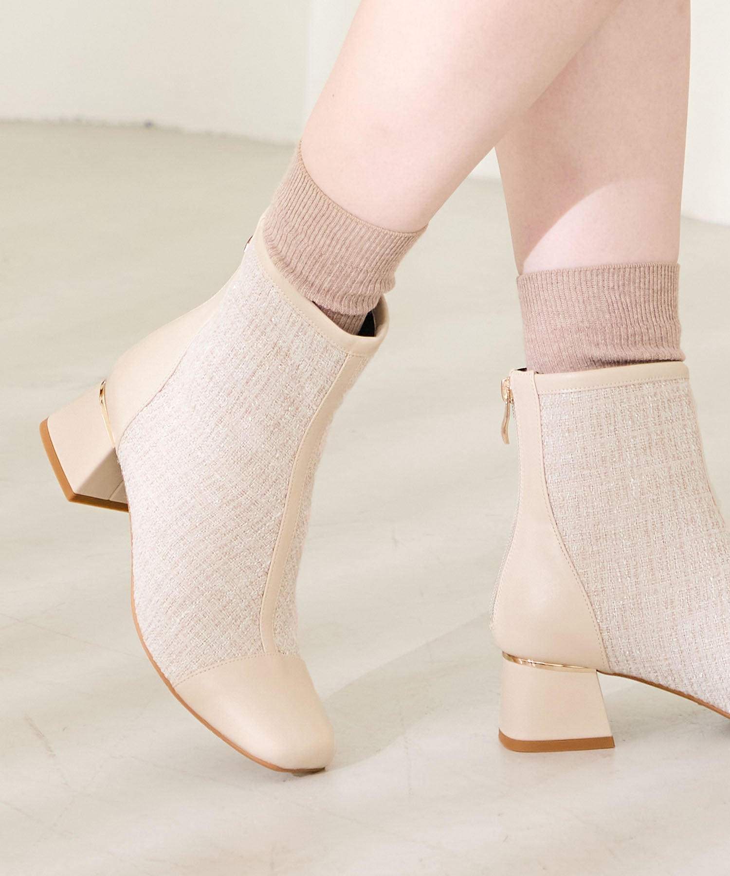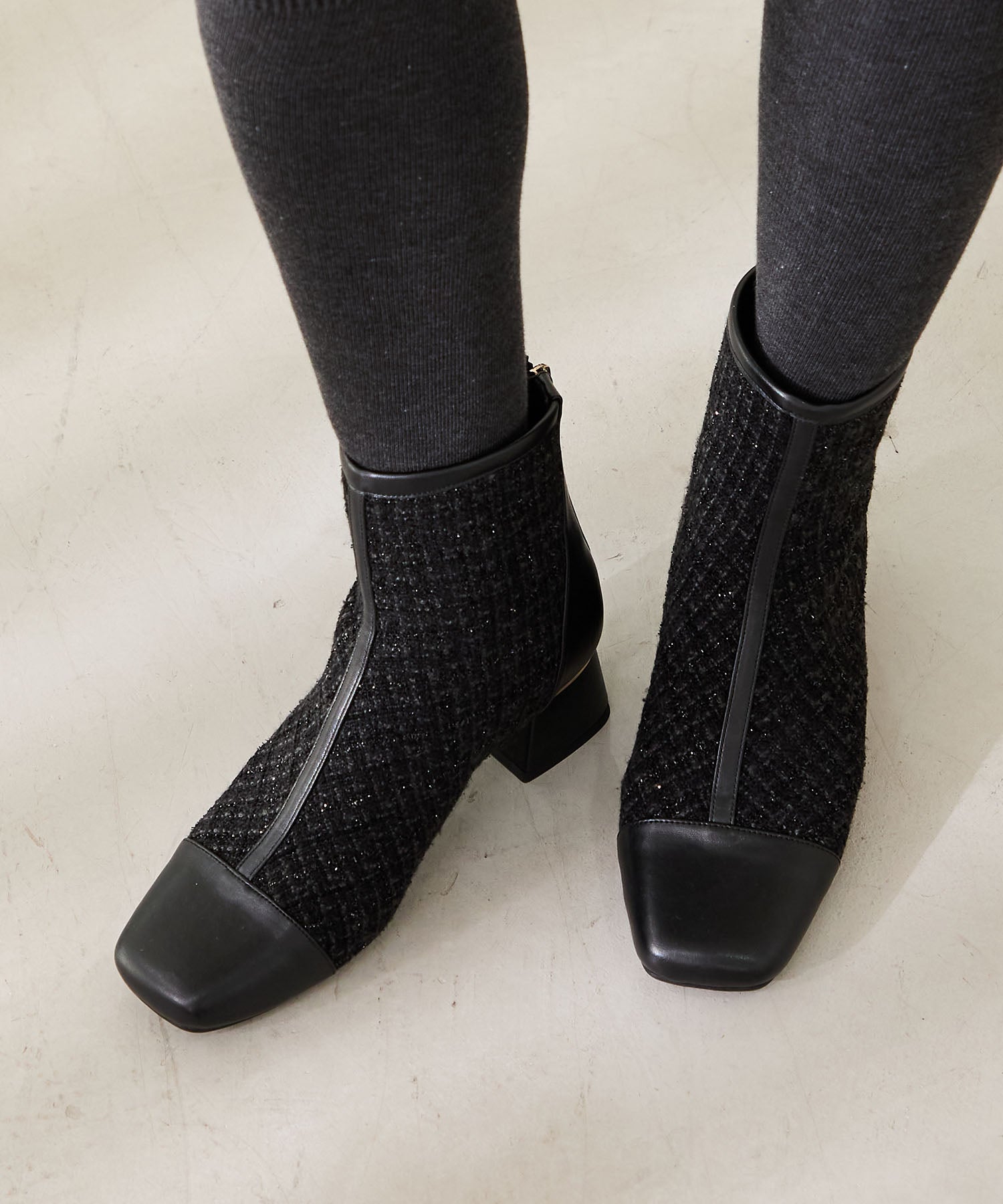 上品さの中にちょっぴり甘さのあるツイード素材のブーツは、この秋冬に取り入れたいとっておきのアイテム。スクエアトゥのつま先は切替デザインにして、メリハリのある引き締まった印象に。高見えする踵のメタリックラインやゴールドのバックファスナーは、おしゃれ度をぐっと高めてくれる細かなこだわりポイント。カラーは挑戦しやすいベーシックな2色展開。