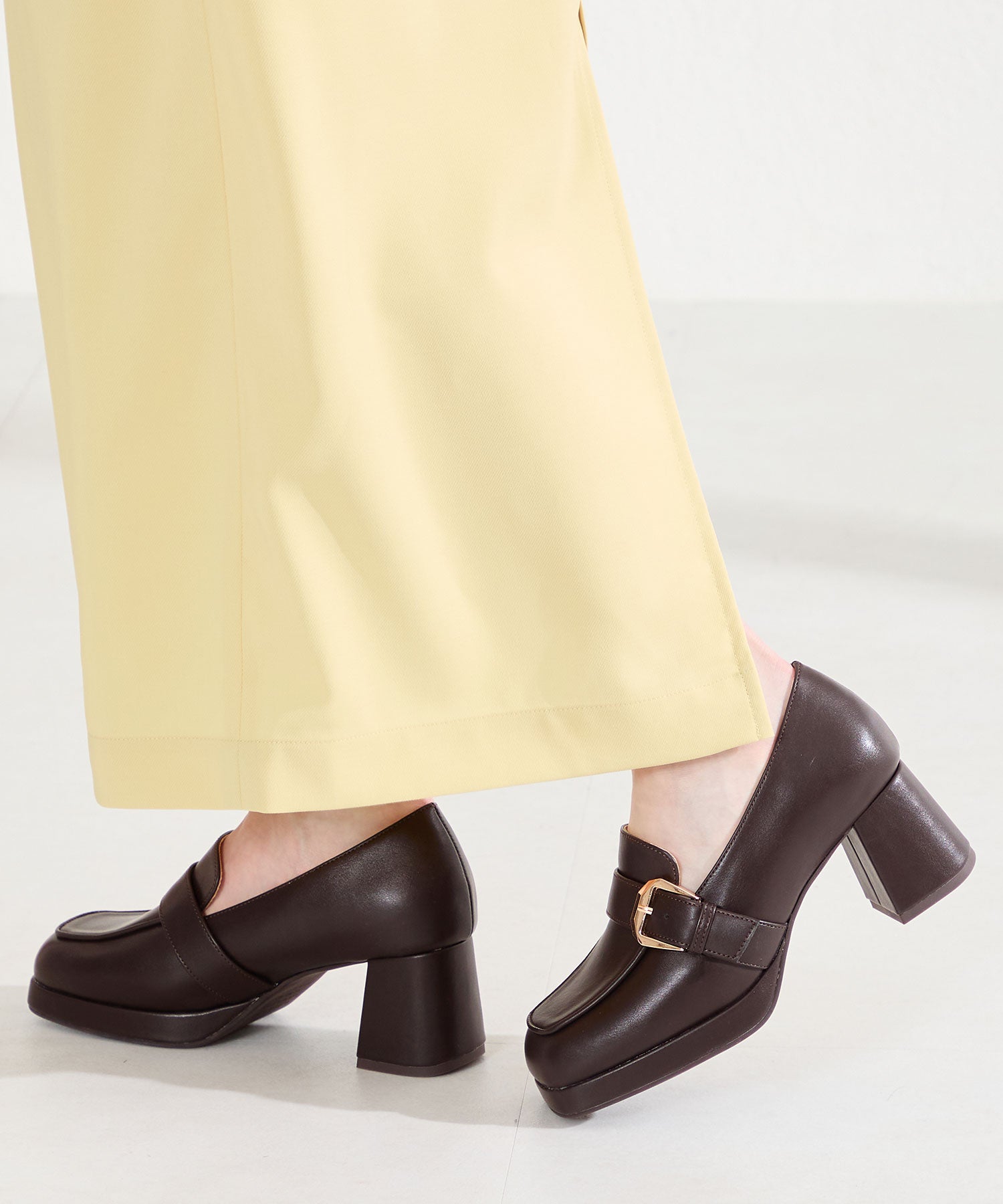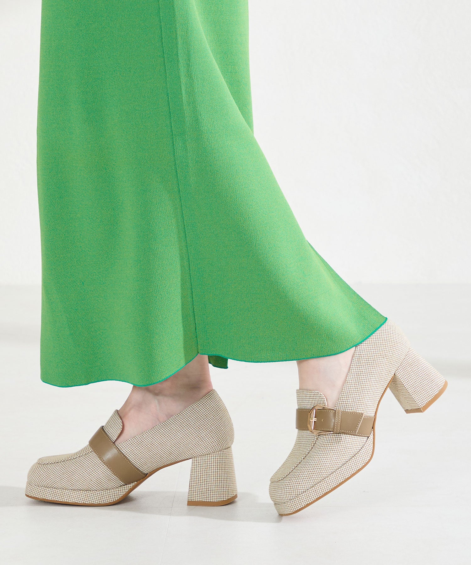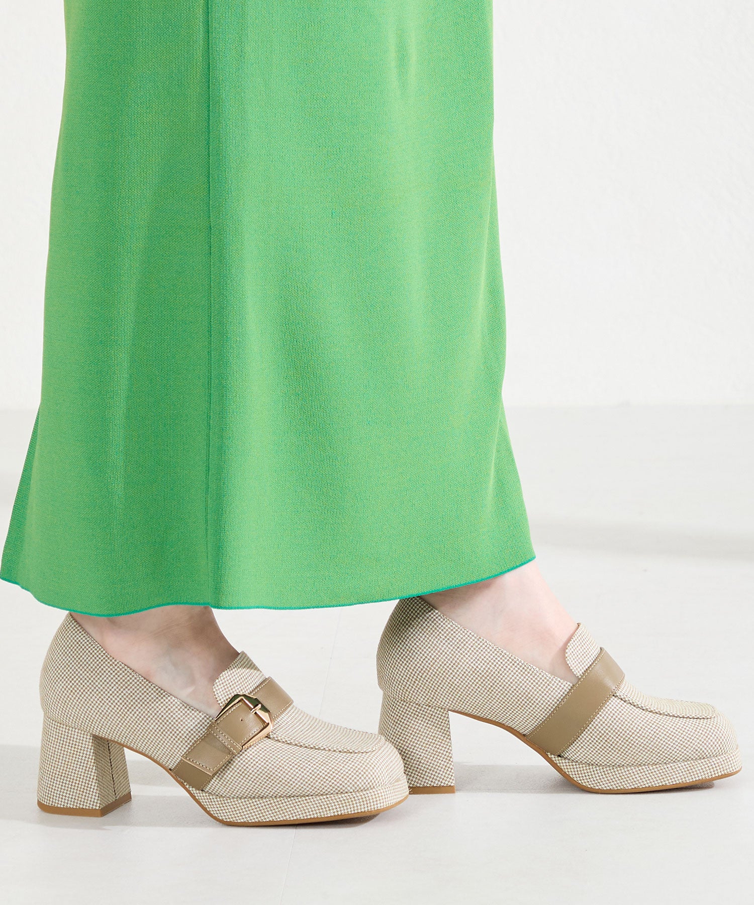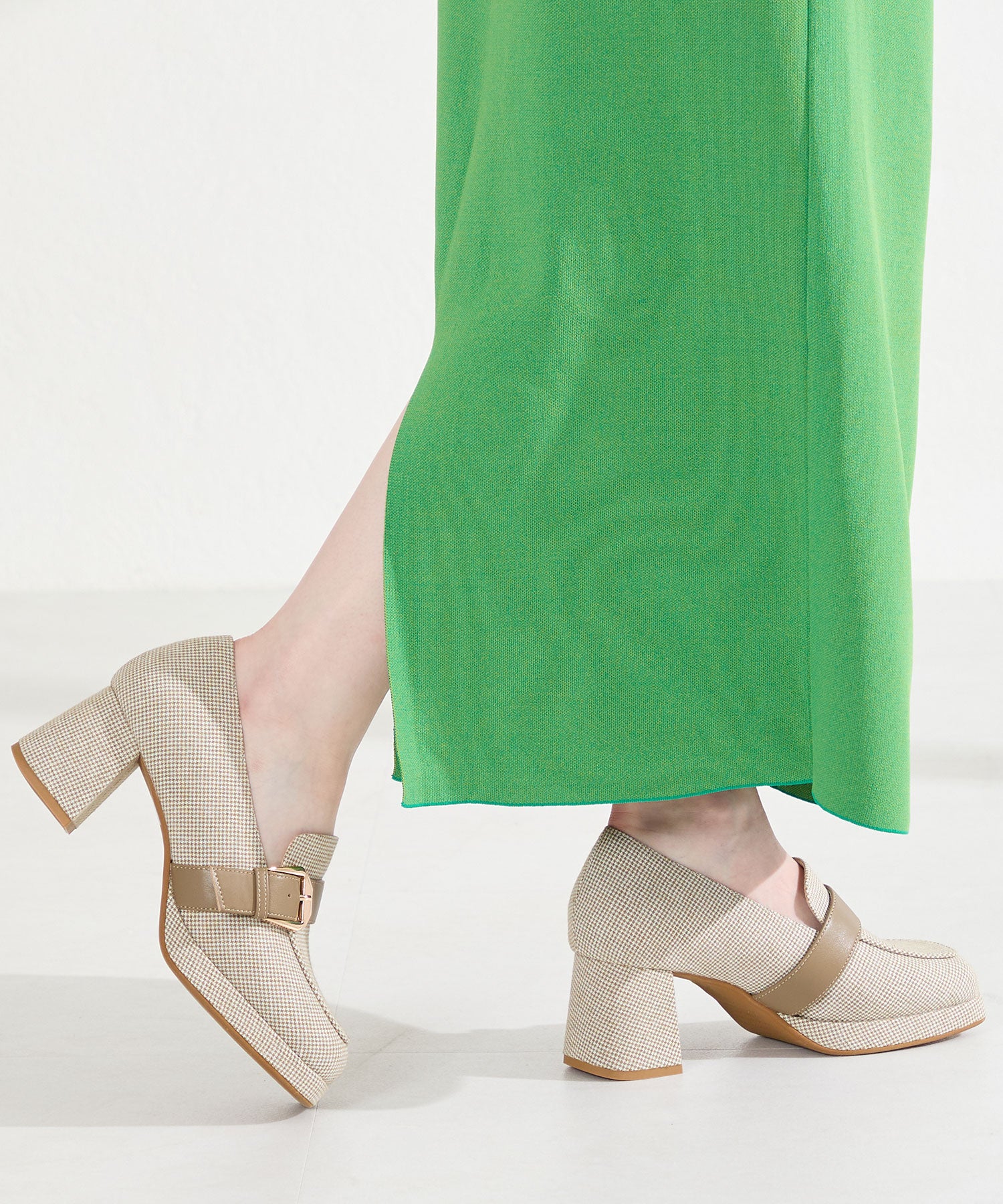 スタイルアップが叶う厚底ヒールローファーは、ストーム付きで傾斜が緩やかなので、見た目以上に疲れにくく安定感のある履き心地が特徴。スクエアトゥと存在感のあるバックルが、スタイリングを引き締めつつ上品さを引き立たせてくれる。汎用性の高いブラック、ブラウンと、目の細かいツイード素材を使用したカーキの3色展開でスタイリングの幅が広がるカラバリ。