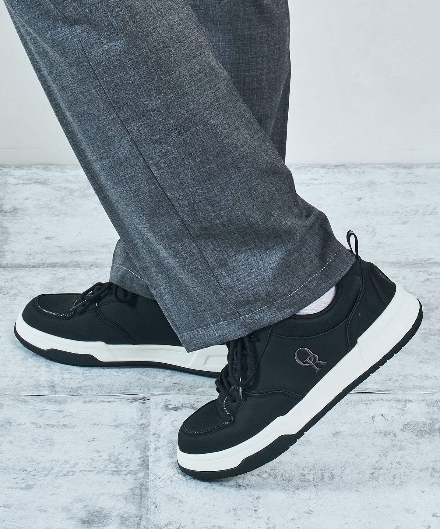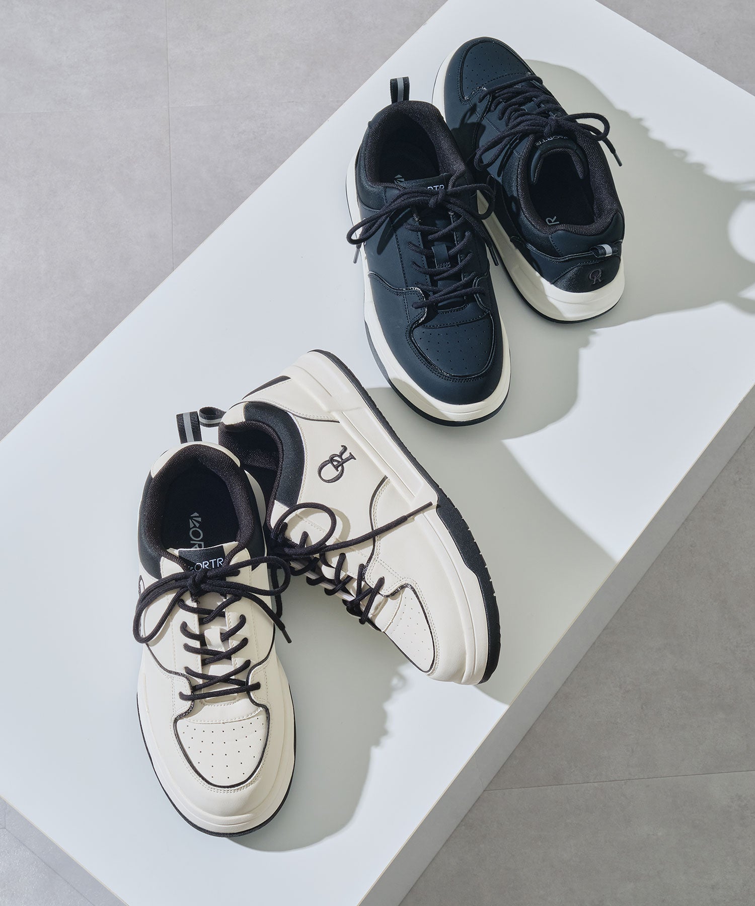 ホワイトとブラックのモノトーンカラーを組み合わせたクラシックスタイルのコートソールスニーカーは存在感のある配色がポイント。厚みのあるソールながらも、軽量素材を使用し長時間の歩行でもストレスフリーな履き心地で、ソールの縁部分にはグリップ力のあるパーツを組み合わせることで快適さと安定感を両立。