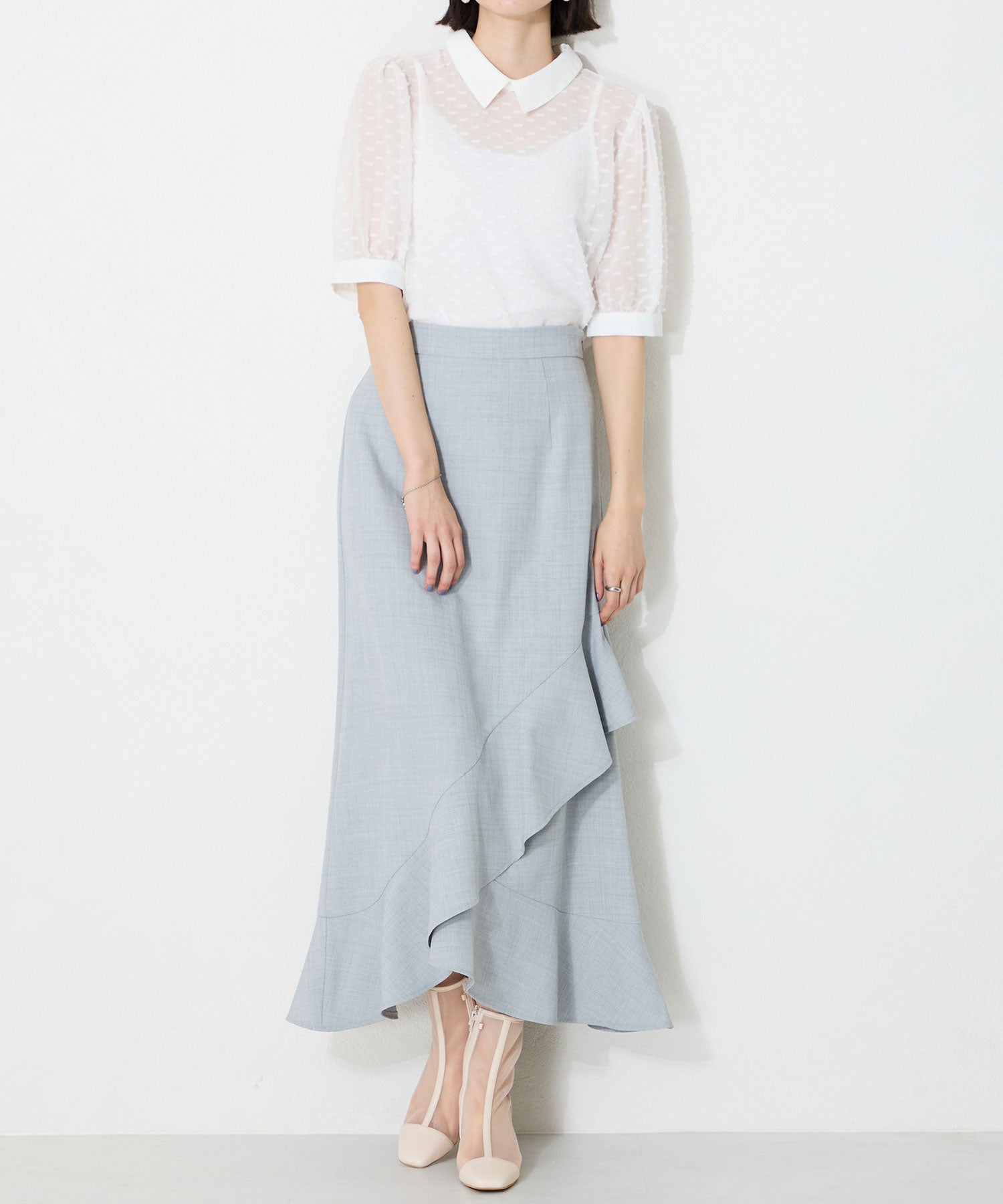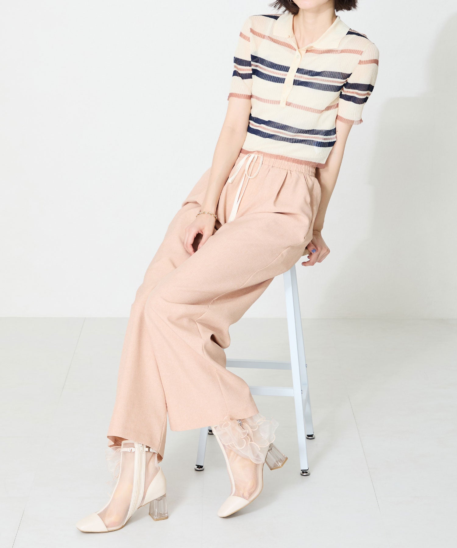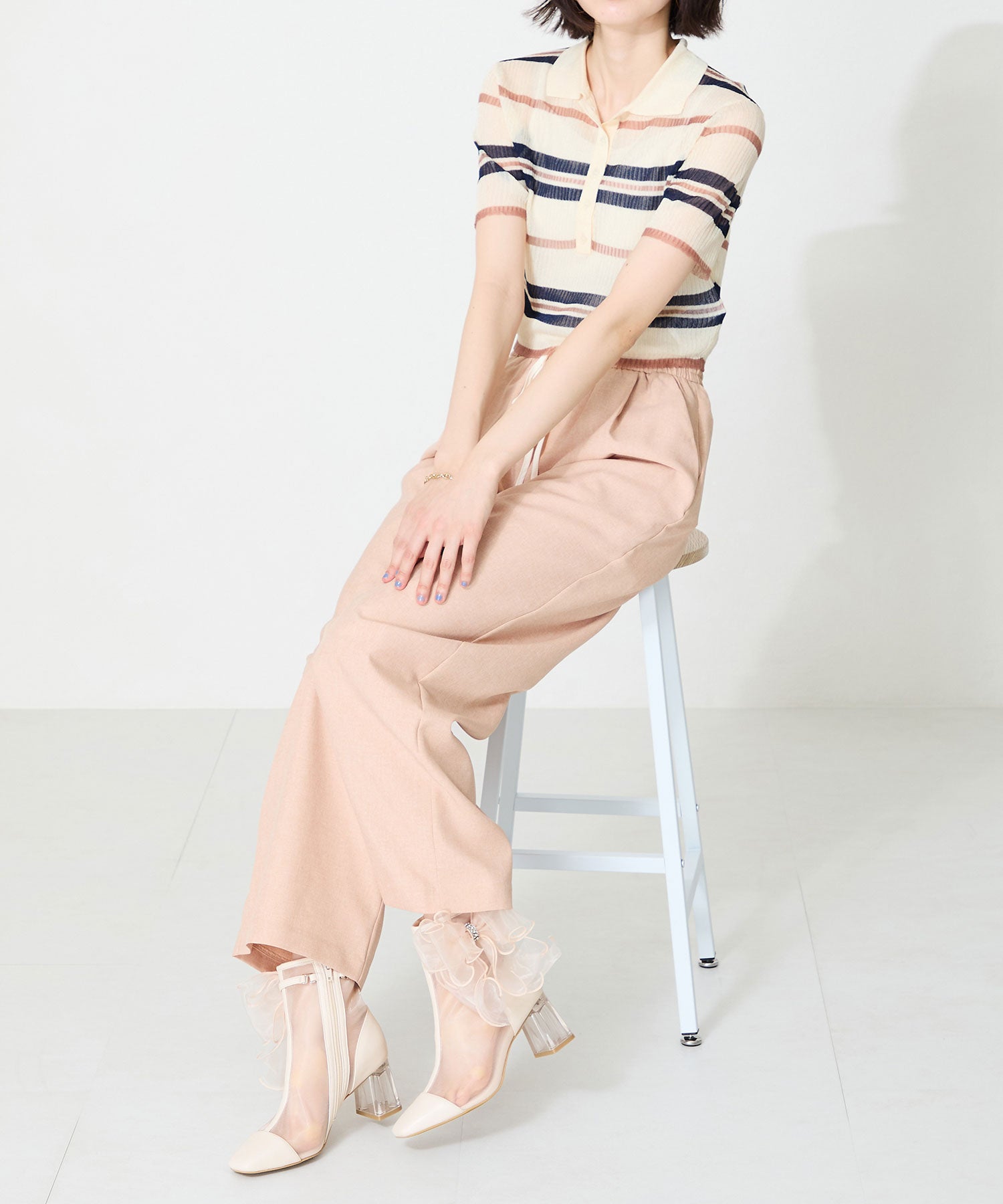 スタイリングの主役になるチュールのショートブーツは、華やかでふわっとしたニュアンスのあるリボンモチーフが旬な足元を演出。リボンベルトは取り外しが可能で、取るとシンプルなブーツとして幅広く活躍する優秀アイテム。ほんのりとベージュカラーを纏ったクリアヒールは大人なムードが漂う雰囲気で履くと気分が高まる特別な1足。
