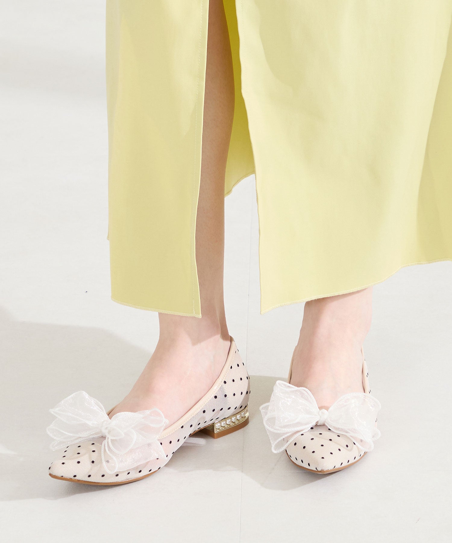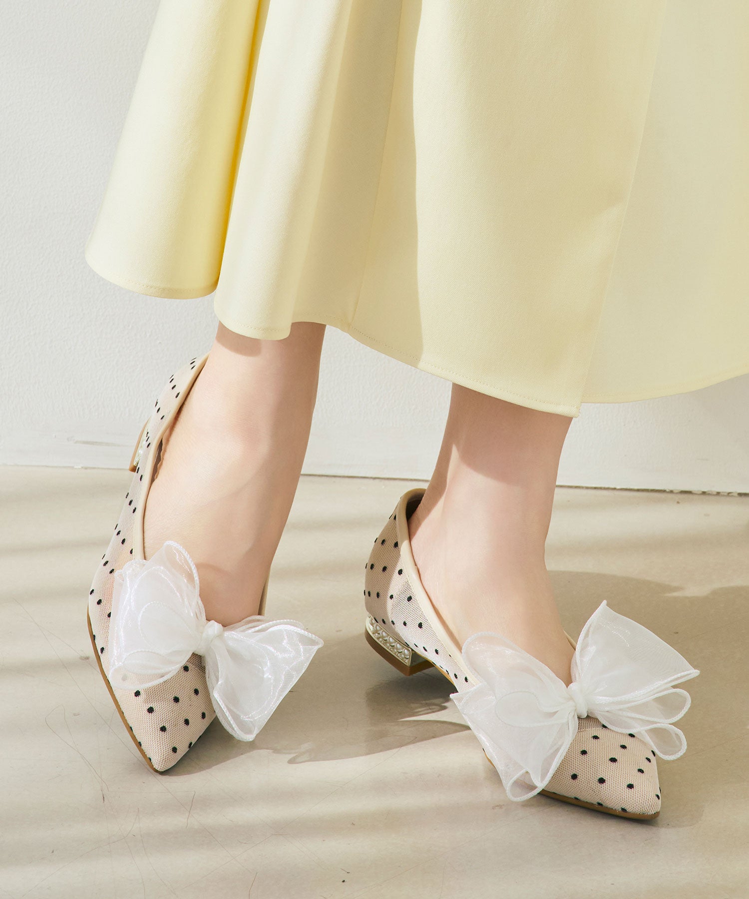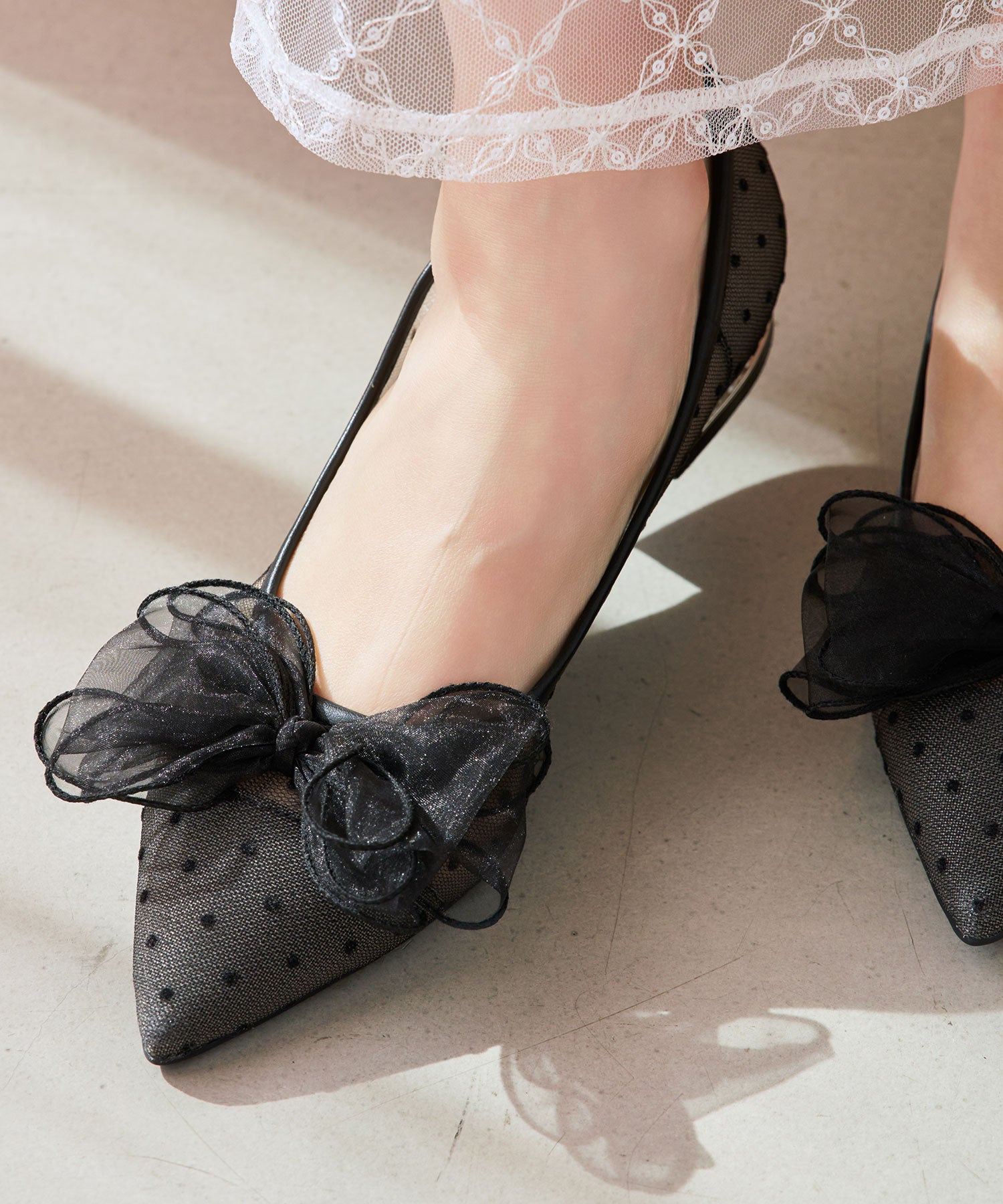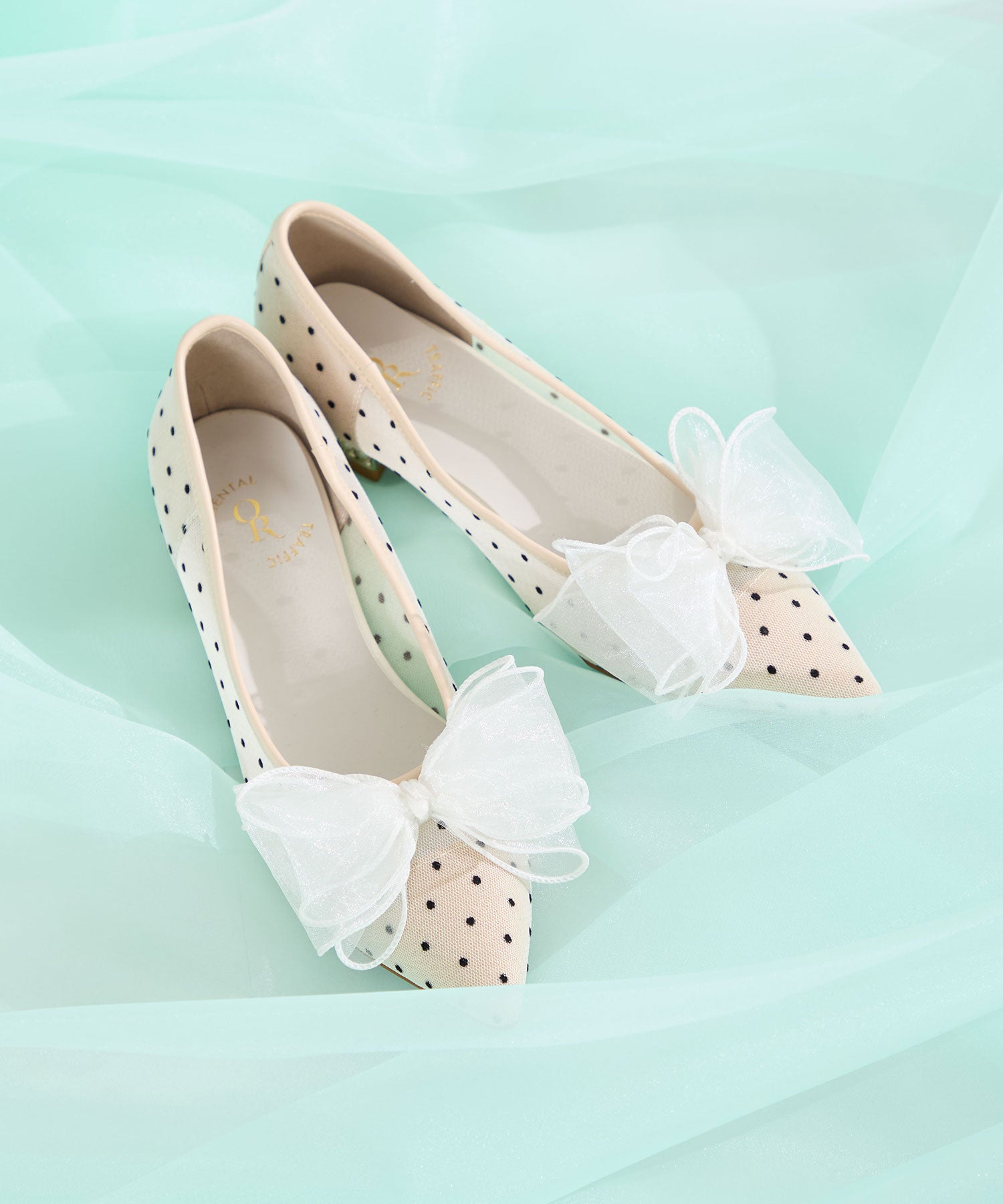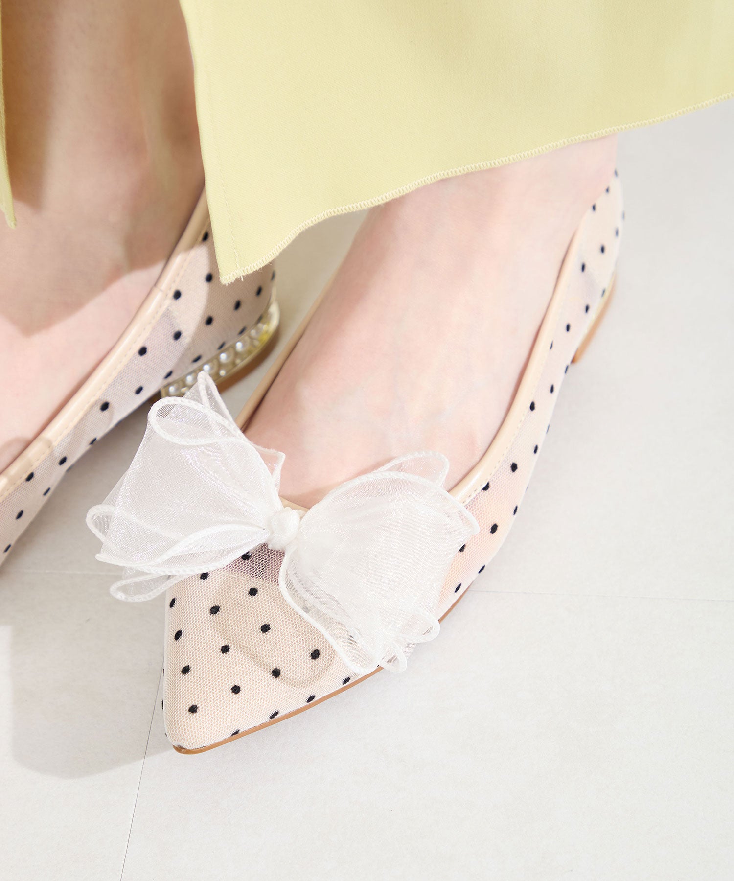 ボリュームたっぷりのチュールリボンがコーディネートのアクセントになる大人可愛いパンプス。アッパーにはシアードット素材を使用して、甘さを残しつつ上品な印象に。歩きやすい低めのヒールにはパールを施し、どこから見ても抜かりないシルエット仕上げているのもポイント。普段使いはもちろん、オケージョンなどの特別な日のお出かけにもぴったりな1足。