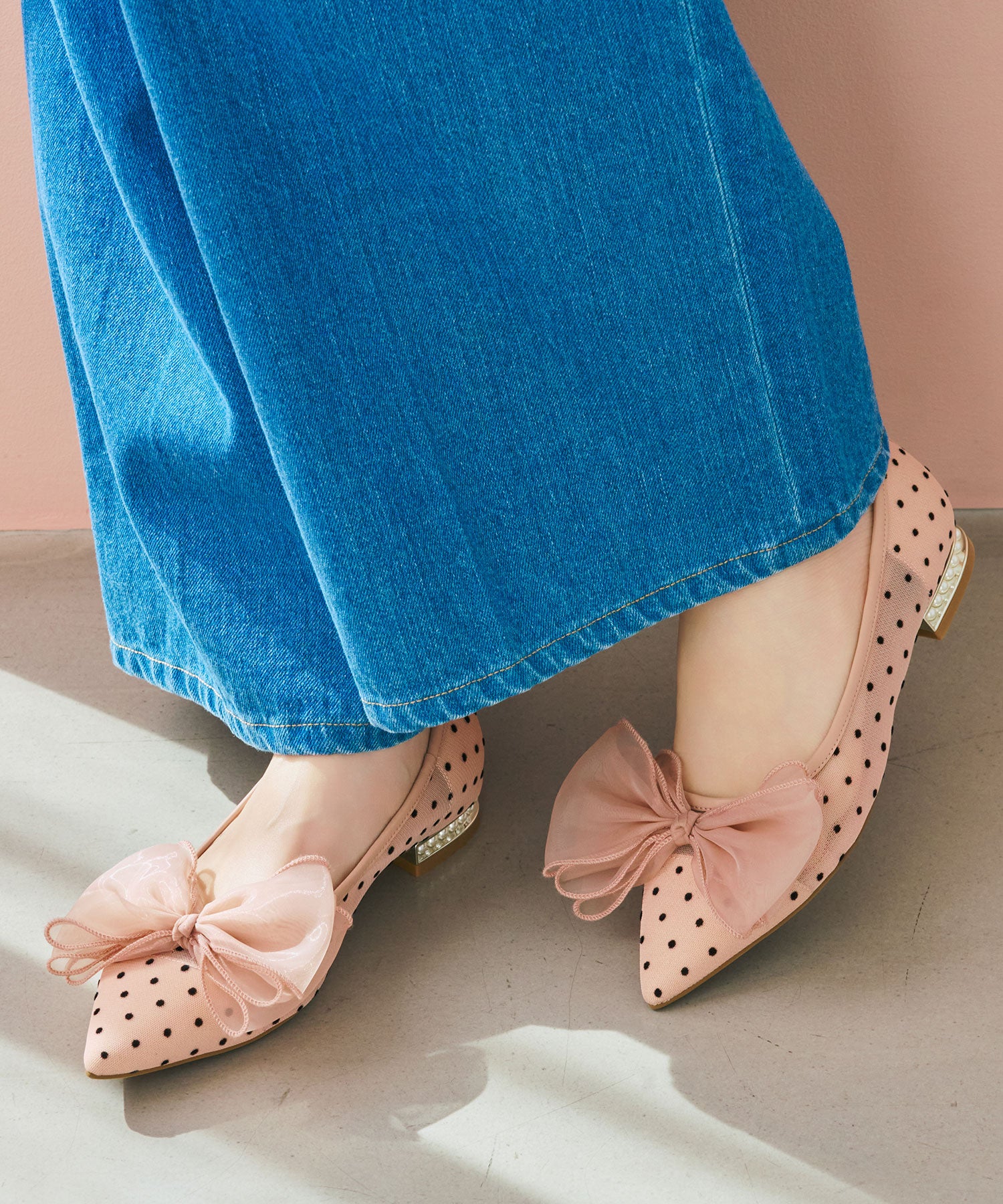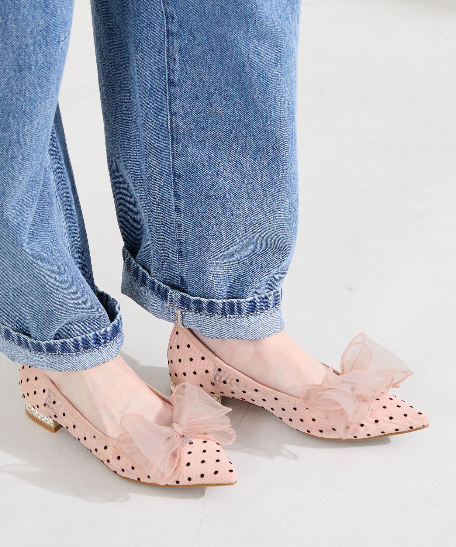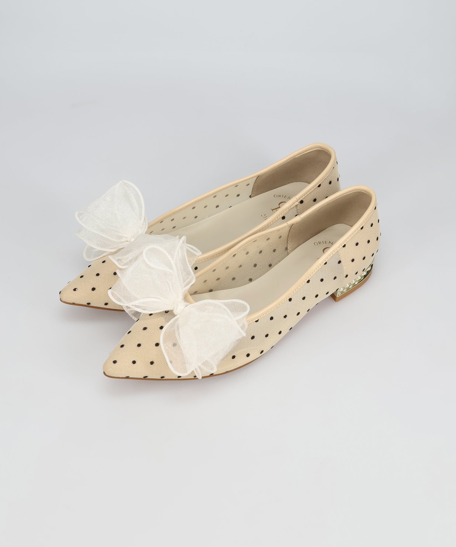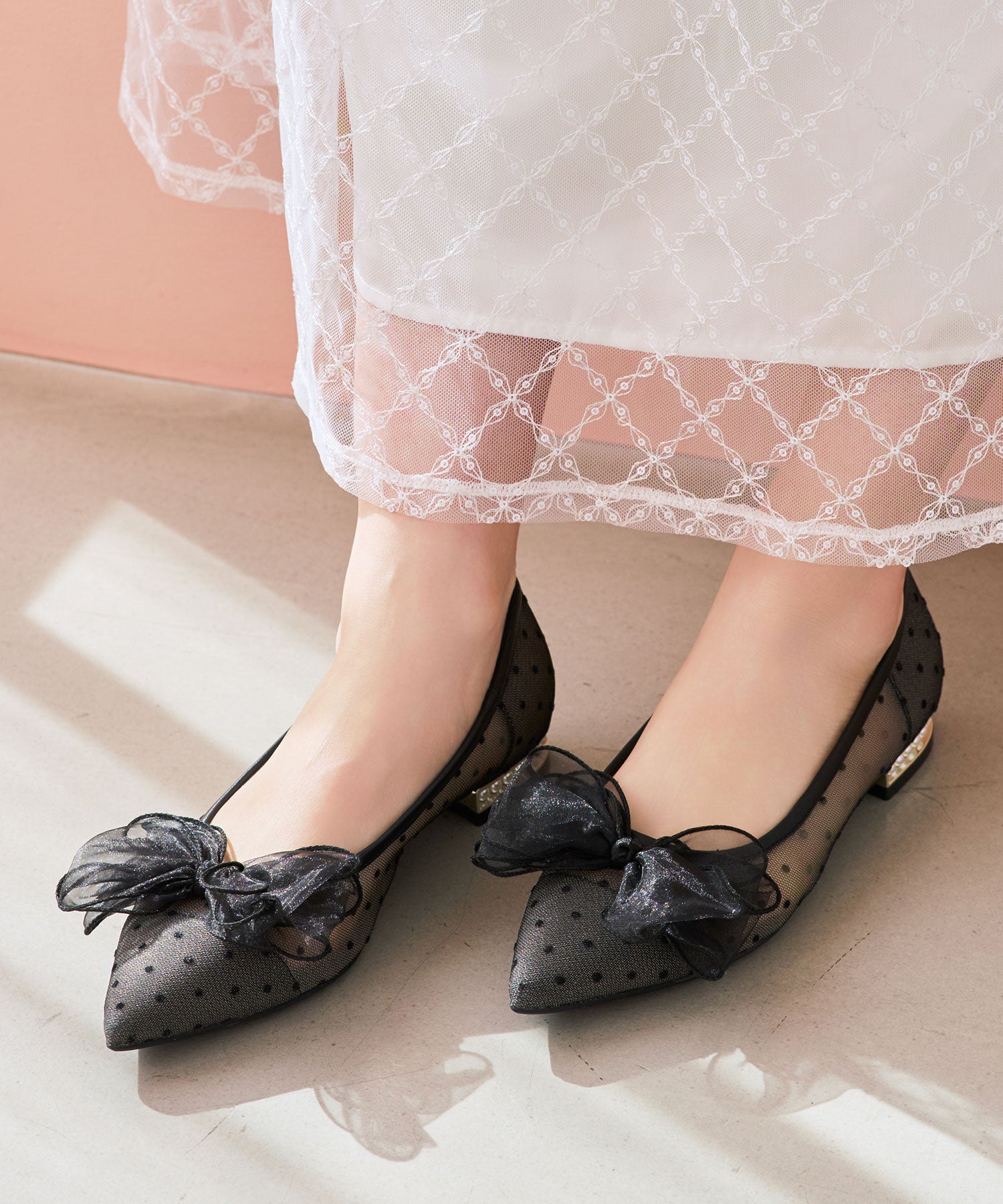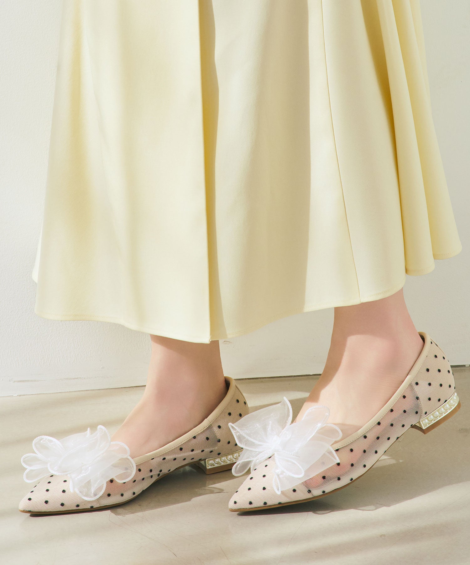 ボリュームたっぷりのチュールリボンがコーディネートのアクセントになる大人可愛いパンプス。アッパーにはシアードット素材を使用して、甘さを残しつつ上品な印象に。歩きやすい低めのヒールにはパールを施し、どこから見ても抜かりないシルエット仕上げているのもポイント。普段使いはもちろん、オケージョンなどの特別な日のお出かけにもぴったりな1足。