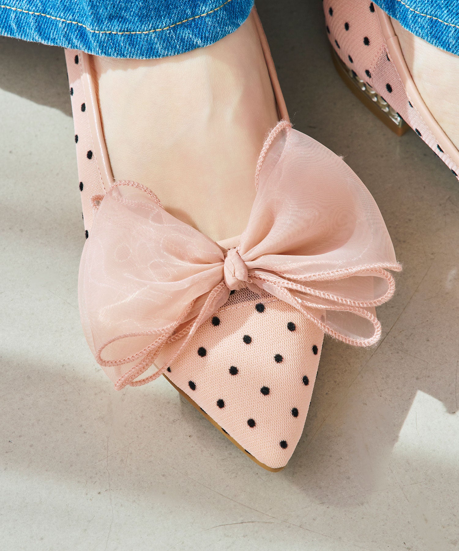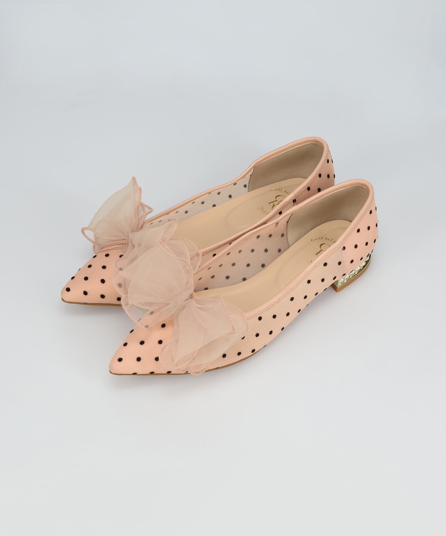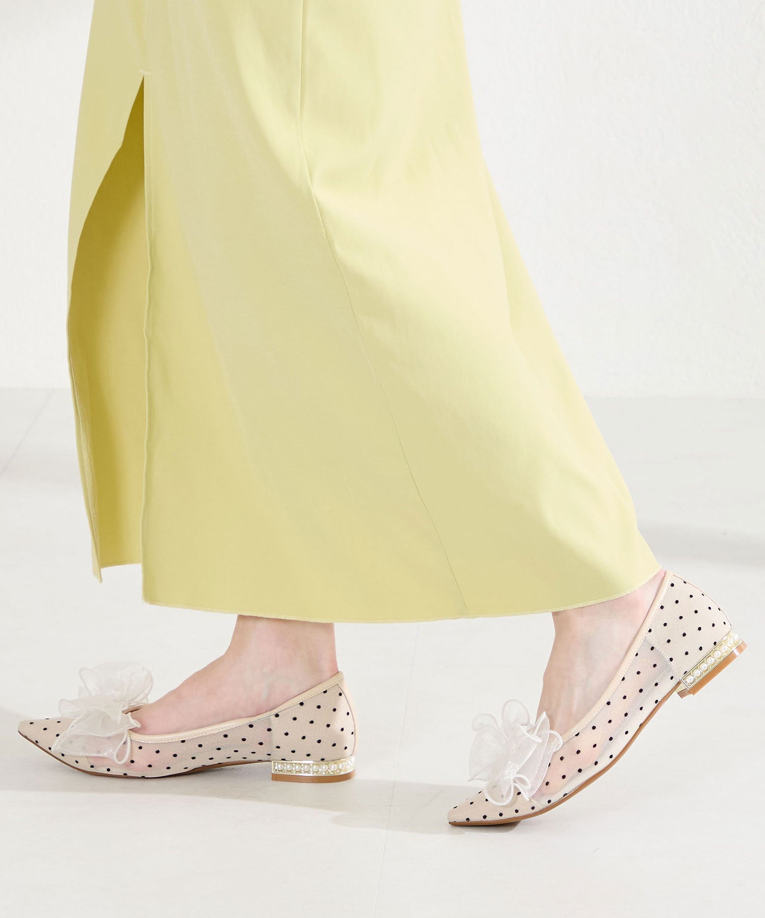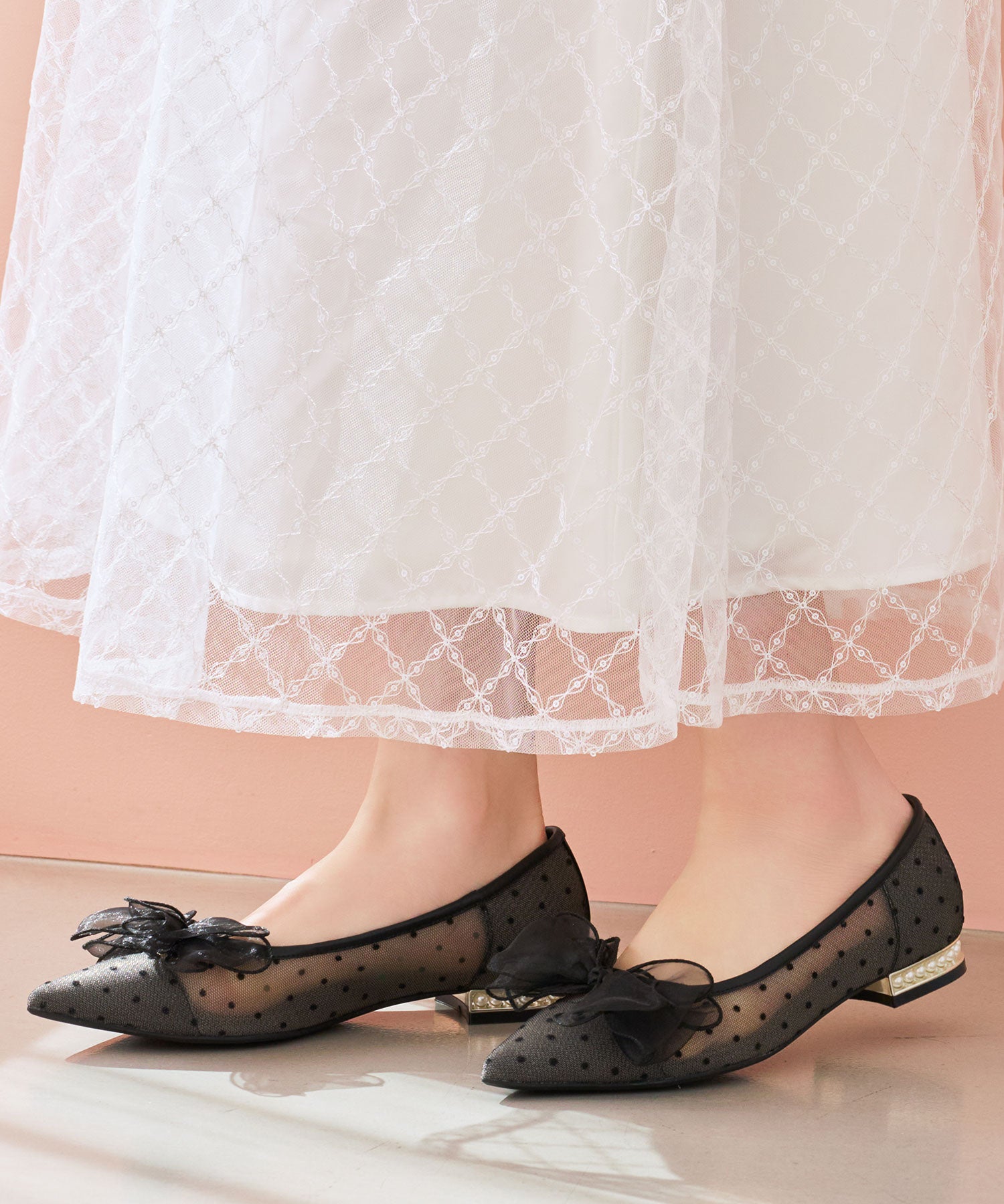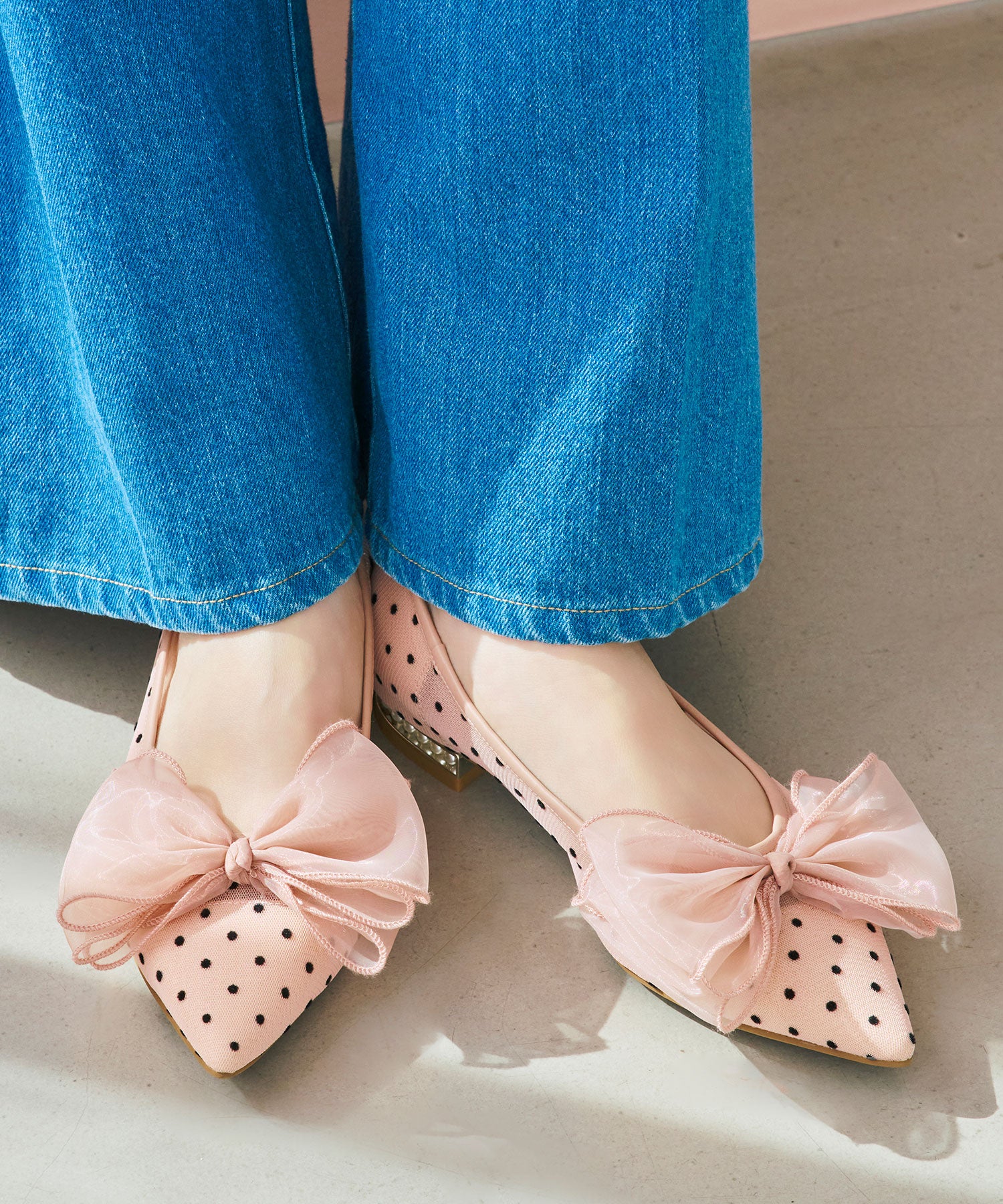 ボリュームたっぷりのチュールリボンがコーディネートのアクセントになる大人可愛いパンプス。アッパーにはシアードット素材を使用して、甘さを残しつつ上品な印象に。歩きやすい低めのヒールにはパールを施し、どこから見ても抜かりないシルエット仕上げているのもポイント。普段使いはもちろん、オケージョンなどの特別な日のお出かけにもぴったりな1足。