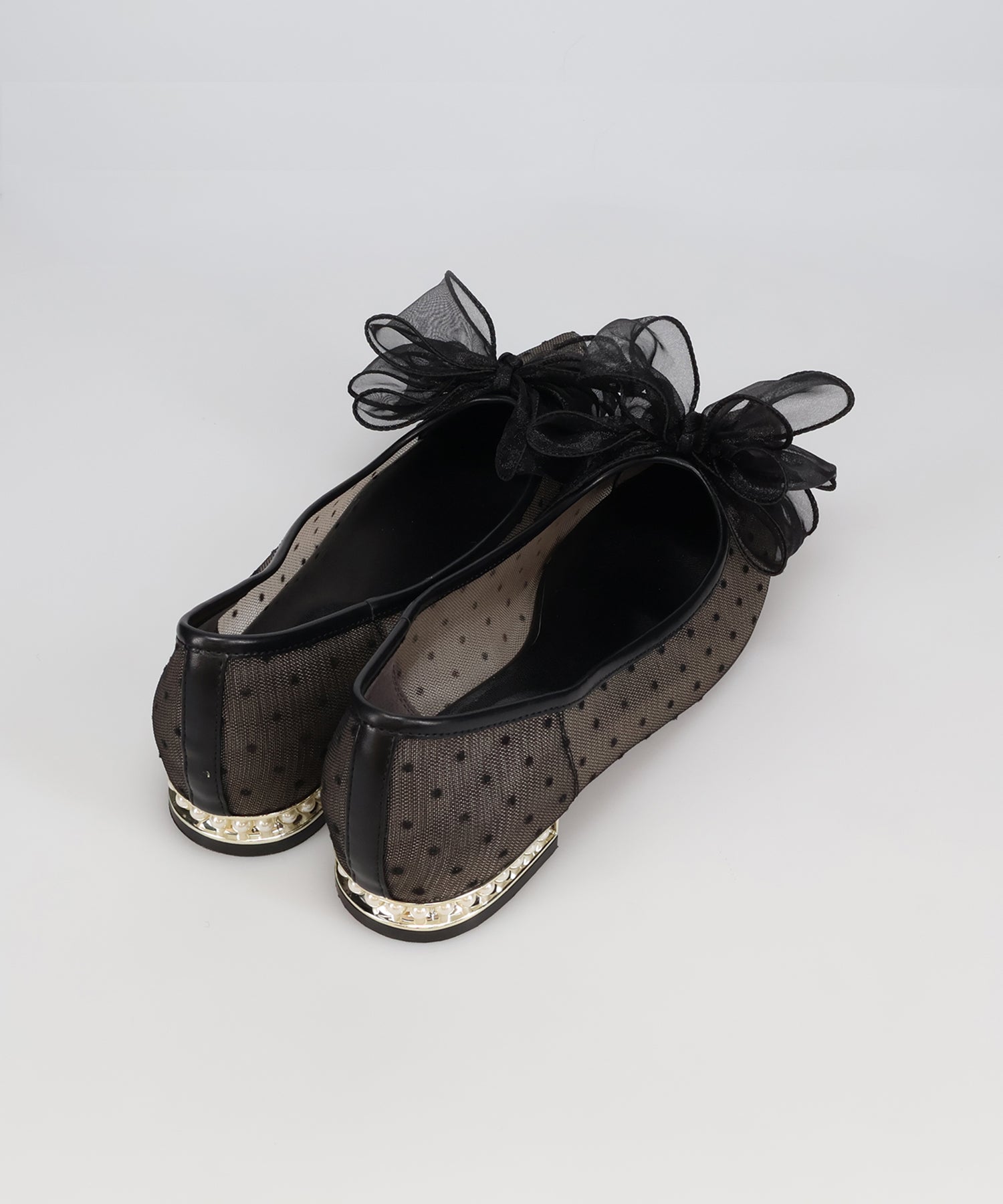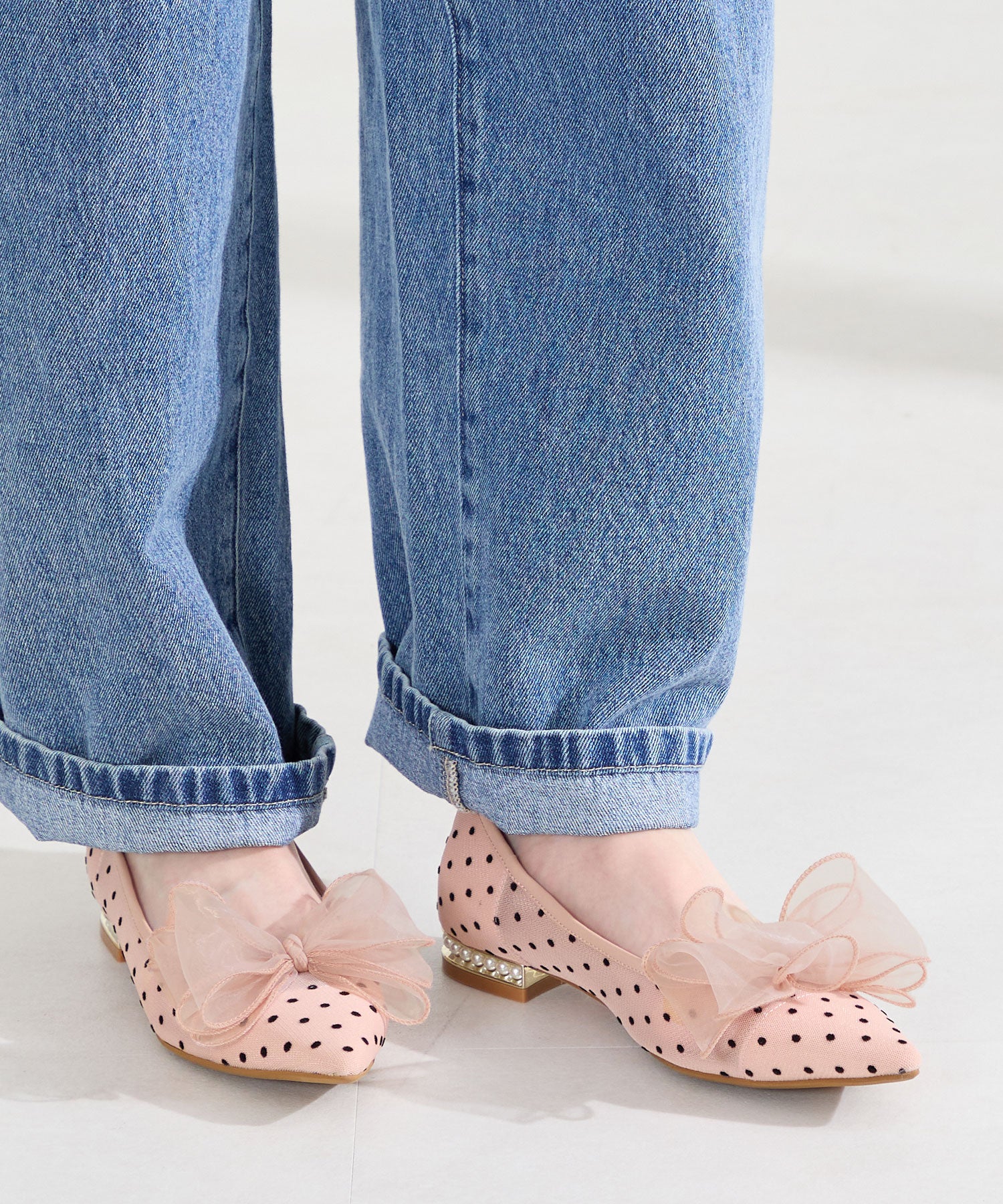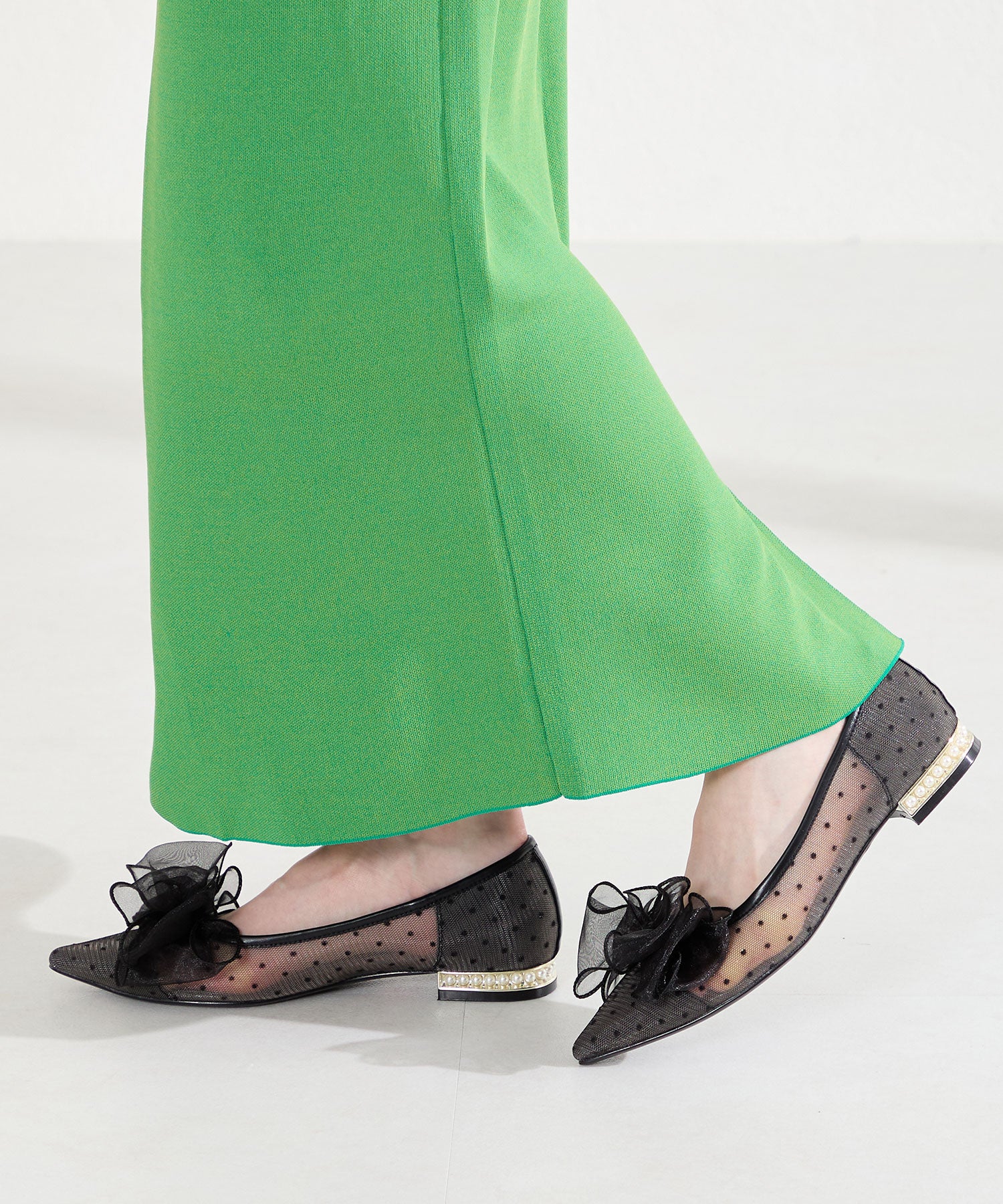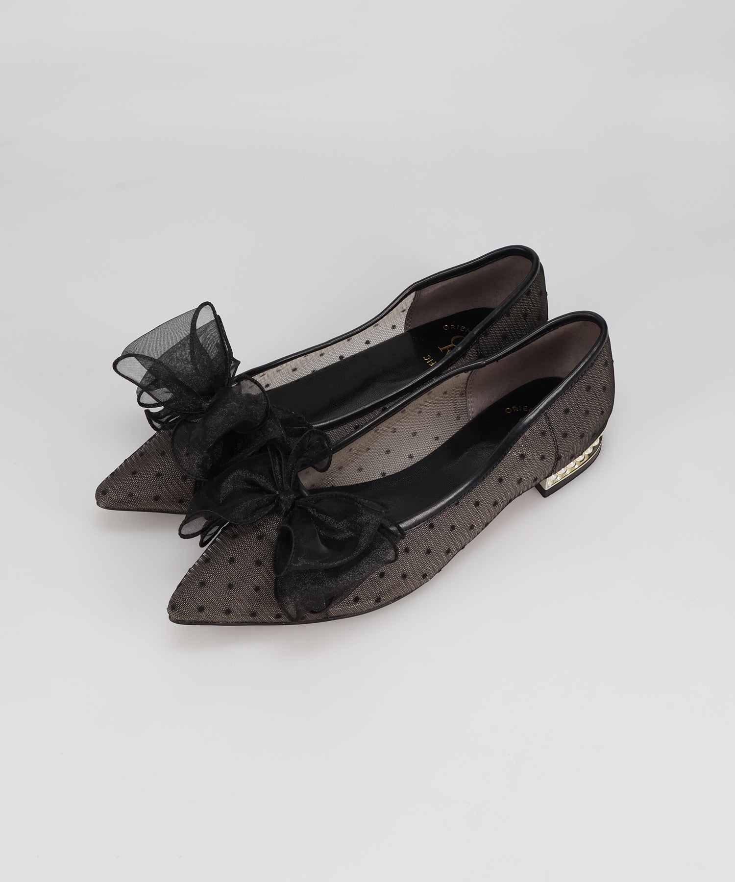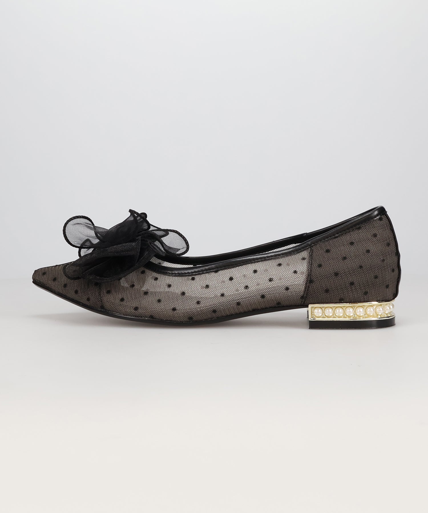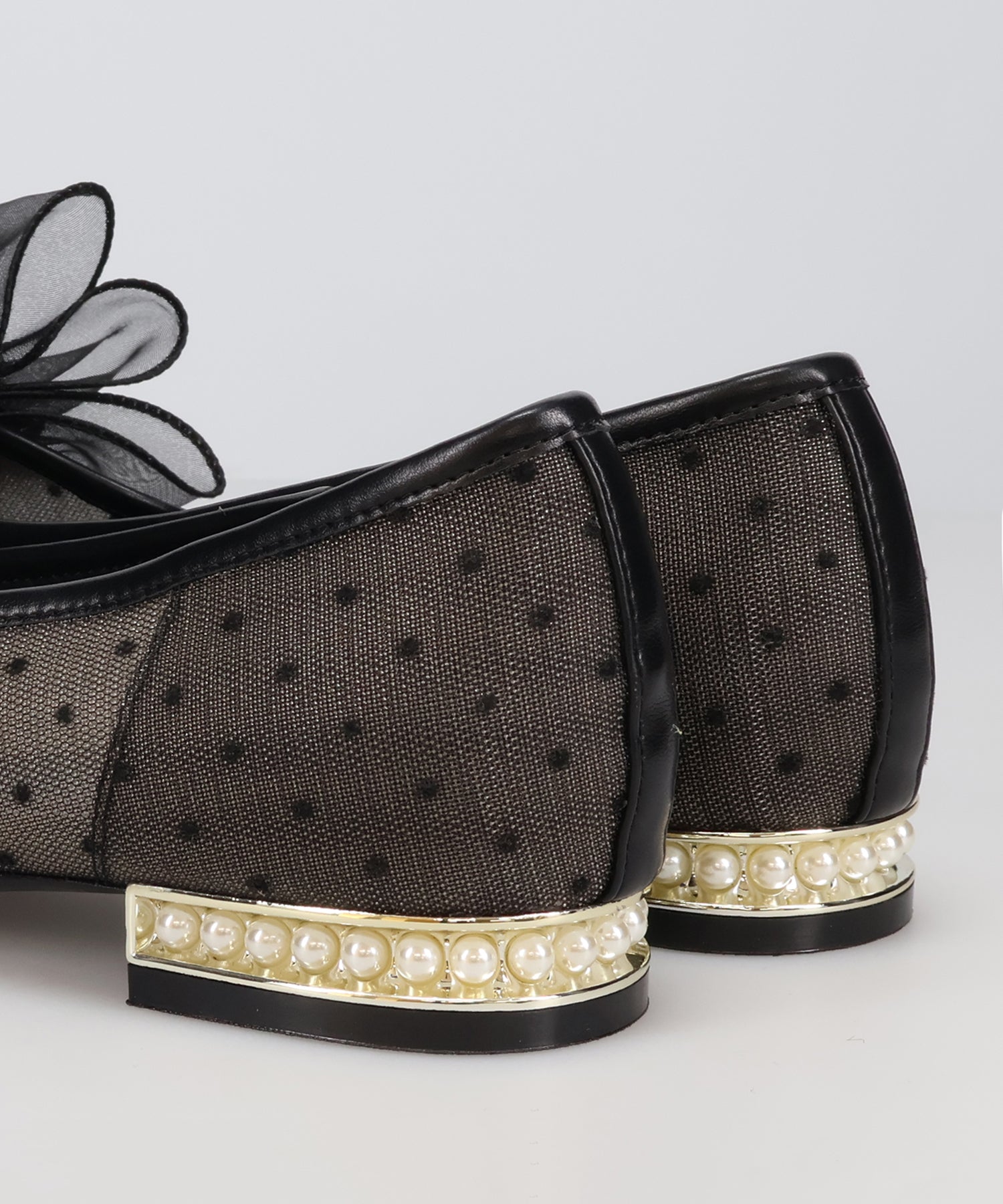 ボリュームたっぷりのチュールリボンがコーディネートのアクセントになる大人可愛いパンプス。アッパーにはシアードット素材を使用して、甘さを残しつつ上品な印象に。歩きやすい低めのヒールにはパールを施し、どこから見ても抜かりないシルエット仕上げているのもポイント。普段使いはもちろん、オケージョンなどの特別な日のお出かけにもぴったりな1足。