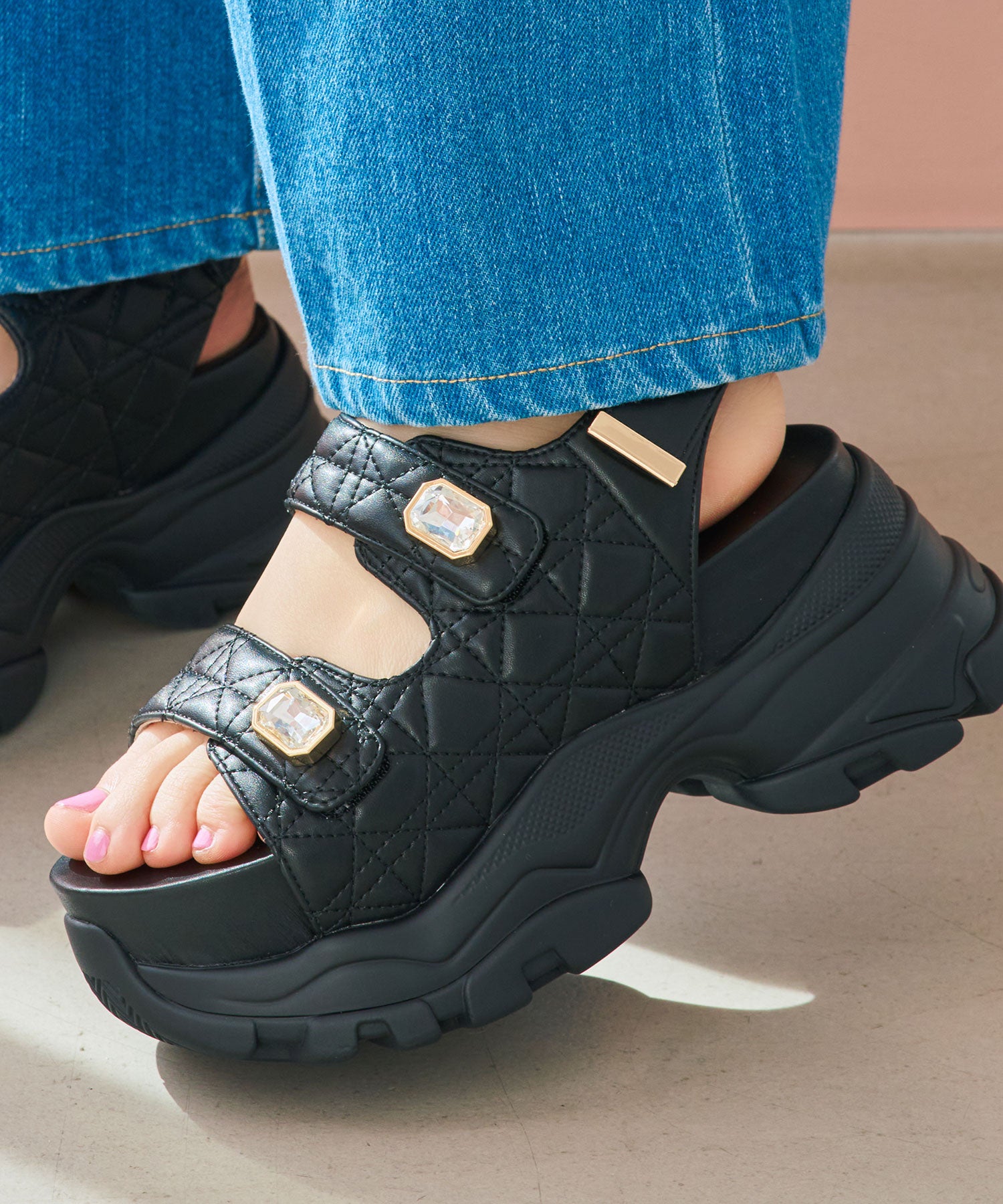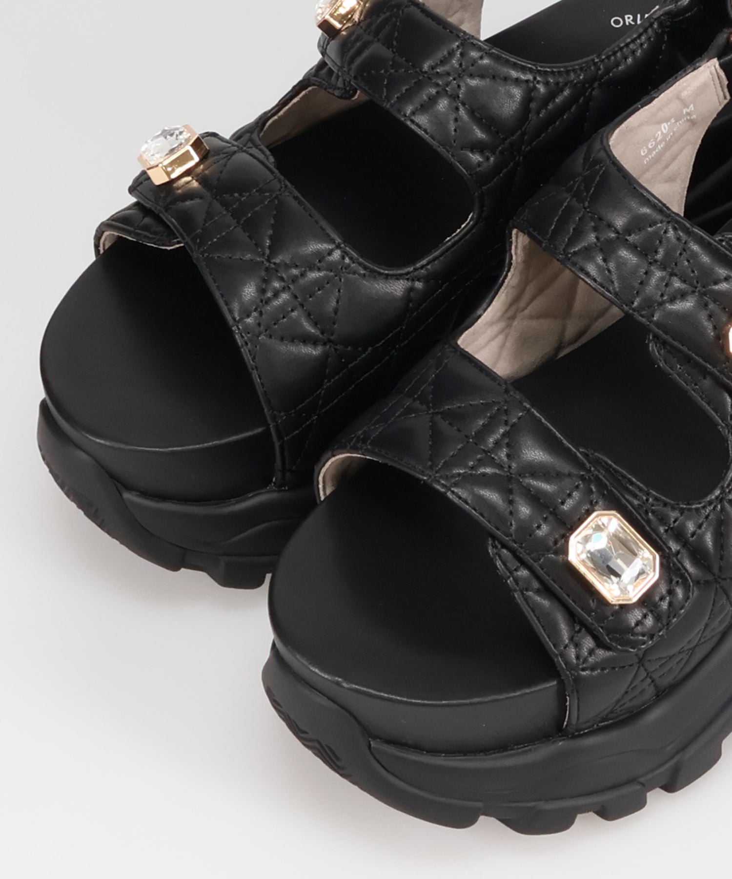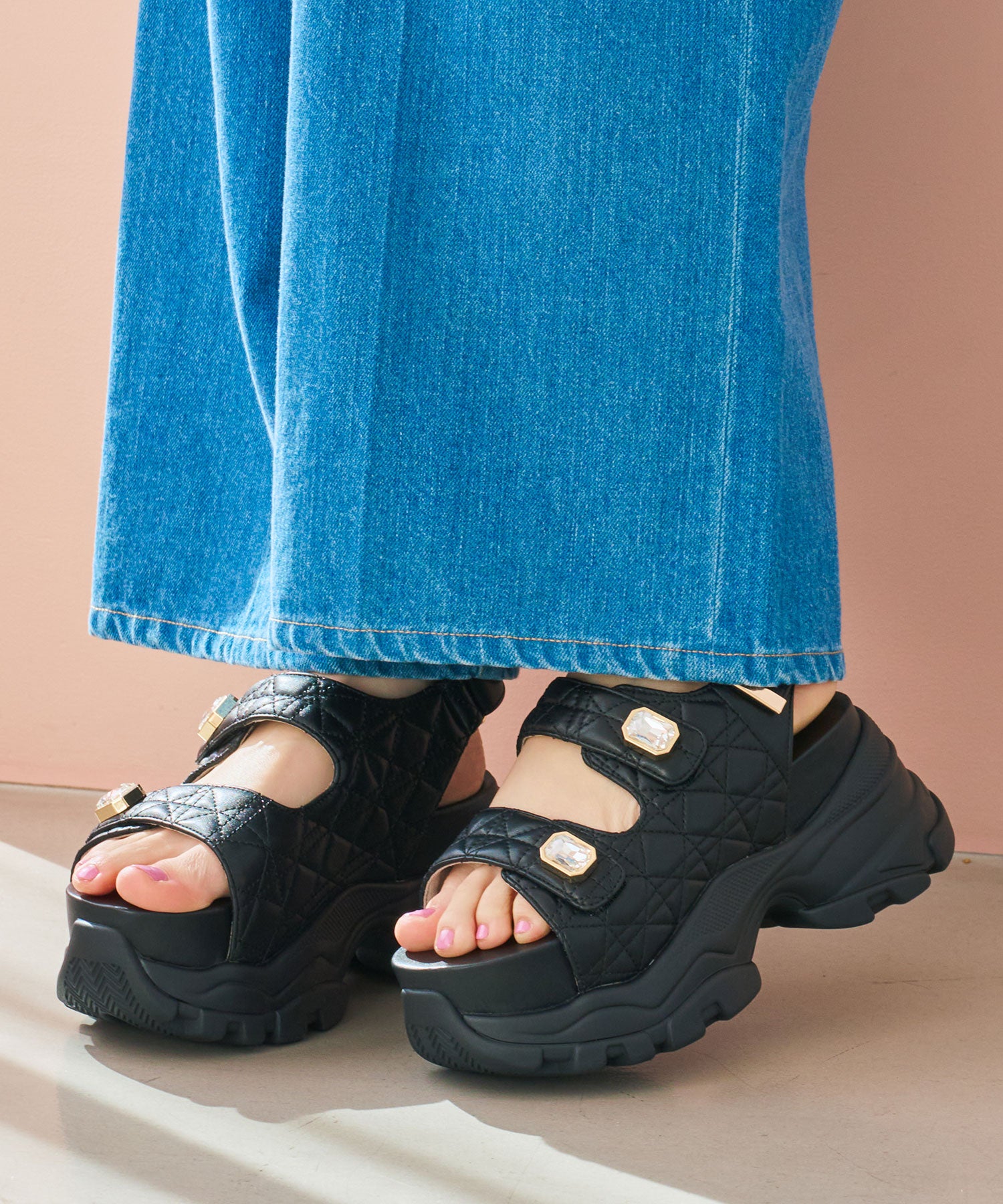 キルティング×ボリュームソールを組み合わせた、大人カジュアルなサンダル。甘すぎないデザインに、甲ベルトのビジューでさりげなく華やかさをON。ベルトは全て調節可能で、自分に足にぴったりフィットする設計。高低差の少ない厚底ソールで安定感があり、長時間歩いても疲れにくく、素足はもちろんソックス合わせで早い時期から使える万能アイテム。
