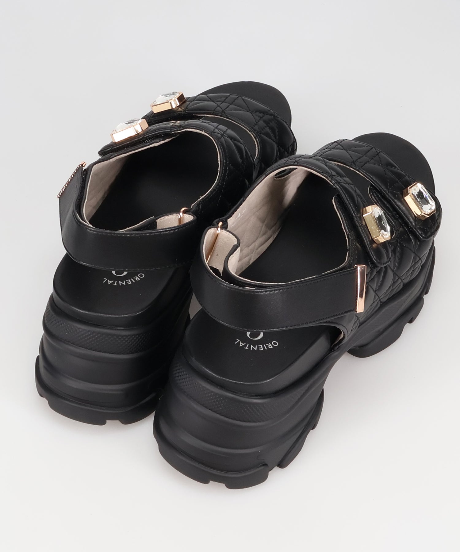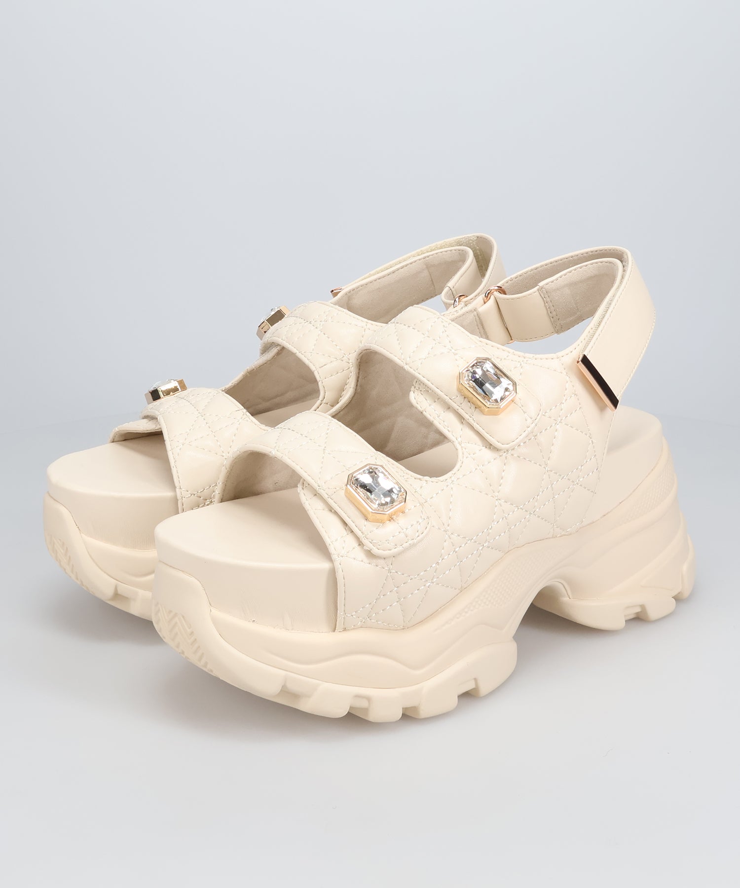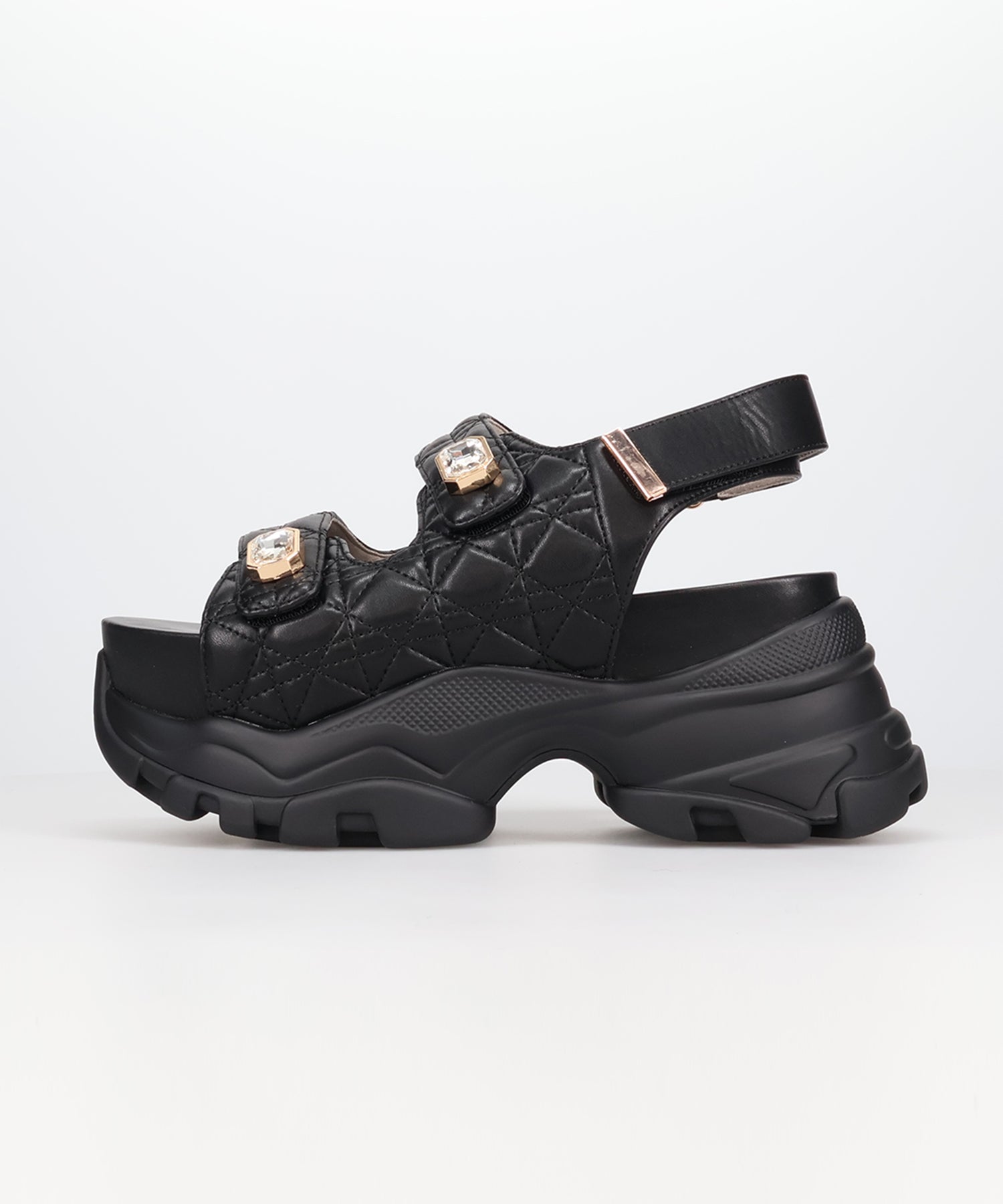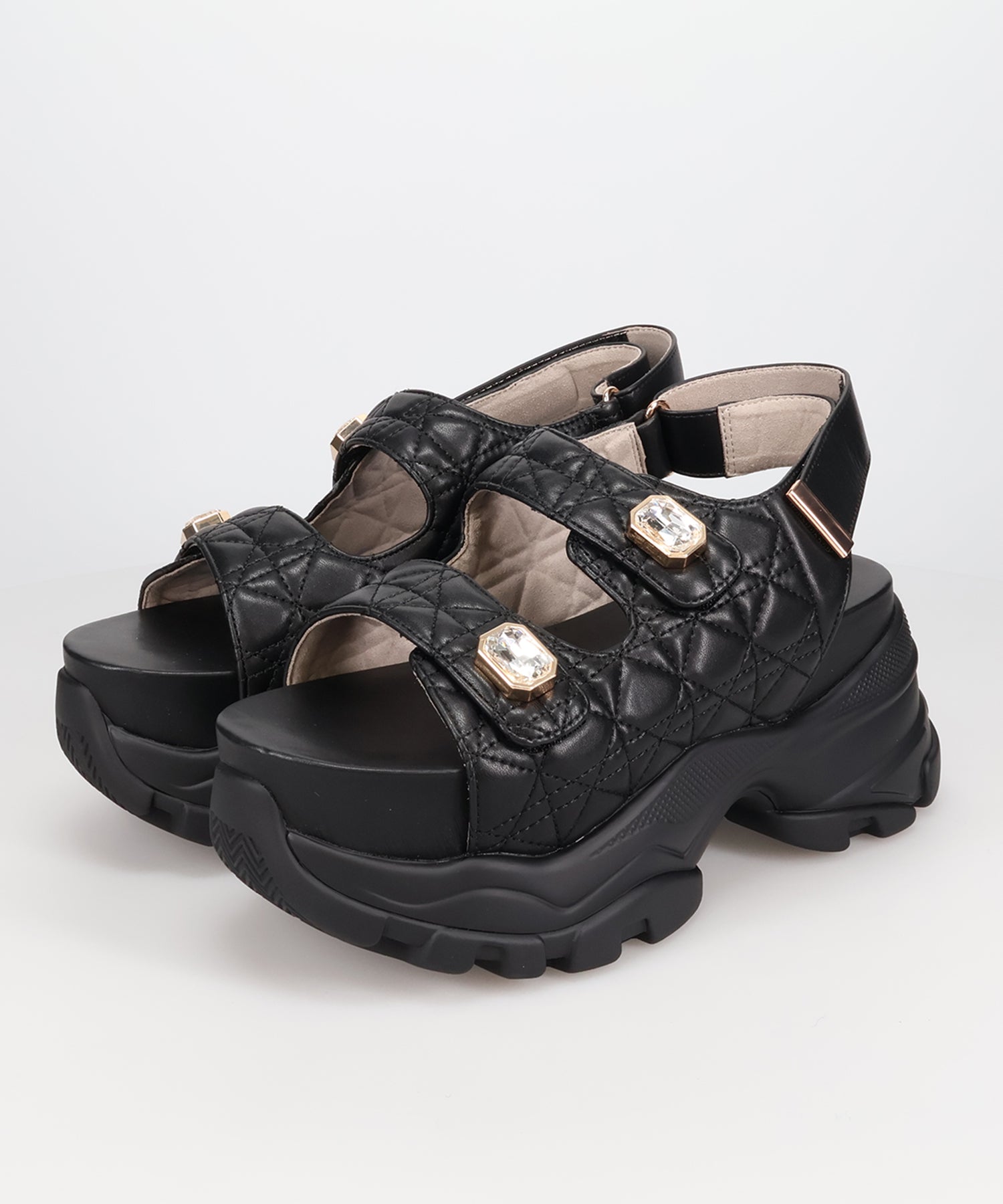 キルティング×ボリュームソールを組み合わせた、大人カジュアルなサンダル。甘すぎないデザインに、甲ベルトのビジューでさりげなく華やかさをON。ベルトは全て調節可能で、自分に足にぴったりフィットする設計。高低差の少ない厚底ソールで安定感があり、長時間歩いても疲れにくく、素足はもちろんソックス合わせで早い時期から使える万能アイテム。