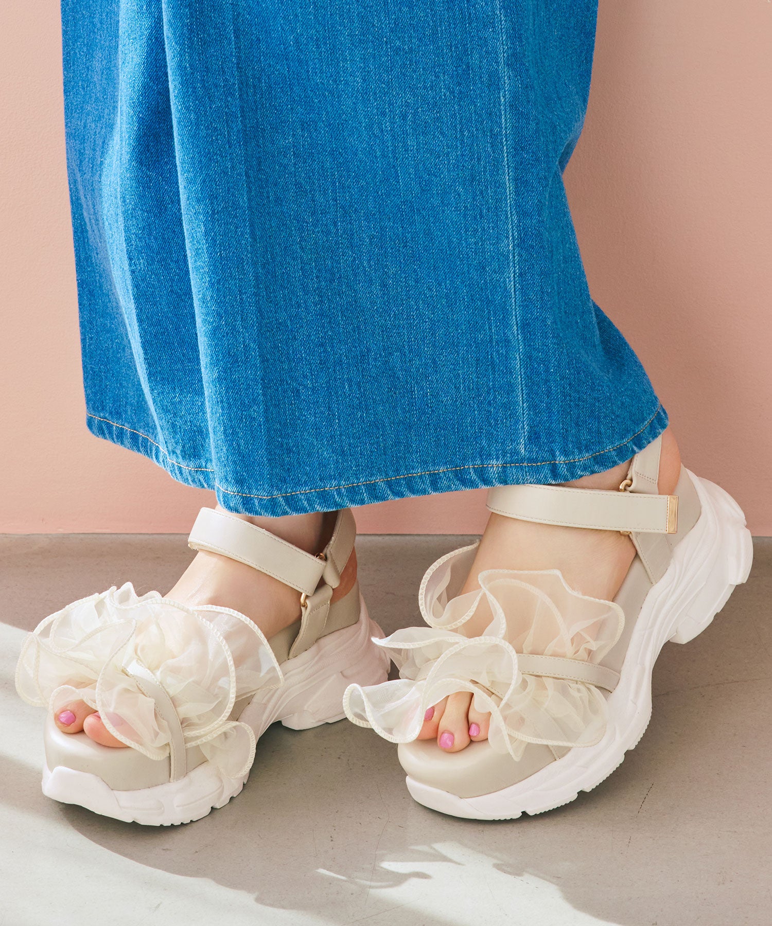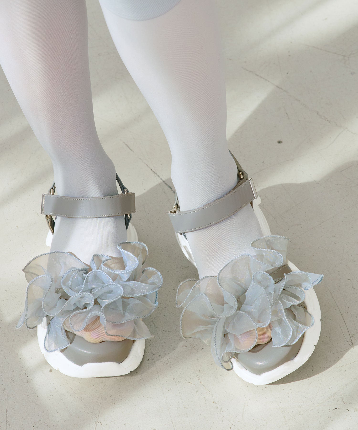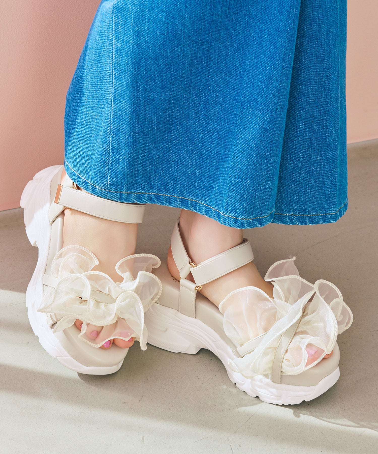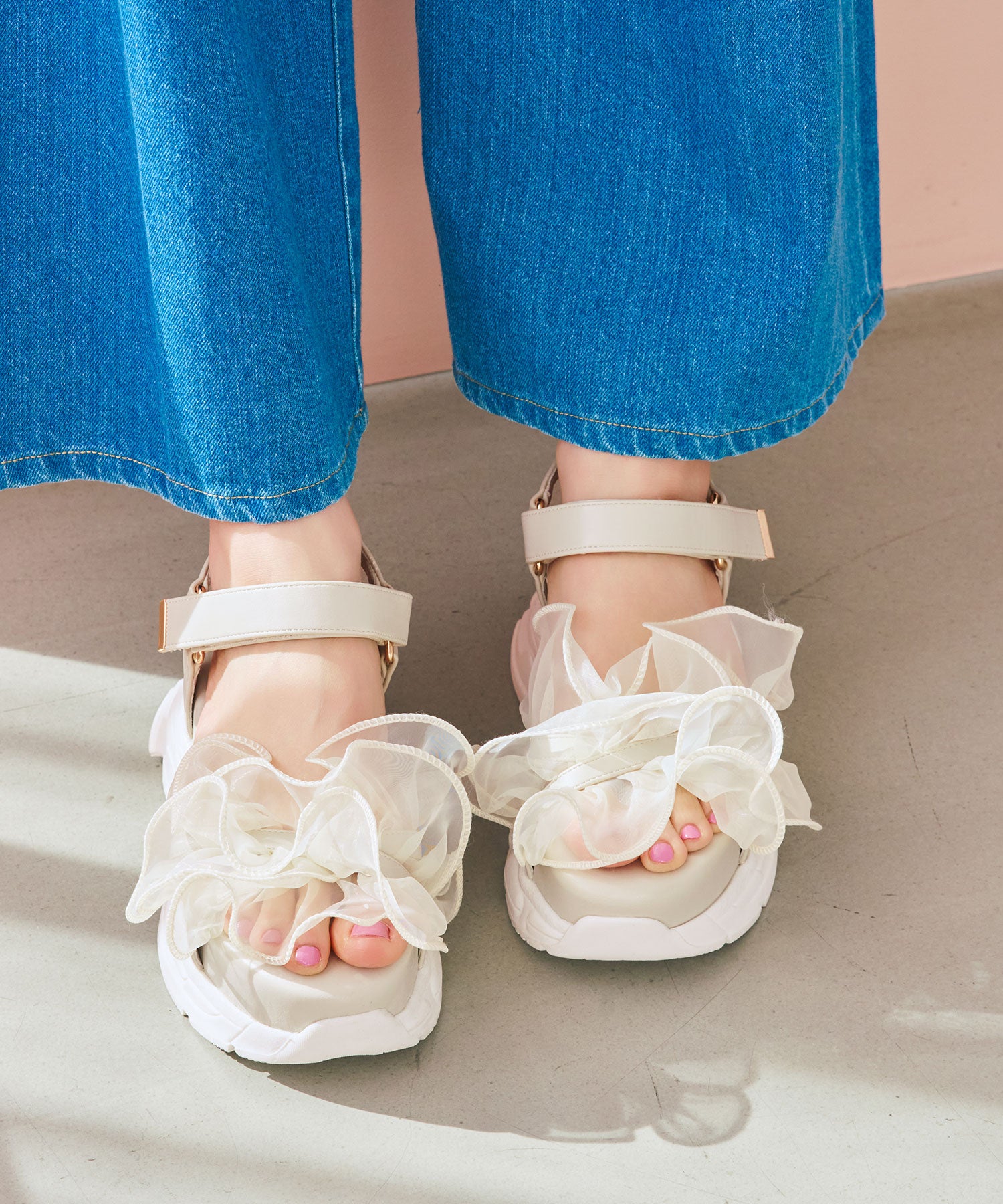 足元を飾るたっぷりのボリュームフリルが目を惹くサンダルは、スポーティー×フェミニンのアンバランス感が今年っぽい。透け感のあるチュール素材が程よい抜け感を演出することで、きれいめからカジュアルなコーディネートまで幅広く活躍。合わせやすいベージュ、ブラックと、くすみカラーのブルーは大人な女性でも取り入れやすい春夏らしいカラーです。