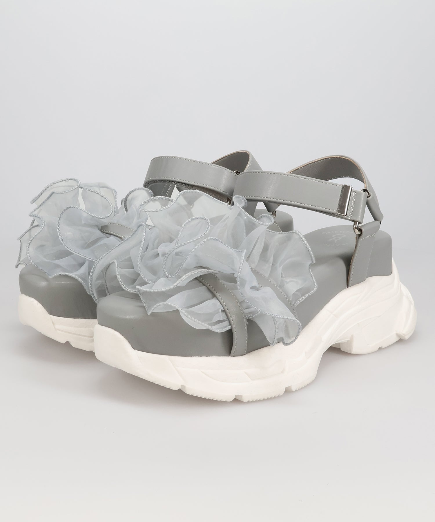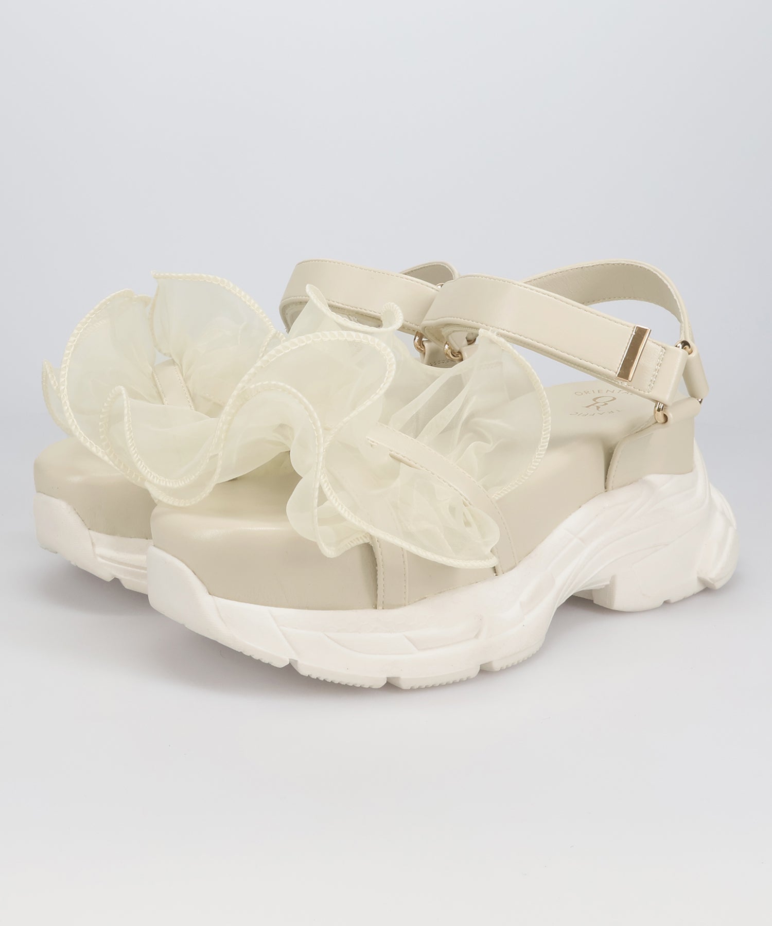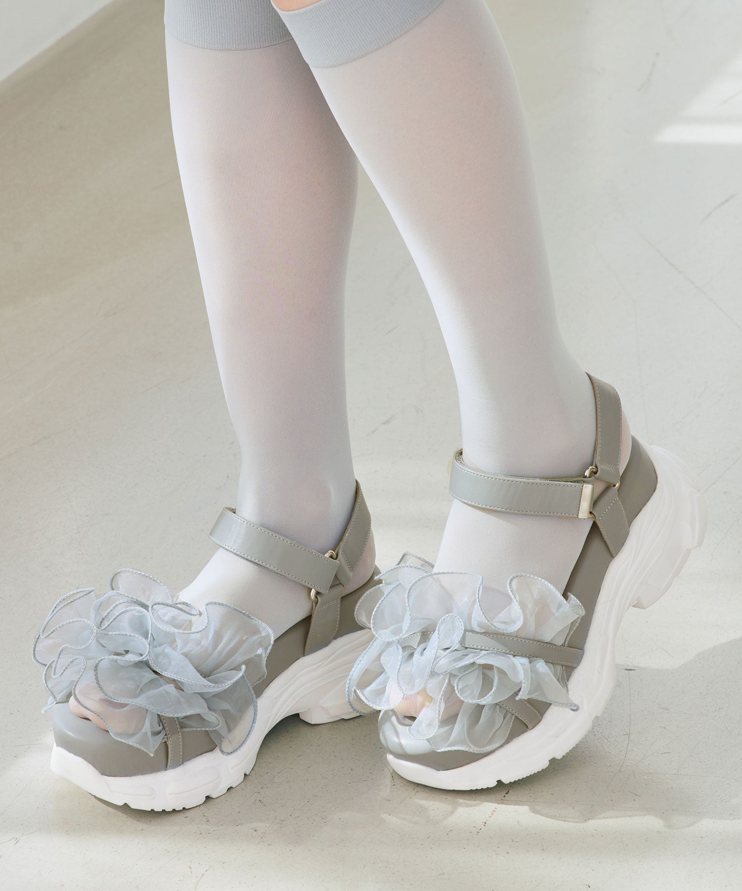 足元を飾るたっぷりのボリュームフリルが目を惹くサンダルは、スポーティー×フェミニンのアンバランス感が今年っぽい。透け感のあるチュール素材が程よい抜け感を演出することで、きれいめからカジュアルなコーディネートまで幅広く活躍。合わせやすいベージュ、ブラックと、くすみカラーのブルーは大人な女性でも取り入れやすい春夏らしいカラーです。