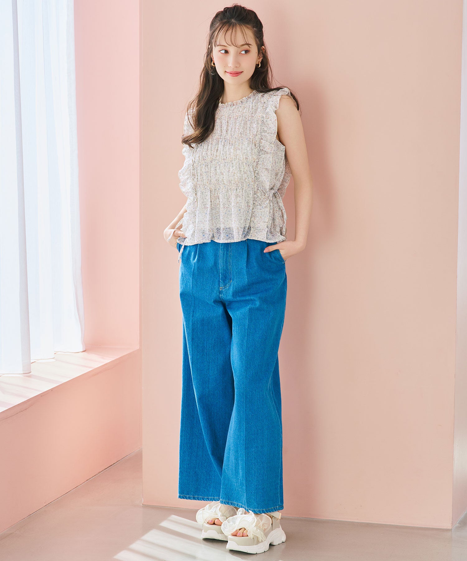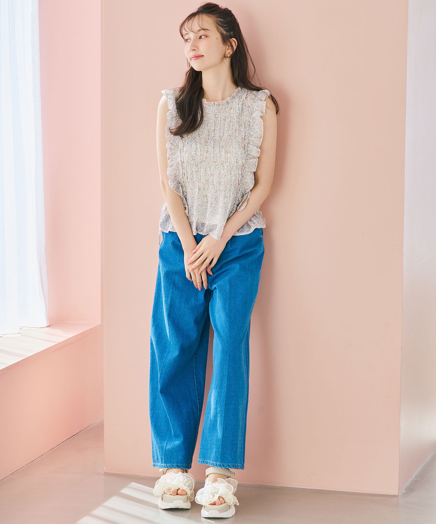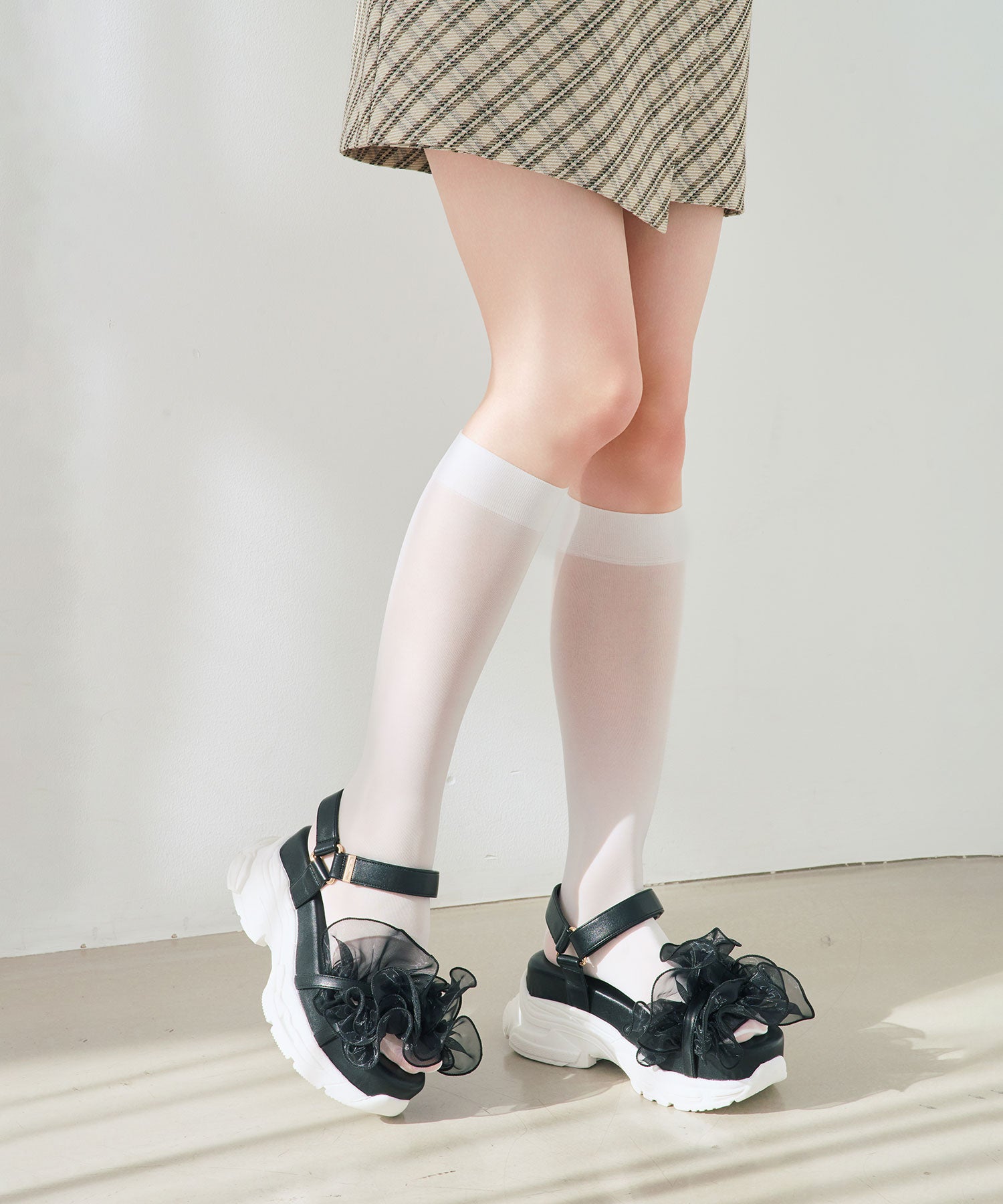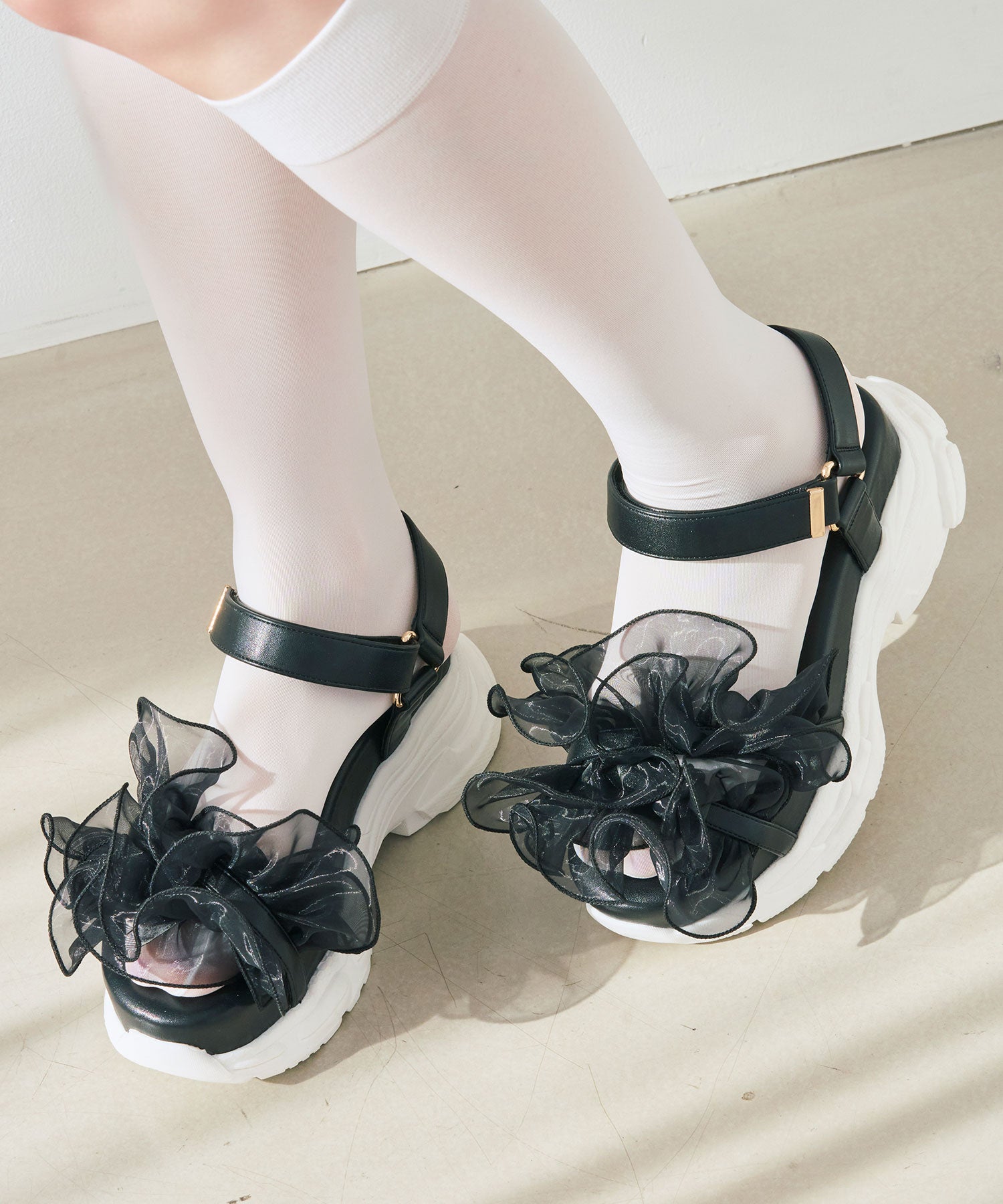 足元を飾るたっぷりのボリュームフリルが目を惹くサンダルは、スポーティー×フェミニンのアンバランス感が今年っぽい。透け感のあるチュール素材が程よい抜け感を演出することで、きれいめからカジュアルなコーディネートまで幅広く活躍。合わせやすいベージュ、ブラックと、くすみカラーのブルーは大人な女性でも取り入れやすい春夏らしいカラーです。