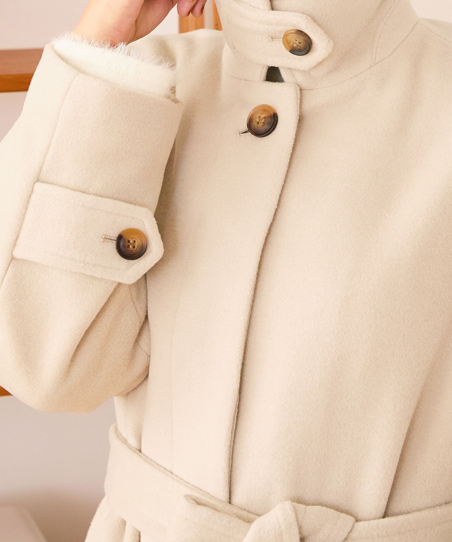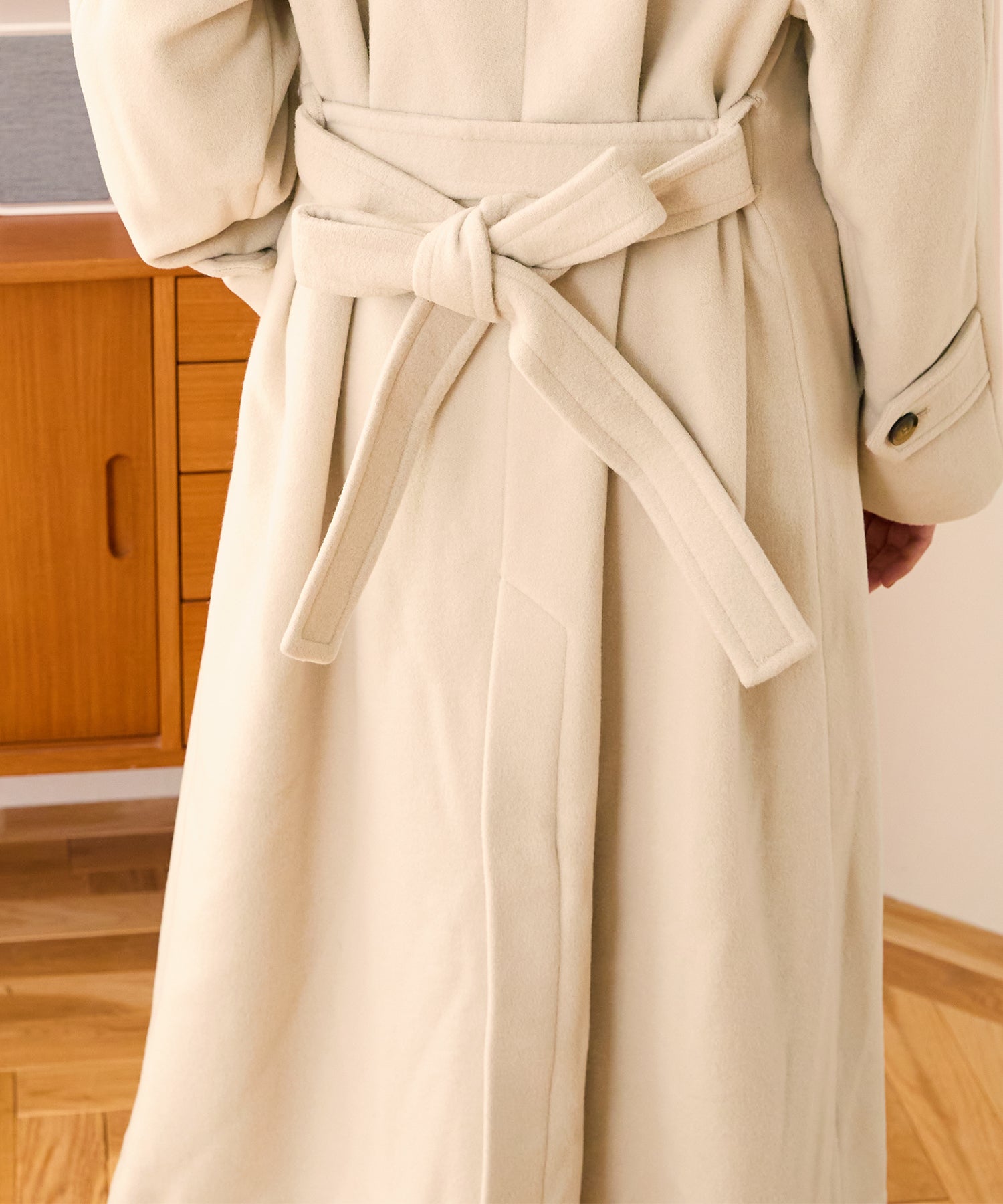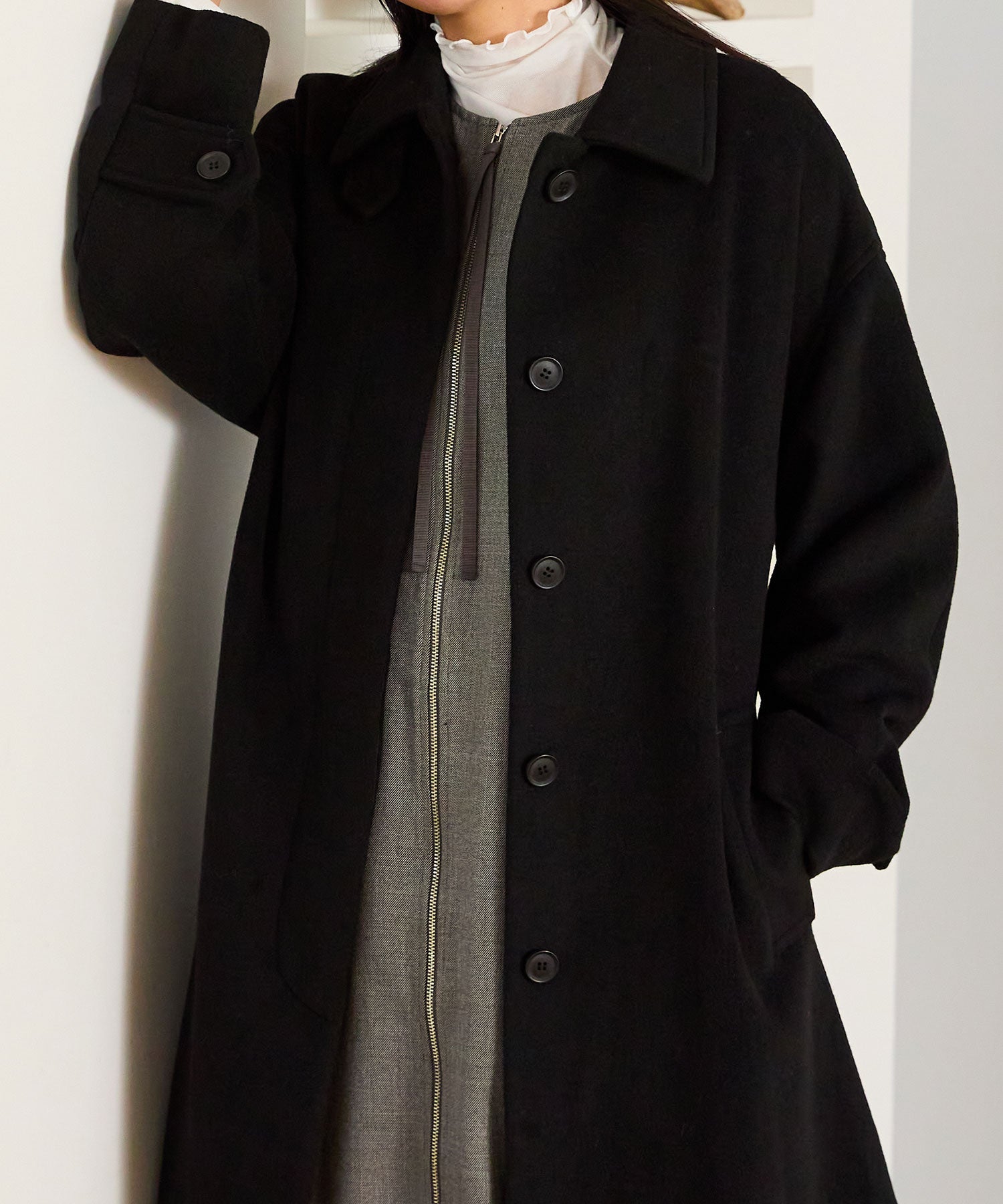 着るだけでワンランク上のコーディネートに仕上がるステンカラーコート。衿のボタンを閉めてステンカラーにしても、ボタンを開けて衿をおろしても使える2wayデザインで印象がぐっと変わるアイテム。ウエストのリボンは前後で結んでマークすることができるので、1枚で何通りもおしゃれを楽しめる。1番上のボタン以外を全て隠しボタンにすることで見た目をすっきりとさせたのもポイント。