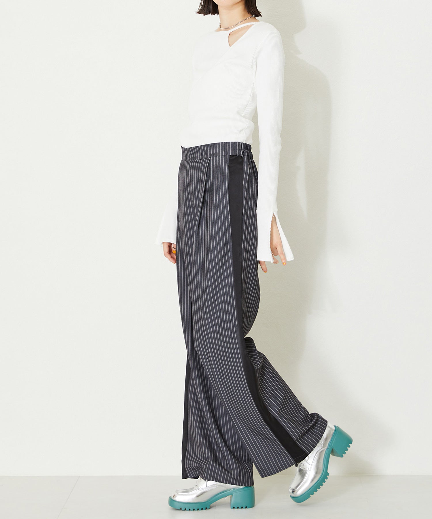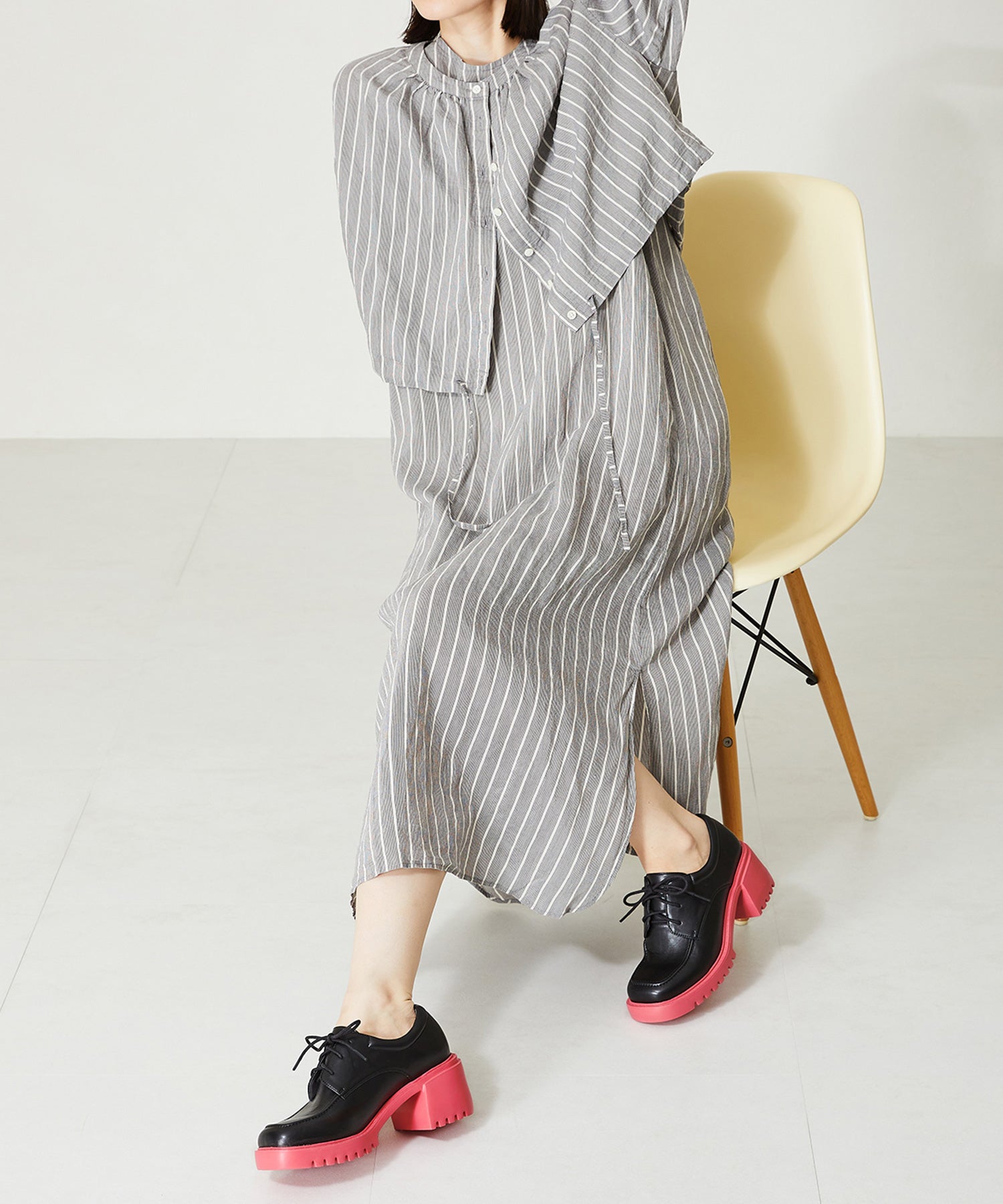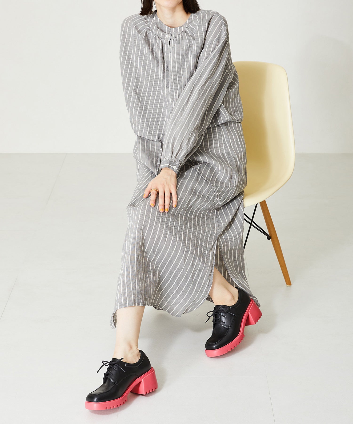 幅広スクエアトゥがお洒落な厚底レースアップシューズ。踵部分にはクッションを施しているので、足にフィットするのが嬉しい。細めのシューレースが全体のバランスを整えてくれるので、ボリュームのあるシルエットでもメンズライクになりすぎない。ブラック×ピンクとシルバー×ブルーのバイカラーのデザインは、ビビットなカラーをソールに使用することで、足元をモードなスタイリングにしてくれる。
