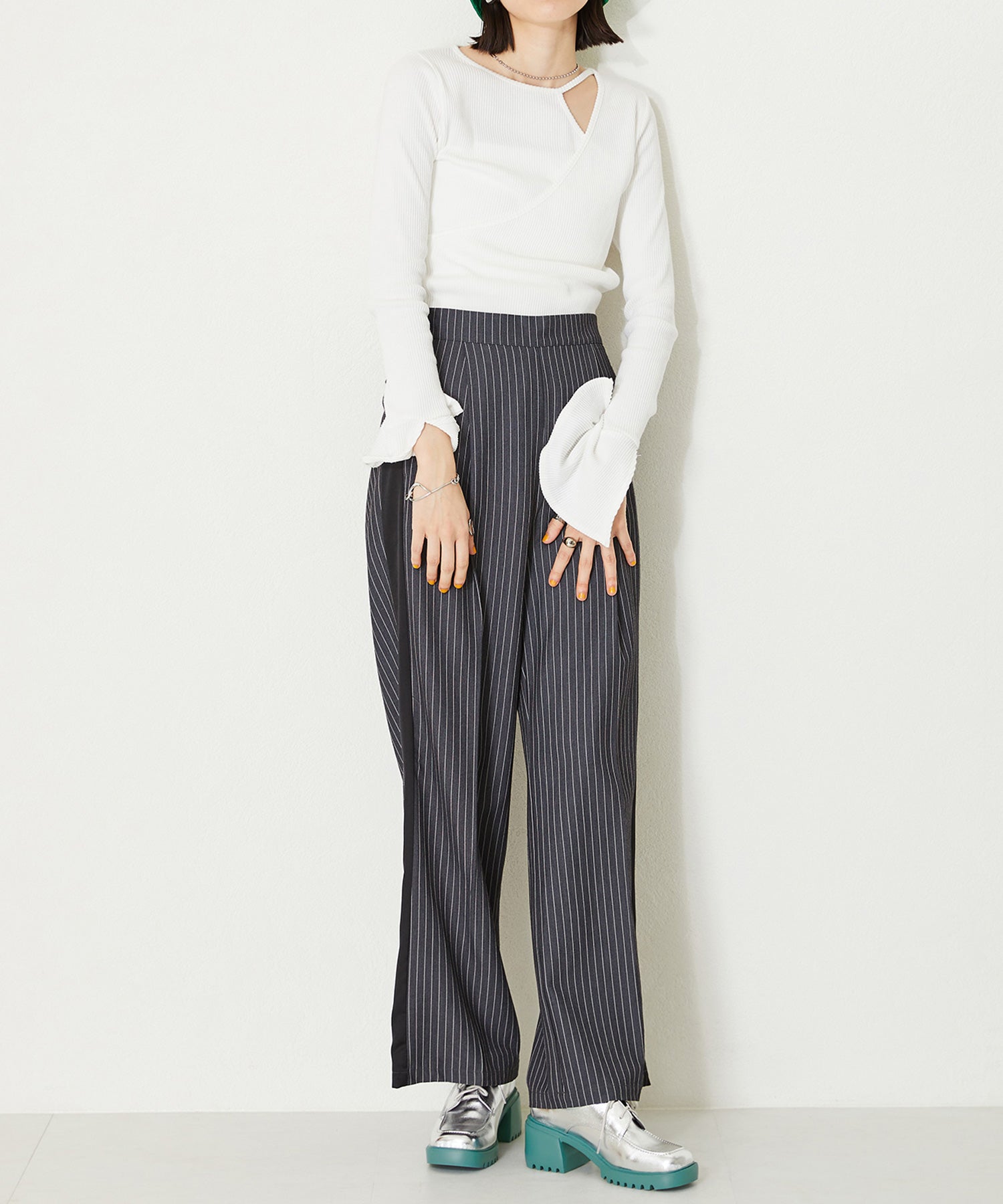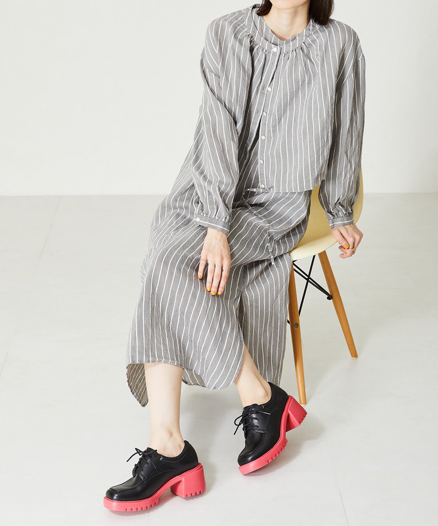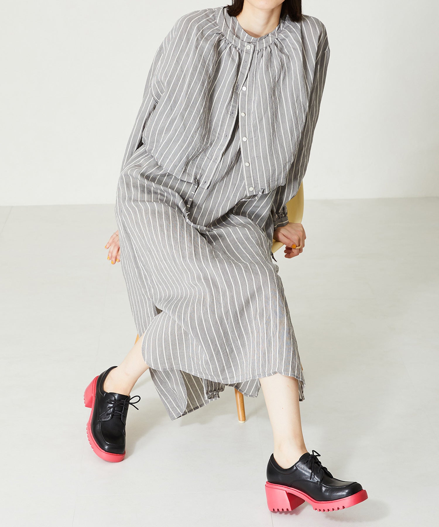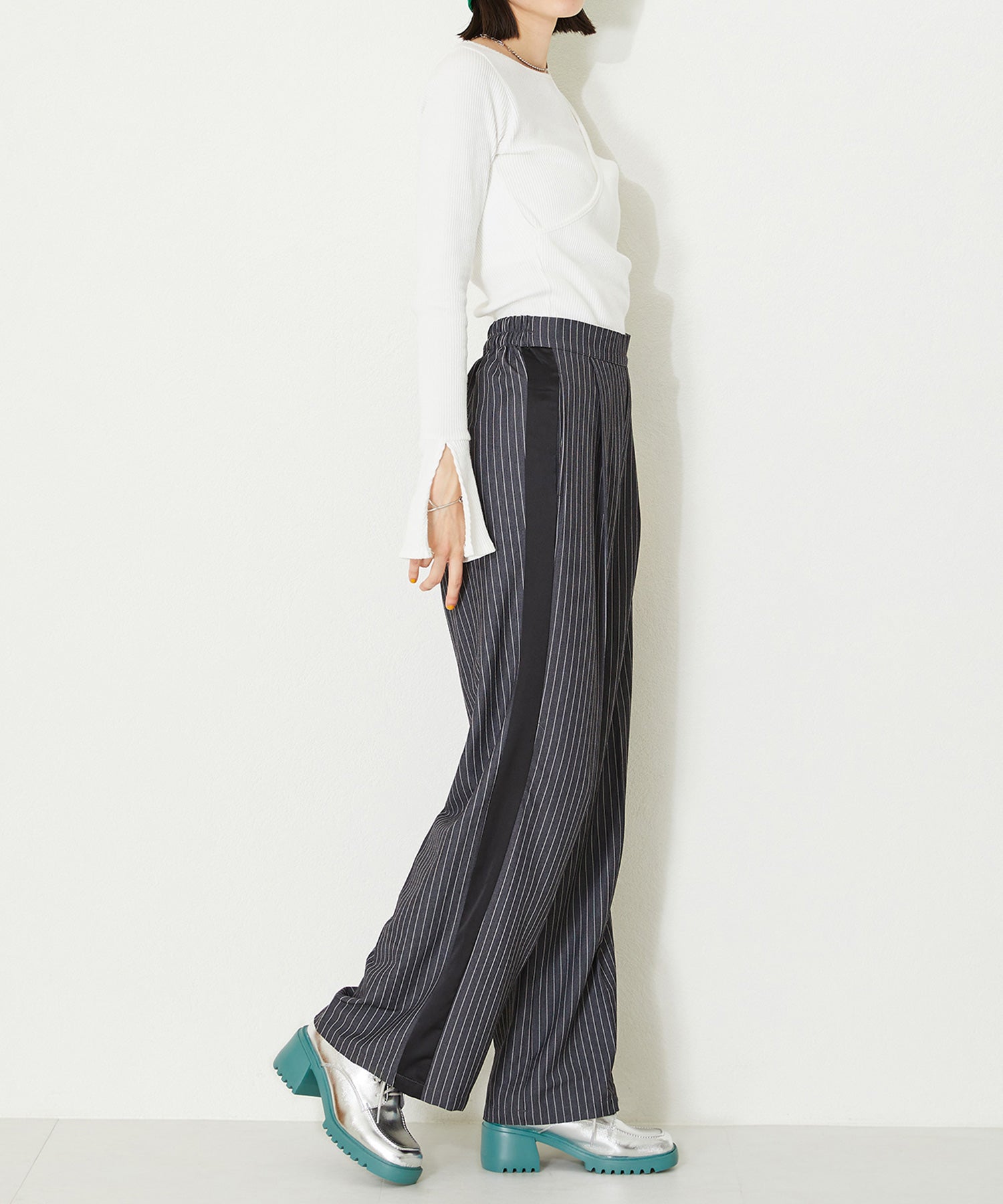 幅広スクエアトゥがお洒落な厚底レースアップシューズ。踵部分にはクッションを施しているので、足にフィットするのが嬉しい。細めのシューレースが全体のバランスを整えてくれるので、ボリュームのあるシルエットでもメンズライクになりすぎない。ブラック×ピンクとシルバー×ブルーのバイカラーのデザインは、ビビットなカラーをソールに使用することで、足元をモードなスタイリングにしてくれる。