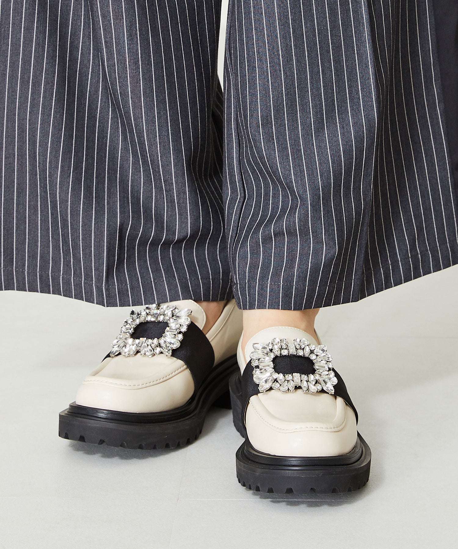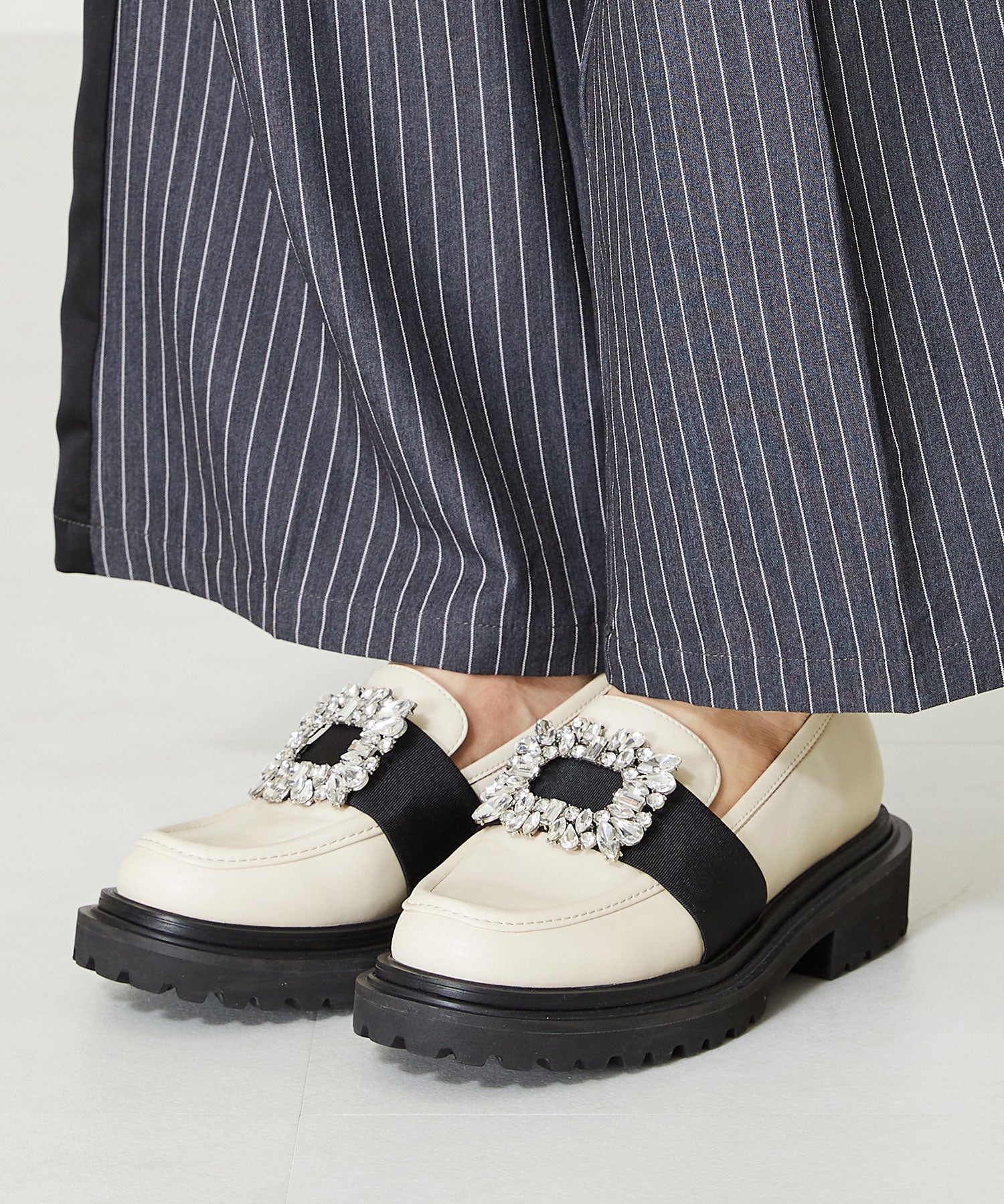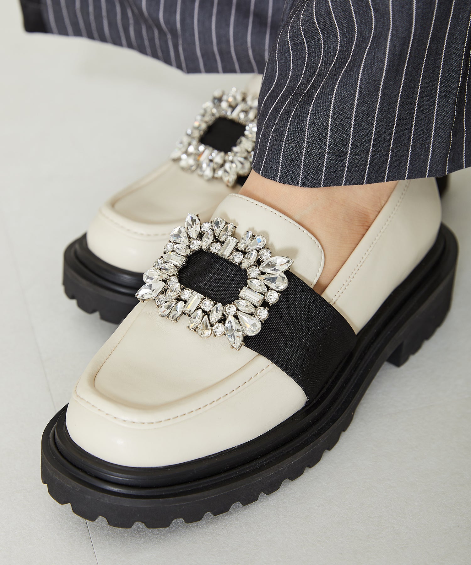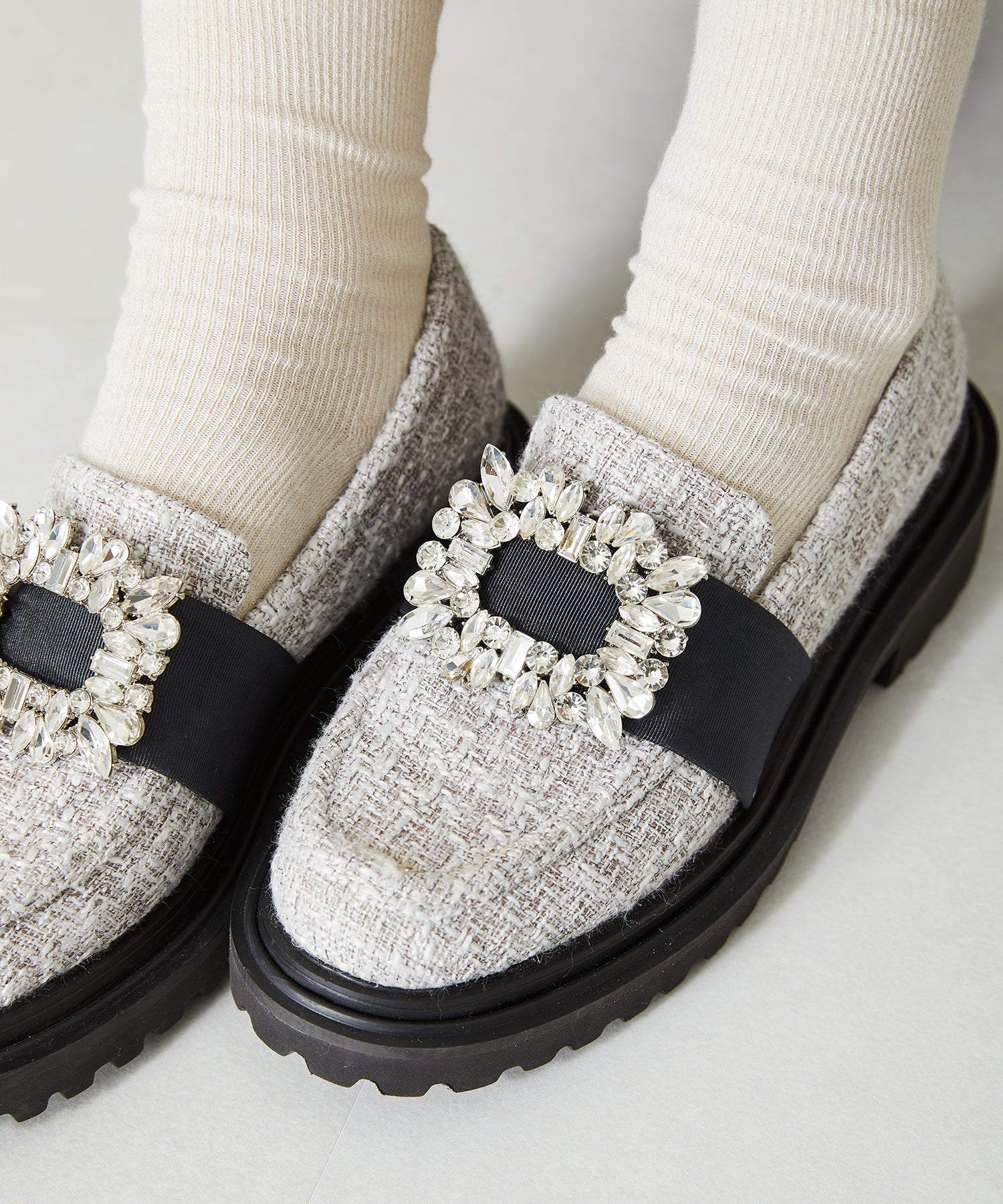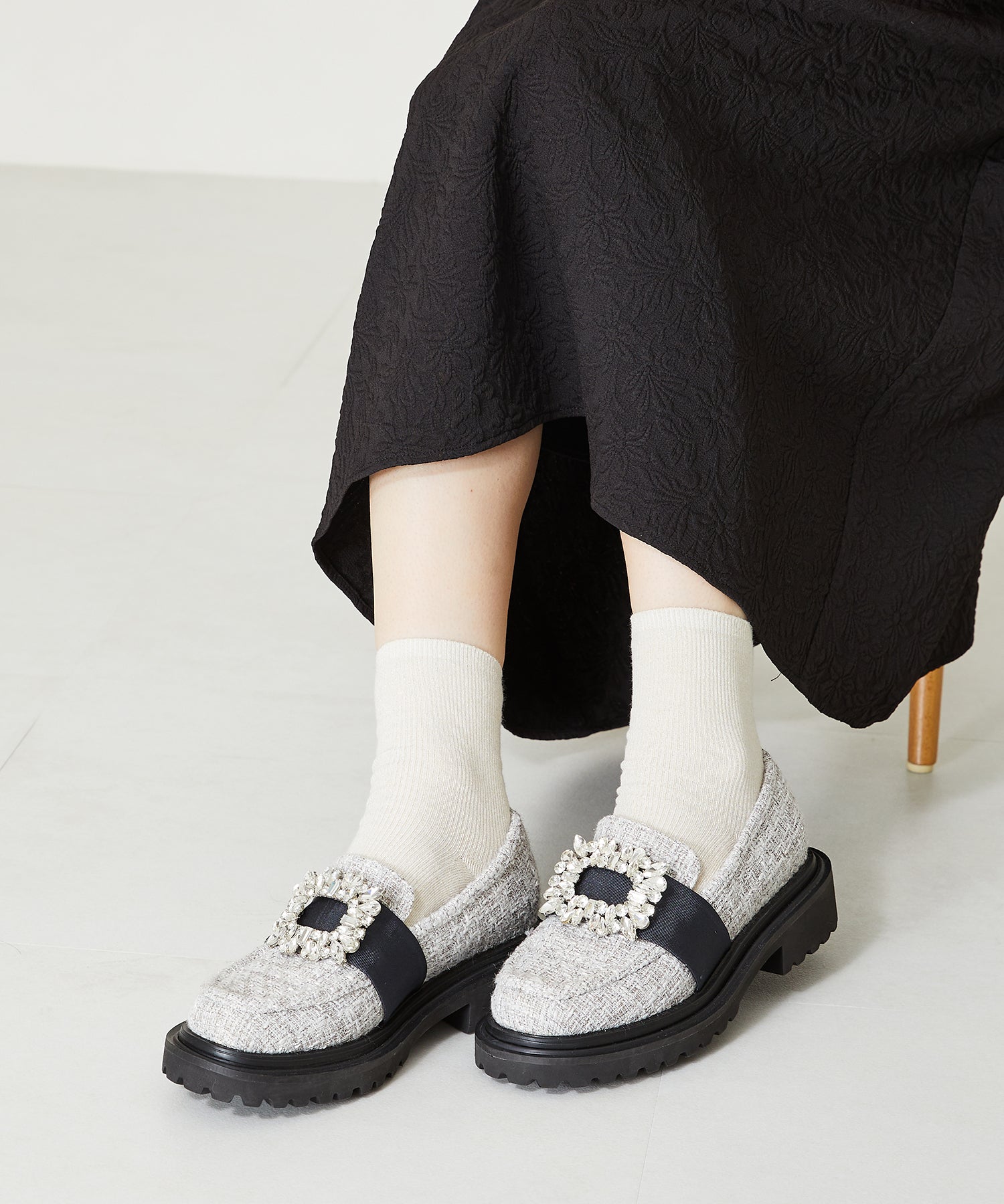 大小様々なクリアビジューが華やかなローファーは、ボリュームソールで程よくカジュアルダウンし普段使いしやすいデザインに落とし込んだ1足。ブラックは春夏でも軽く見えるエナメル素材を使用し、ホワイトはセミマットな質感で高級感をプラス。グレーはラメを織り込んでいるツイード素材で明るい印象に。3色異なるカラー中敷で脱いでも可愛い、こだわりの詰まったアイテム。