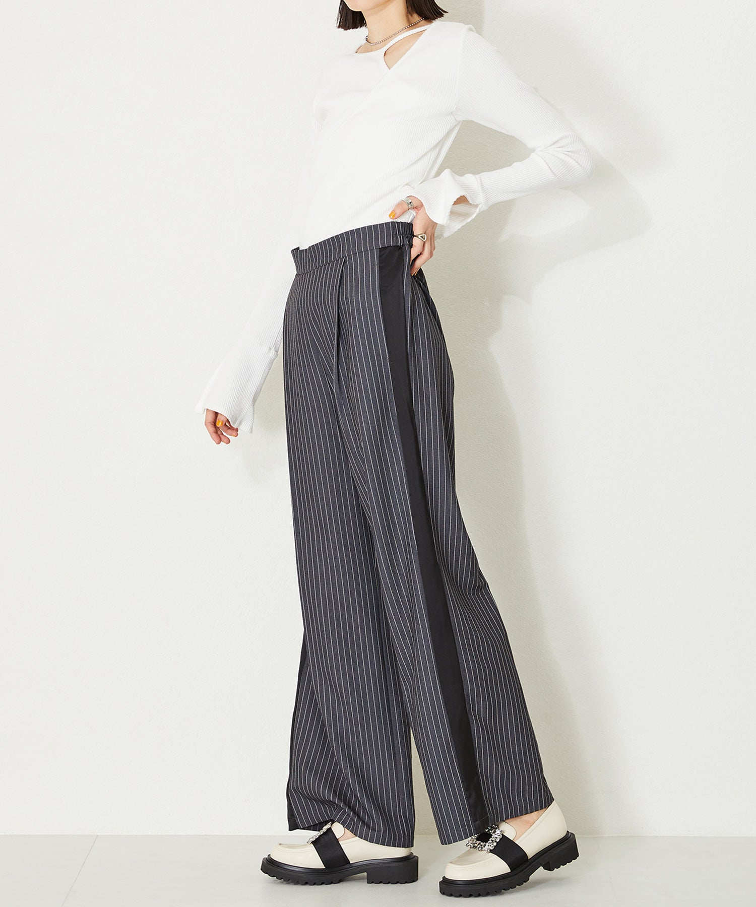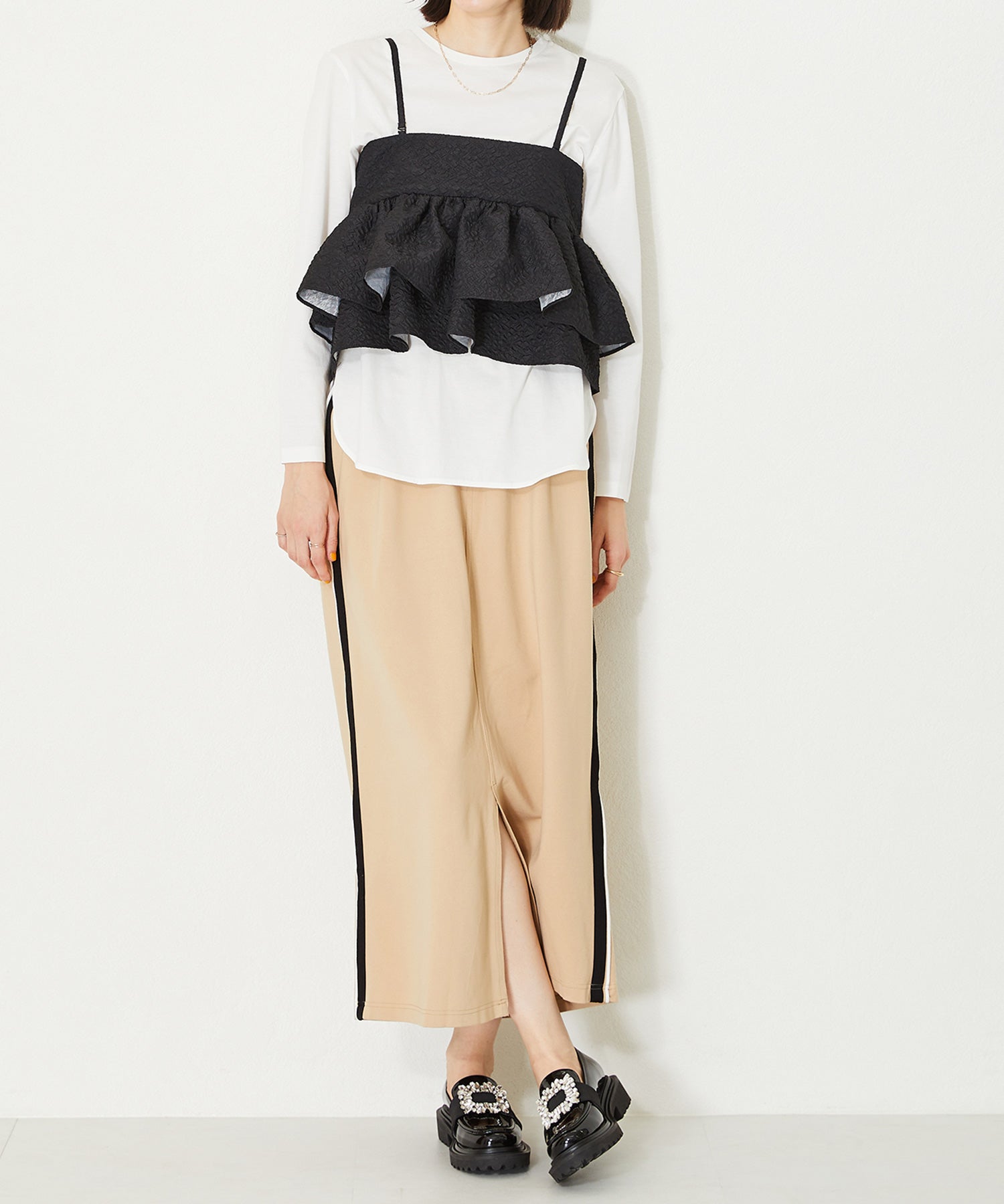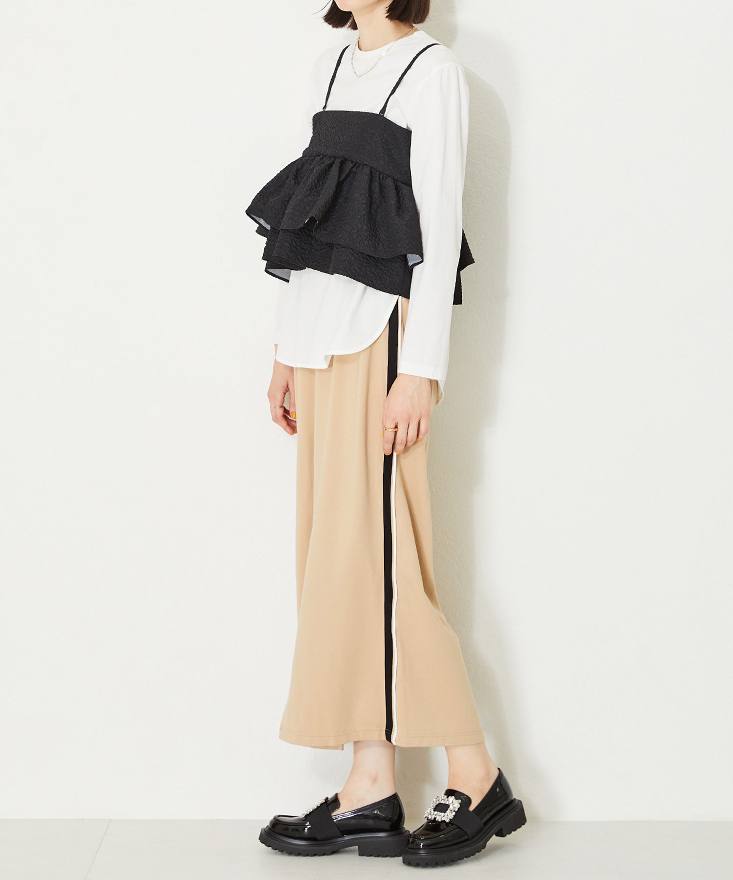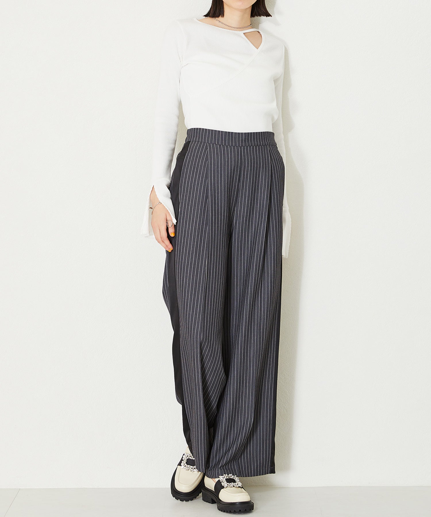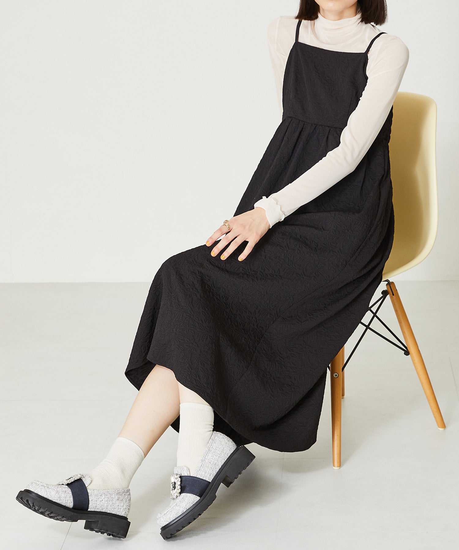 大小様々なクリアビジューが華やかなローファーは、ボリュームソールで程よくカジュアルダウンし普段使いしやすいデザインに落とし込んだ1足。ブラックは春夏でも軽く見えるエナメル素材を使用し、ホワイトはセミマットな質感で高級感をプラス。グレーはラメを織り込んでいるツイード素材で明るい印象に。3色異なるカラー中敷で脱いでも可愛い、こだわりの詰まったアイテム。