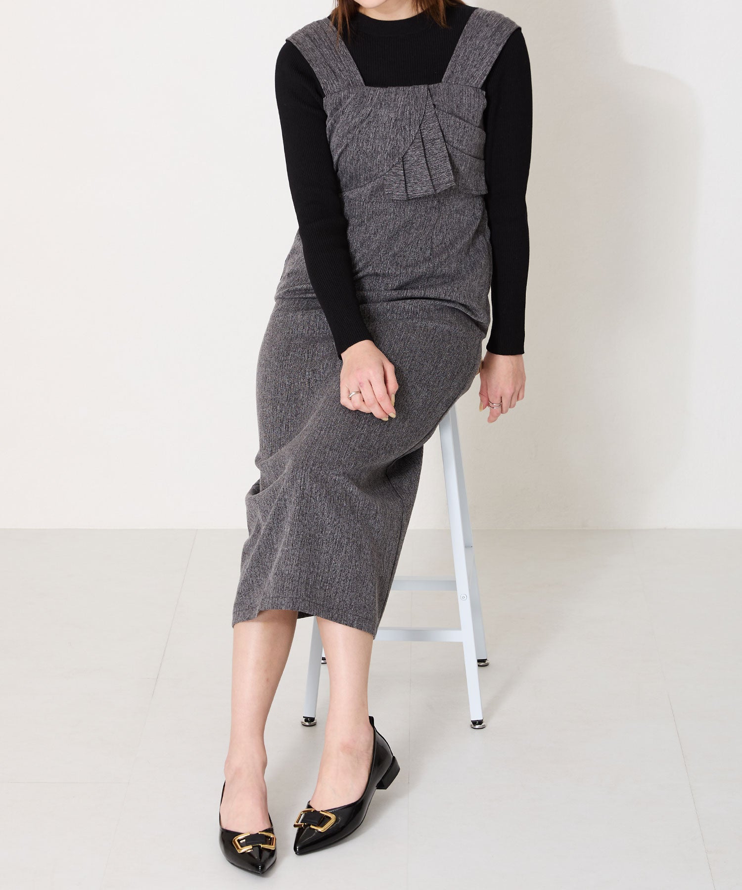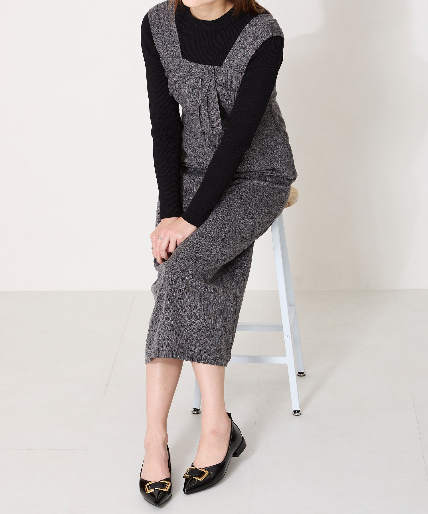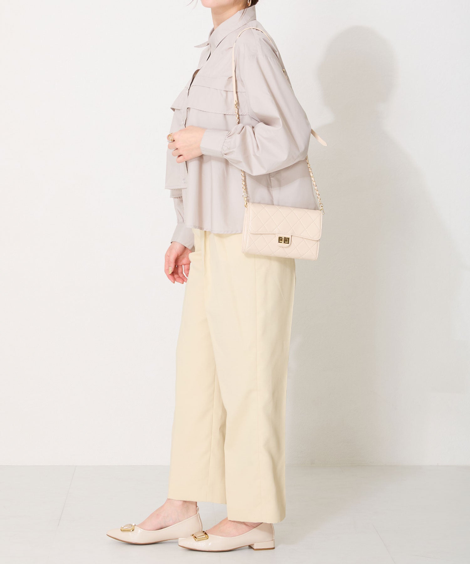 ポインテッドトゥに艶感のある素材感がレディライクなフラットパンプス。大ぶりのゴールドモチーフが高級感をプラスし、オーバーヒールのデザインでさりげなくおしゃれポイントをオン。Vカットの履き口や浅めのカットラインすることで、より足元をすっきり綺麗に見せてくれる。 ヒールまで全体を柔らかな素材を使ったパンプスは、オンオフ兼用で活躍してくれる優秀アイテム。