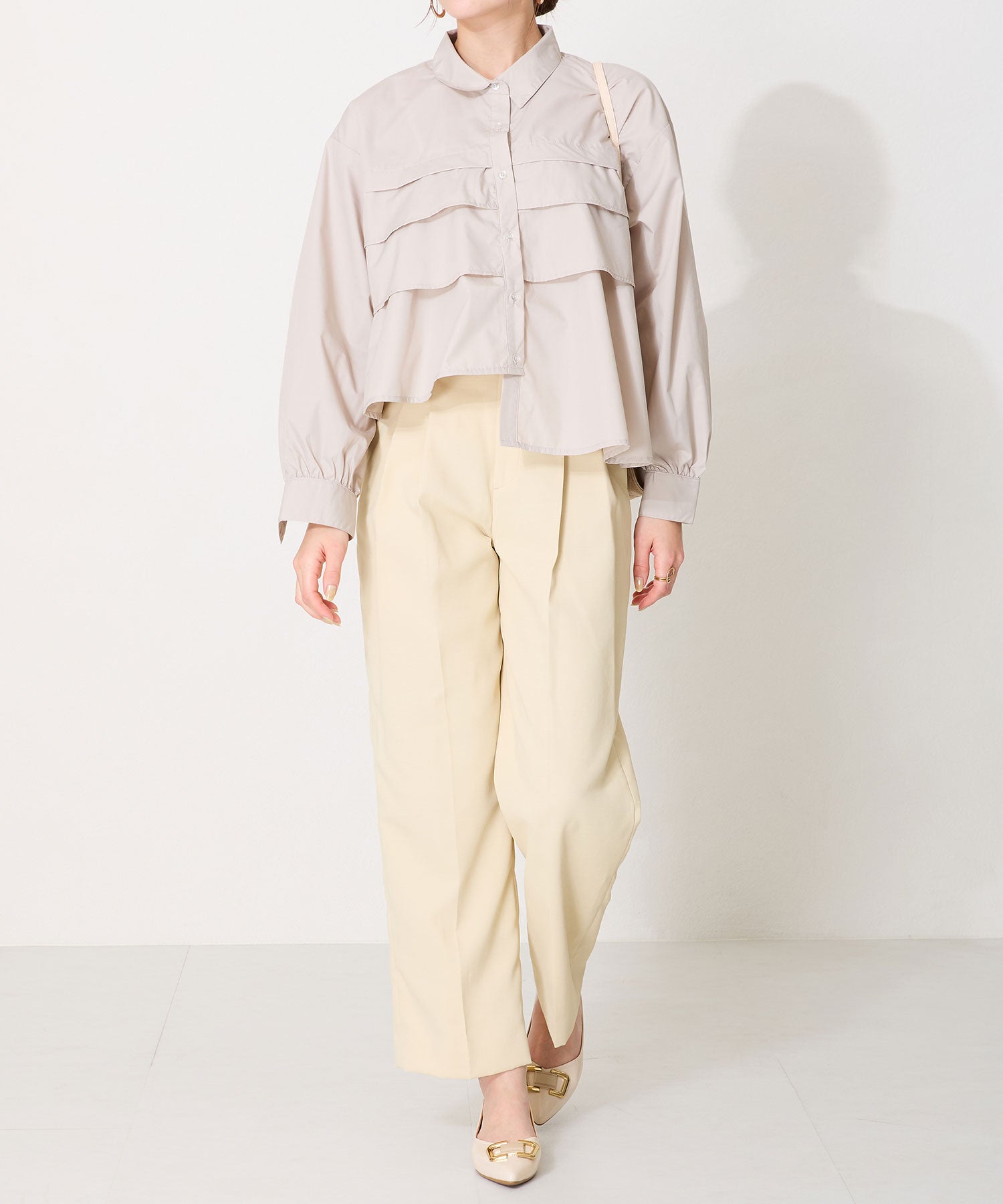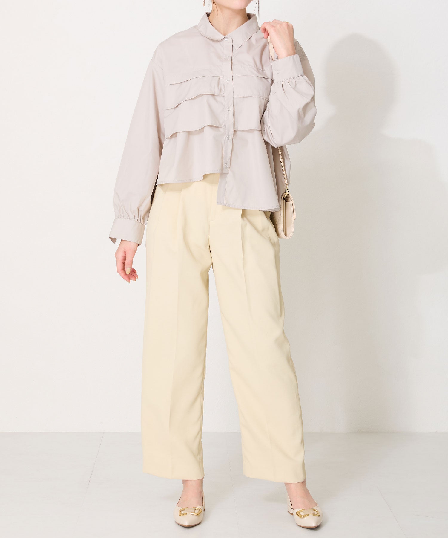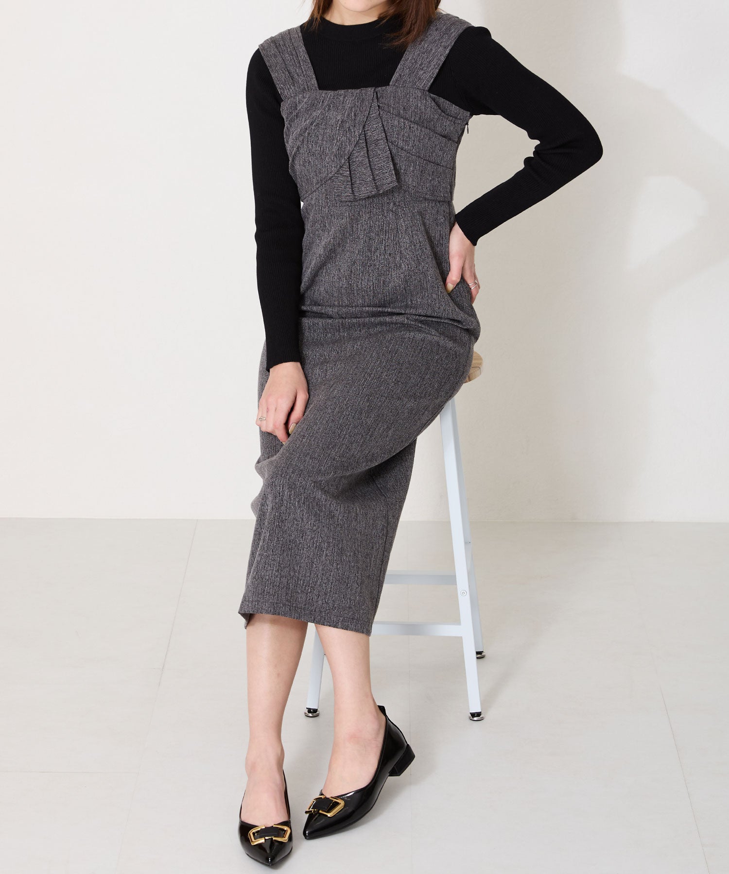 ポインテッドトゥに艶感のある素材感がレディライクなフラットパンプス。大ぶりのゴールドモチーフが高級感をプラスし、オーバーヒールのデザインでさりげなくおしゃれポイントをオン。Vカットの履き口や浅めのカットラインすることで、より足元をすっきり綺麗に見せてくれる。 ヒールまで全体を柔らかな素材を使ったパンプスは、オンオフ兼用で活躍してくれる優秀アイテム。