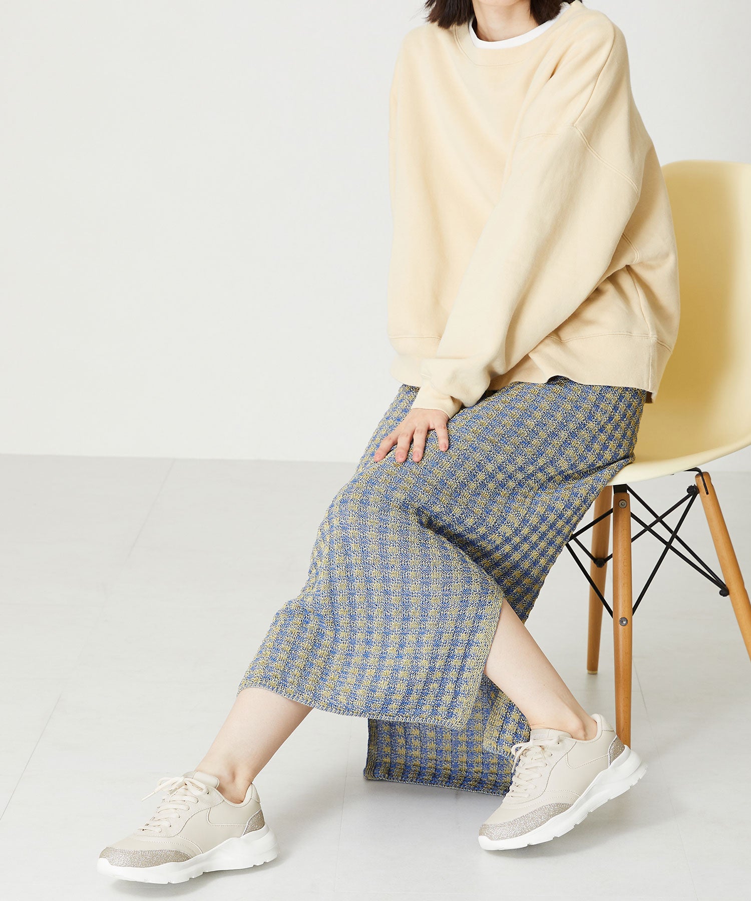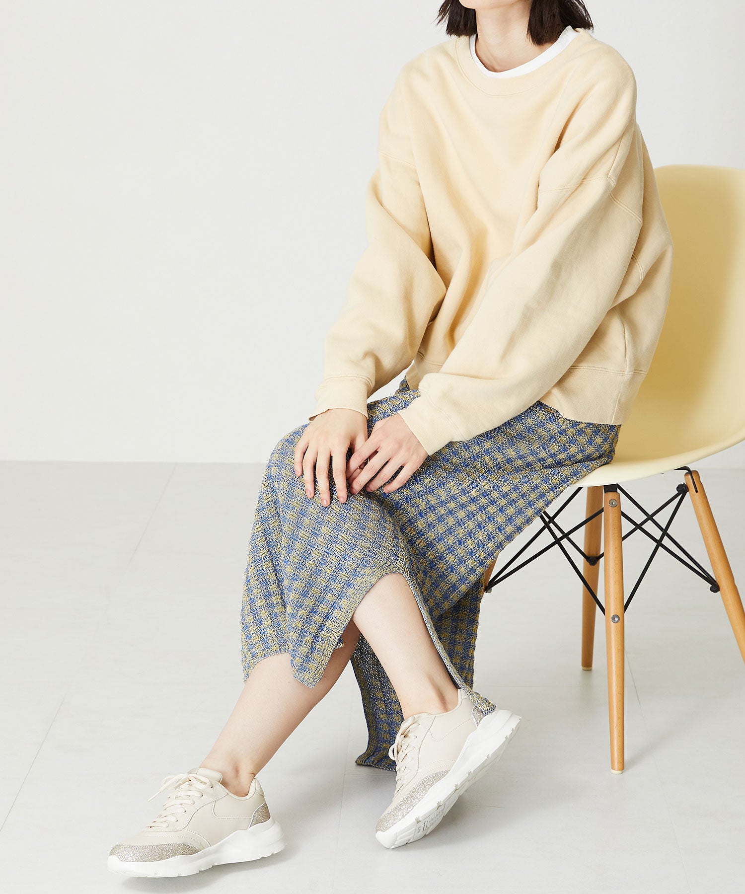 グリッターの切り替えが目を引くスニーカーは細かいラメで派手過ぎず日常使いしやすいデザイン。ホワイトとピンクはホワイトのベースカラーが爽やかな印象で、ラメの可愛さを引き立ててくれる。アッパー全体を同色でまとめたベージュは肌馴染みが良く、カジュアルからフェミニンまでマルチに活躍してくれるカラーリング。