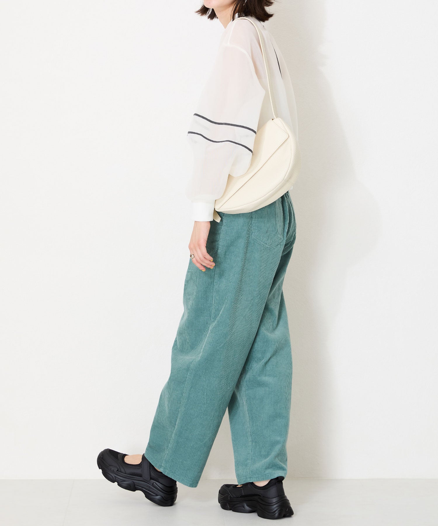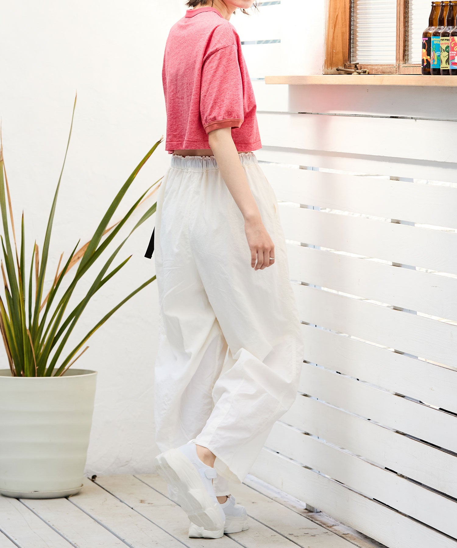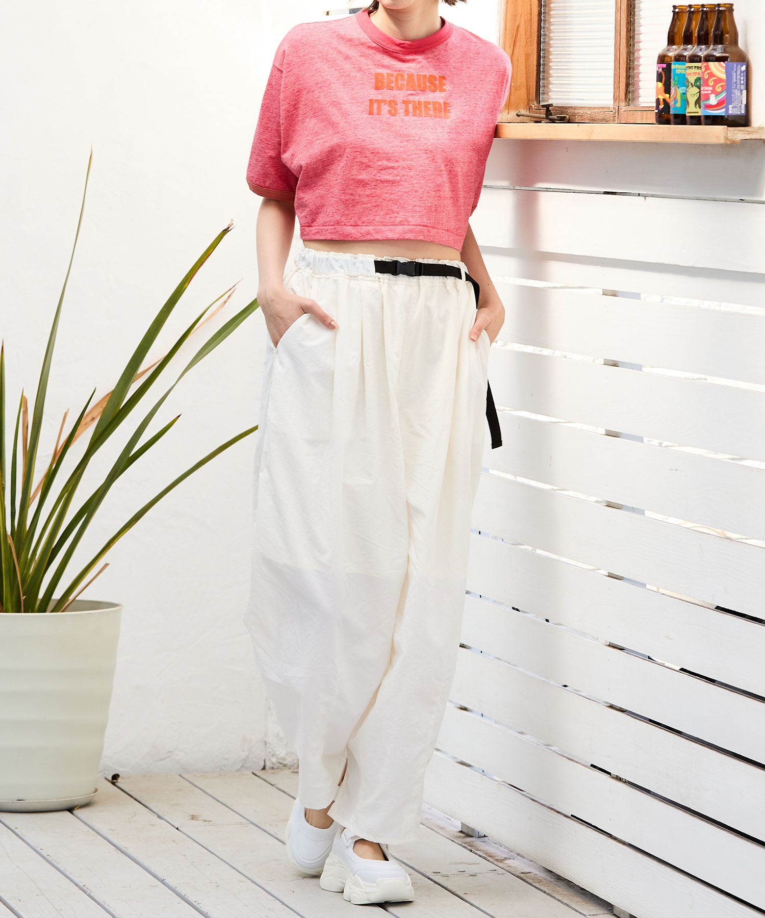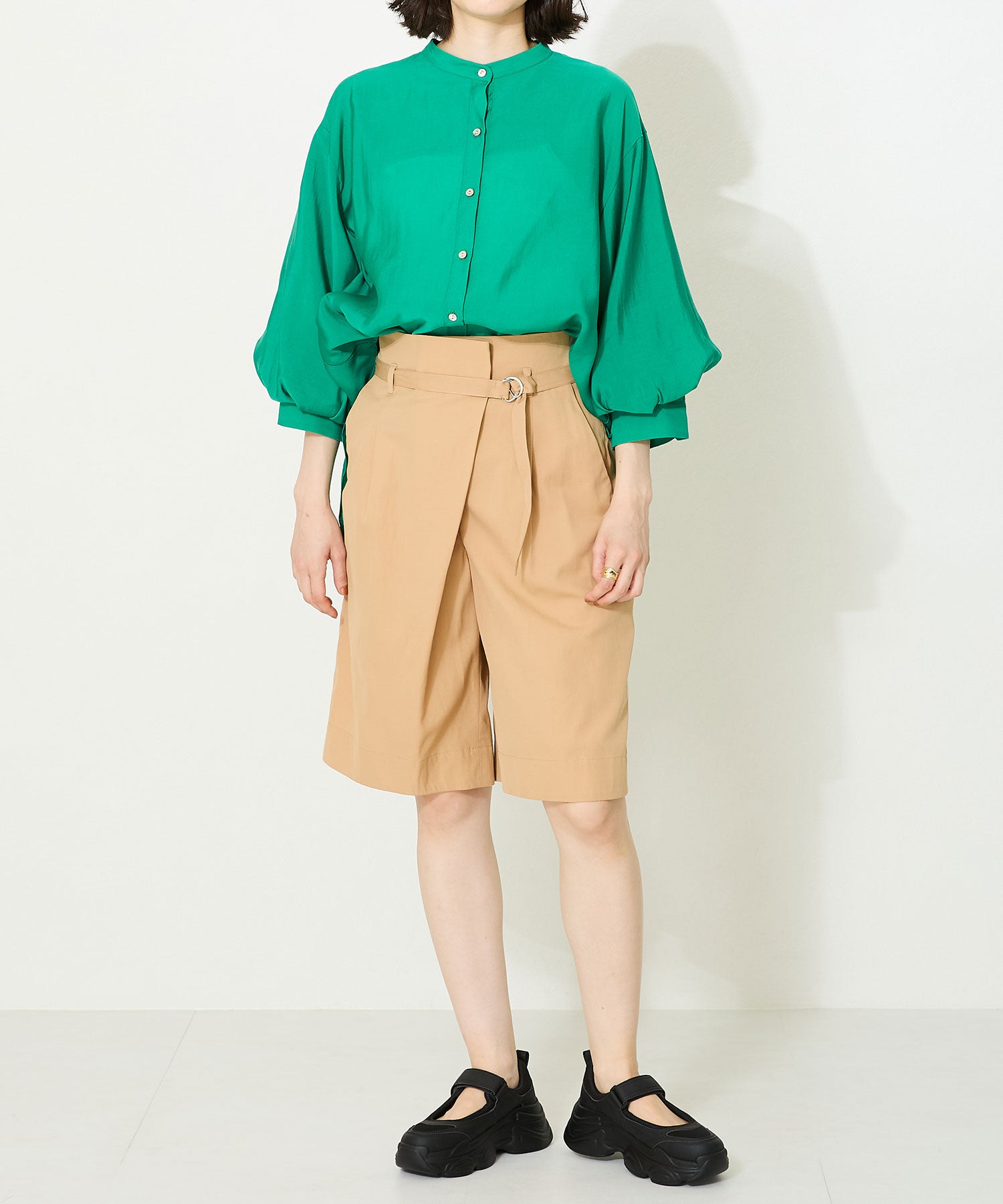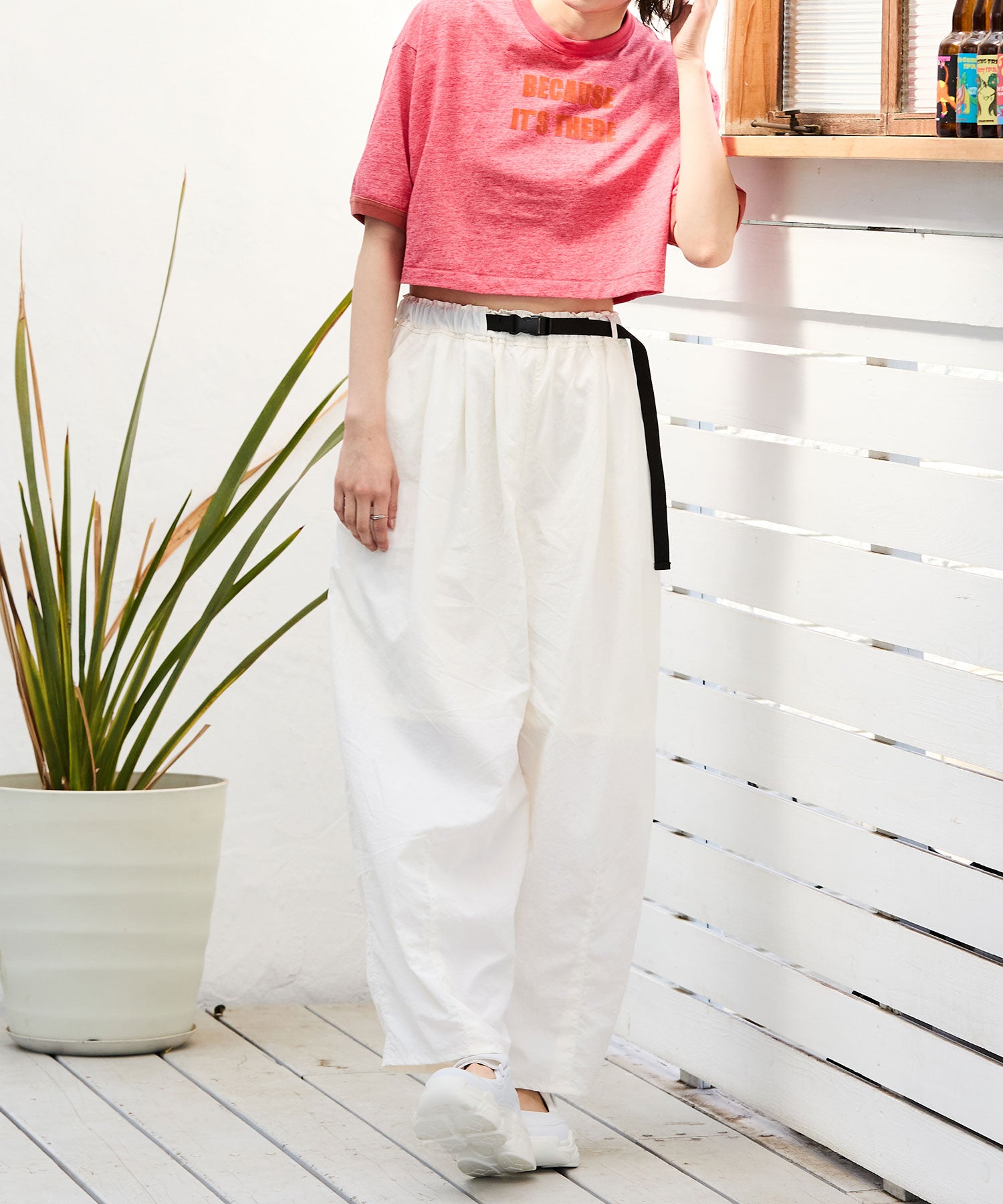 ベルトデザインとボリューム感のあるスニーカーソールの組み合わせが新鮮なアイテムはパンプスの様に足の甲が見えるデザインでいつものスニーカーとは一味違う雰囲気を楽しめる。カラーソックスなどフットウェアをのぞかせて履くのもお勧め。甲のベルトはベルクロタイプで着脱が楽なのはもちろん、自身の足に合わせて止める位置を調節できる優秀アイテム。