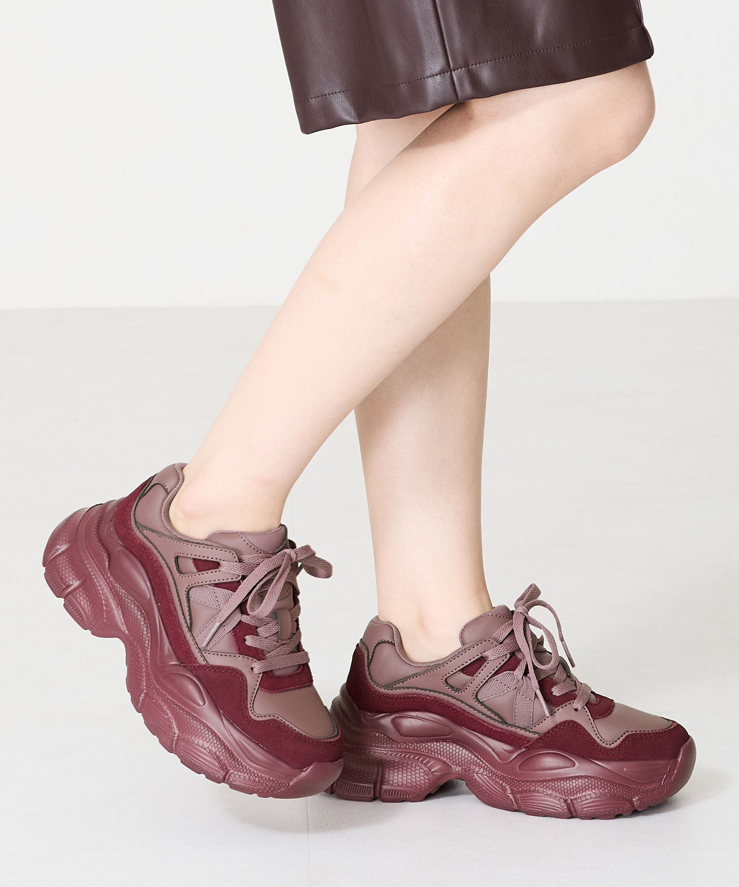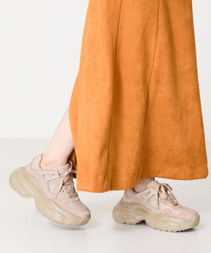 本革スエードを使用した上質な厚底スニーカーは、より高見えするワントーンカラーがおしゃれなアイテム。ボリューミーなフレアソールで女性らしいシルエットも残しつつ、シンプルになりすぎないようソール全体に細かい模様をつけたのもこだわりポイント。カジュアルに履きたいブラックに加え、柔らかい印象のベージュ、コーデを彩る大人っぽいシックなレッドの3色展開。