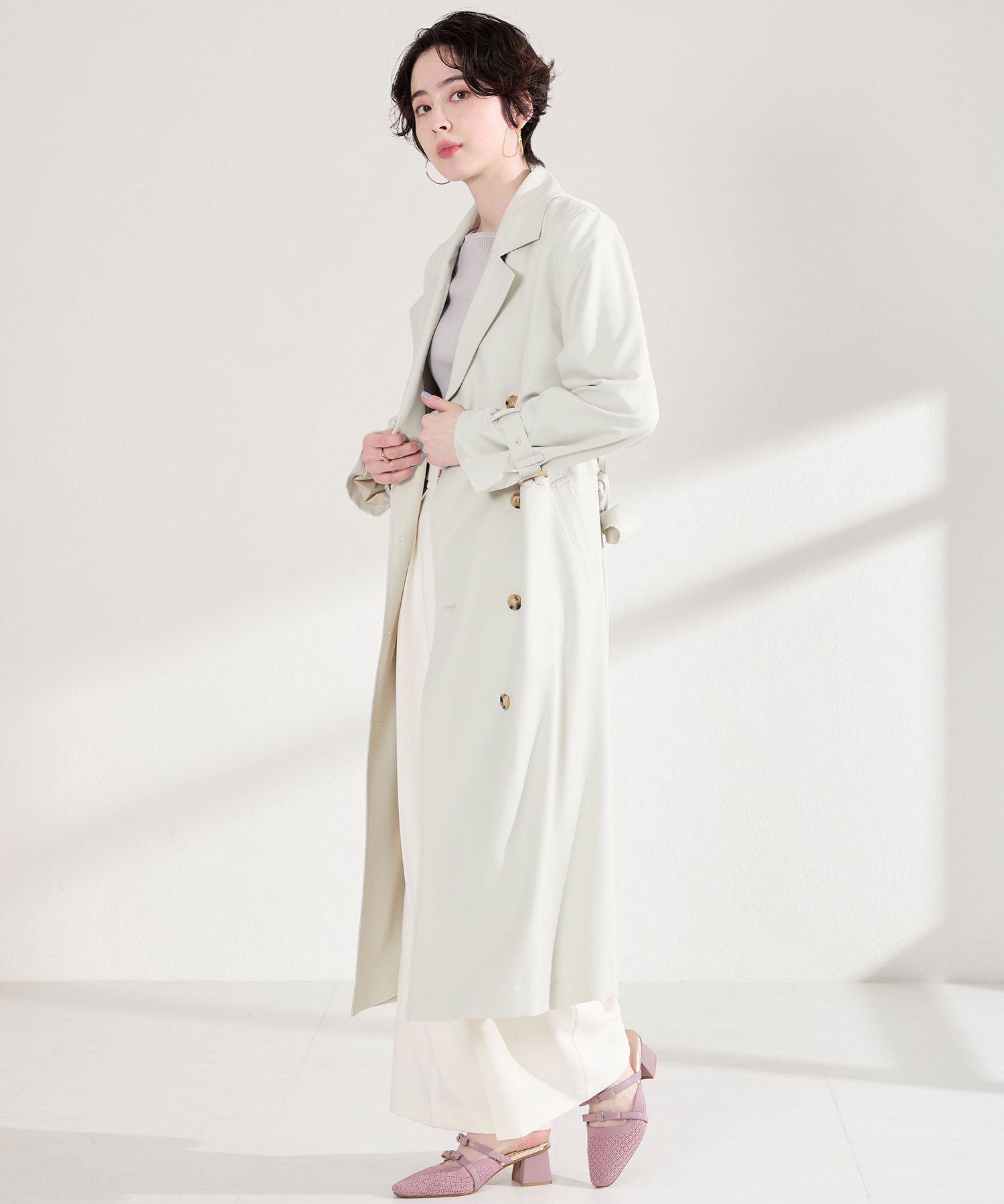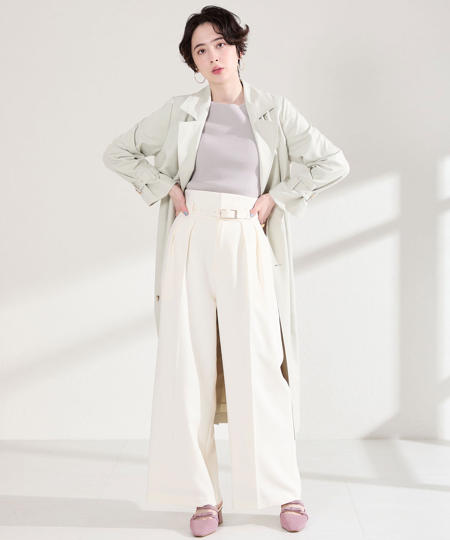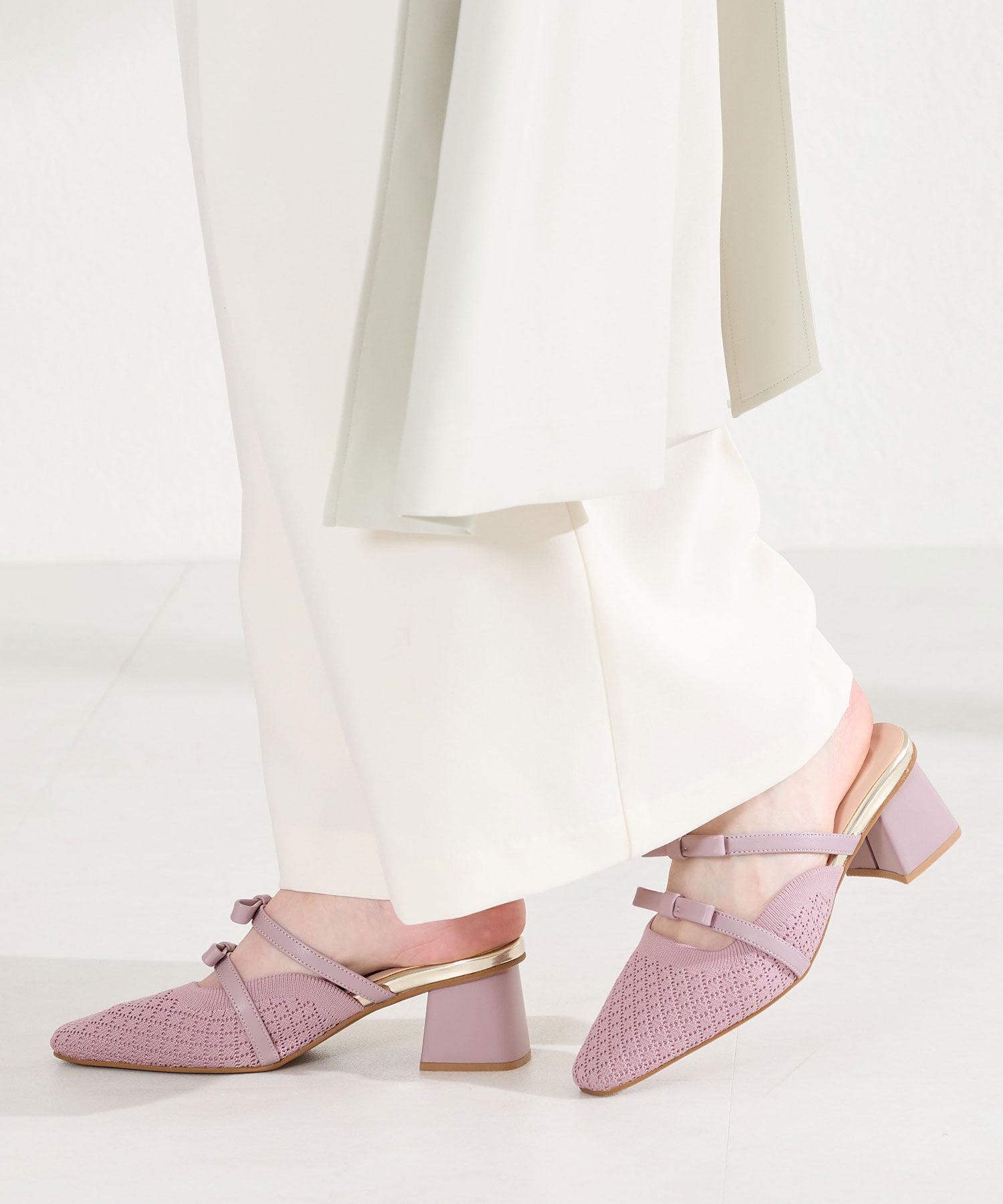 さらっとしたニット素材を使用した女性らしさが際立つミュールパンプスは、ニットを格子状の編地にすることで表情に抜け感をプラス。甲部分のリボンストラップはシンプルながらも程よい甘さをプラスしてくれるだけでなく、2本のストラップがしっかり足をホールドしてくれるので安心の履き心地。ミュールタイプなので脱ぎ履きがしやすく、忙しい日常にもぴったりな1足。