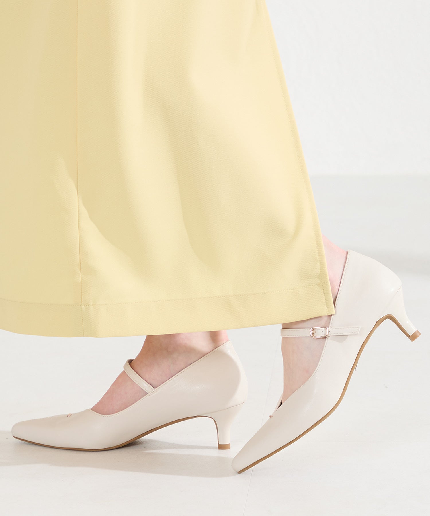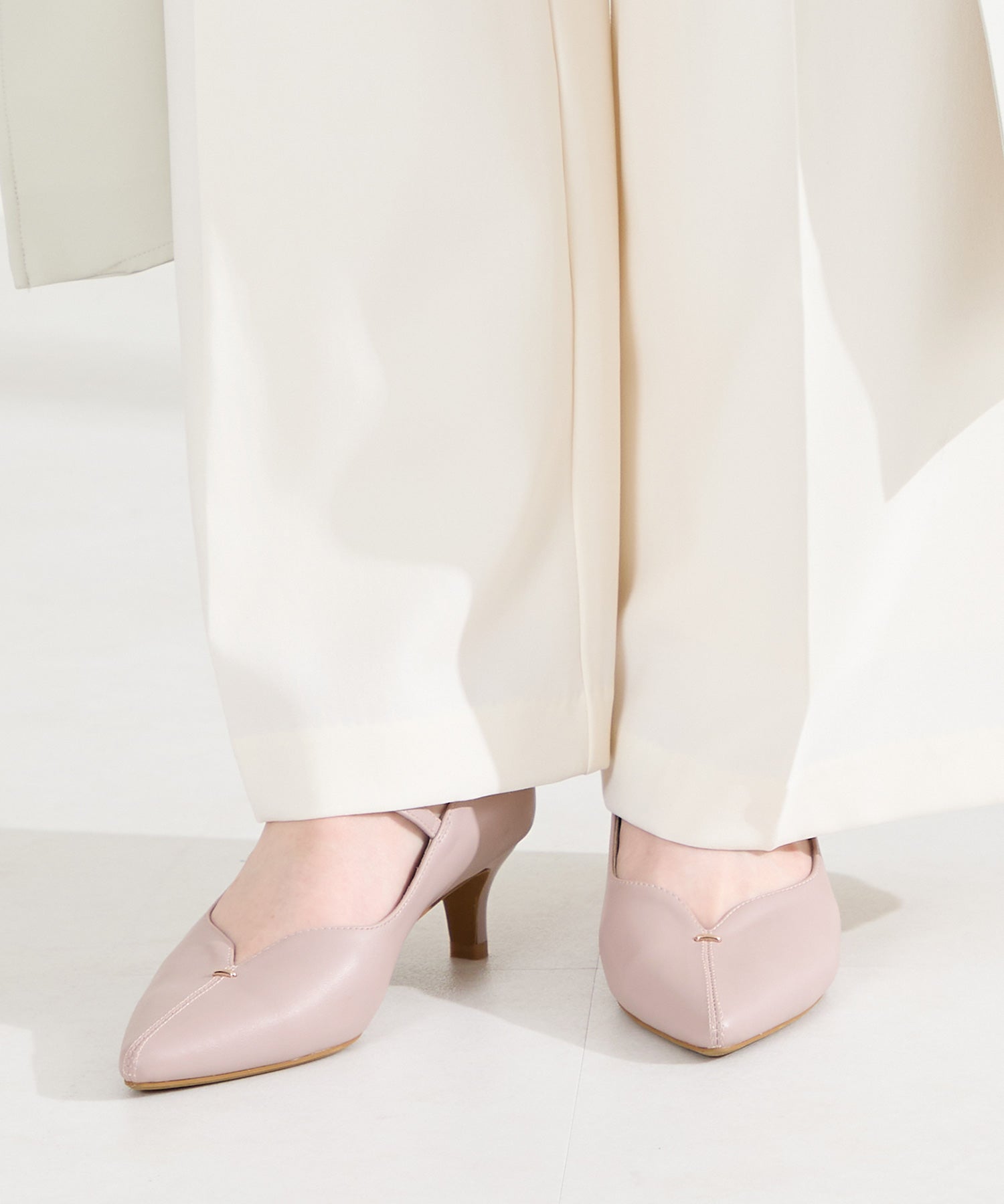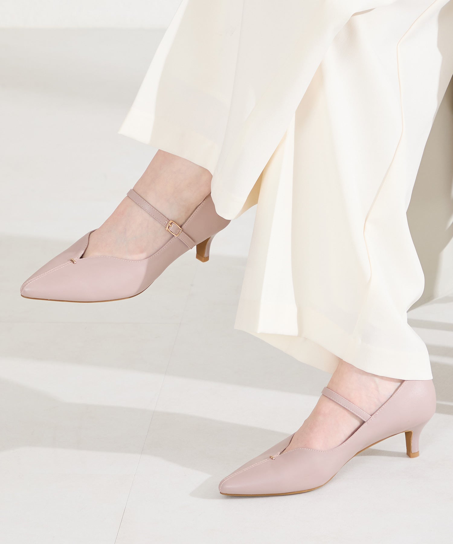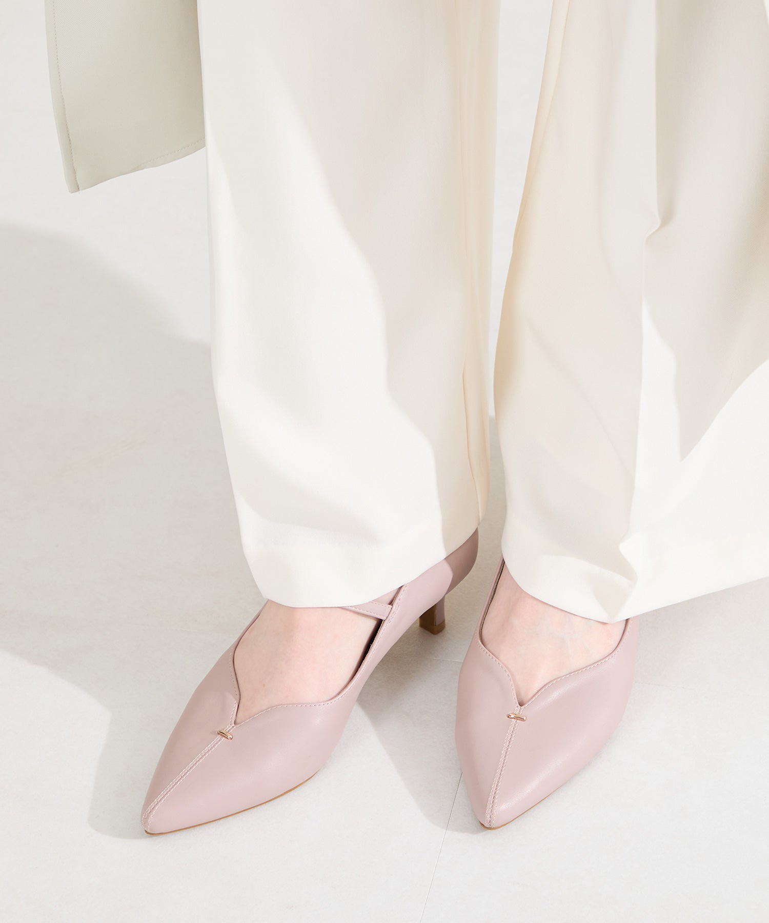 アッパーにメタルパーツとスリットデザインを施した、シンプルながらもアクセントになるパンプス。甲ストラップ付きで足にフィットし、インソールは厚手のクッション入りで長時間履いても疲れにくい。艶ありのヒールが女性らしく、バックシルエットまで抜かりない印象に。淡いベーシックなカラーリングと今季注目のピンクは普段のコーディネートに取り入れるだけで季節感がアップ。