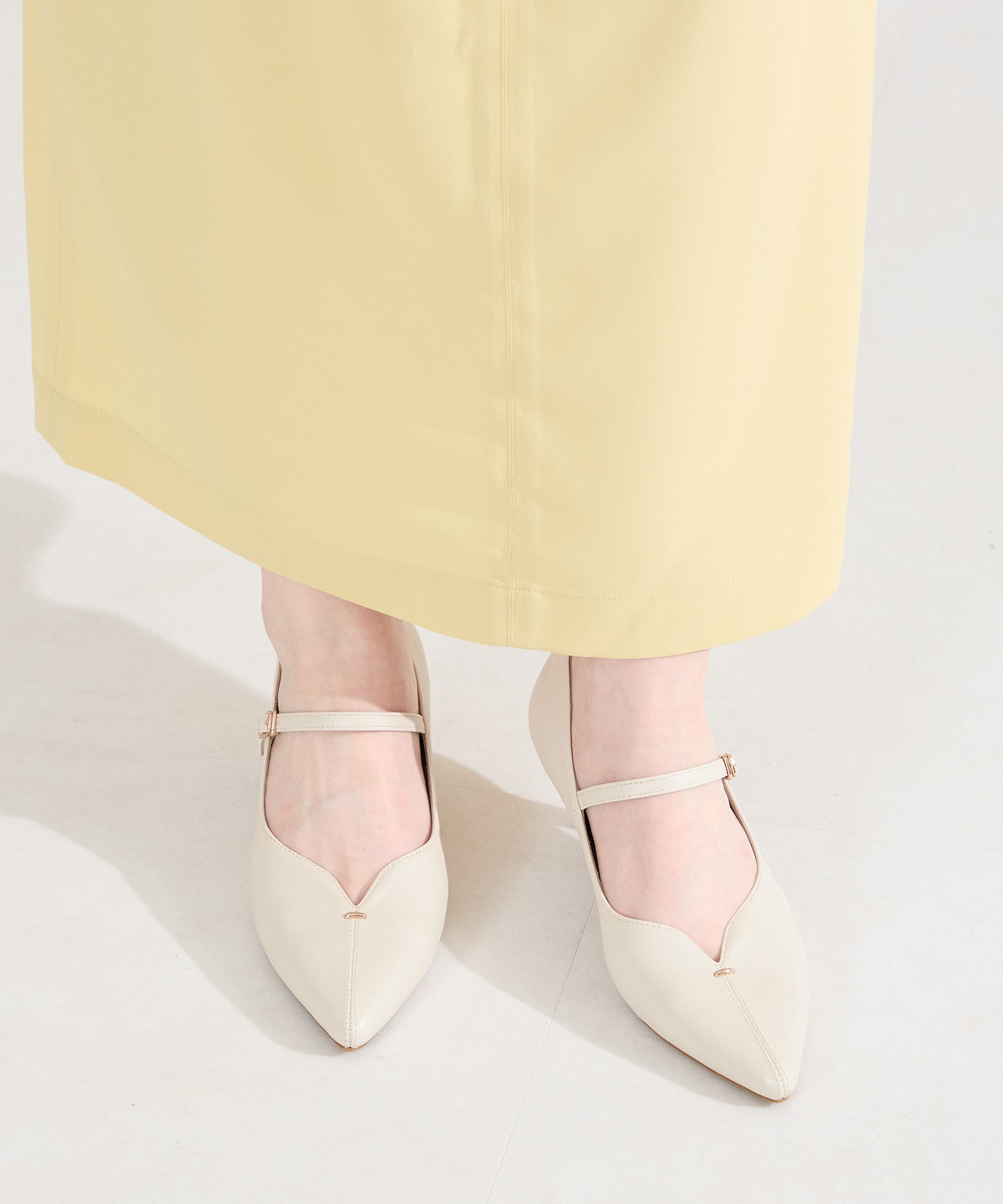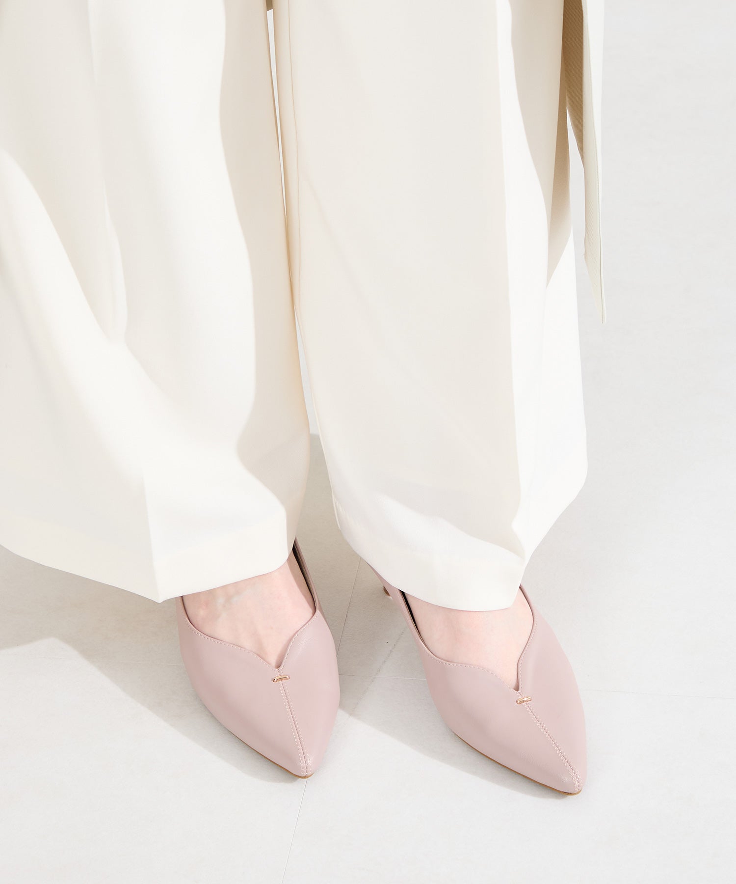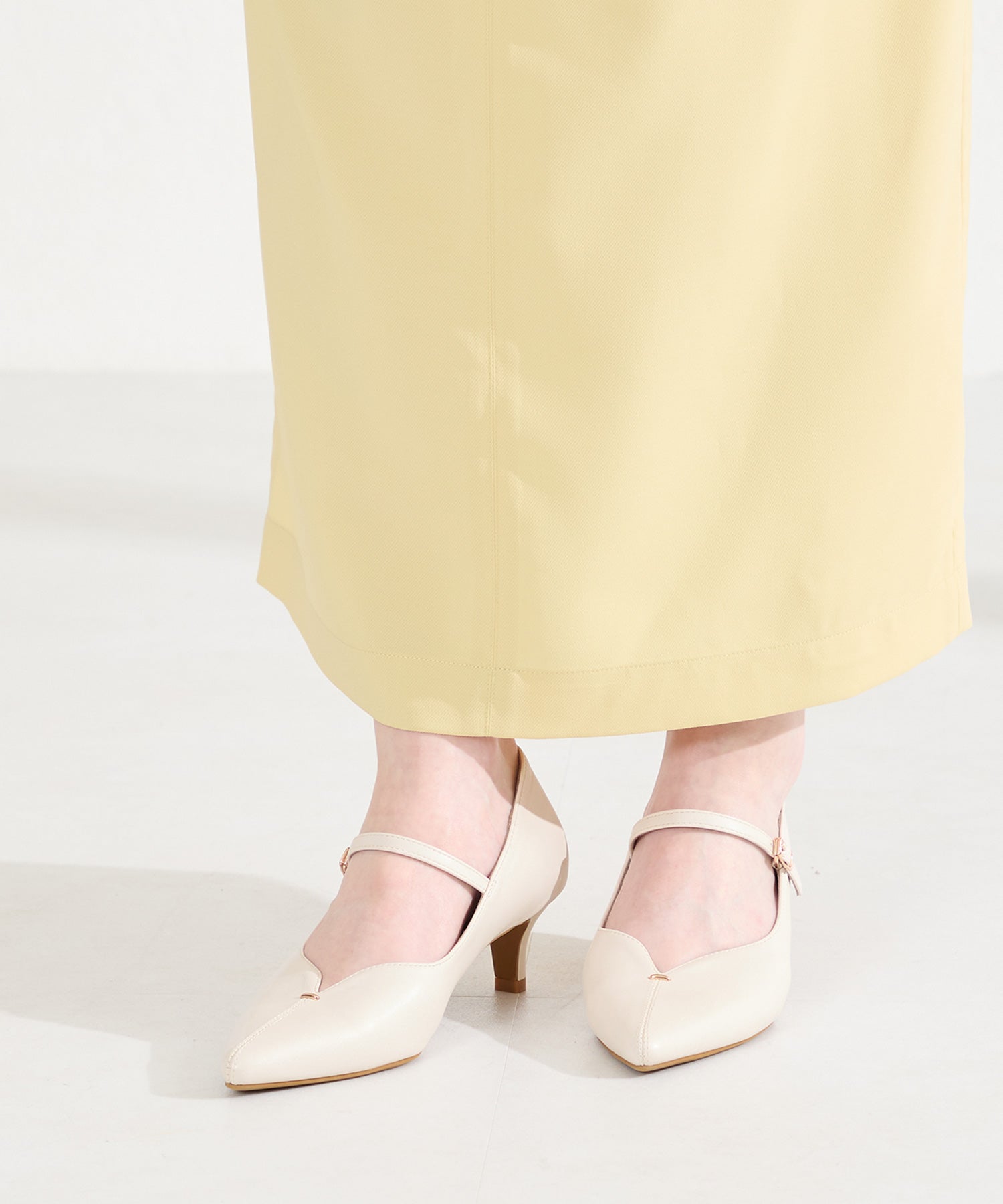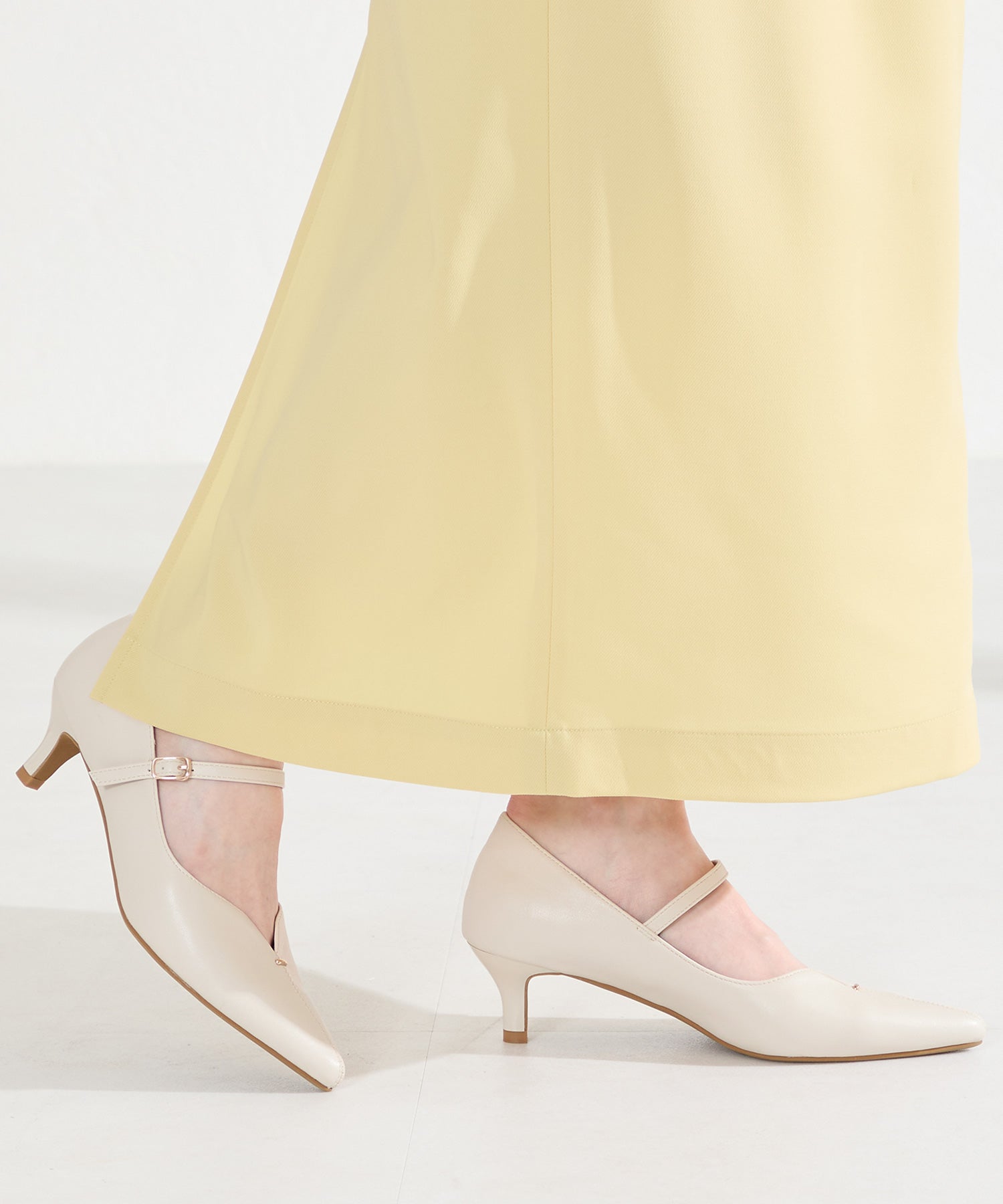 アッパーにメタルパーツとスリットデザインを施した、シンプルながらもアクセントになるパンプス。甲ストラップ付きで足にフィットし、インソールは厚手のクッション入りで長時間履いても疲れにくい。艶ありのヒールが女性らしく、バックシルエットまで抜かりない印象に。淡いベーシックなカラーリングと今季注目のピンクは普段のコーディネートに取り入れるだけで季節感がアップ。