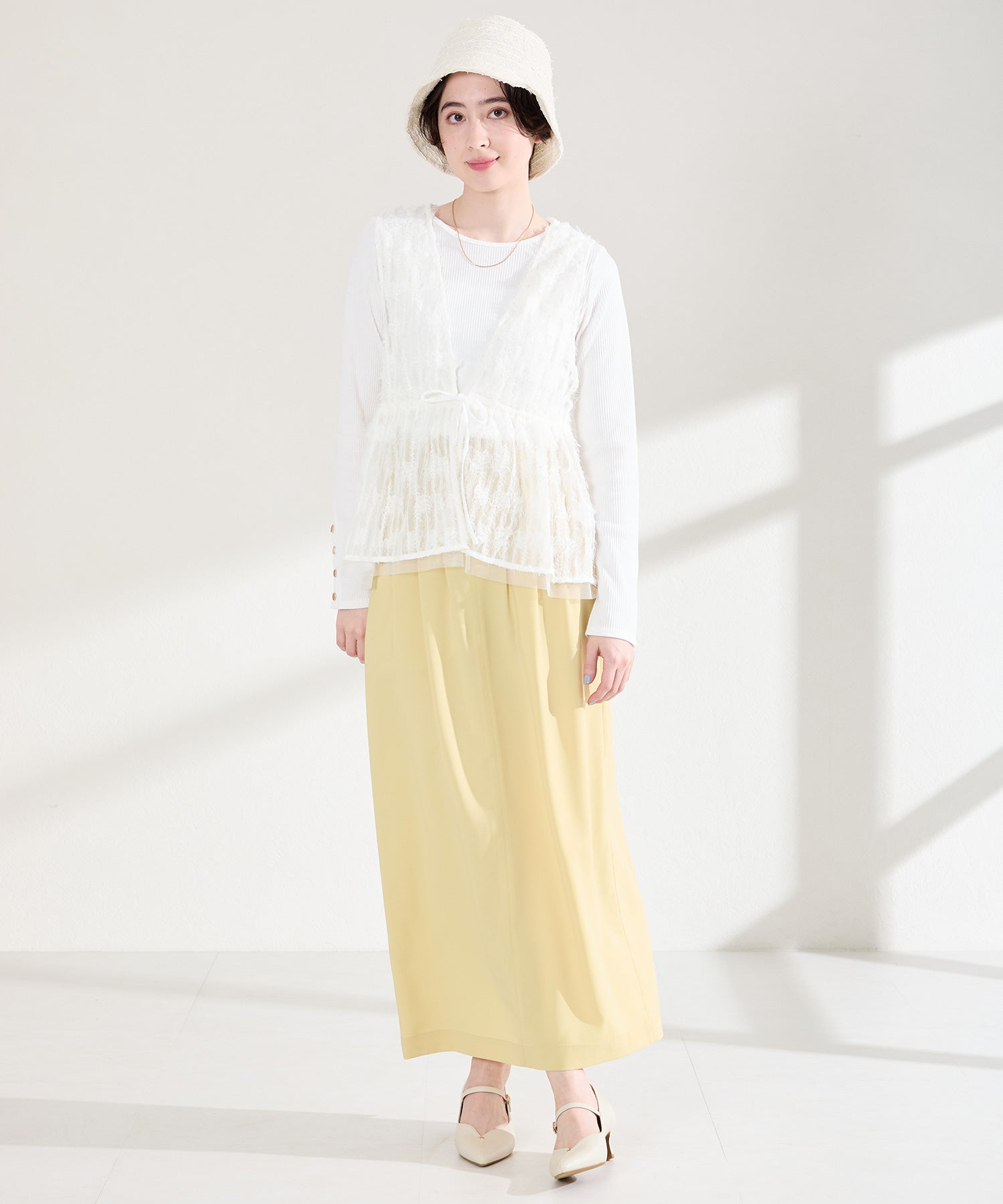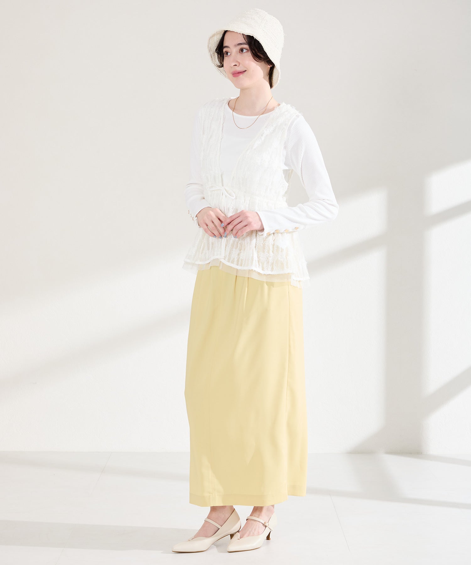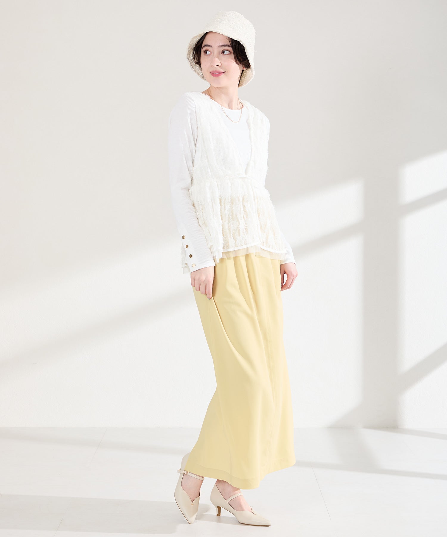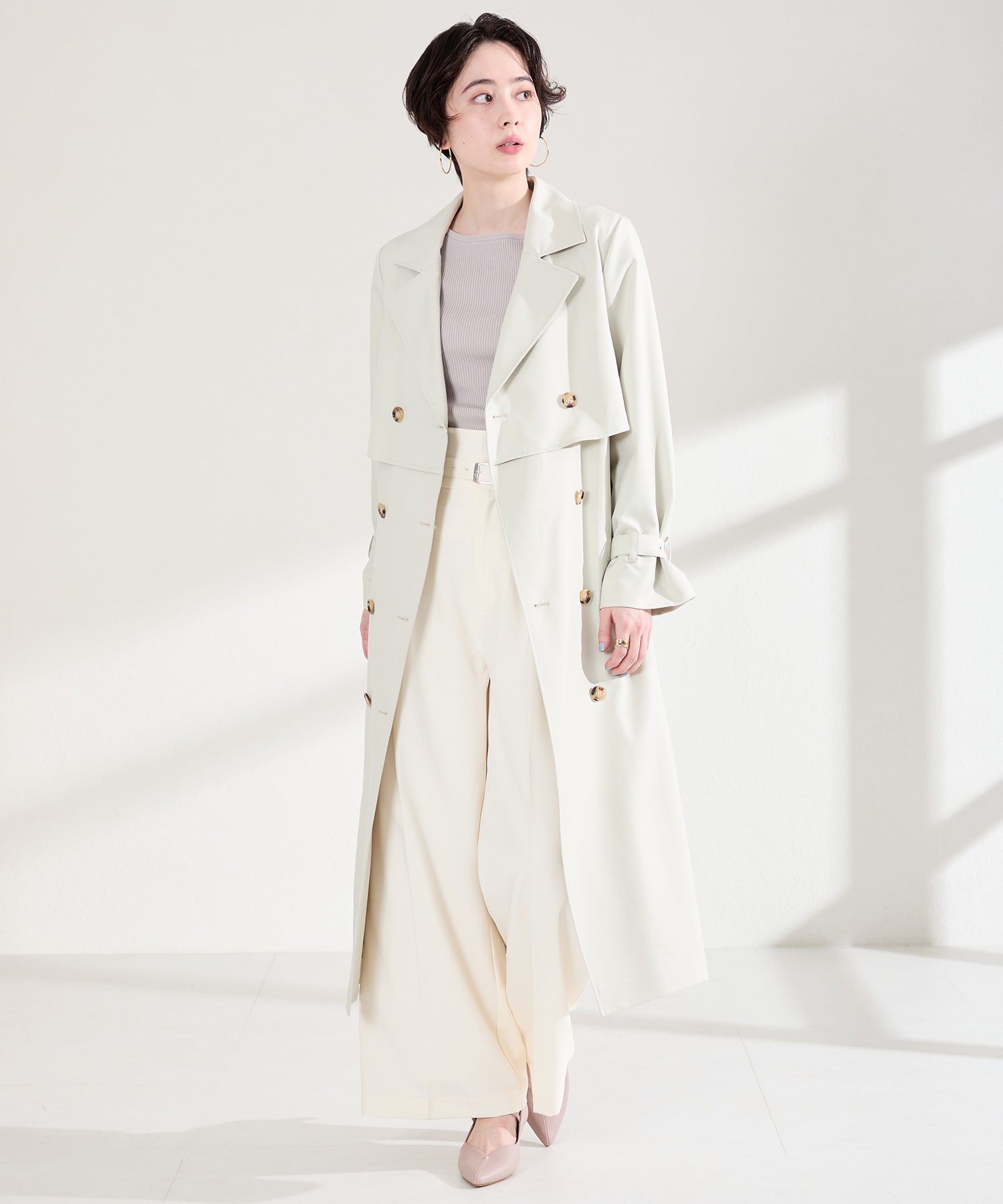 アッパーにメタルパーツとスリットデザインを施した、シンプルながらもアクセントになるパンプス。甲ストラップ付きで足にフィットし、インソールは厚手のクッション入りで長時間履いても疲れにくい。艶ありのヒールが女性らしく、バックシルエットまで抜かりない印象に。淡いベーシックなカラーリングと今季注目のピンクは普段のコーディネートに取り入れるだけで季節感がアップ。