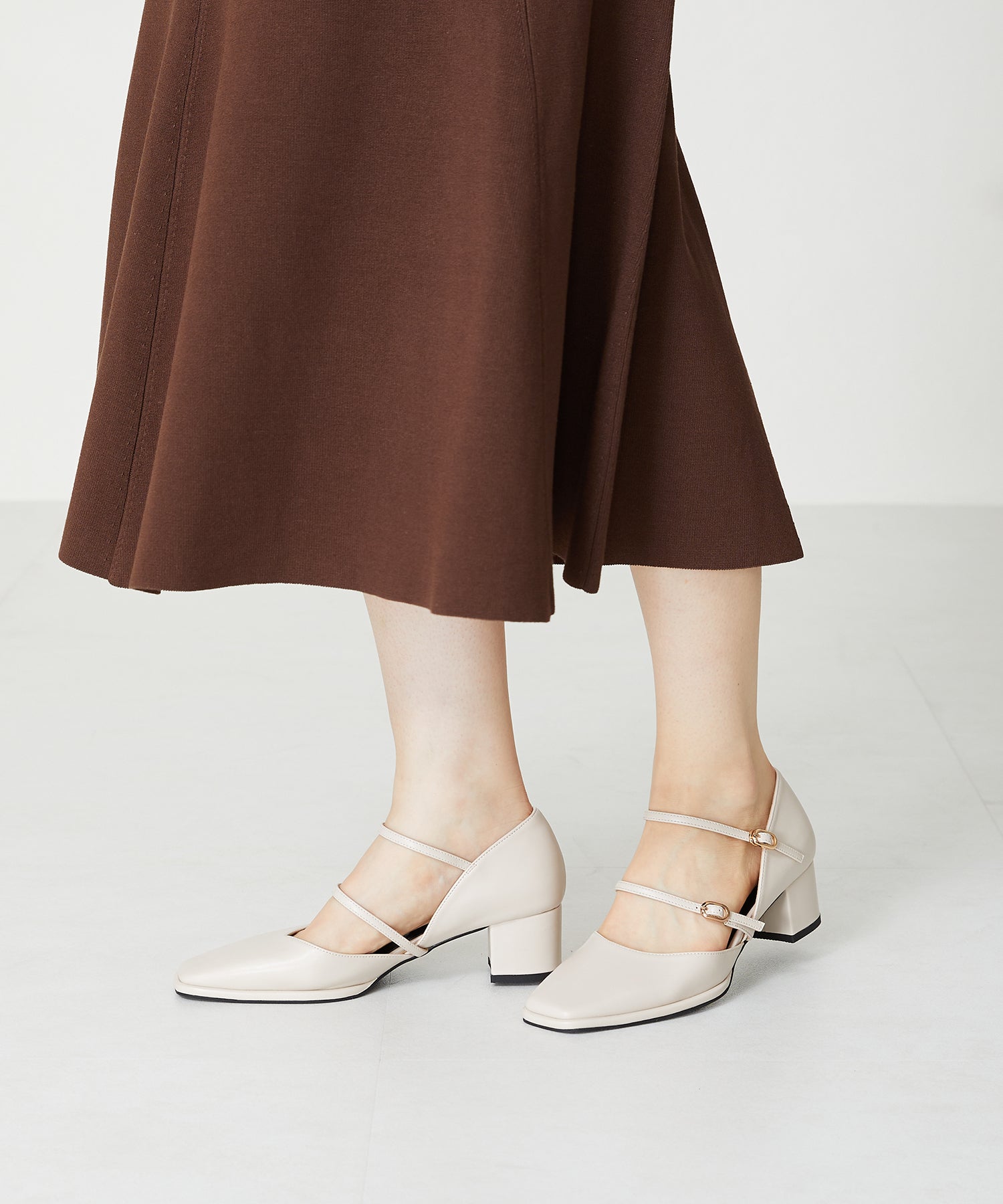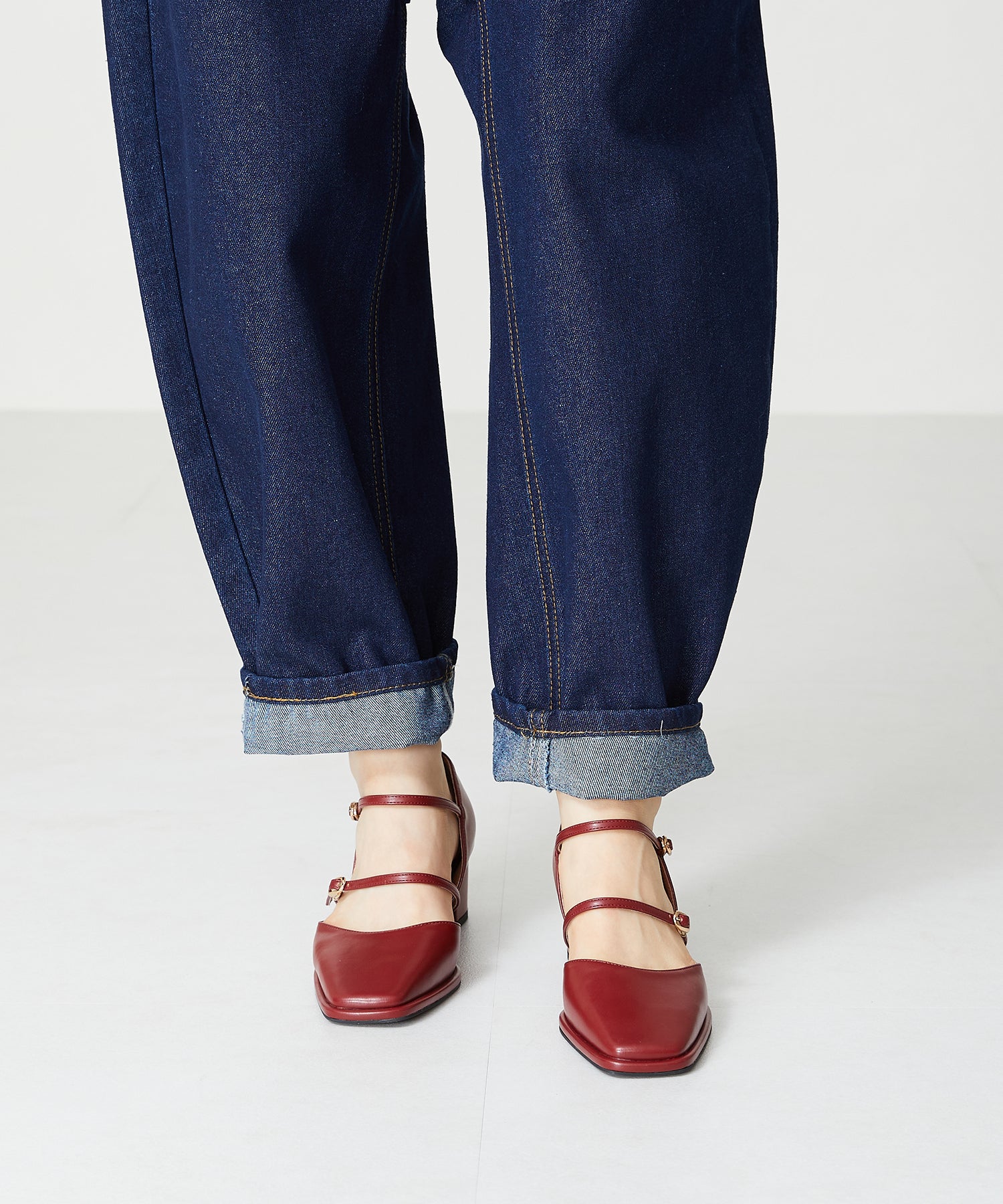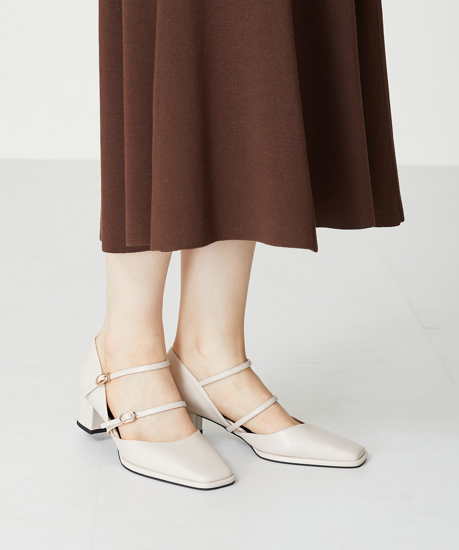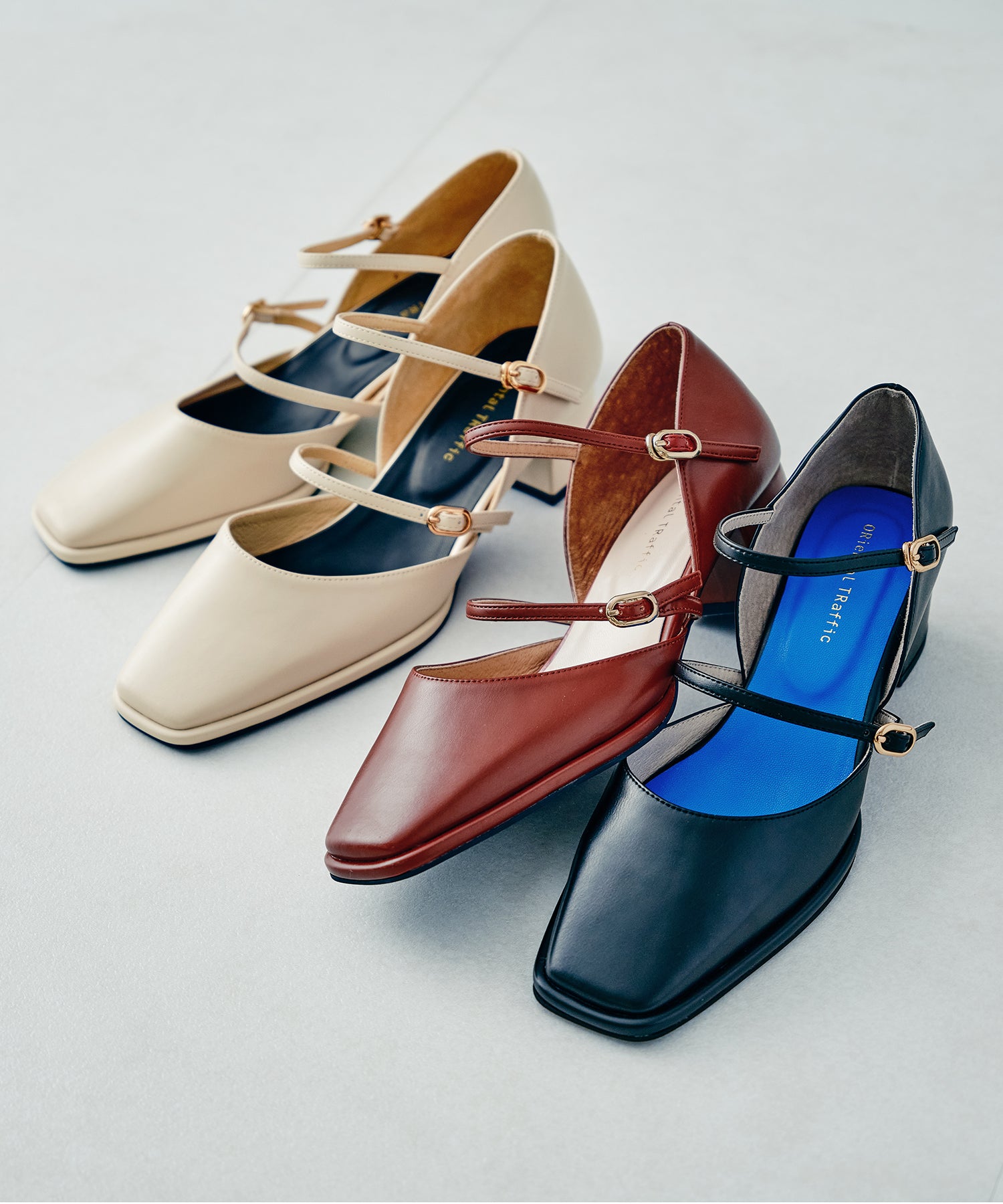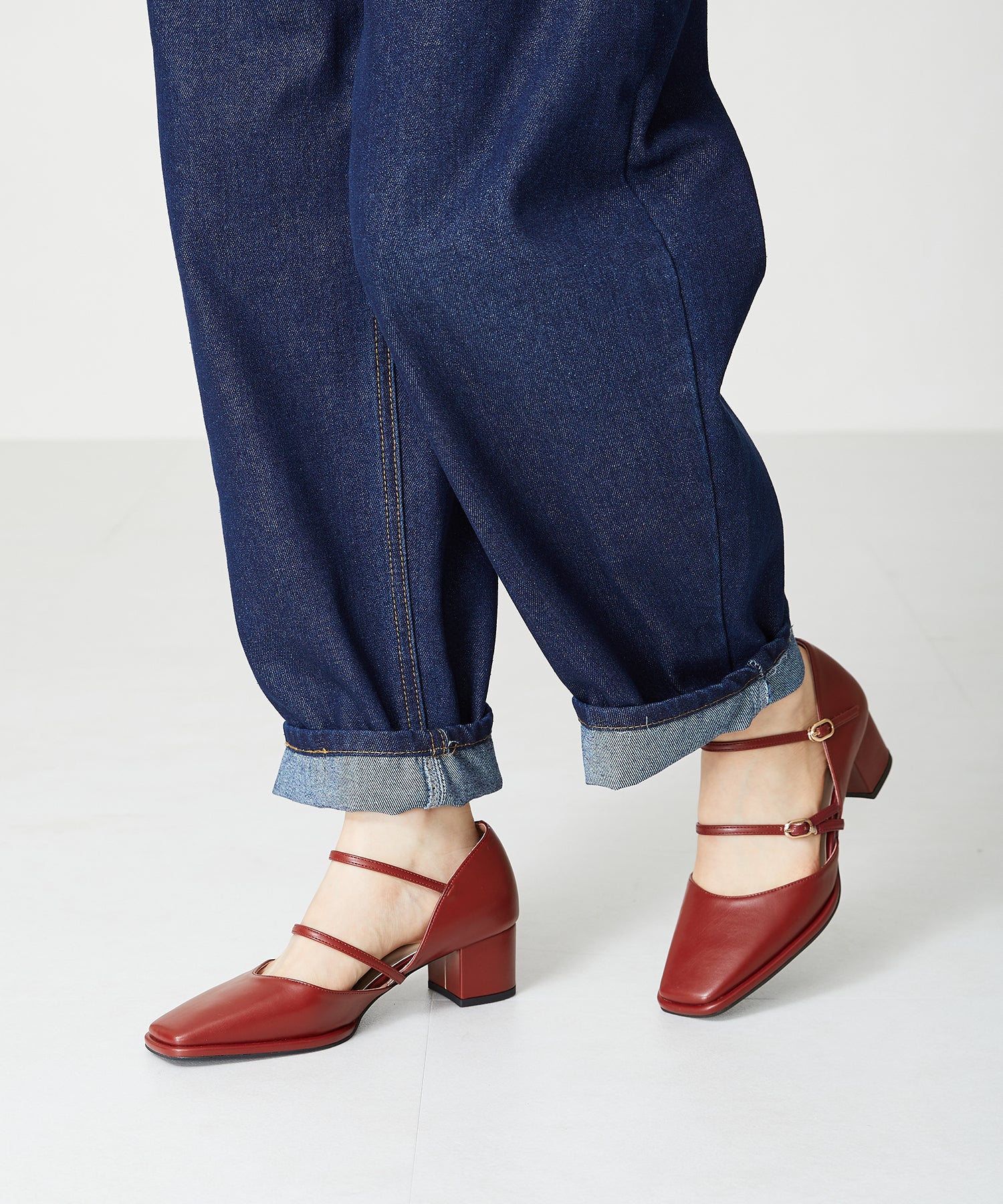 抜け感のあるセパレートデザインと華奢なストラップが足を綺麗に見せてくれるスクエアパンプス。安定感のあるチャンキーヒールと2本のストラップがしっかり足元を支えてくれるので、パンプス初心者でも歩きやすいのが嬉しい。定番のブラック、ホワイトのほかにトレンド感のある落ち着いたトーンのレッドを加えた3色展開で、履くだけでスタイリングがシックにまとまる。