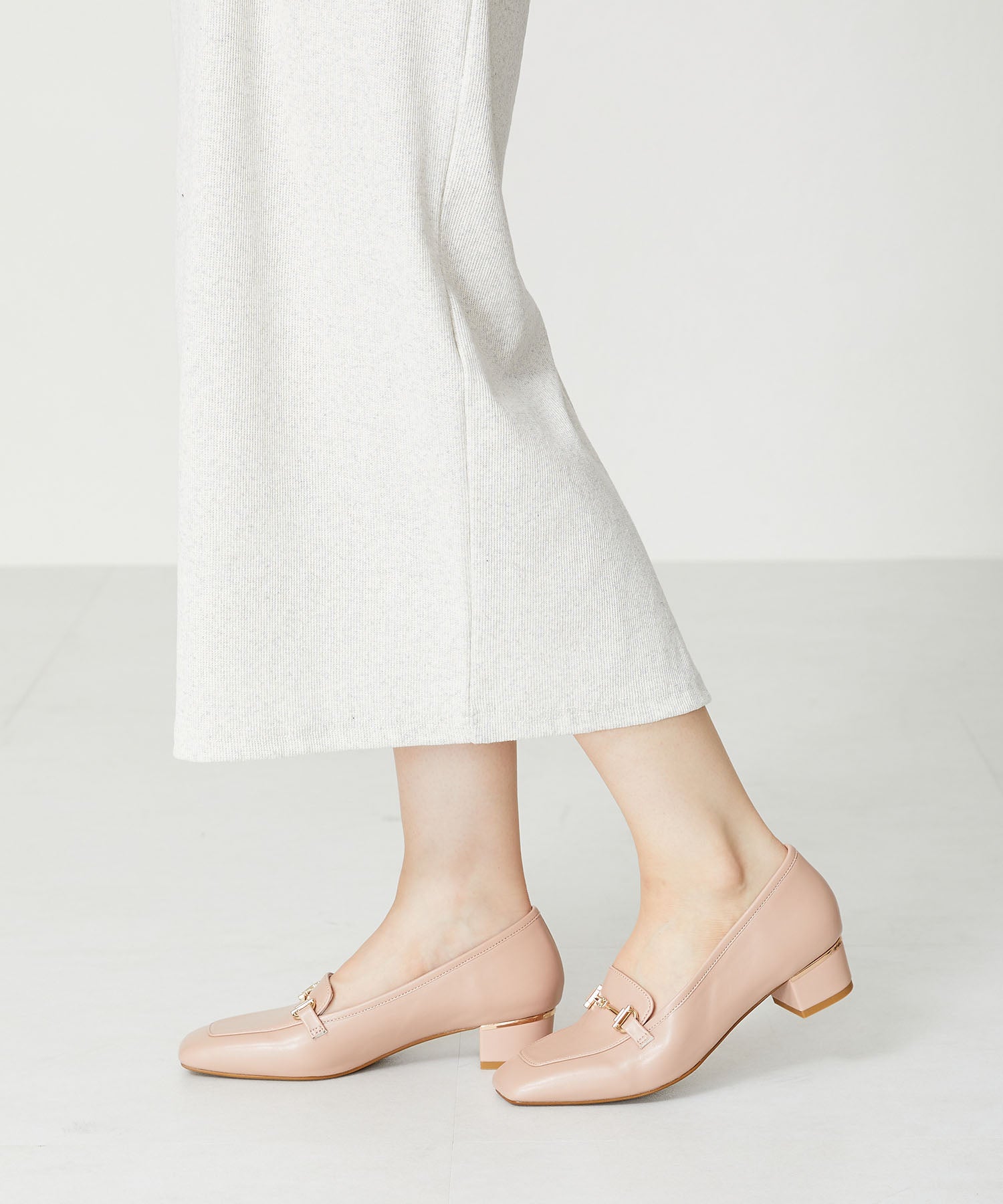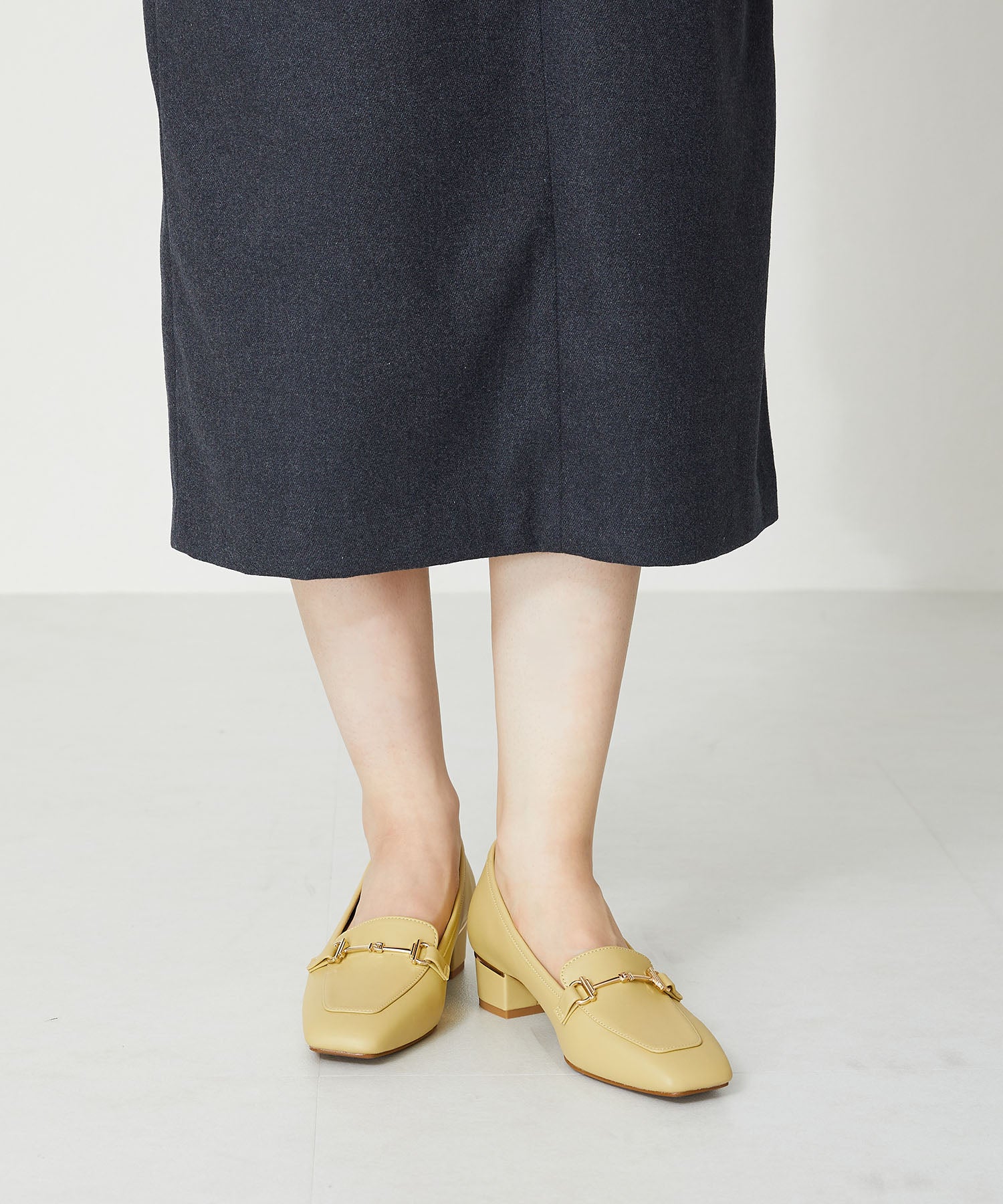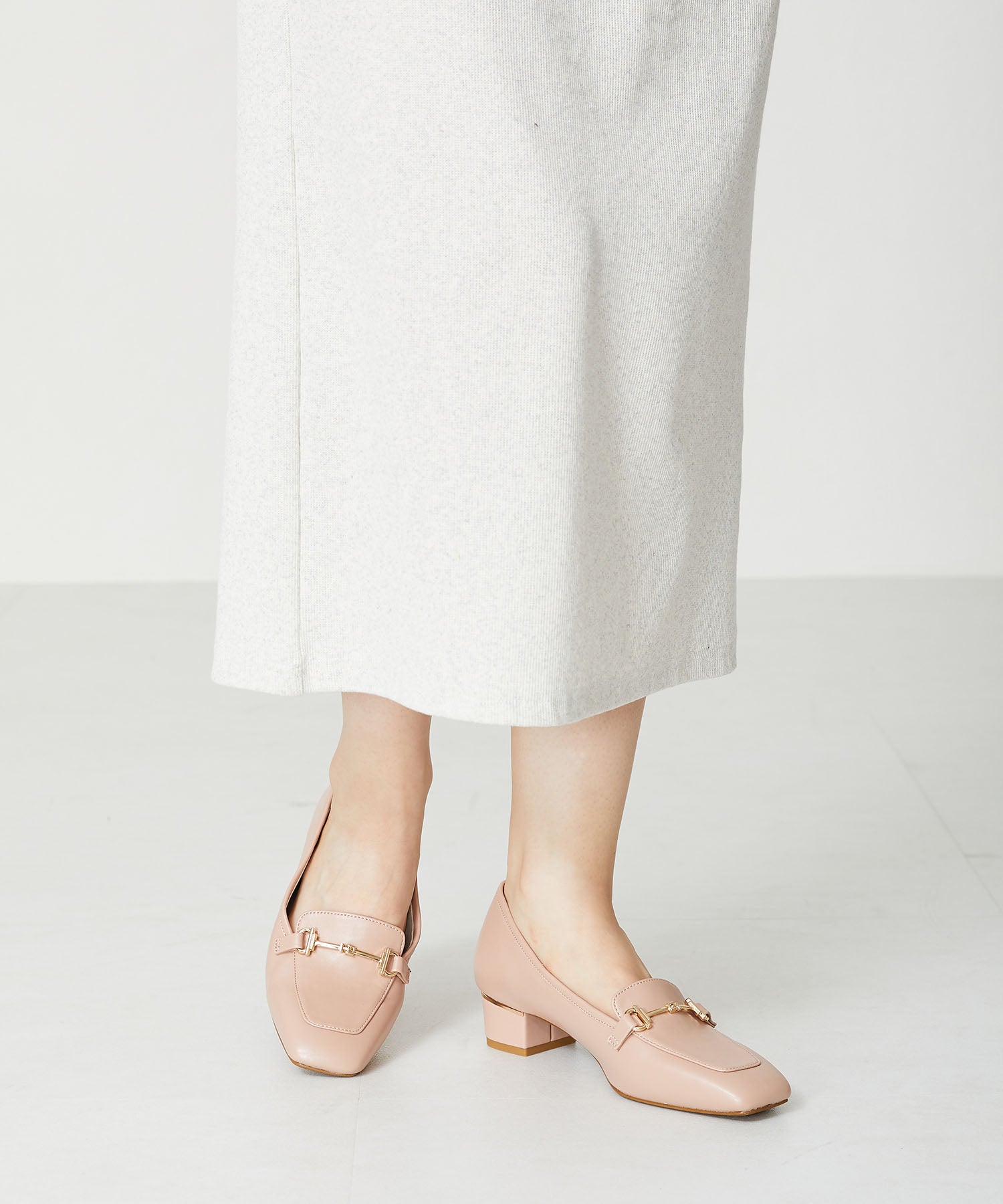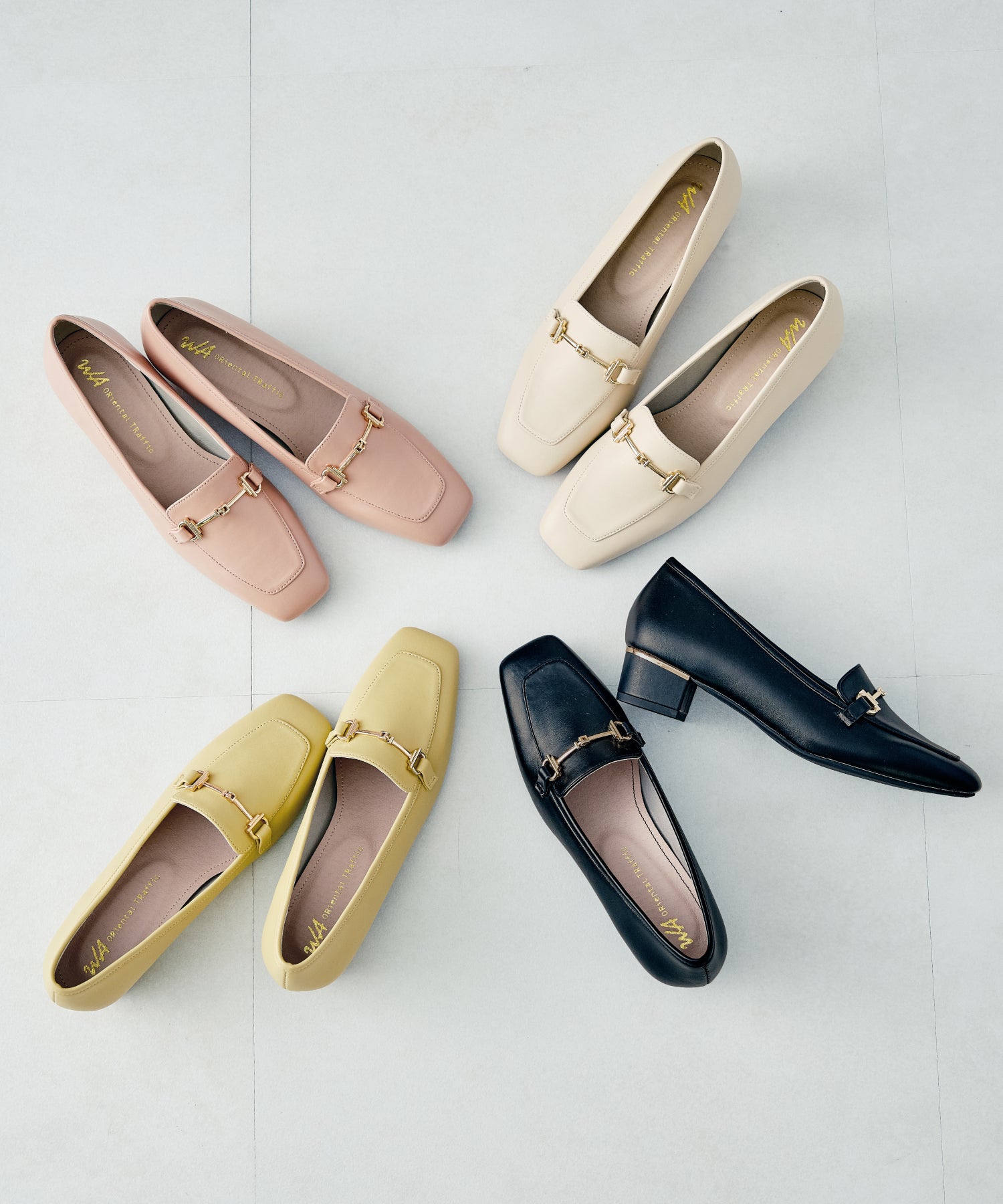 高級感のあるゴールドのビットモチーフとスクエアトゥのシルエットが上品なローファーは、メタリックラインを施したヒールと、すっきりとしたシルエットで女性らしさをアップ。脱げにくい深さの履き口と安定感のあるローヒールで、普段ヒールを履かない方でも挑戦しやすいアイテム。歩行時の負担を軽減してくれる厚手クッション入りなのも嬉しい。全色集めたくなるカラー展開も◎。