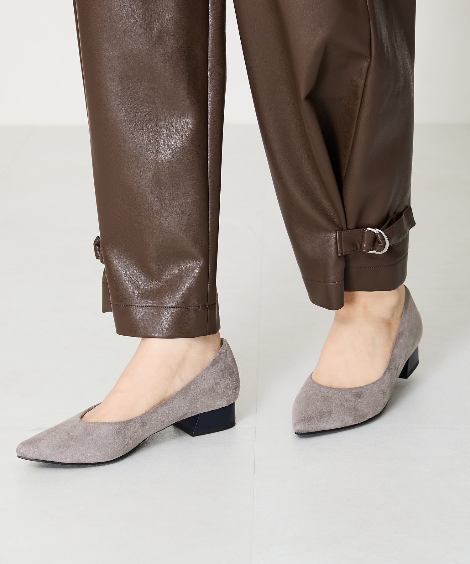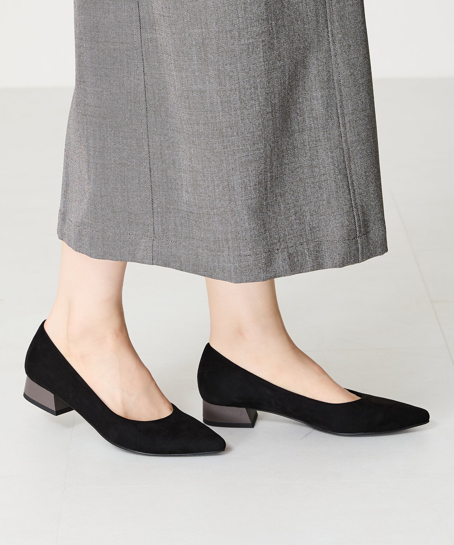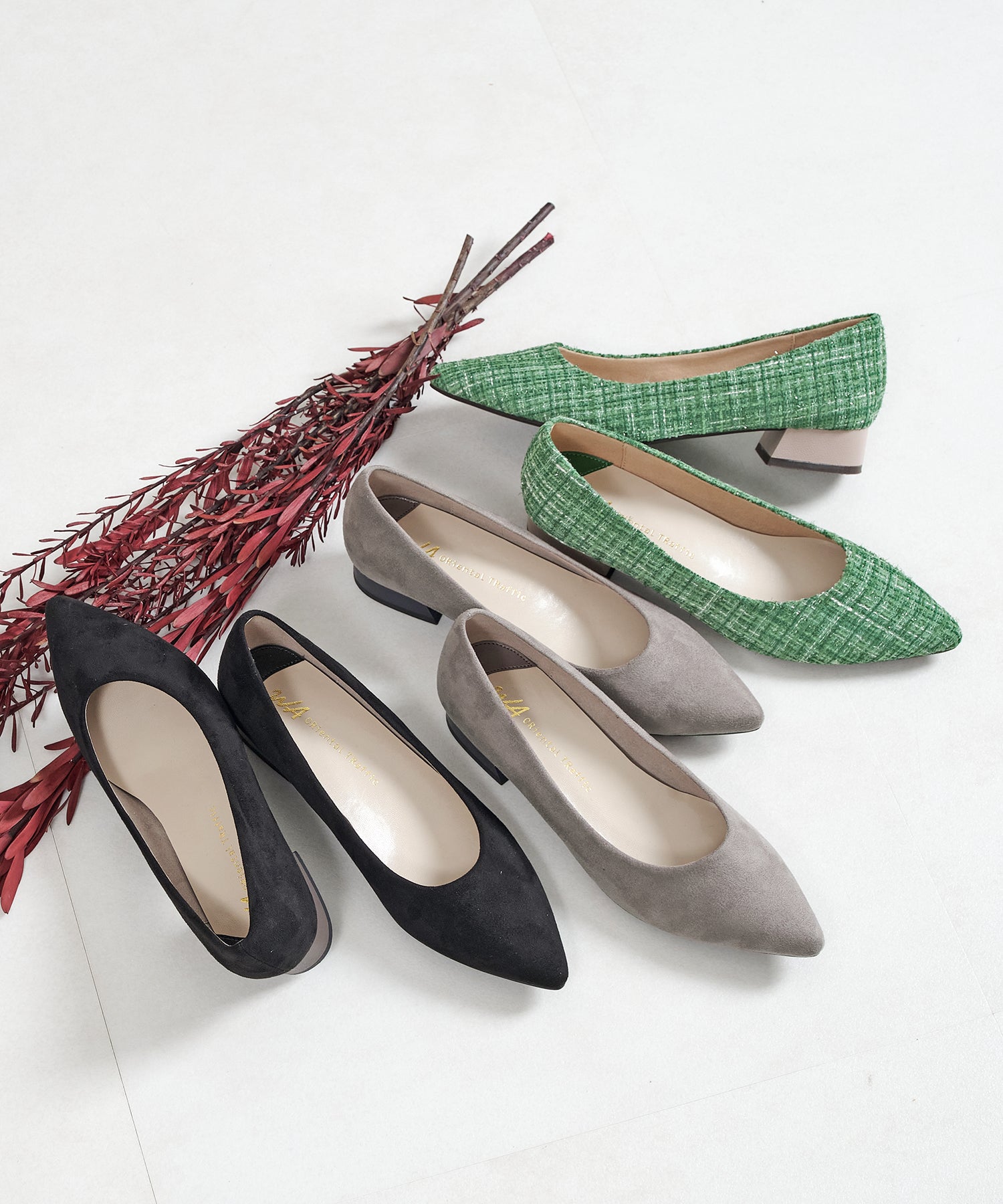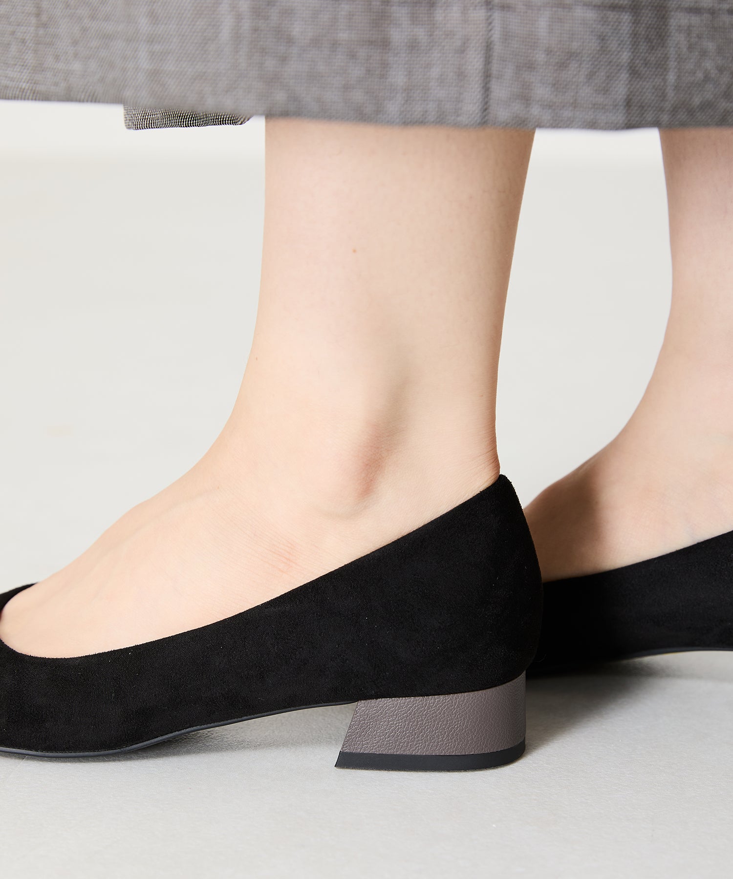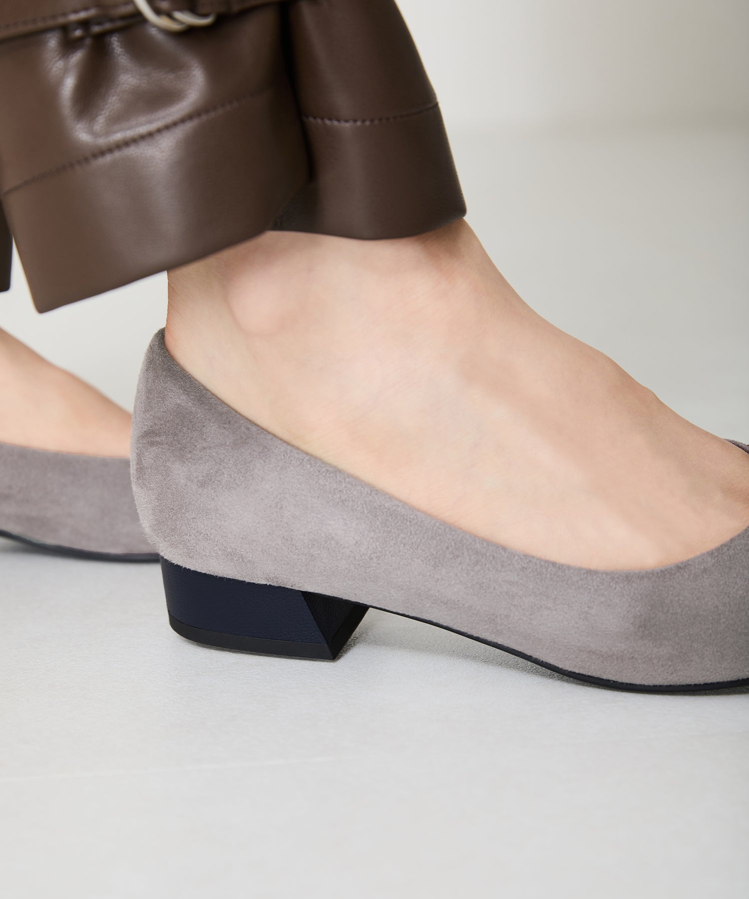 一見シンプルながらもスタイリッシュなポインテッドトゥの形に、艶を抑えたマットな台形ヒールがお洒落見えするパンプス。足裏を包み込む厚手のインソールクッションで疲れにくく、お仕事用にも活躍すること間違いなし。ヒールのカラーを、ブラックはグレー、グレーはネイビー、グリーンはベージュと、全て異なる配色にすることでさりげない遊び心をオン。