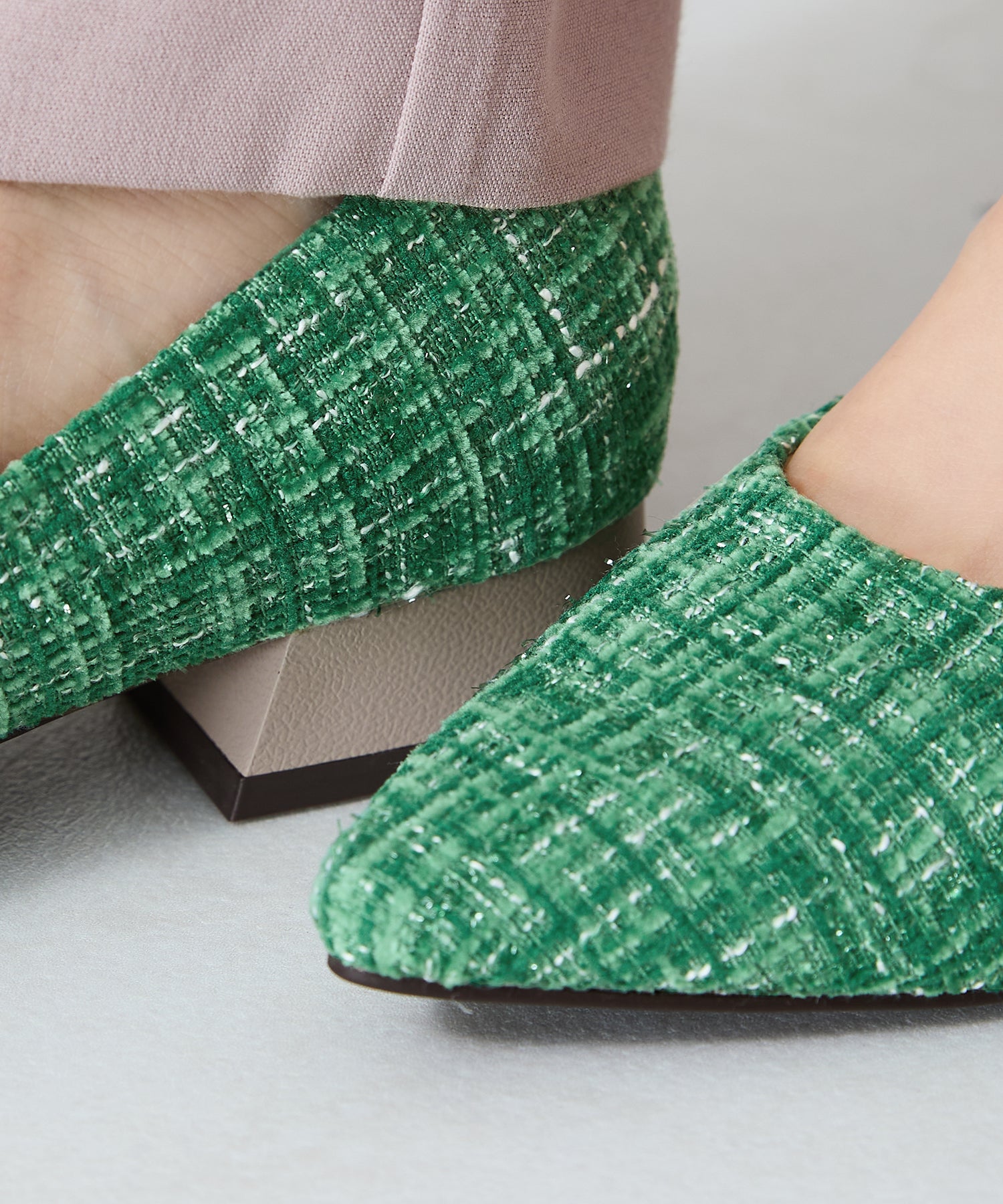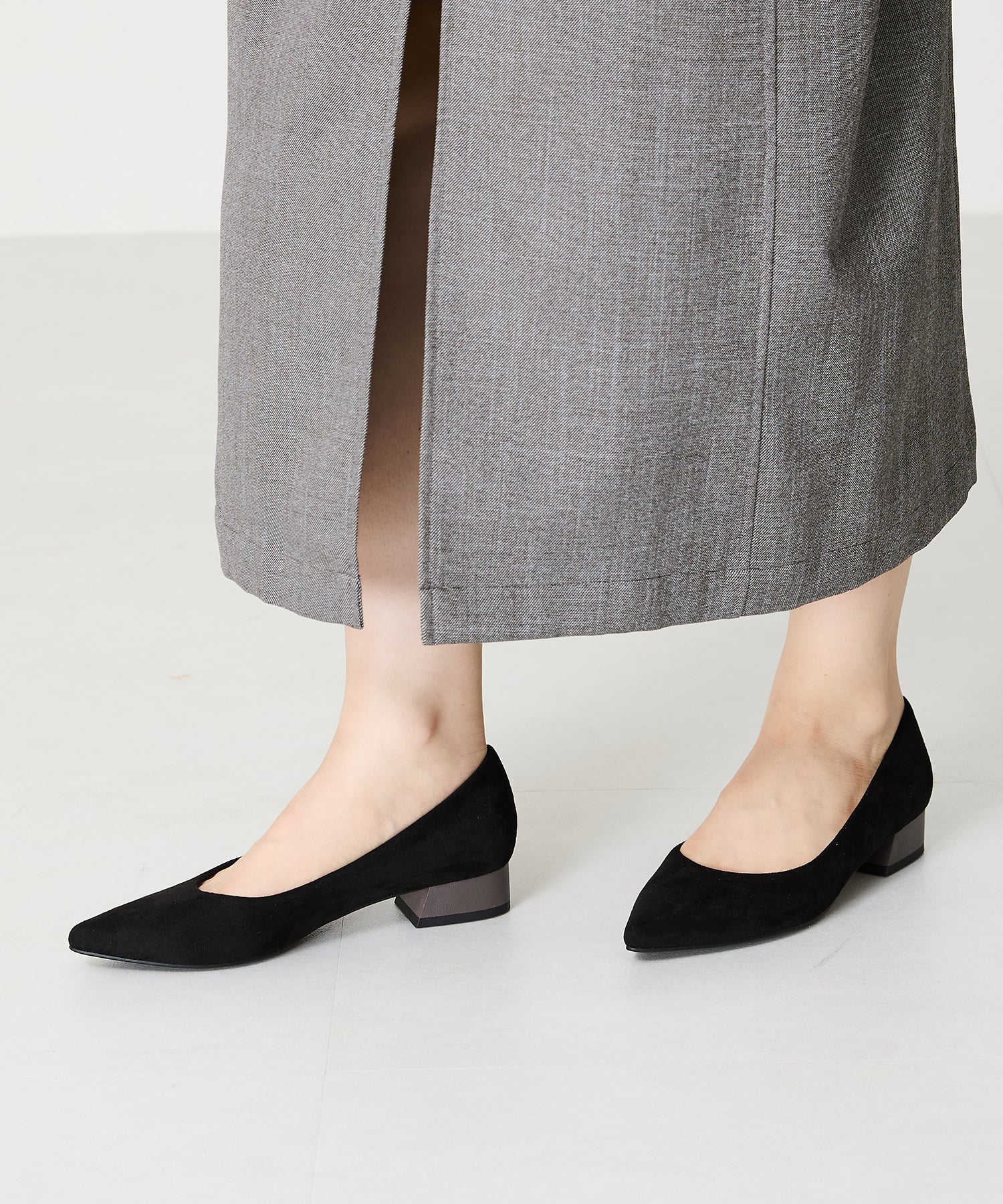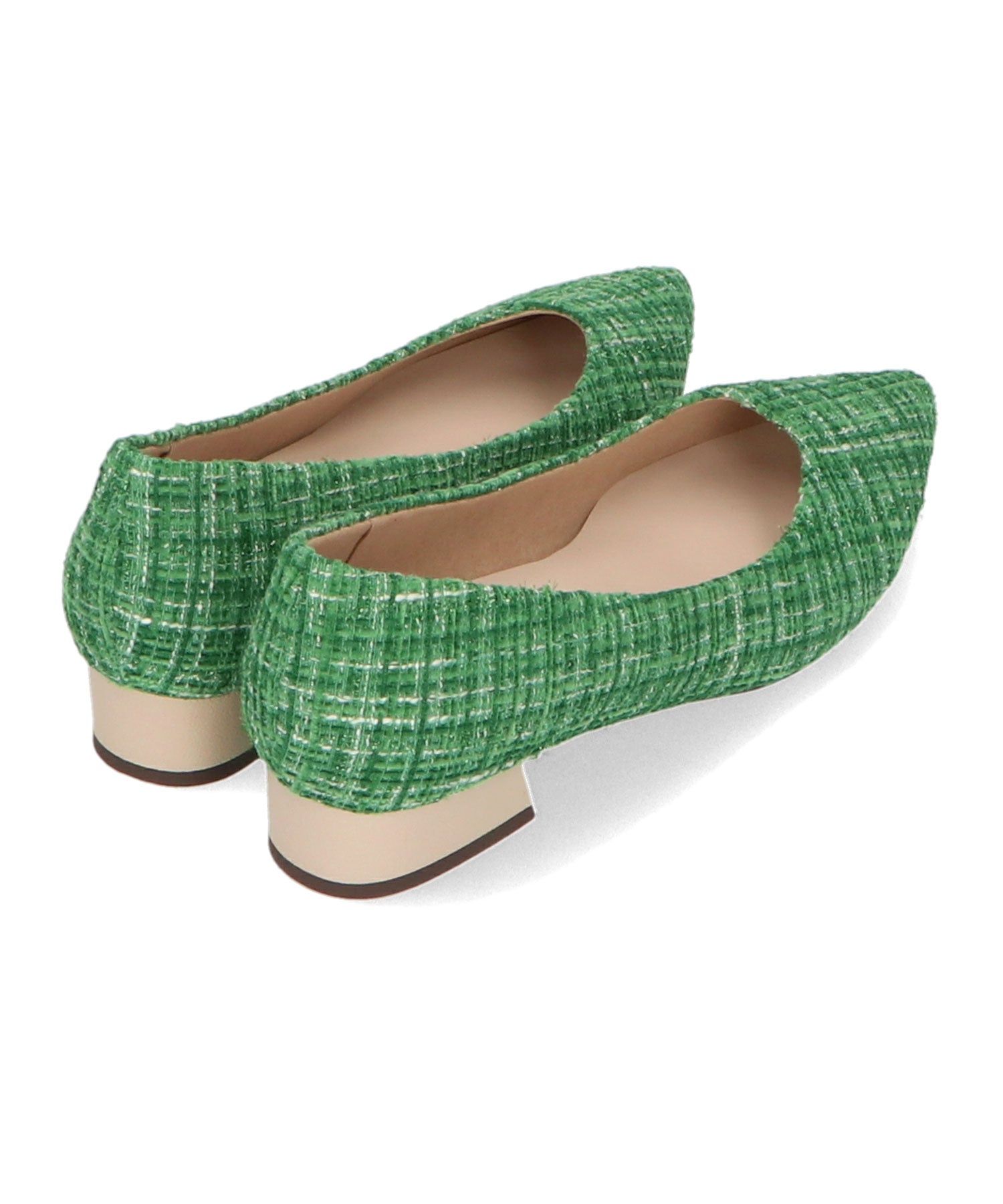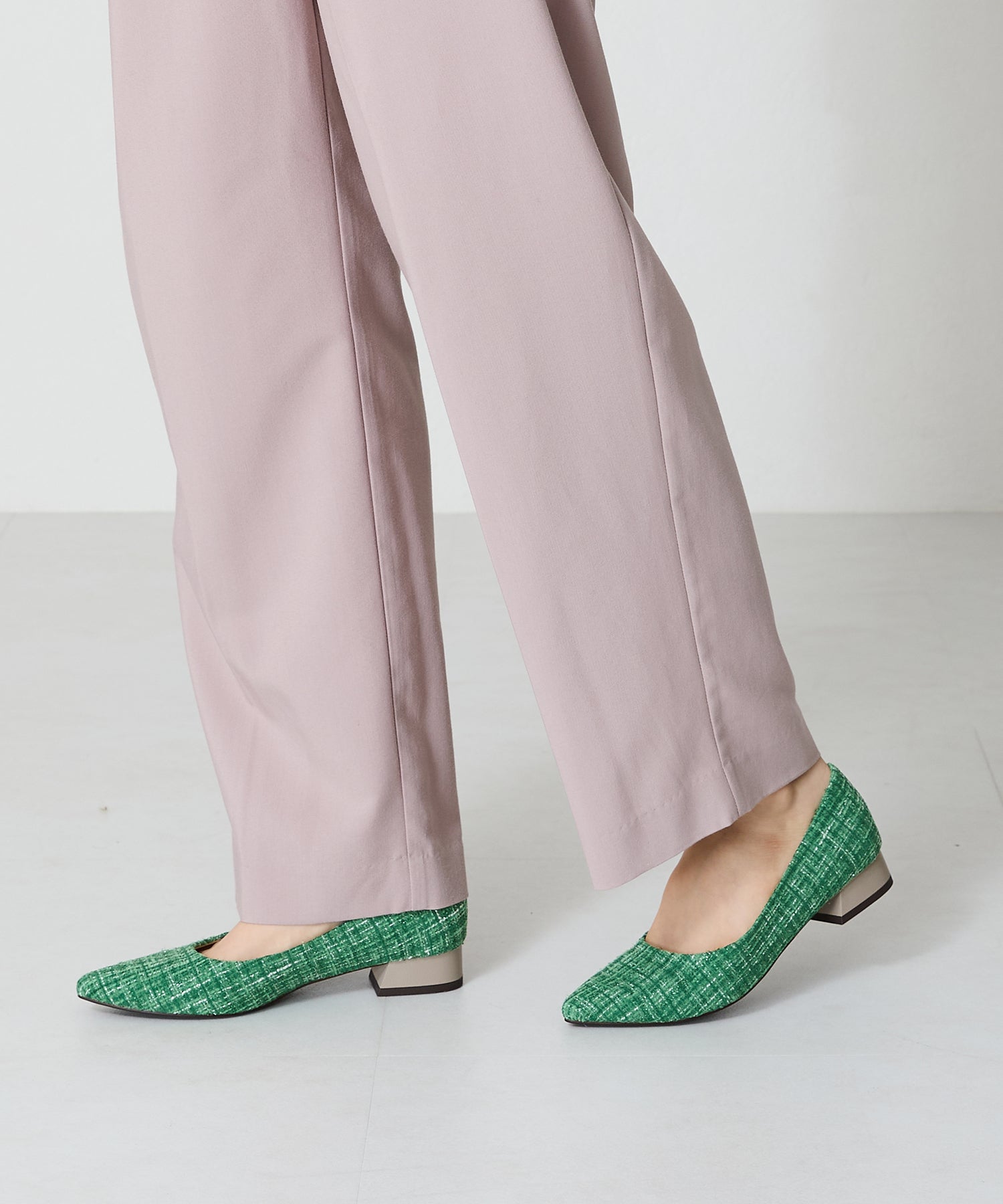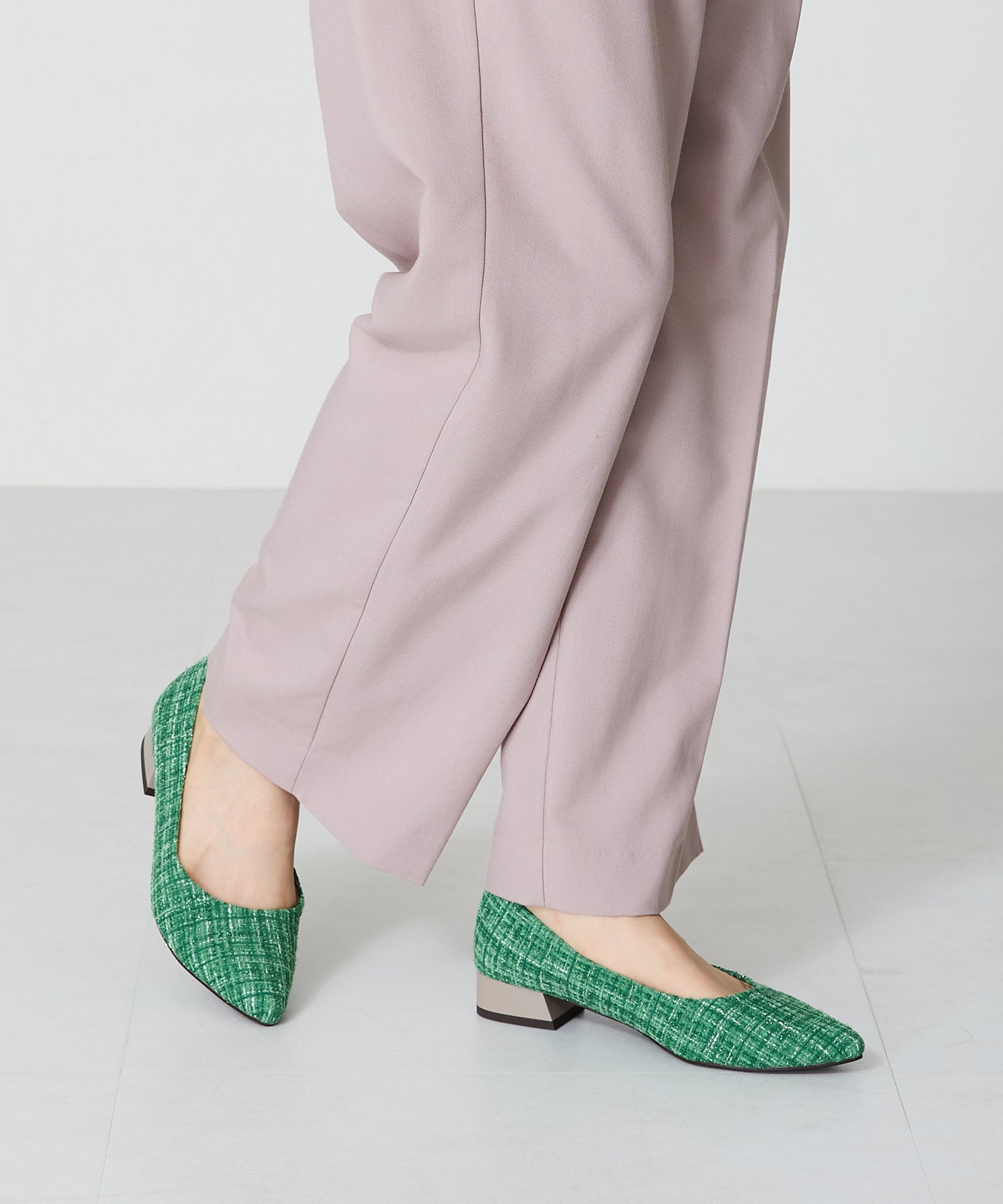 一見シンプルながらもスタイリッシュなポインテッドトゥの形に、艶を抑えたマットな台形ヒールがお洒落見えするパンプス。足裏を包み込む厚手のインソールクッションで疲れにくく、お仕事用にも活躍すること間違いなし。ヒールのカラーを、ブラックはグレー、グレーはネイビー、グリーンはベージュと、全て異なる配色にすることでさりげない遊び心をオン。