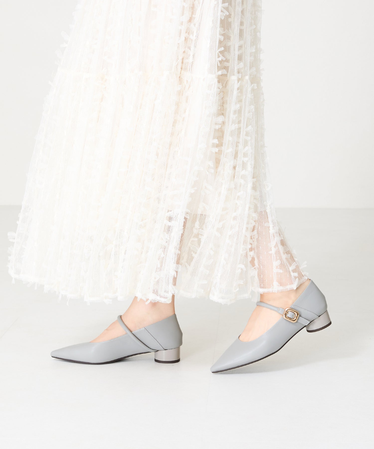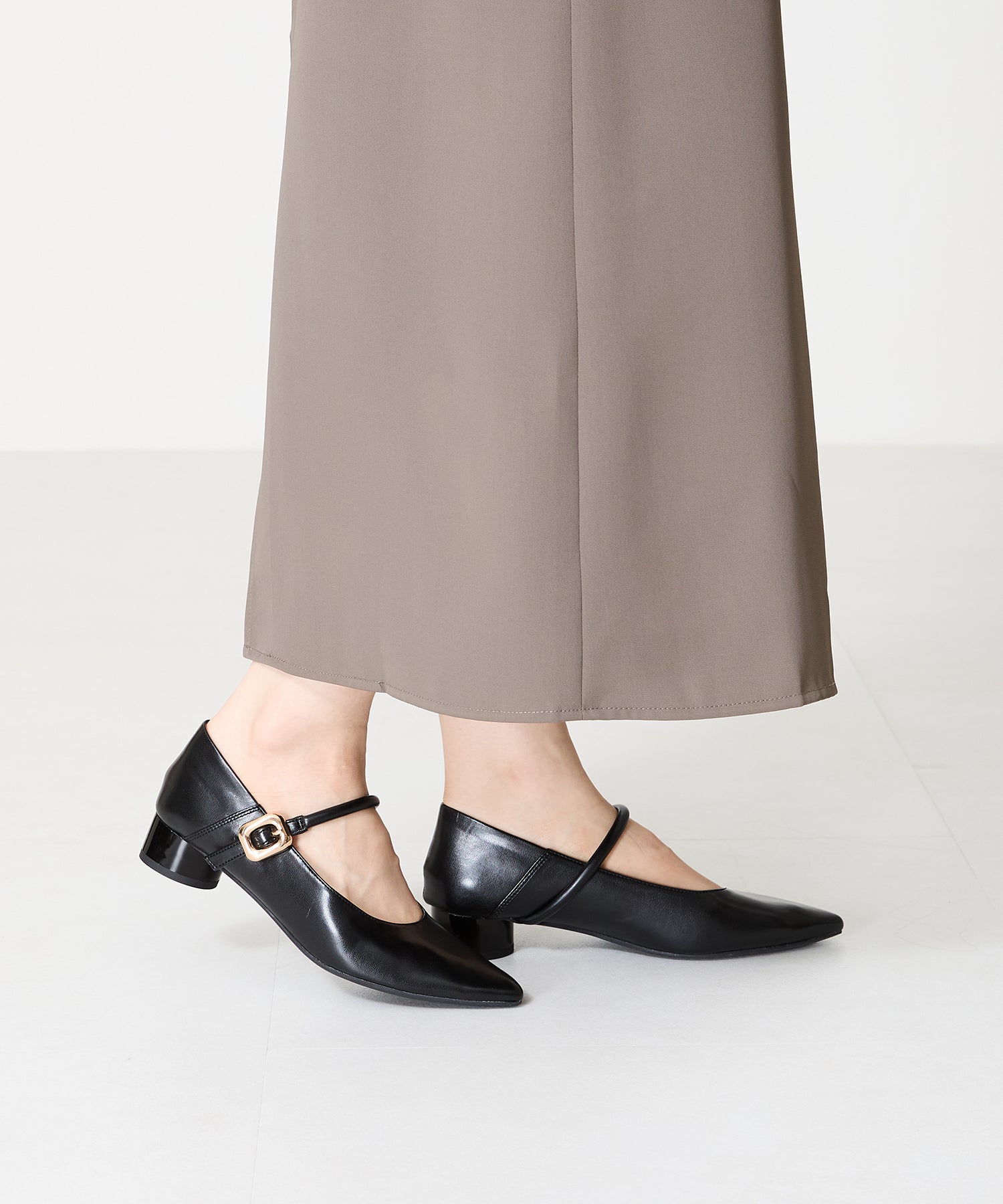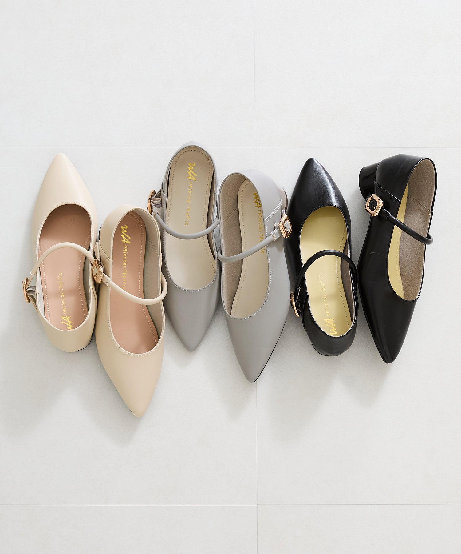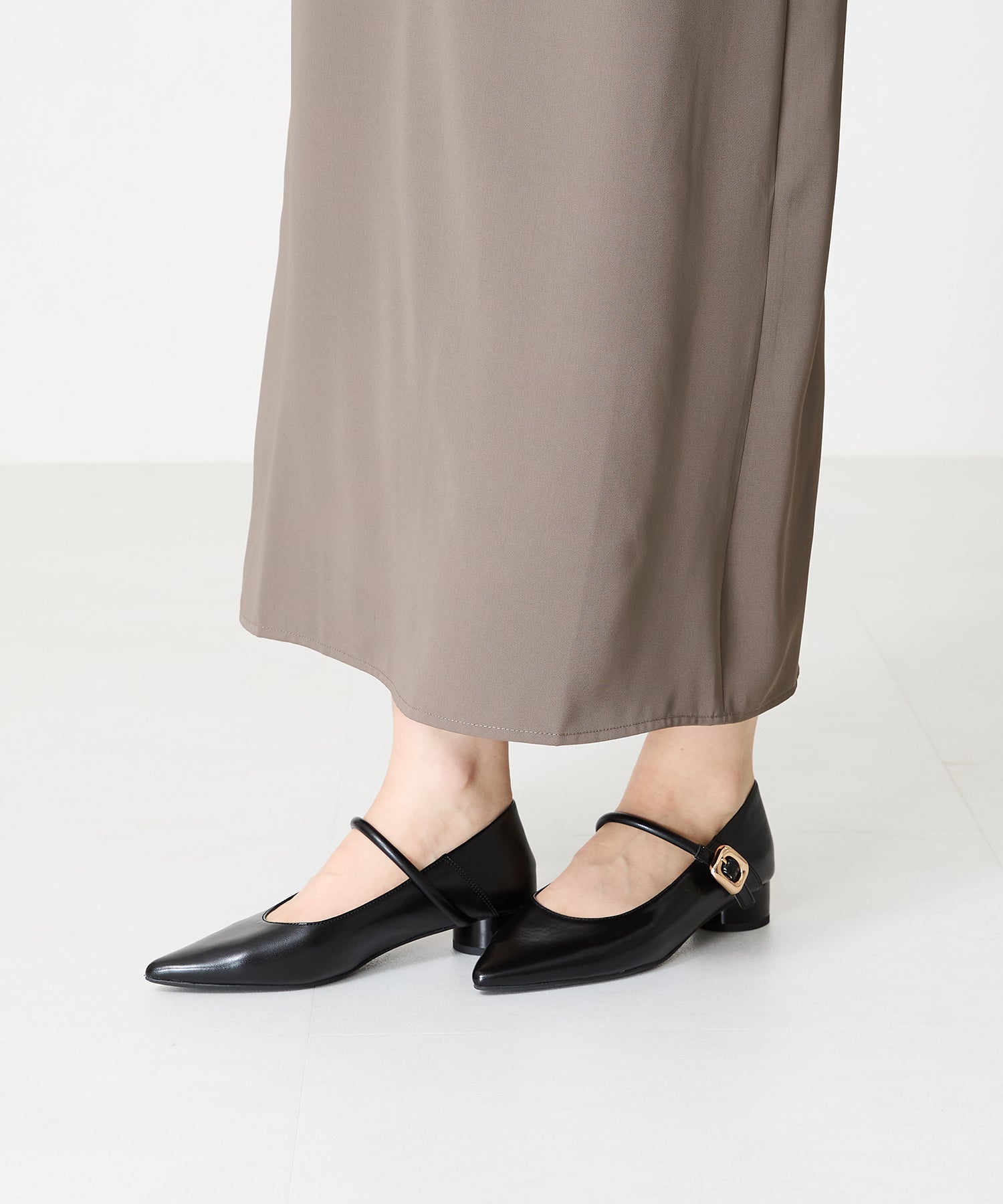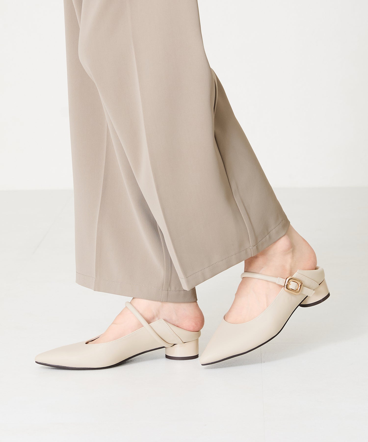 チューブ状のストラップに、厚手の中敷クッション入りで履き心地にとことんこだわったアイテム。艶のある円柱ヒールや、ぷっくりとした大きめのバックルモチーフなどシンプルながらも程よく存在感のある1足。旬なポインテッドトゥで低めのヒールでもすっきりとした印象を与えてくれて、踵を踏んでも履けるバブーシュデザインと2wayで楽しめる優れもの。