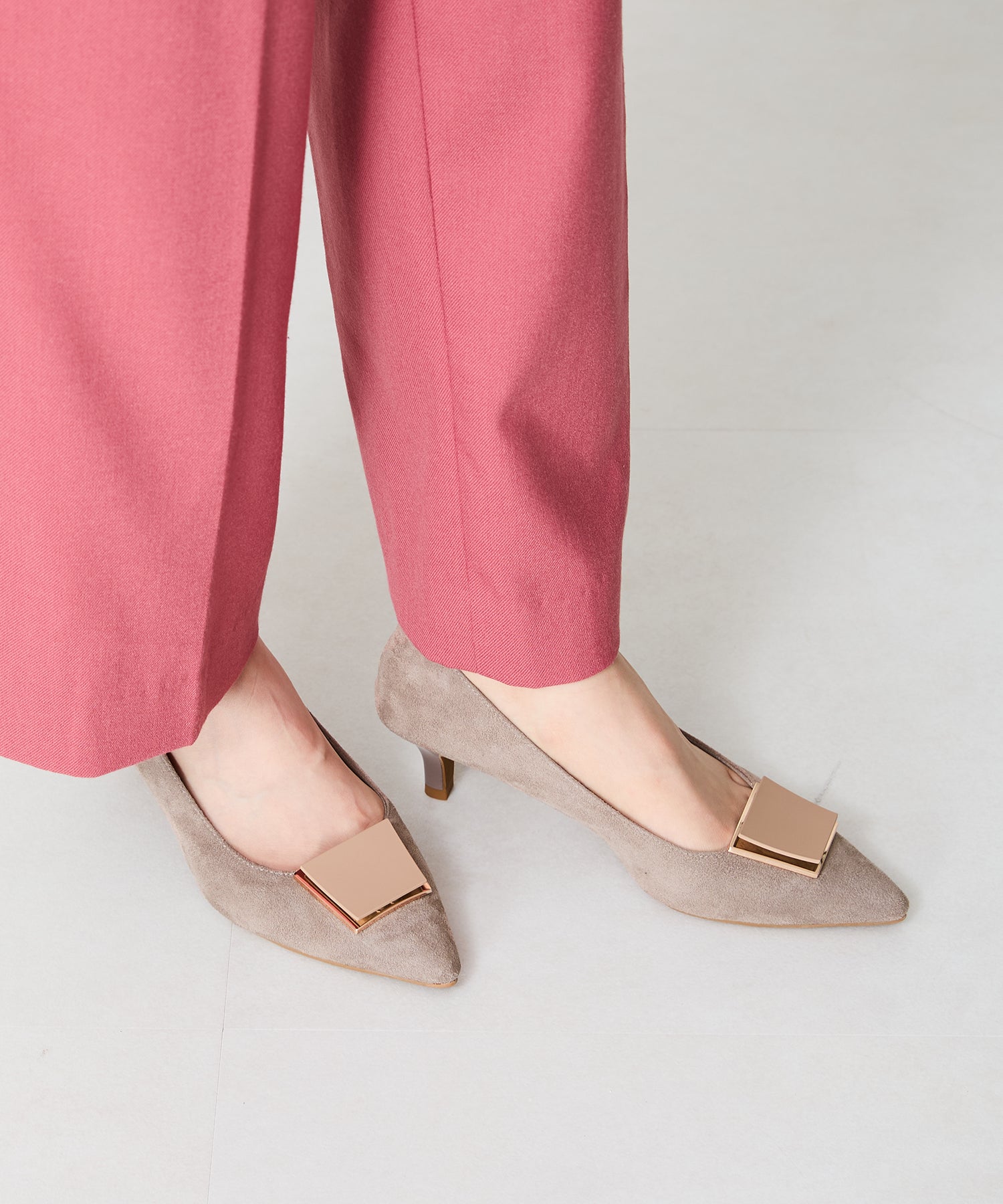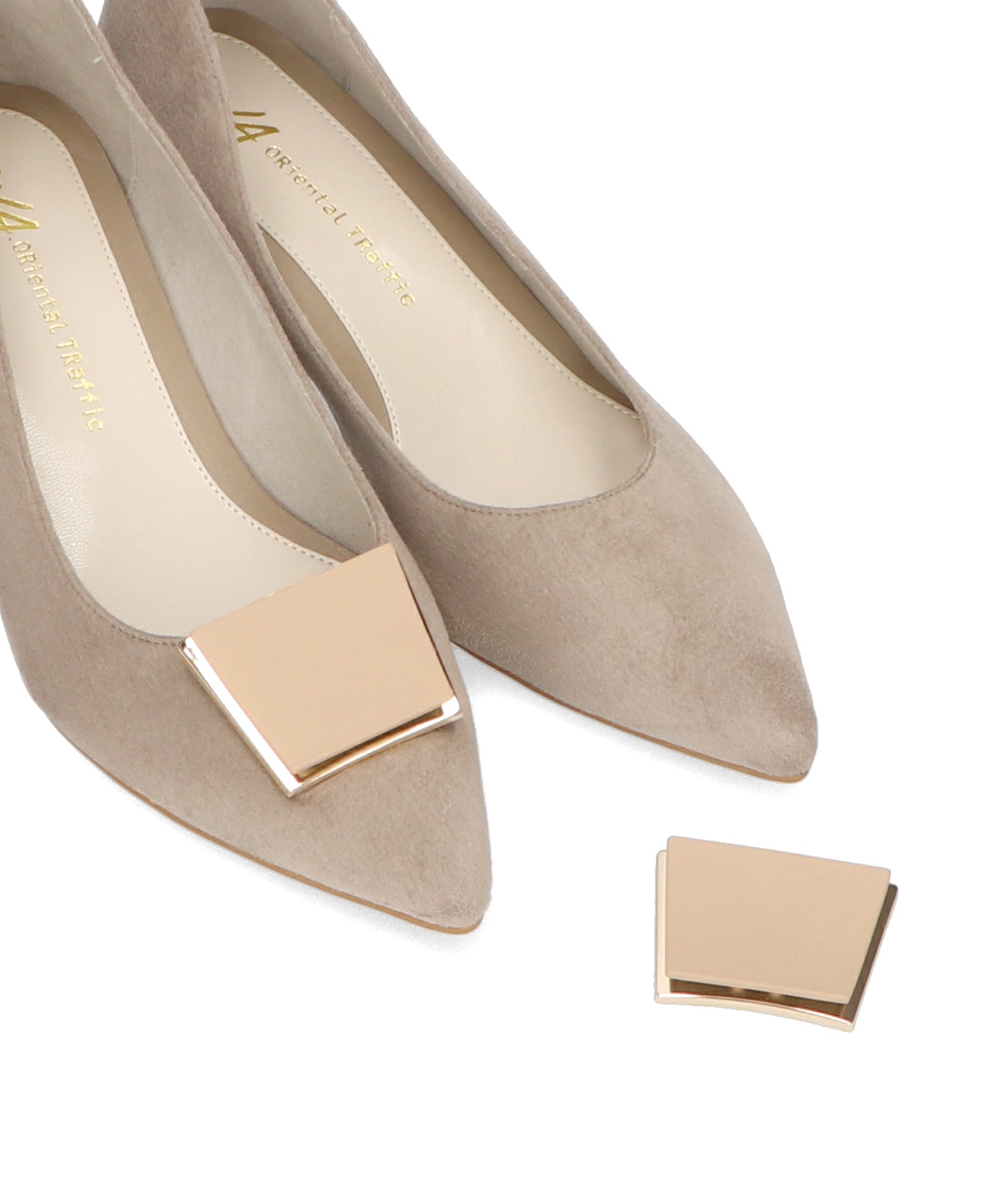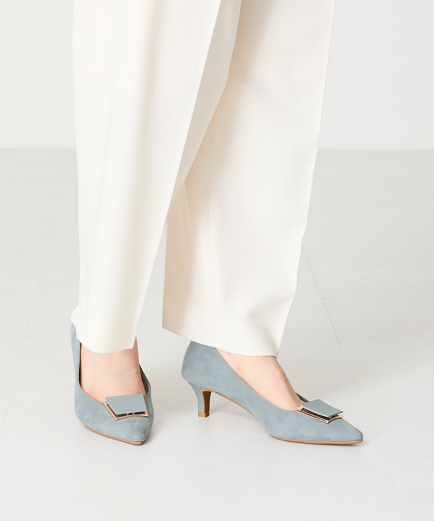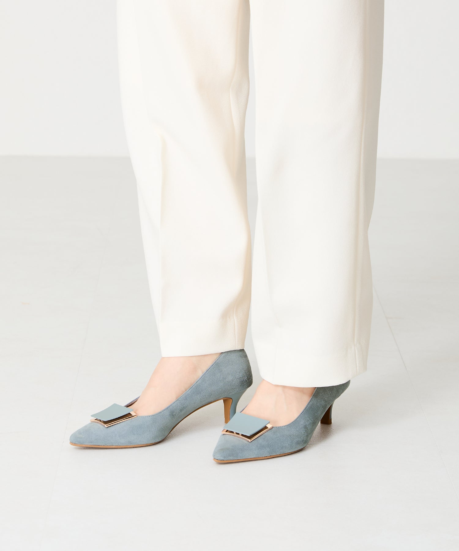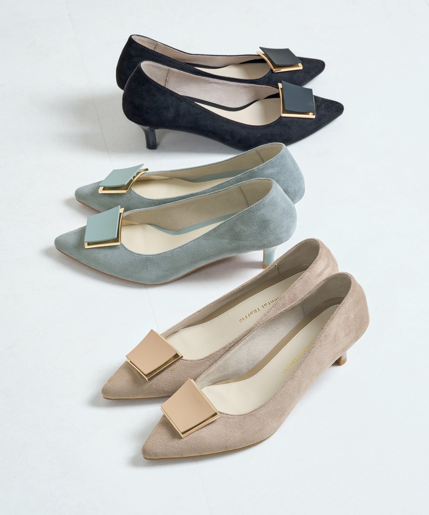 シャープなポインテッドトゥに細身のヒールで、華奢なシルエットを叶えてくれるパンプス。足の負担が軽くなるよう、つま先にクッションを入れたり、踵芯を柔らかくすることで、見た目以上の履きやすさを追及。アッパーの色に合わせた新鮮なスクエアモチーフは、クリップ式で取り外しが簡単なので、スタイリングやその日の気分によって変えられるのも嬉しい。