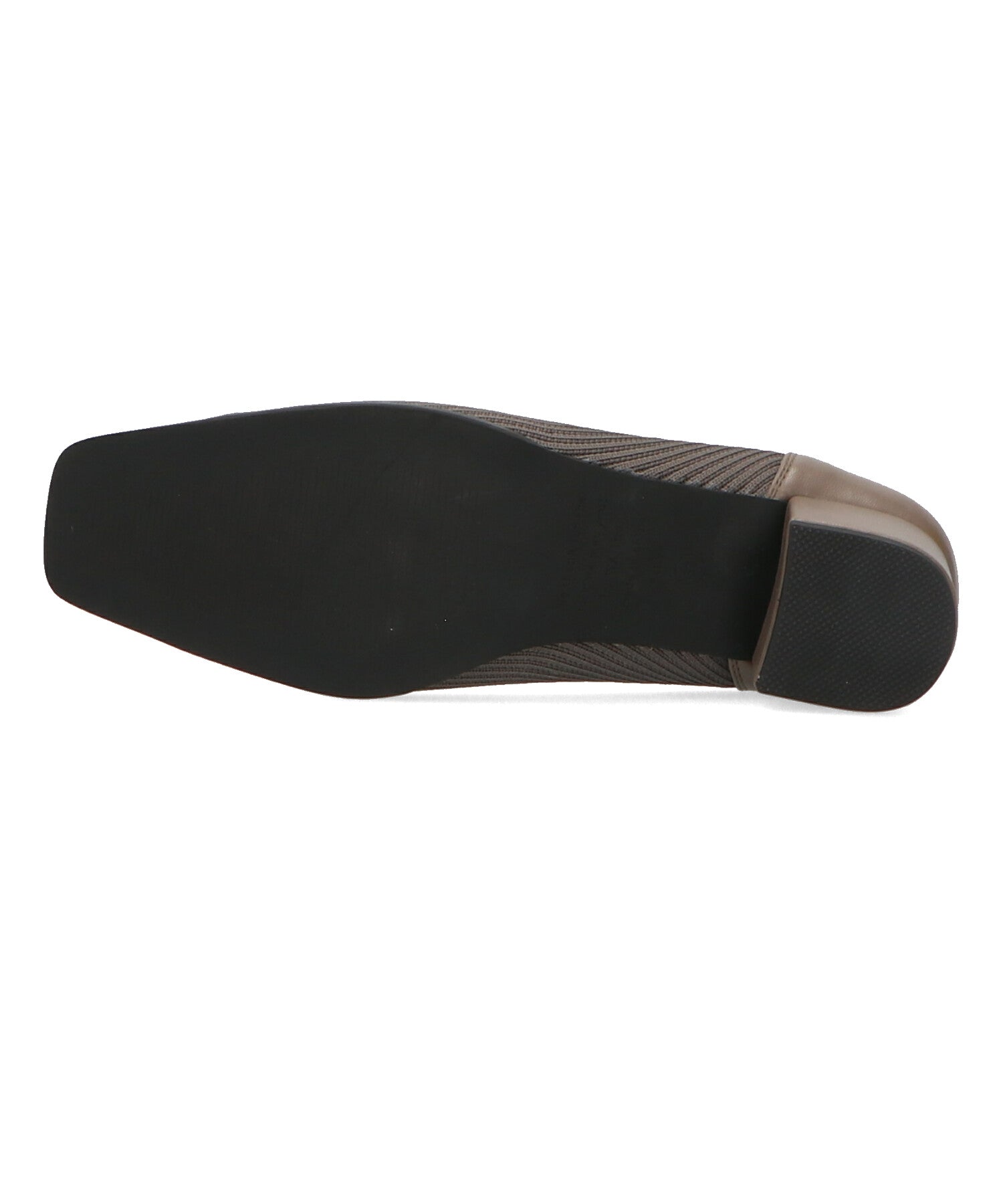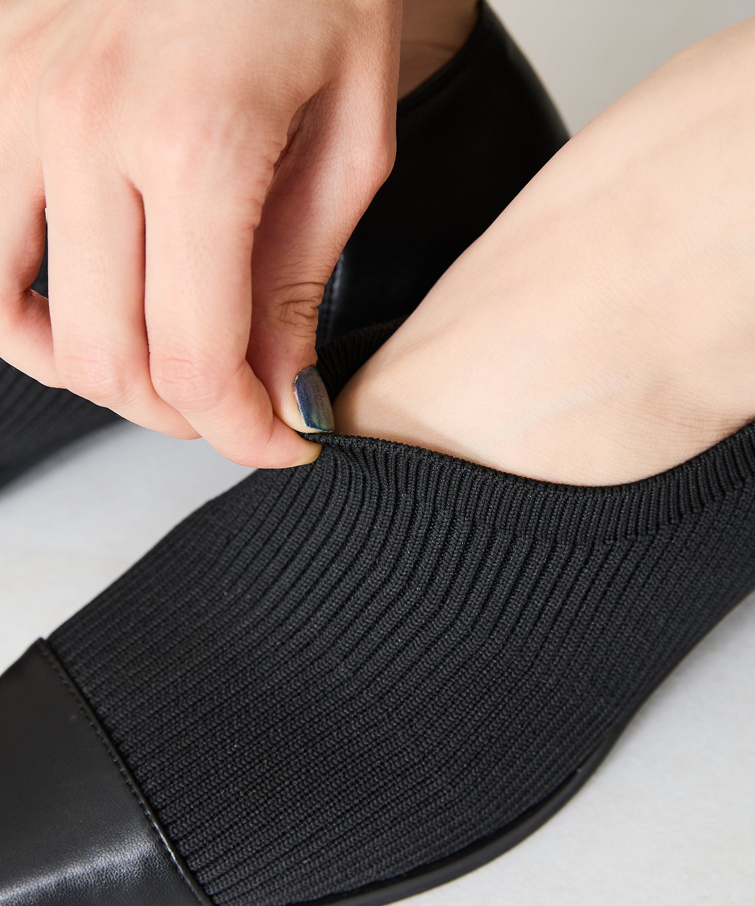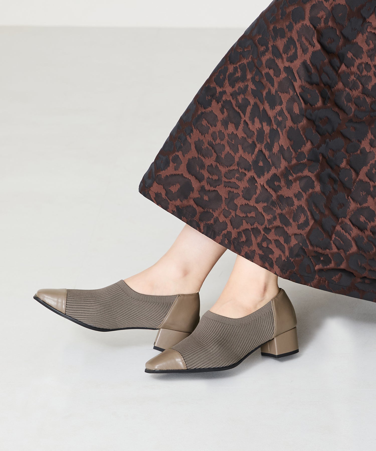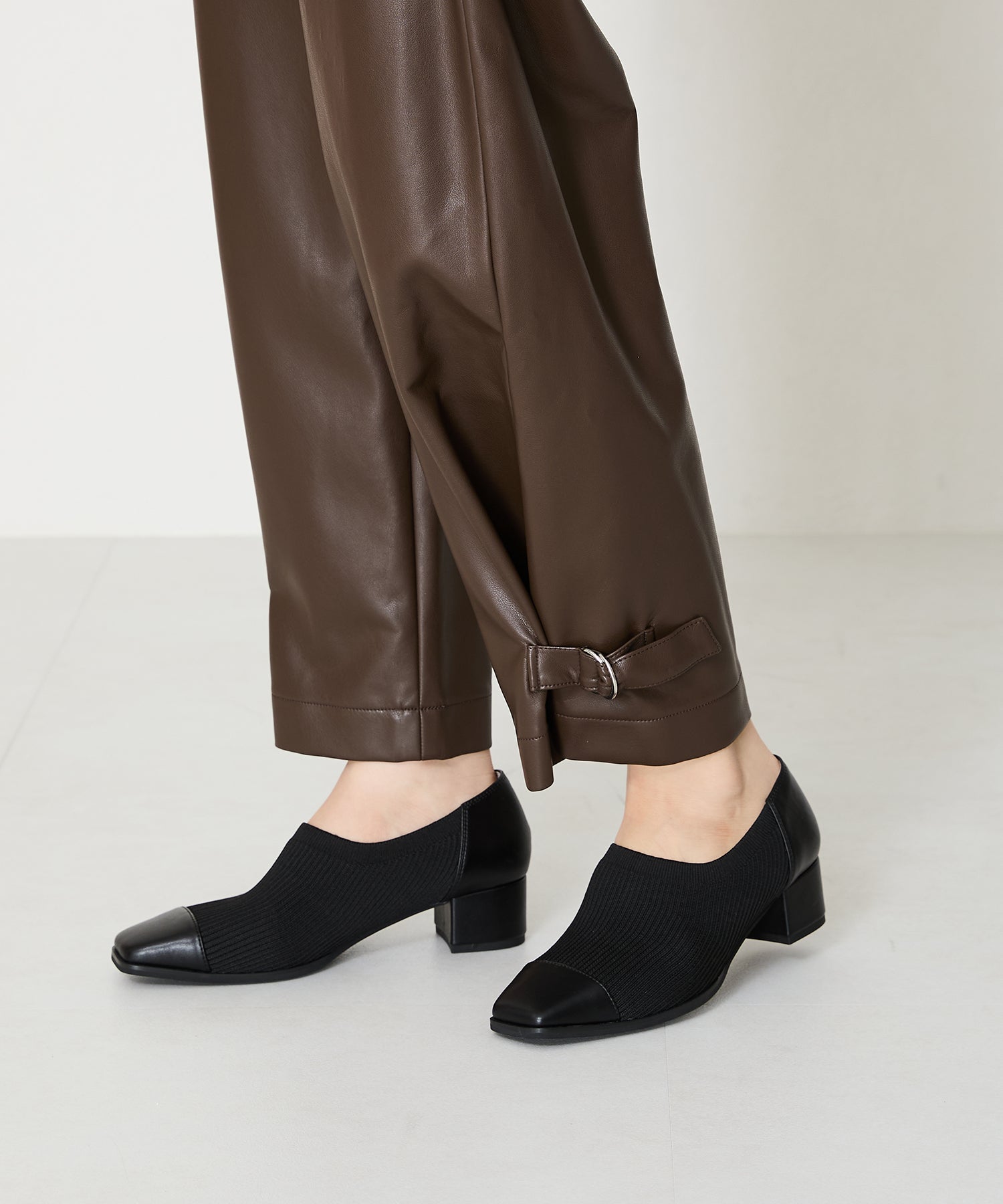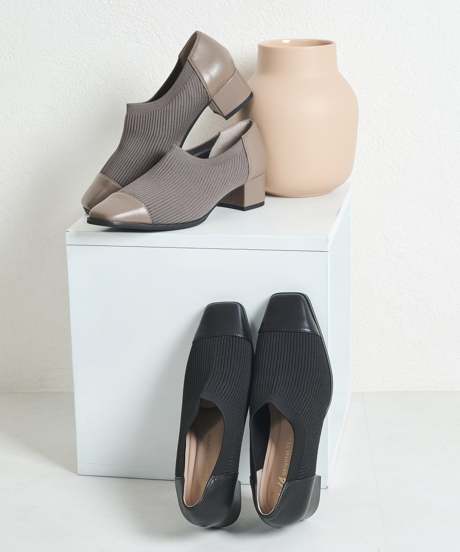 オリジナルで設計した凹凸のある厚手のインソール入りで歩きやすいパンプスは、太めのヒールで安定感もあり、全体をワントーンでまとめたオンオフ兼用で使えるアイテム。アッパーは伸縮性のあるリブニット素材で甲の部分をしっかりと覆ってくれるので脱げにくくホールド感も◎。つま先部分のみスムース素材で切り替えることで、シンプルになりすぎないようアクセントをプラス。