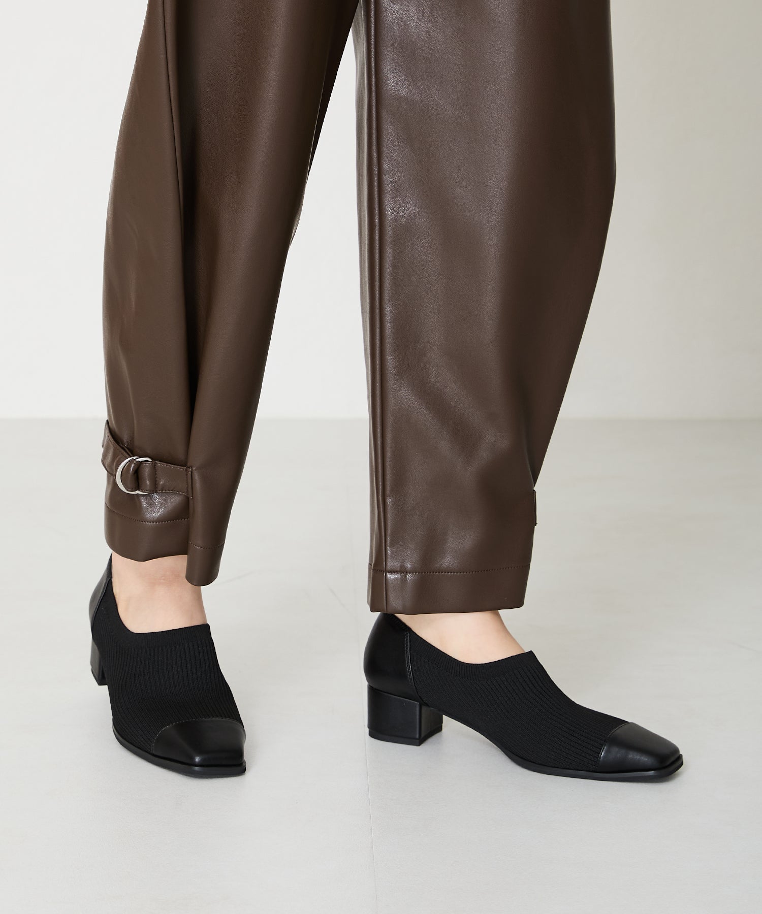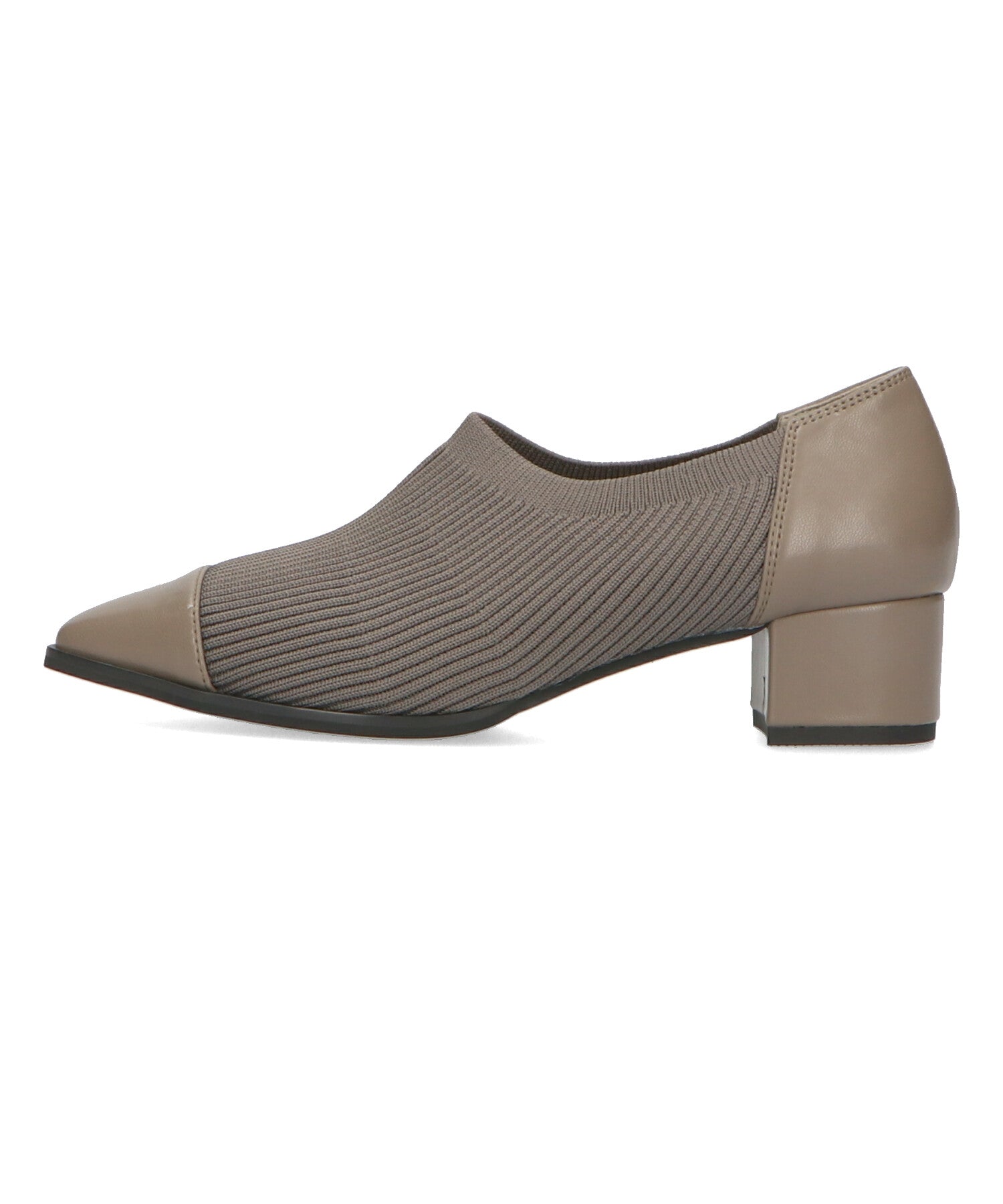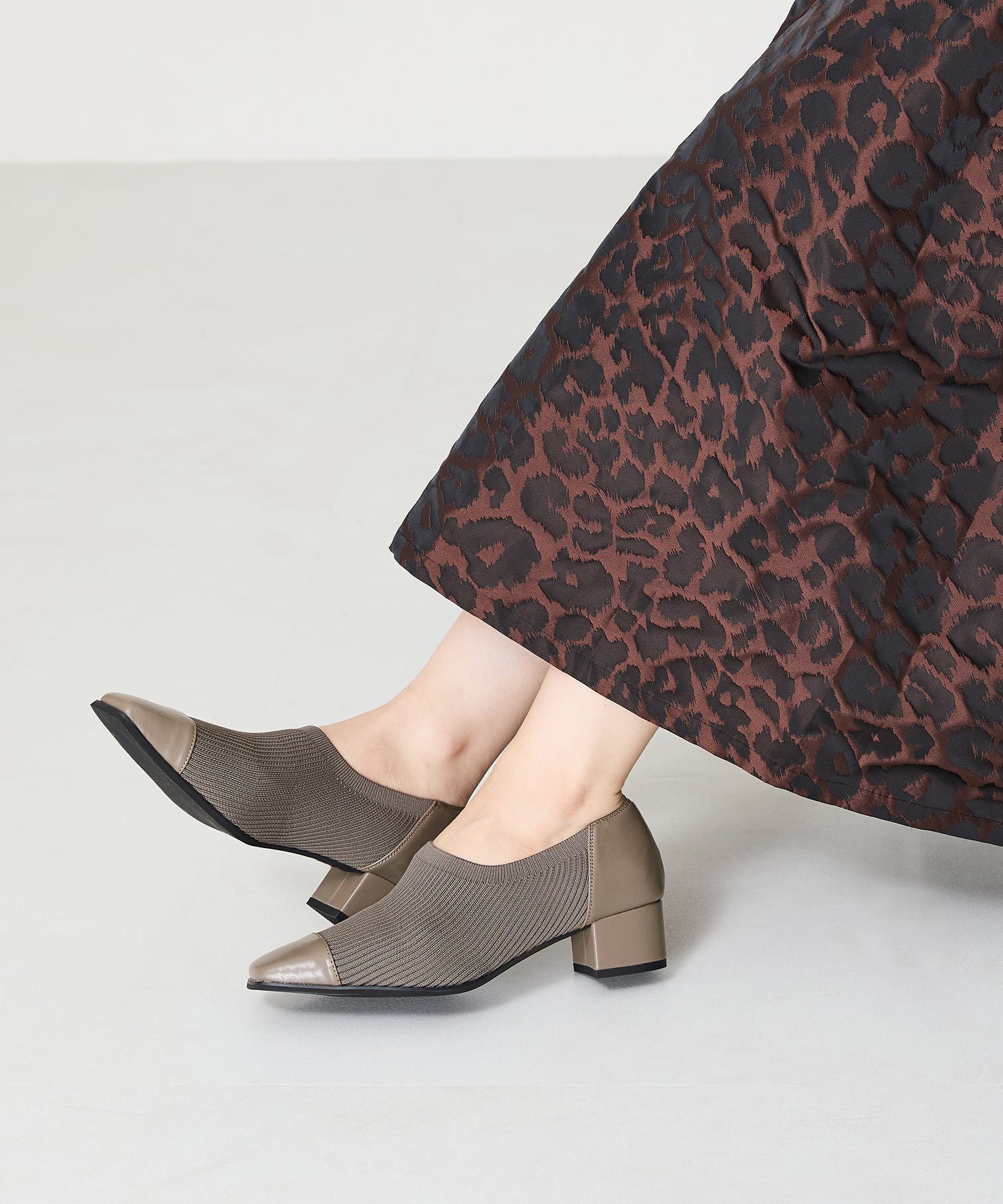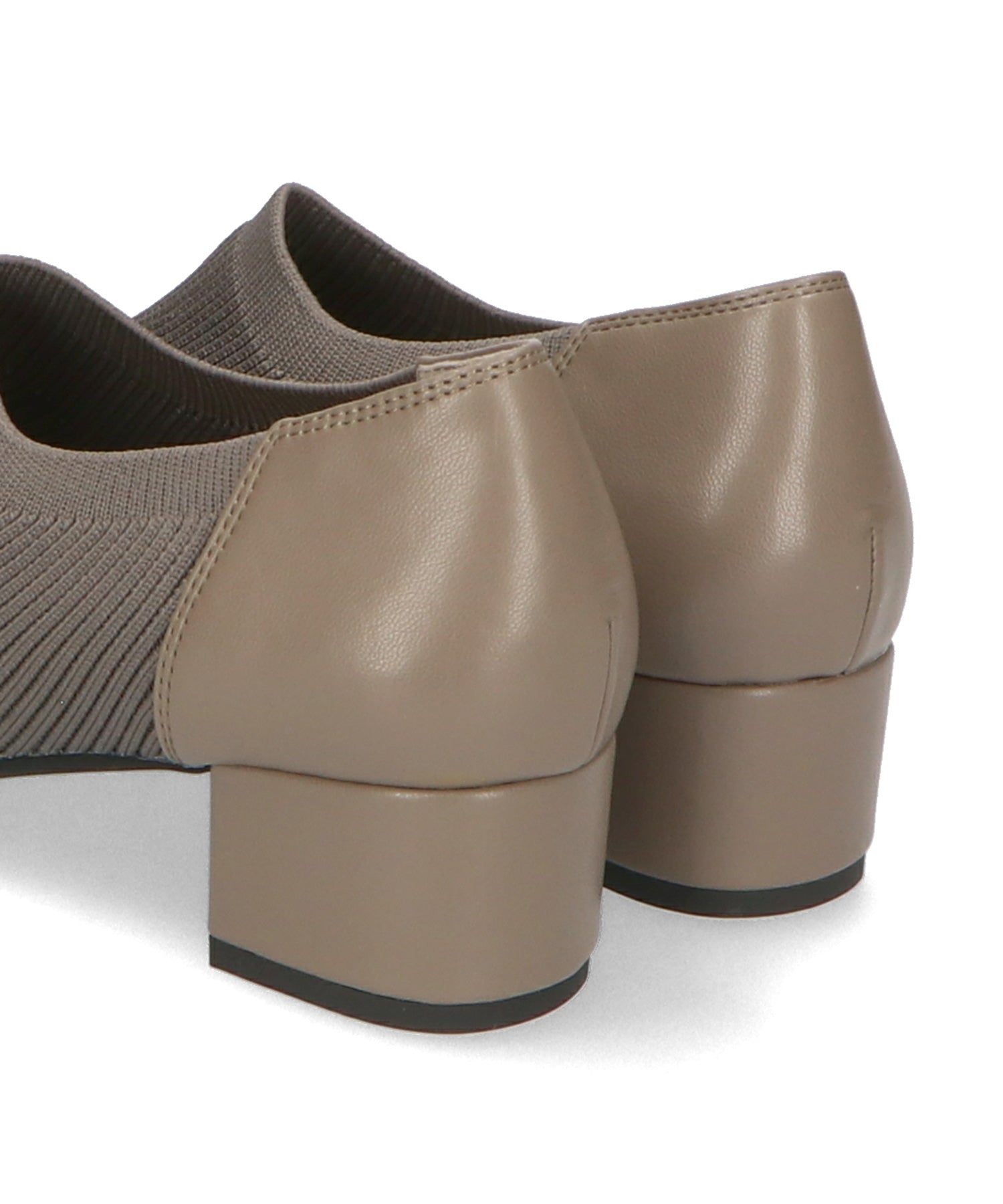 オリジナルで設計した凹凸のある厚手のインソール入りで歩きやすいパンプスは、太めのヒールで安定感もあり、全体をワントーンでまとめたオンオフ兼用で使えるアイテム。アッパーは伸縮性のあるリブニット素材で甲の部分をしっかりと覆ってくれるので脱げにくくホールド感も◎。つま先部分のみスムース素材で切り替えることで、シンプルになりすぎないようアクセントをプラス。