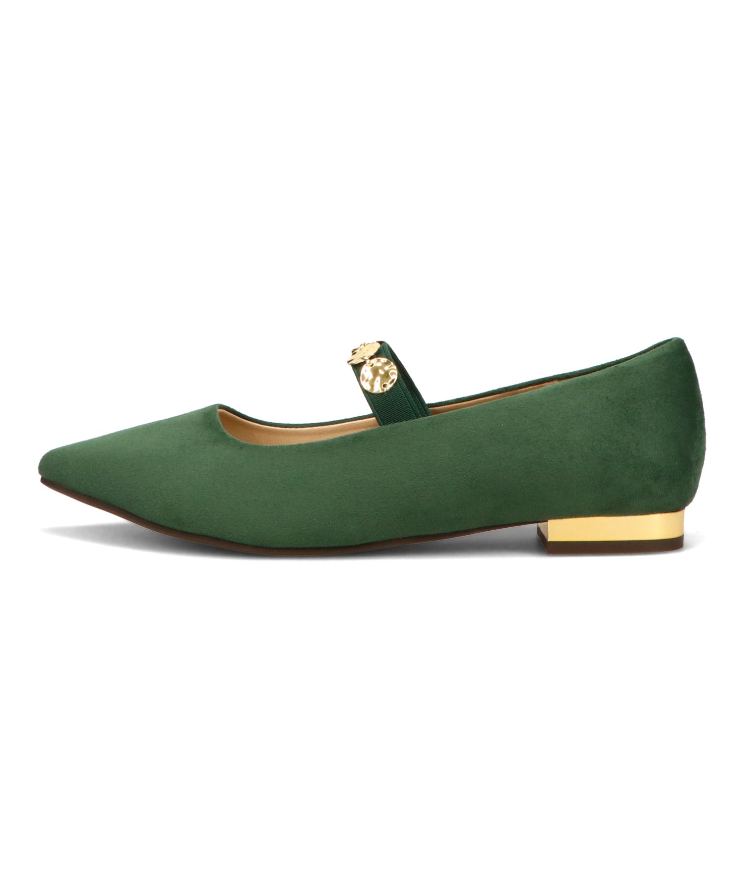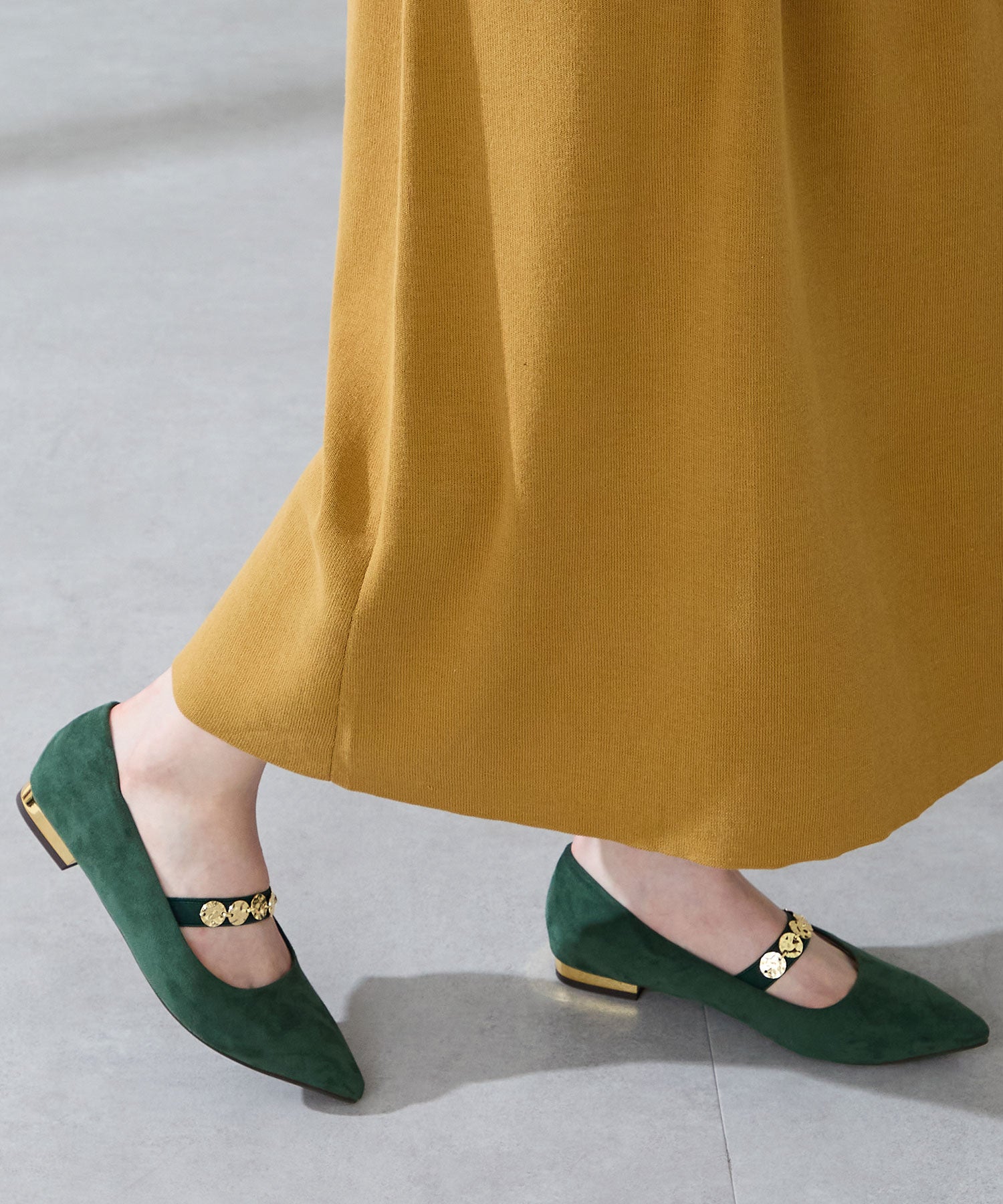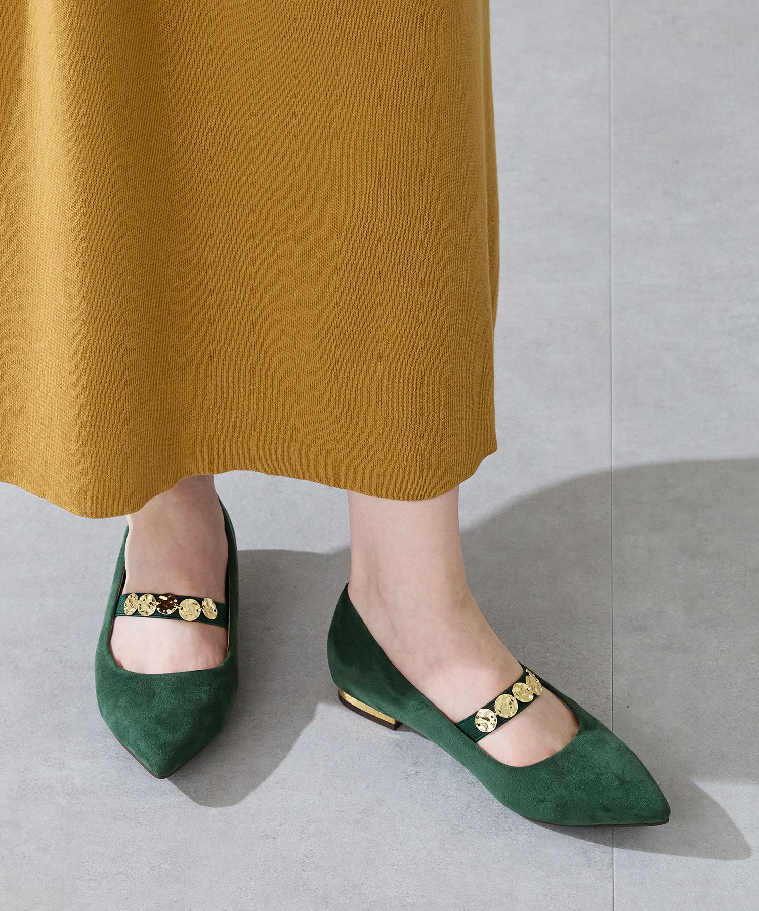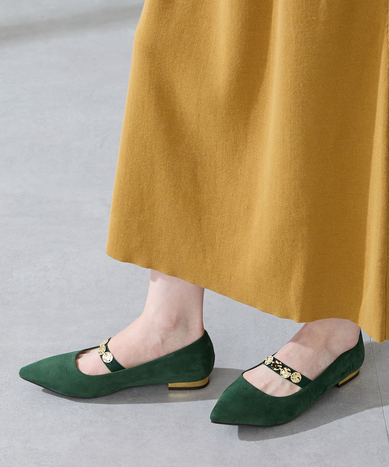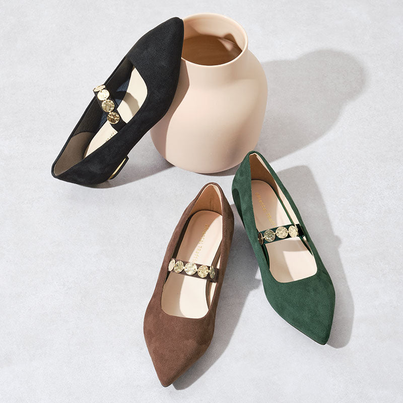 シャープなポインテッドトゥにゴールドのコインパーツの組み合わせが目を引く1足。甲は伸縮性のあるゴムベルトでしっかりとフィットし、歩行時の安定感をサポート。ヒールにはゴールドのメタリックプレートをあしらったデザインで、後ろ姿まで美しく演出。エレガンスな雰囲気のパンプスも、肌になじむスエード素材で全体的に柔らかな秋らしく仕上げたアイテム。