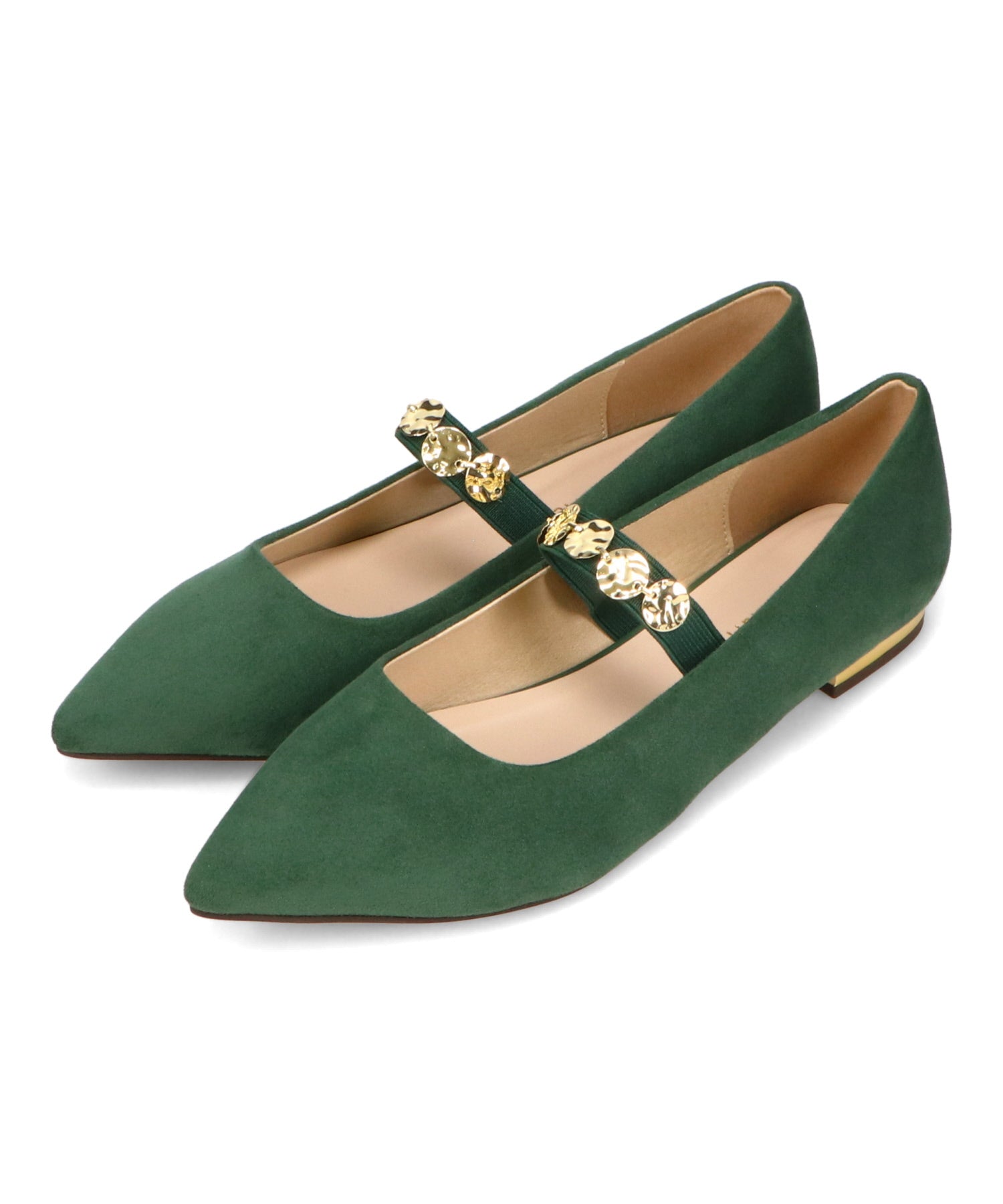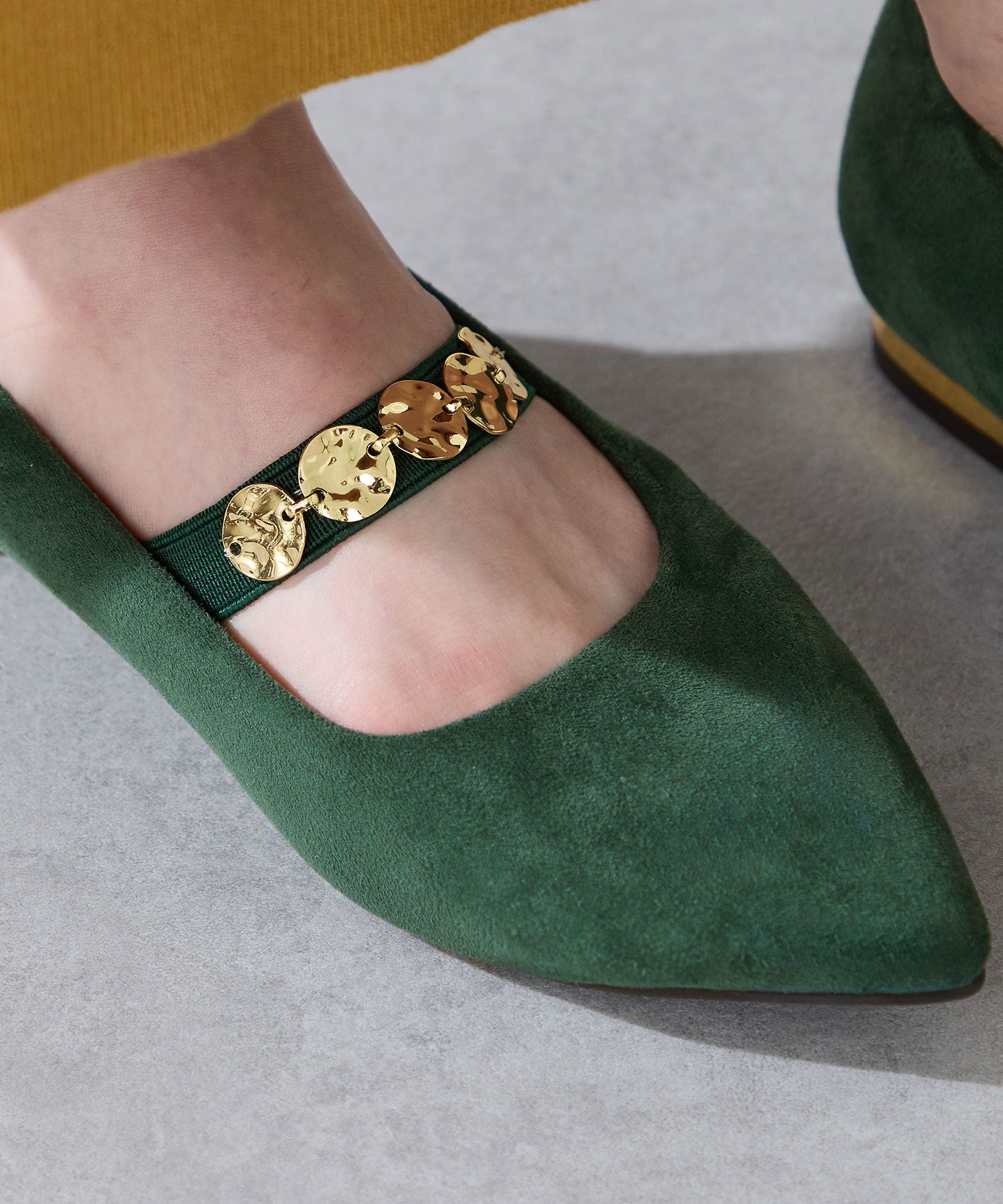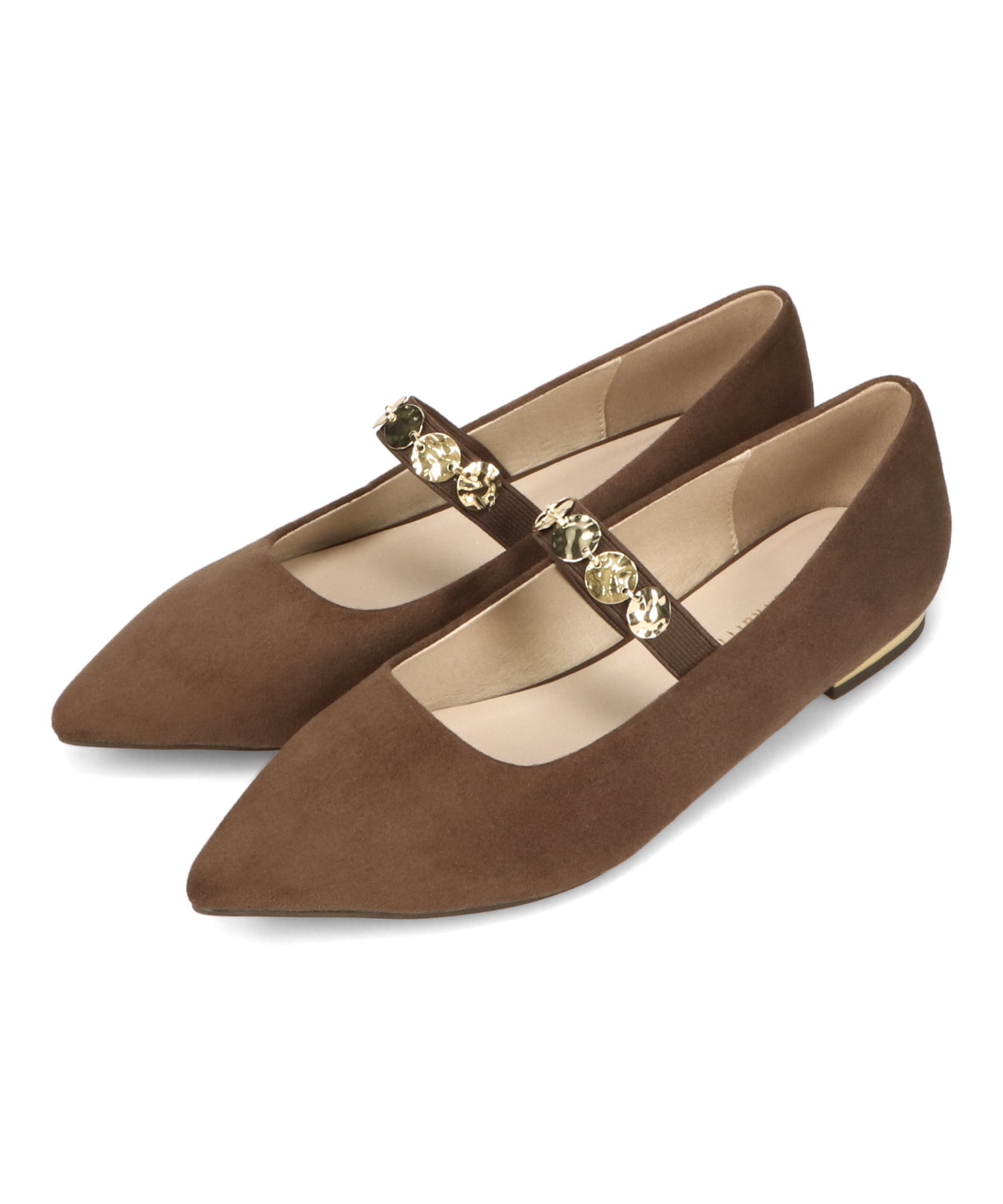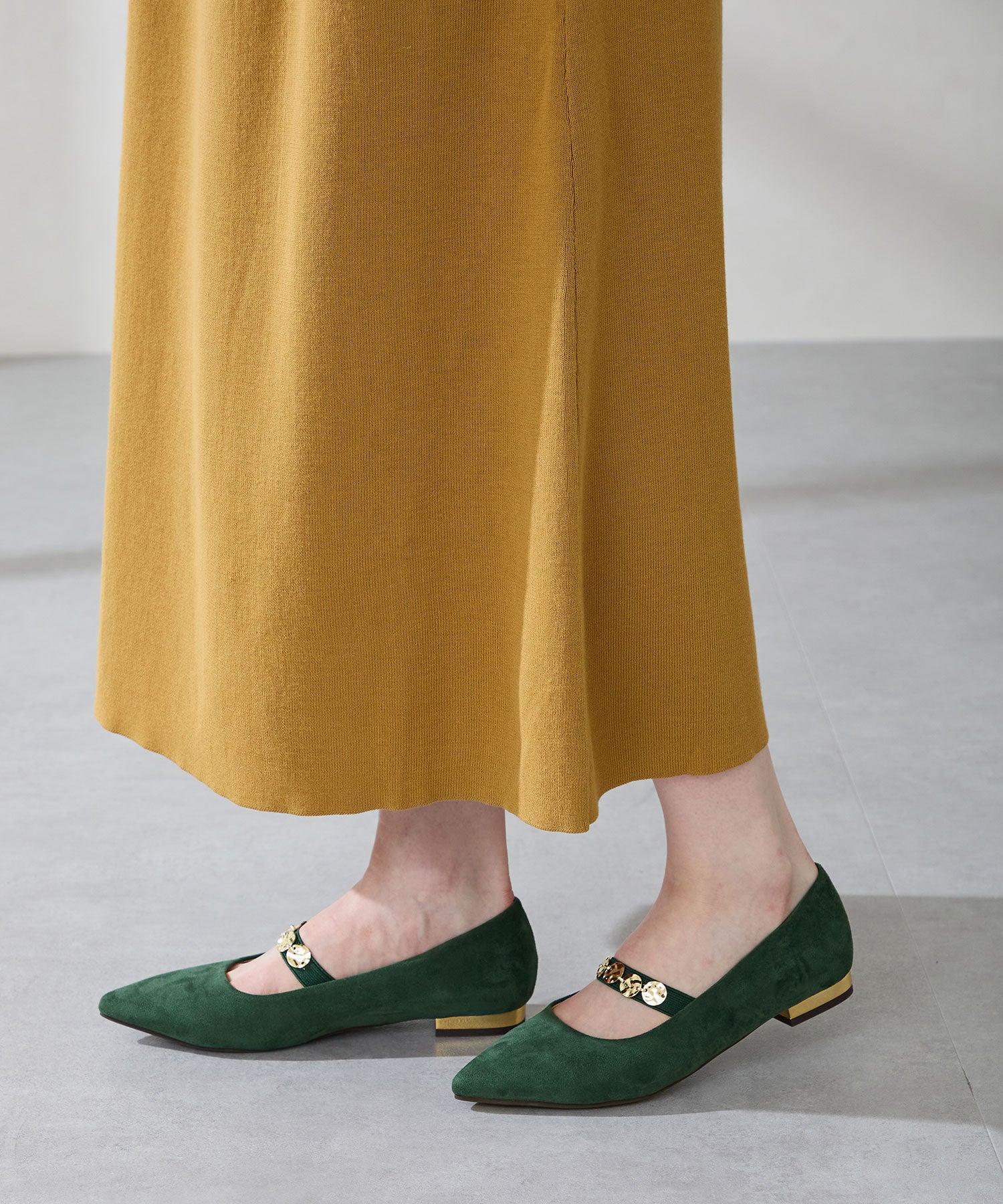 シャープなポインテッドトゥにゴールドのコインパーツの組み合わせが目を引く1足。甲は伸縮性のあるゴムベルトでしっかりとフィットし、歩行時の安定感をサポート。ヒールにはゴールドのメタリックプレートをあしらったデザインで、後ろ姿まで美しく演出。エレガンスな雰囲気のパンプスも、肌になじむスエード素材で全体的に柔らかな秋らしく仕上げたアイテム。