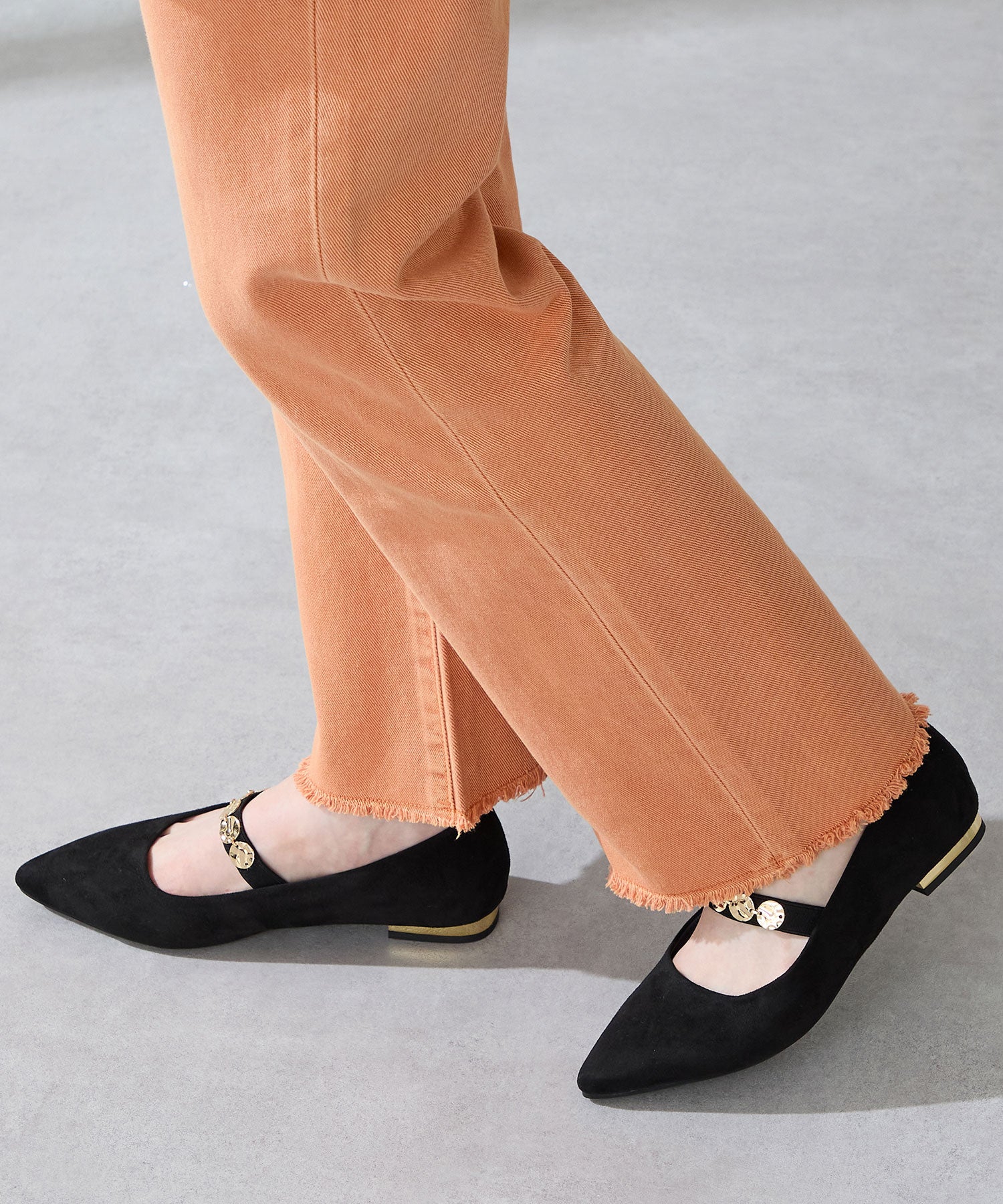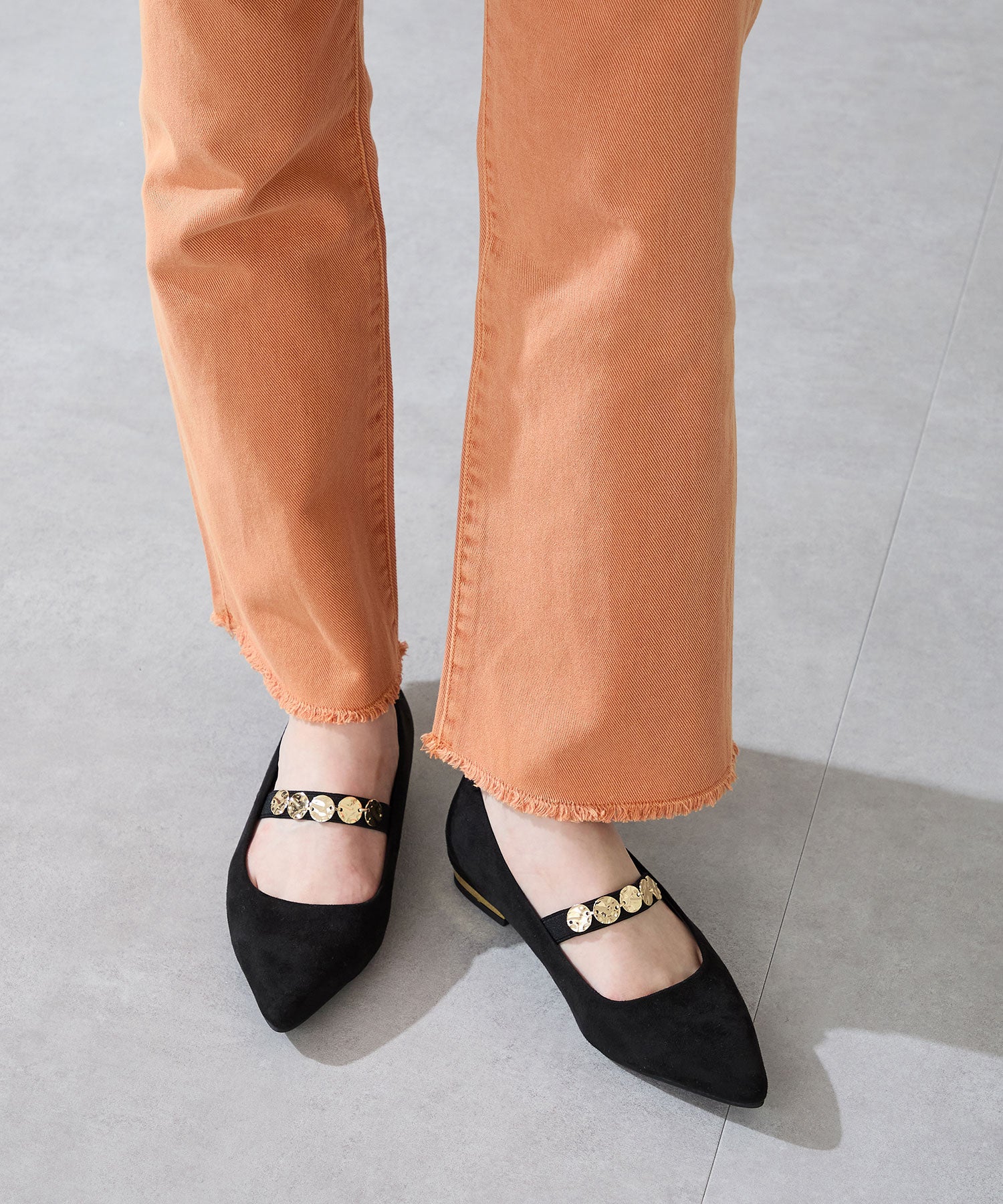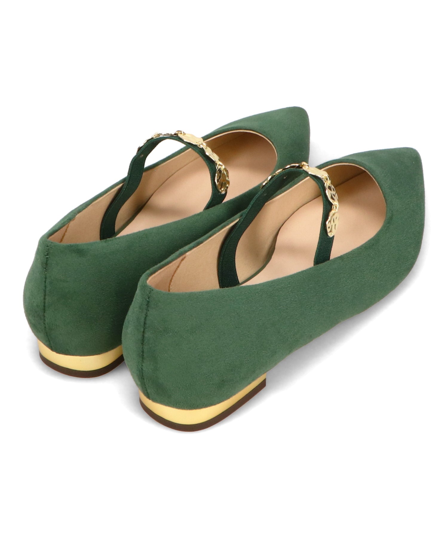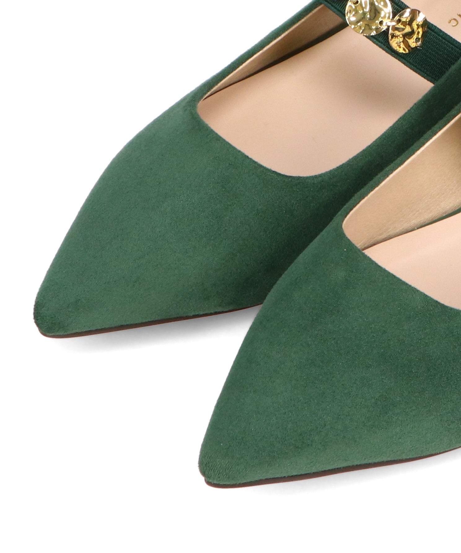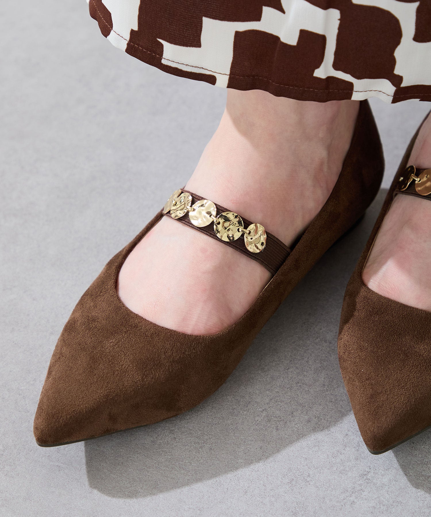 シャープなポインテッドトゥにゴールドのコインパーツの組み合わせが目を引く1足。甲は伸縮性のあるゴムベルトでしっかりとフィットし、歩行時の安定感をサポート。ヒールにはゴールドのメタリックプレートをあしらったデザインで、後ろ姿まで美しく演出。エレガンスな雰囲気のパンプスも、肌になじむスエード素材で全体的に柔らかな秋らしく仕上げたアイテム。