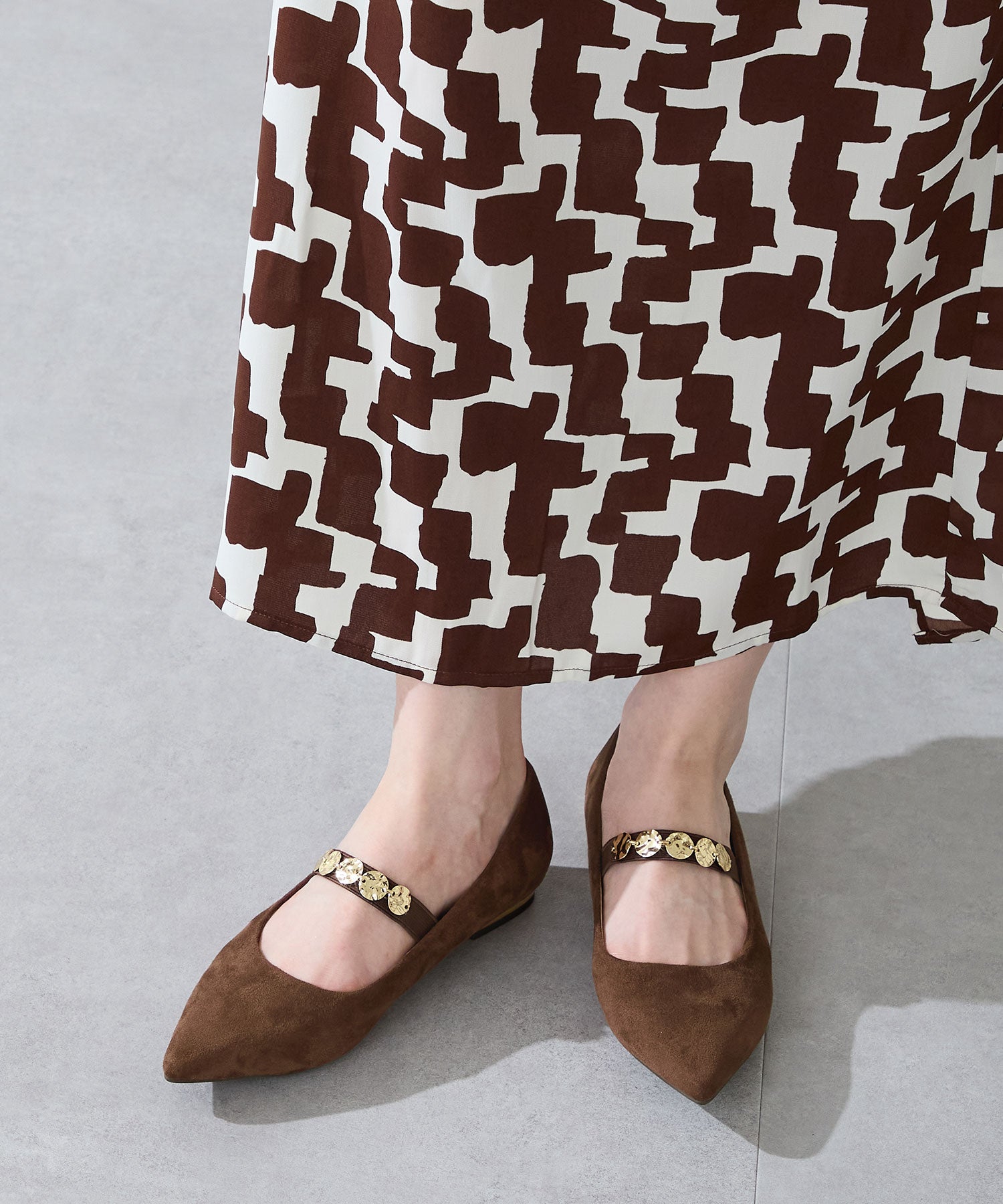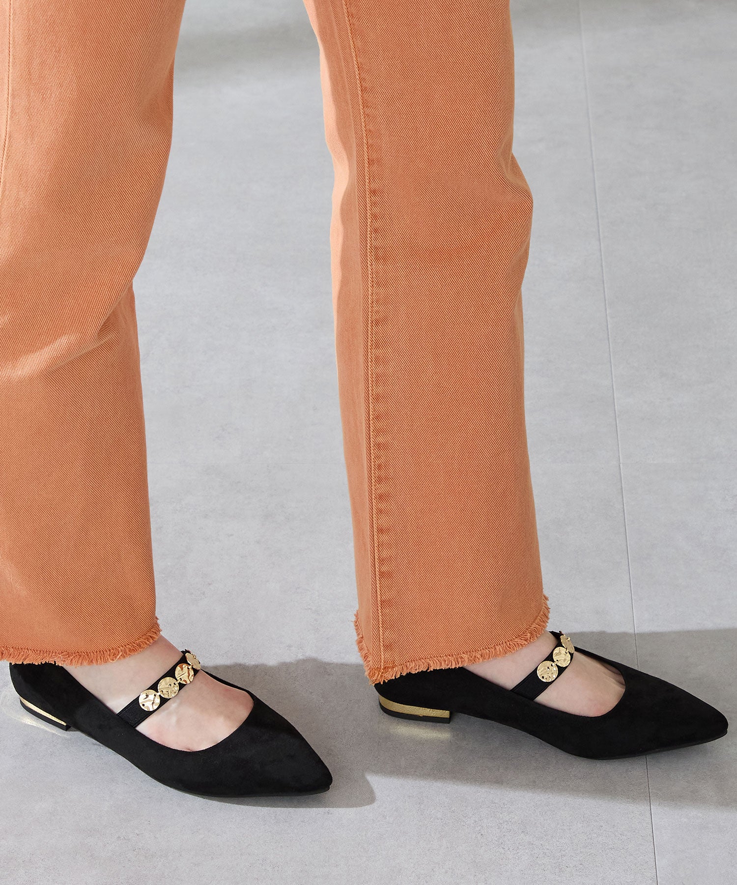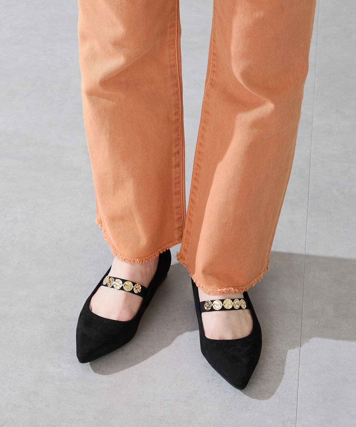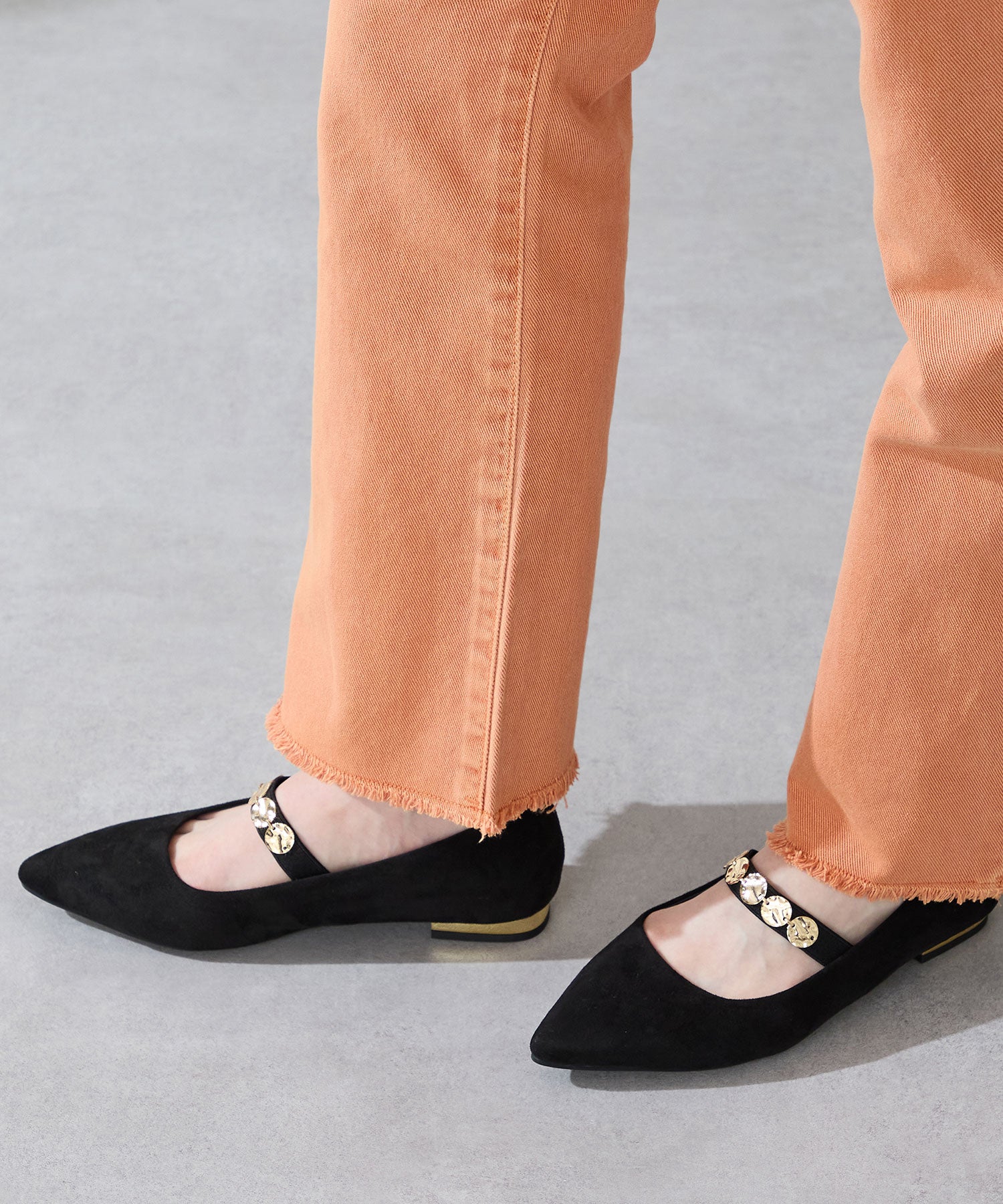 シャープなポインテッドトゥにゴールドのコインパーツの組み合わせが目を引く1足。甲は伸縮性のあるゴムベルトでしっかりとフィットし、歩行時の安定感をサポート。ヒールにはゴールドのメタリックプレートをあしらったデザインで、後ろ姿まで美しく演出。エレガンスな雰囲気のパンプスも、肌になじむスエード素材で全体的に柔らかな秋らしく仕上げたアイテム。