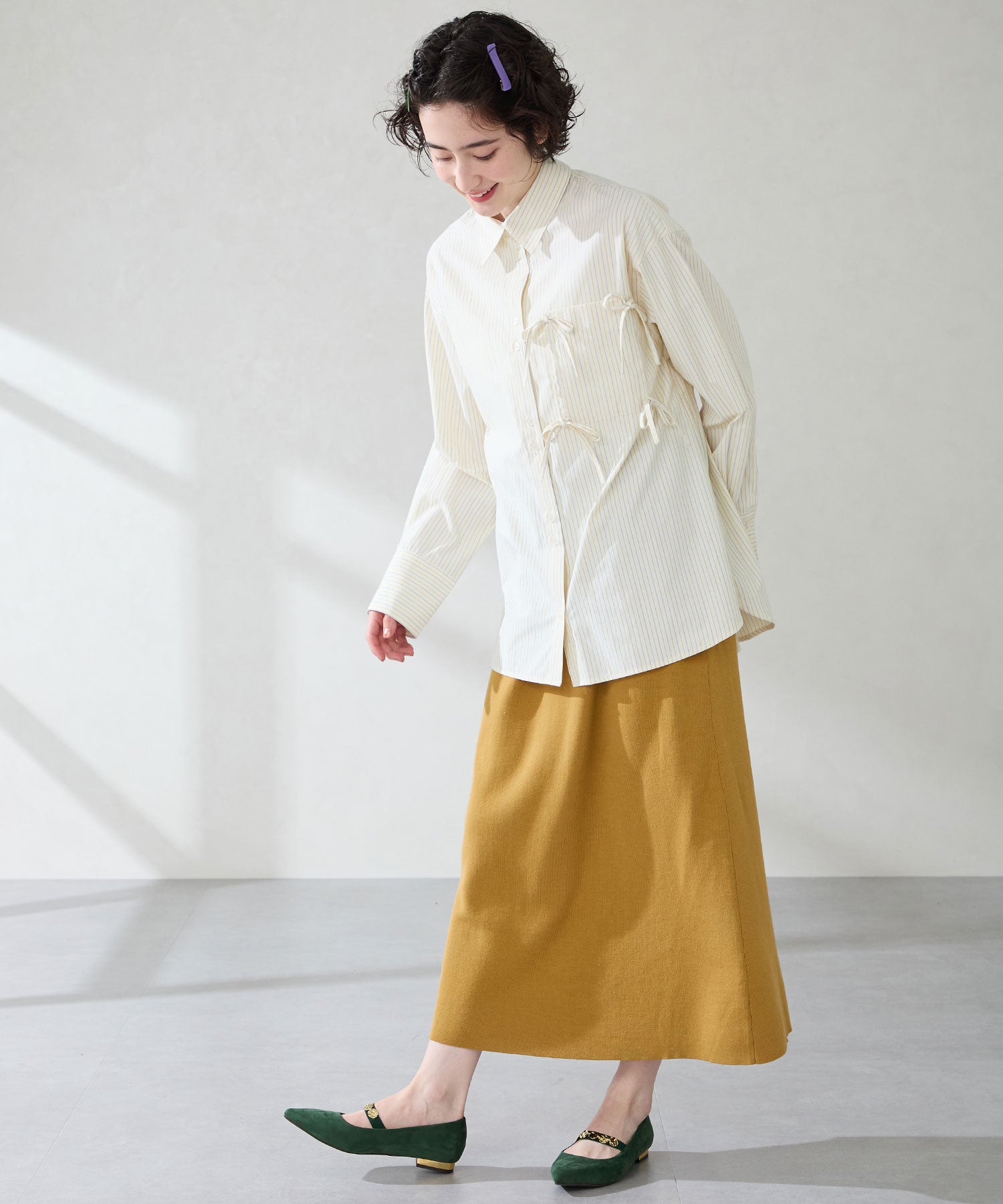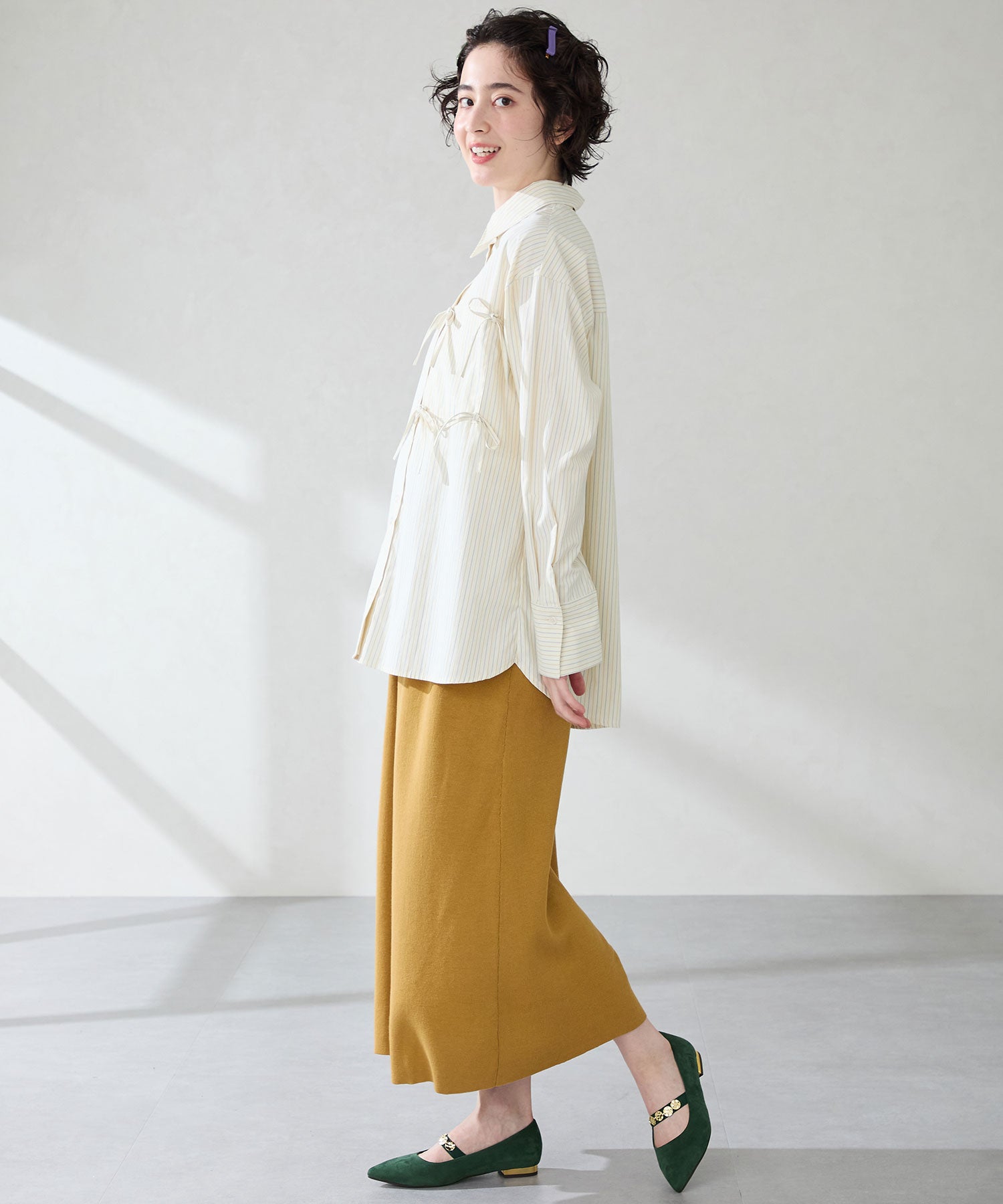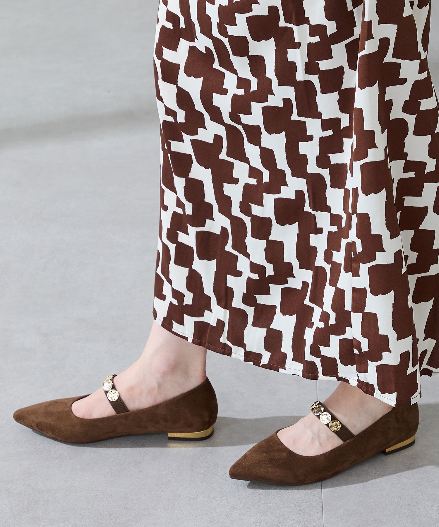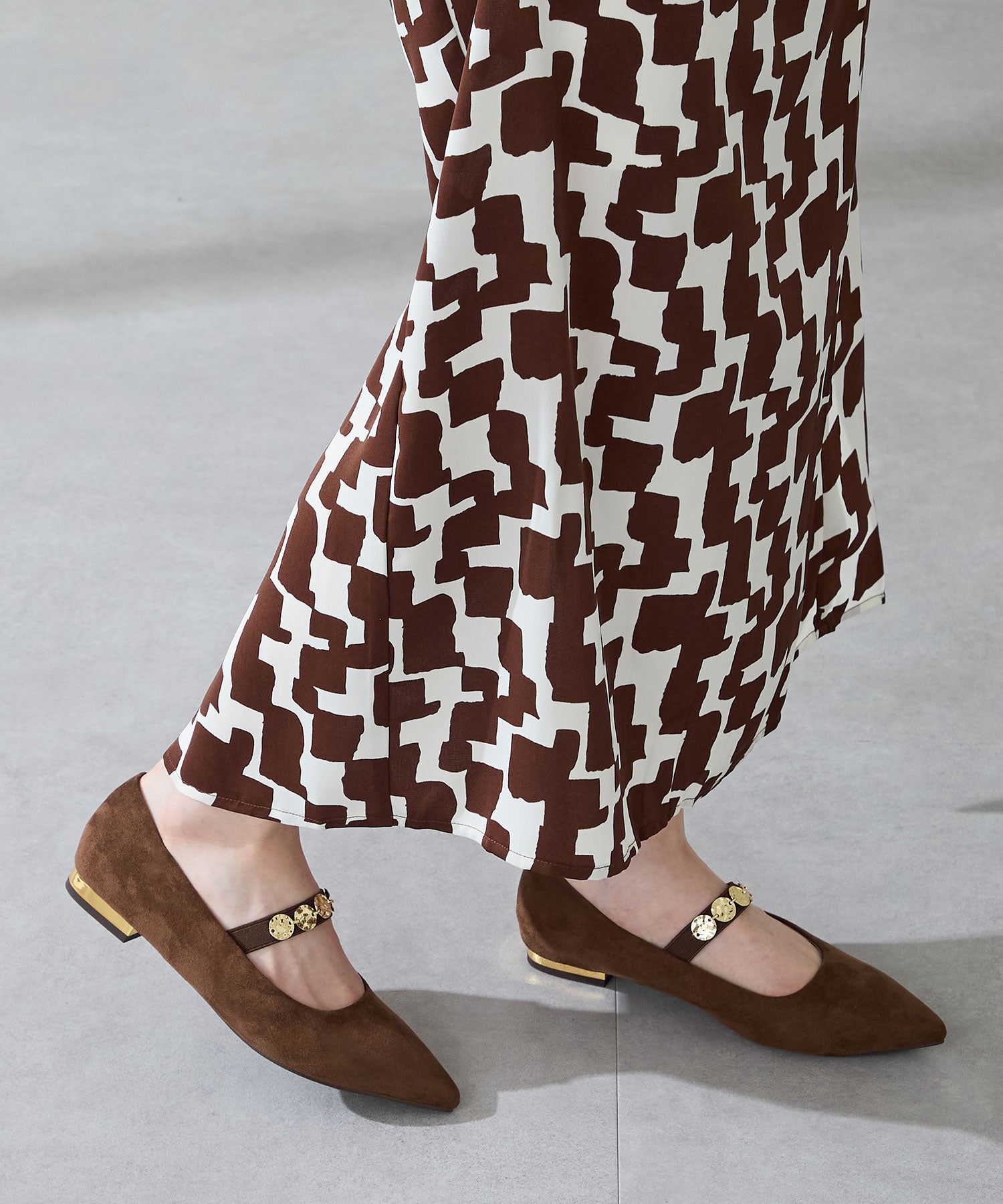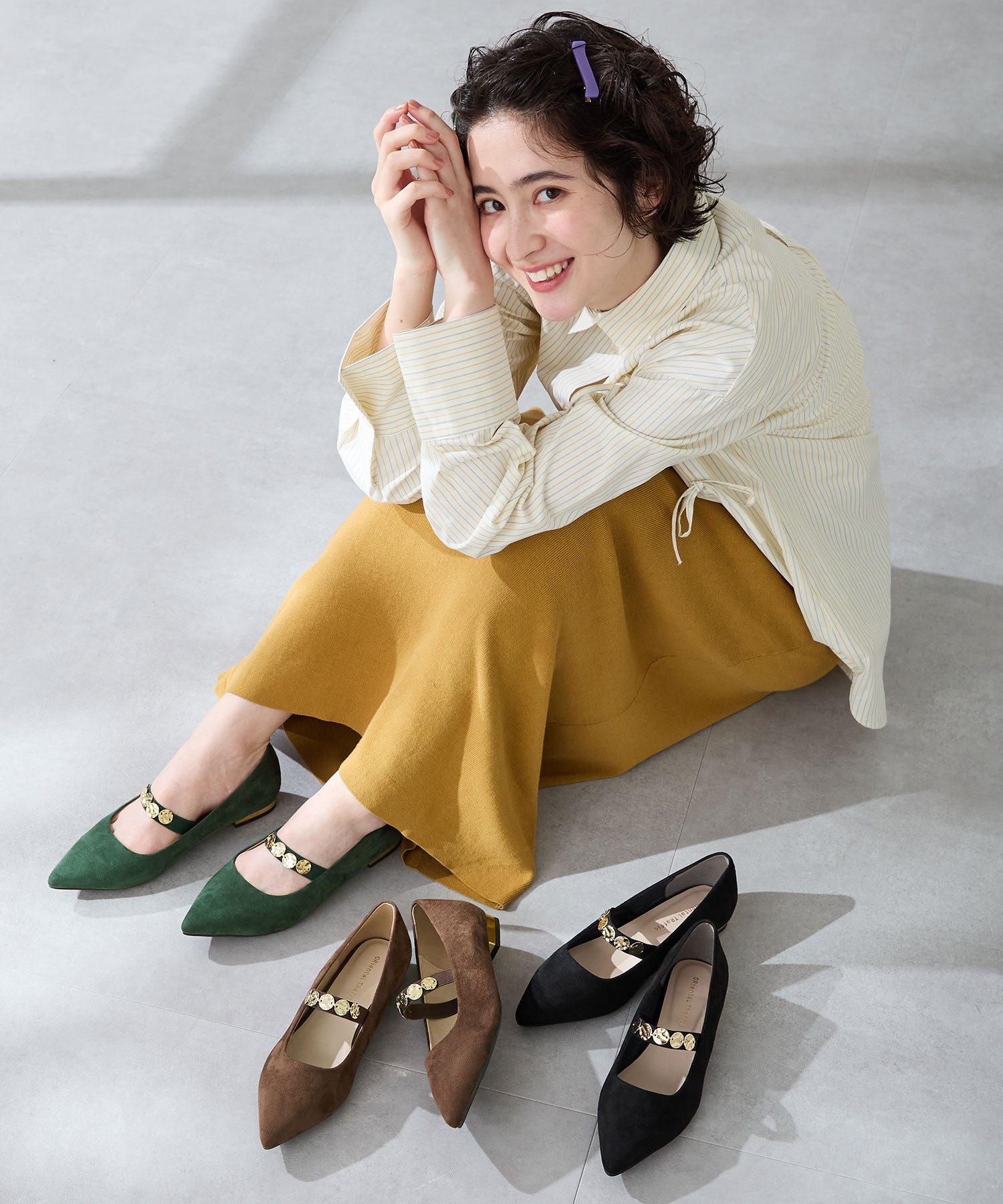 シャープなポインテッドトゥにゴールドのコインパーツの組み合わせが目を引く1足。甲は伸縮性のあるゴムベルトでしっかりとフィットし、歩行時の安定感をサポート。ヒールにはゴールドのメタリックプレートをあしらったデザインで、後ろ姿まで美しく演出。エレガンスな雰囲気のパンプスも、肌になじむスエード素材で全体的に柔らかな秋らしく仕上げたアイテム。