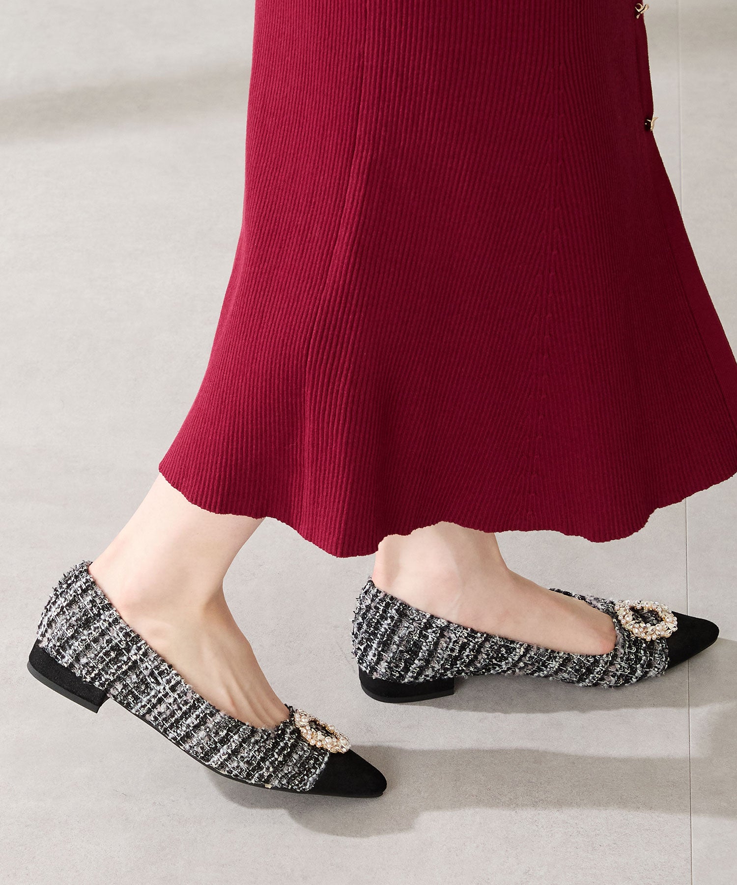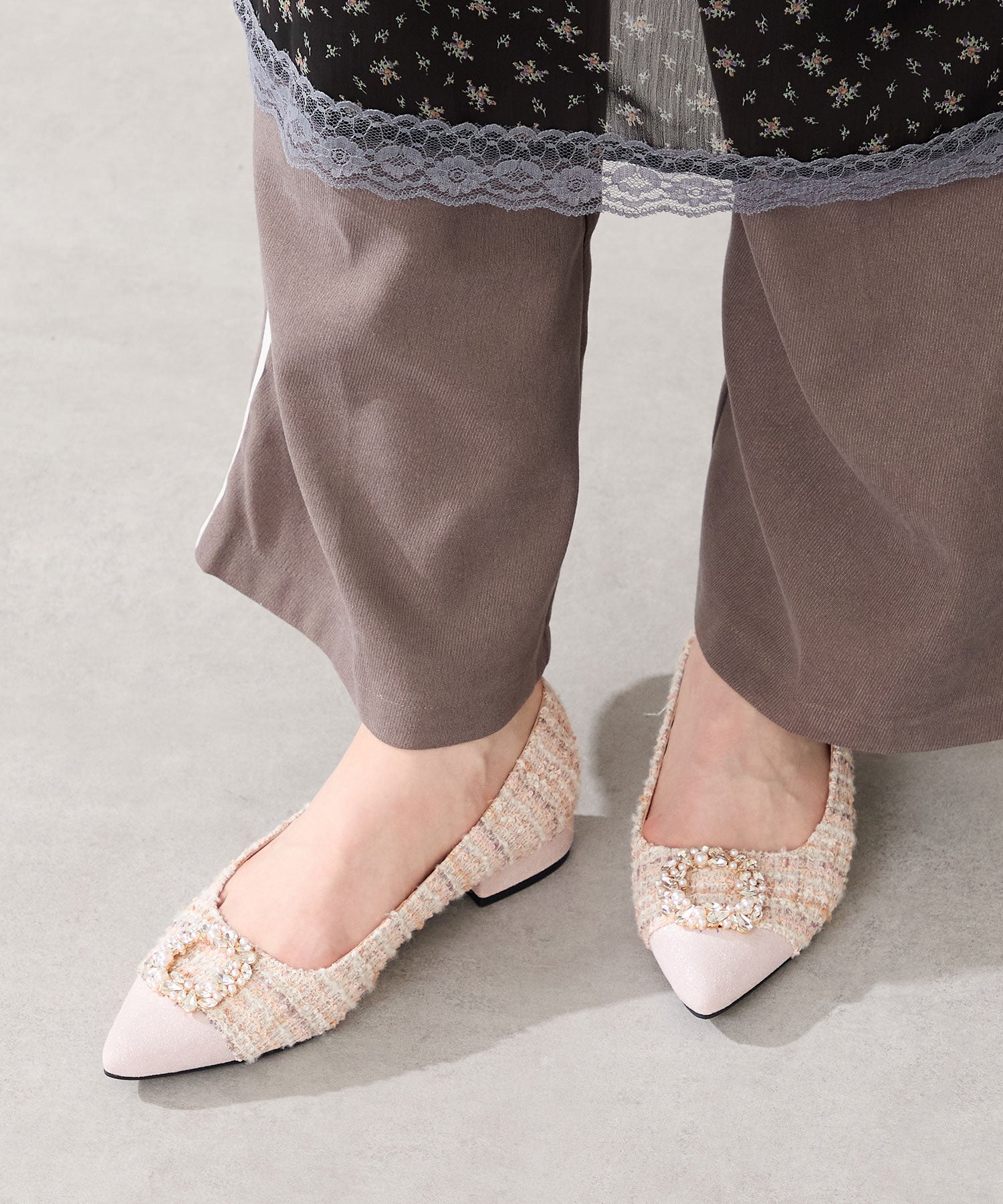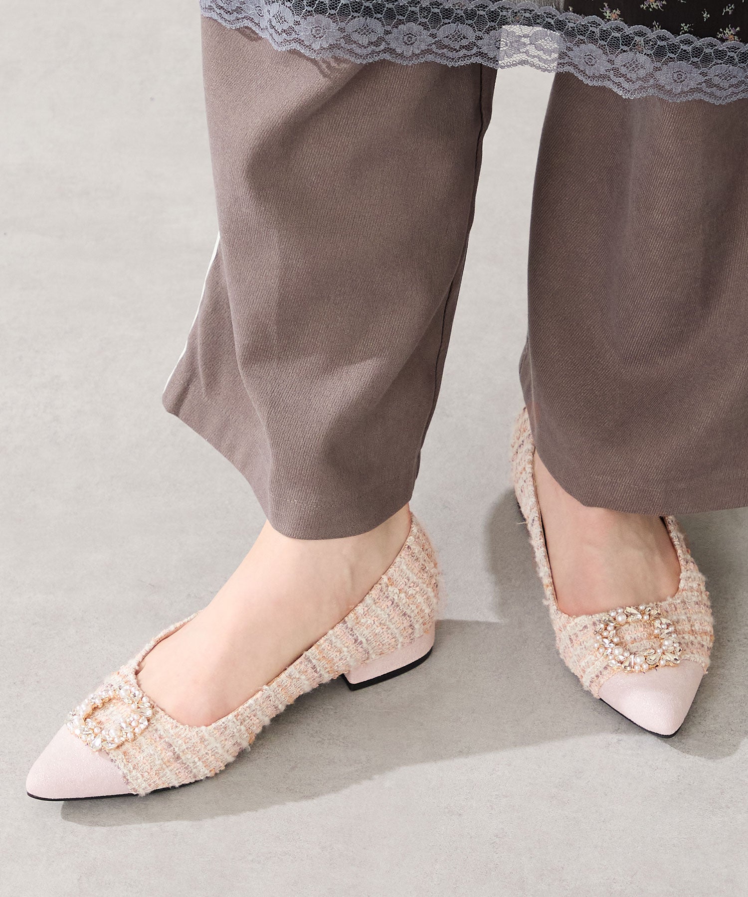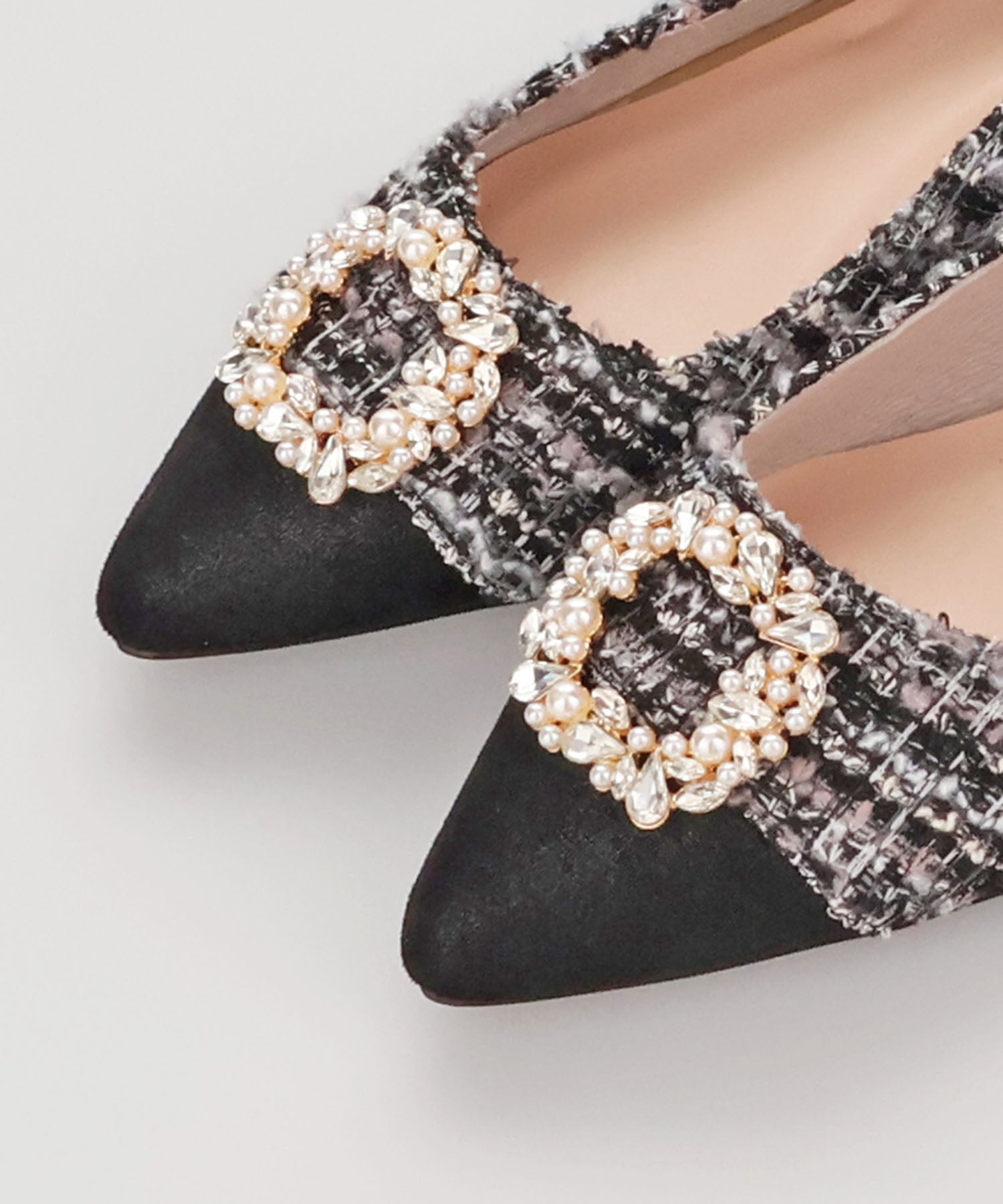 パールやビジューのモチーフで輝きを添えたパンプスは、ツイード素材でフェミニンライクに仕上げた1足。切替を付けたつま先とヒールにはラメ入りの素材を合わせることで、さらに女性心くすぐるアイテムに。ポインテッドトゥで上品なシルエットながらも、さっと履きやすいローヒールなので、スカート合わせだけではなくデニムなどカジュアルスタイルにもおすすめ。