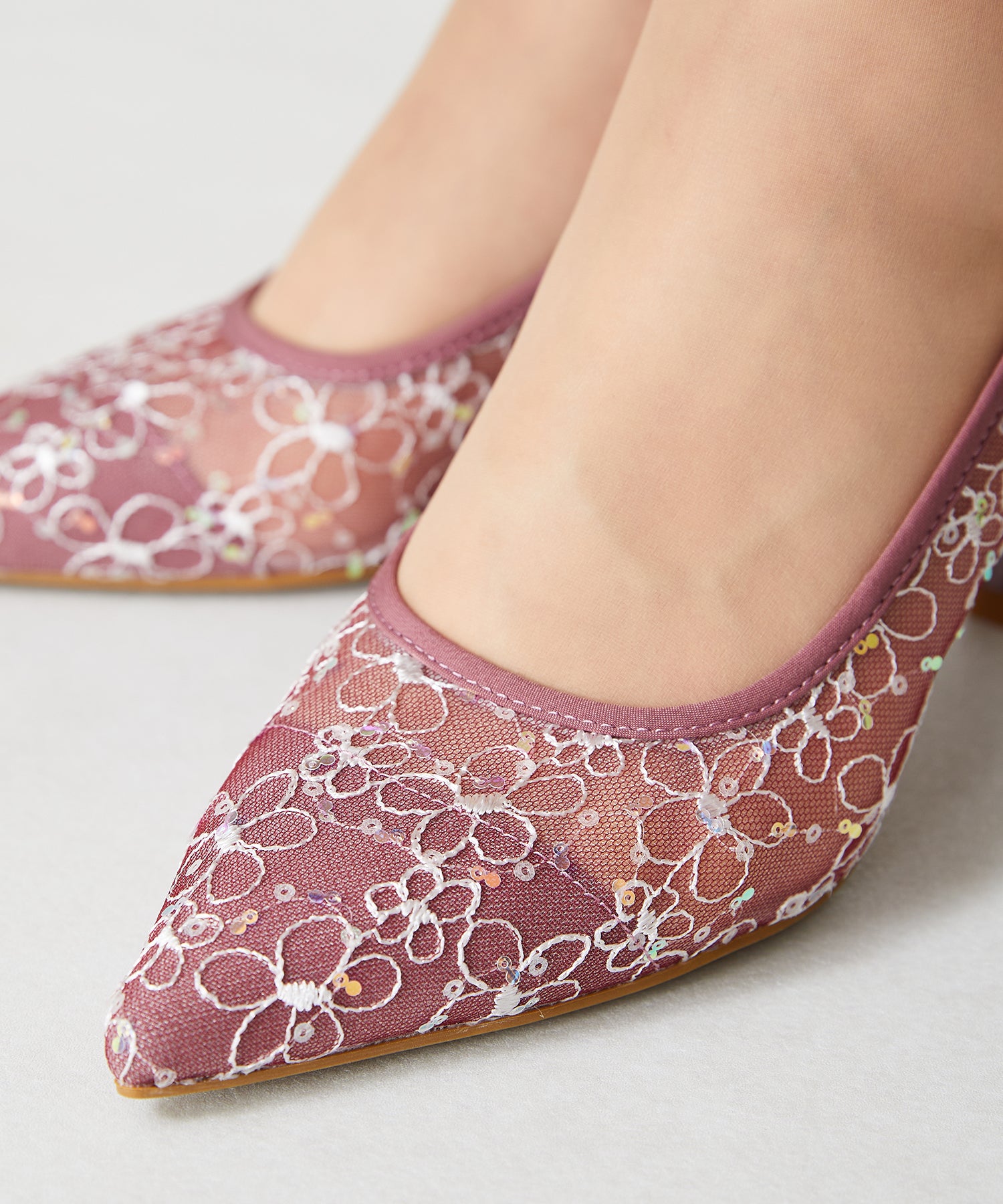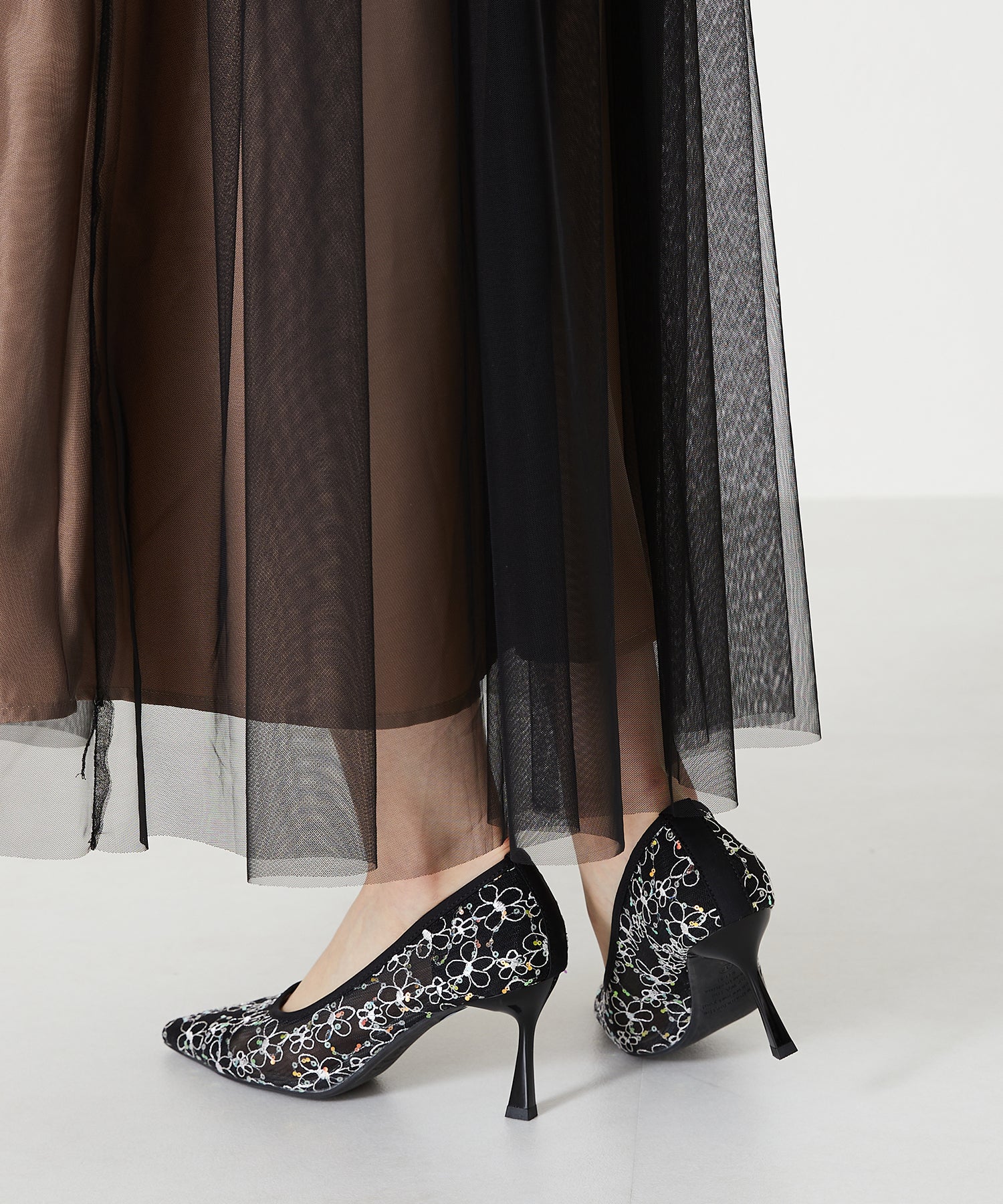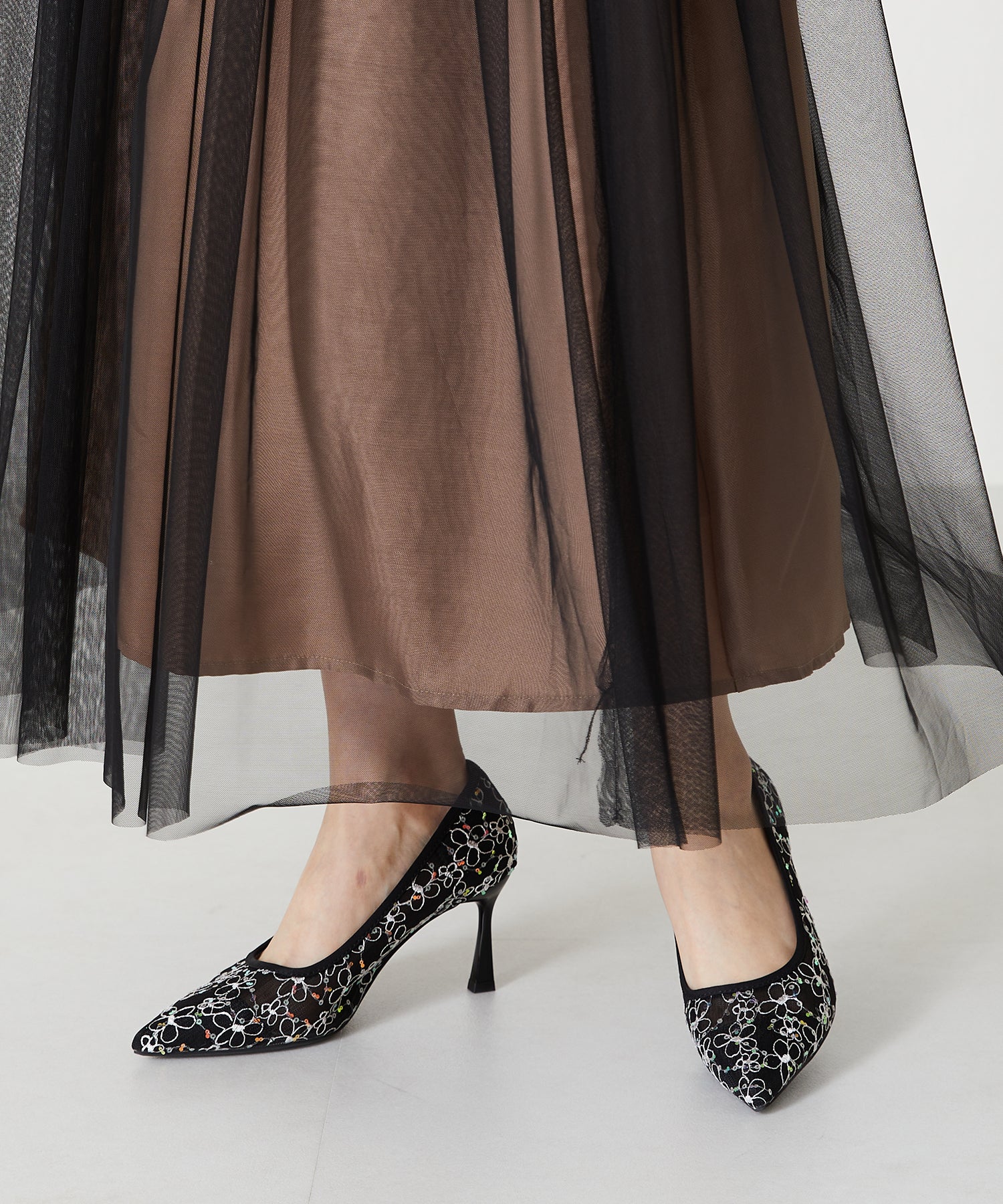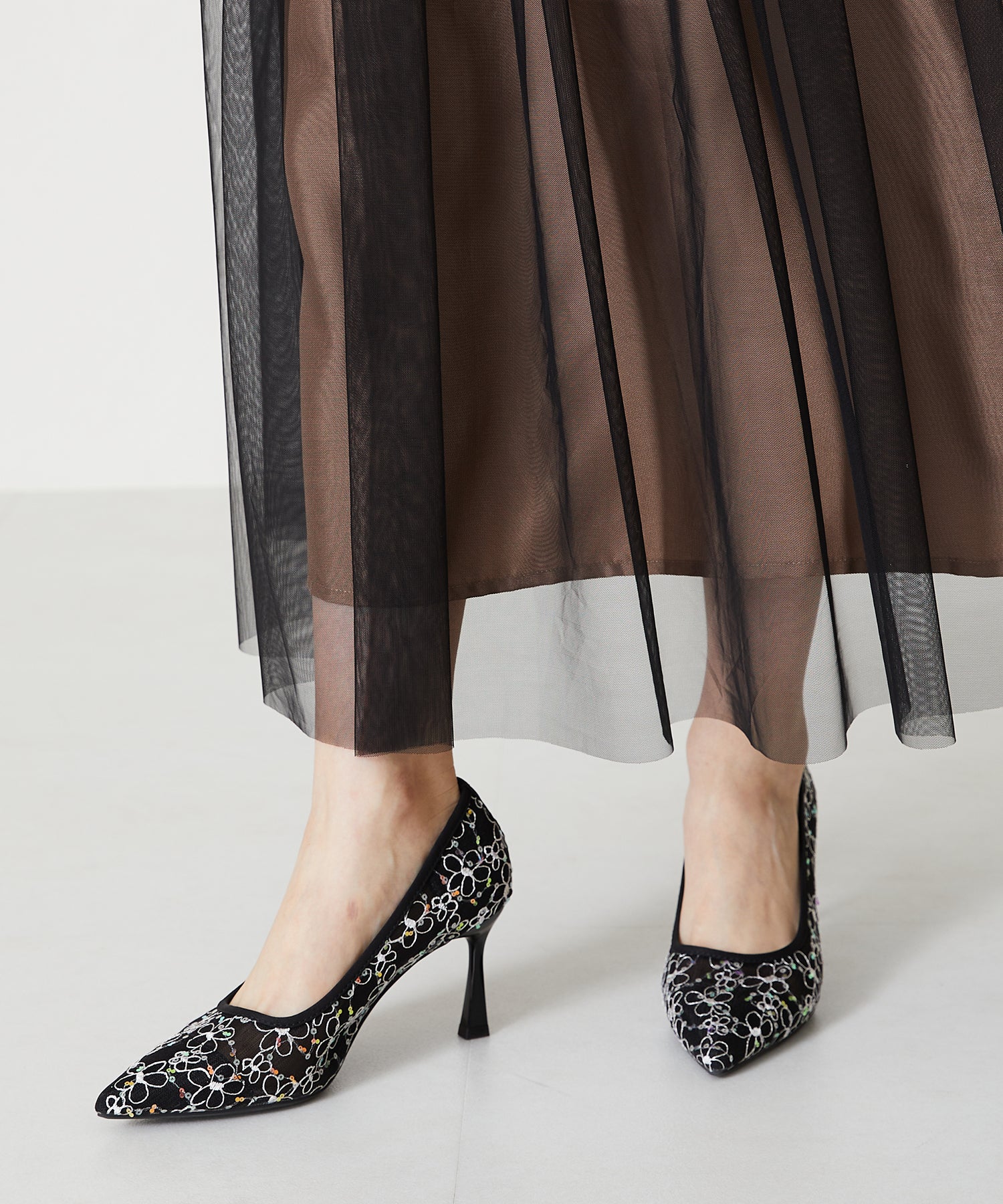 フラワーデザインの刺繍と散りばめられたスパンコールが可愛らしいレディライクな主役級パンプス。透け感のあるチュール素材なのでピンクやグリーンなど、カラーアイテムも肌馴染みが良く、取り入れやすい。ポインテッドトゥと華奢なヒールがすっきりとしたシルエットで甘くなりすぎず、大人の女性にもぴったり。サテン生地のパイピングでメリハリのある足元に。
