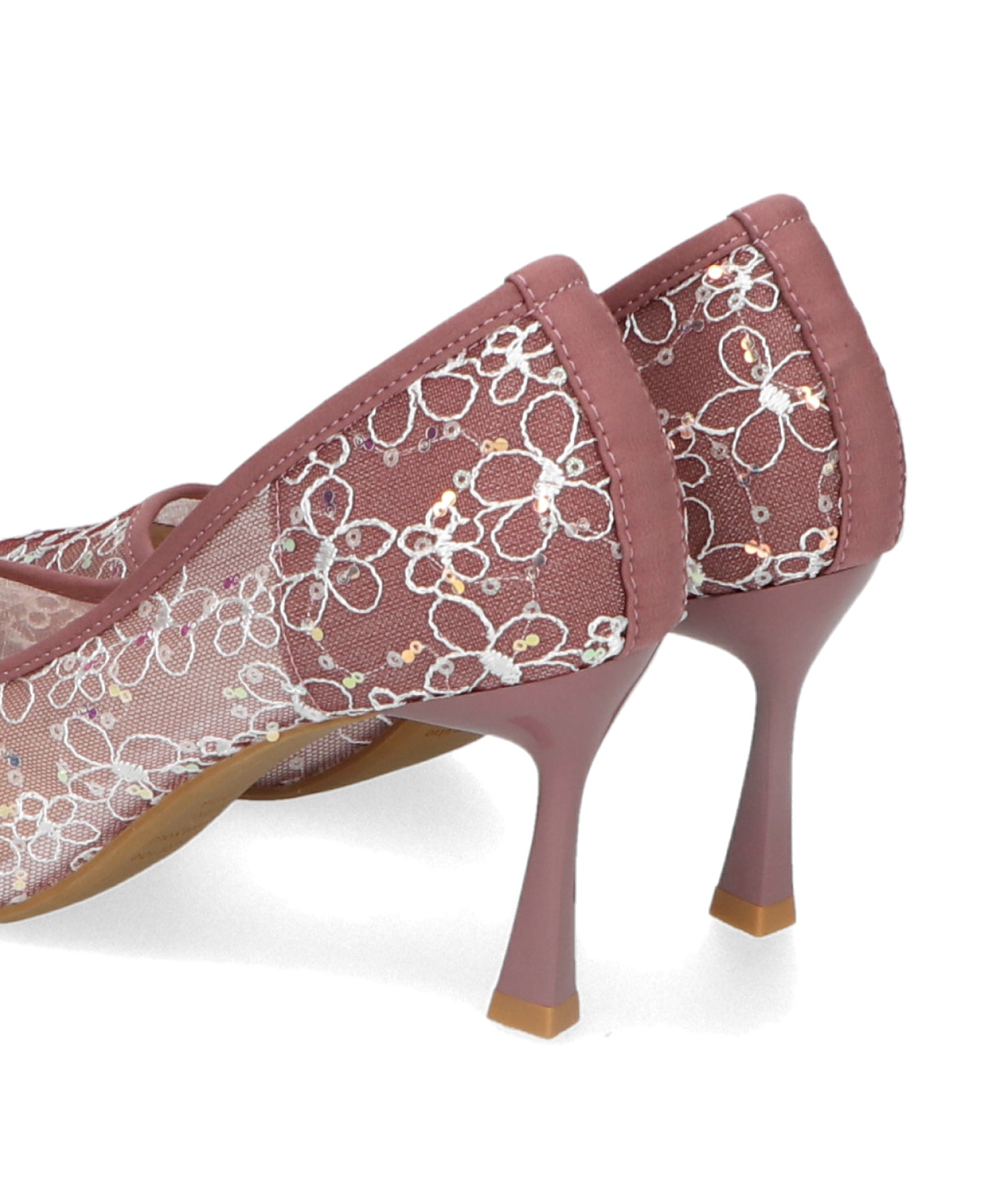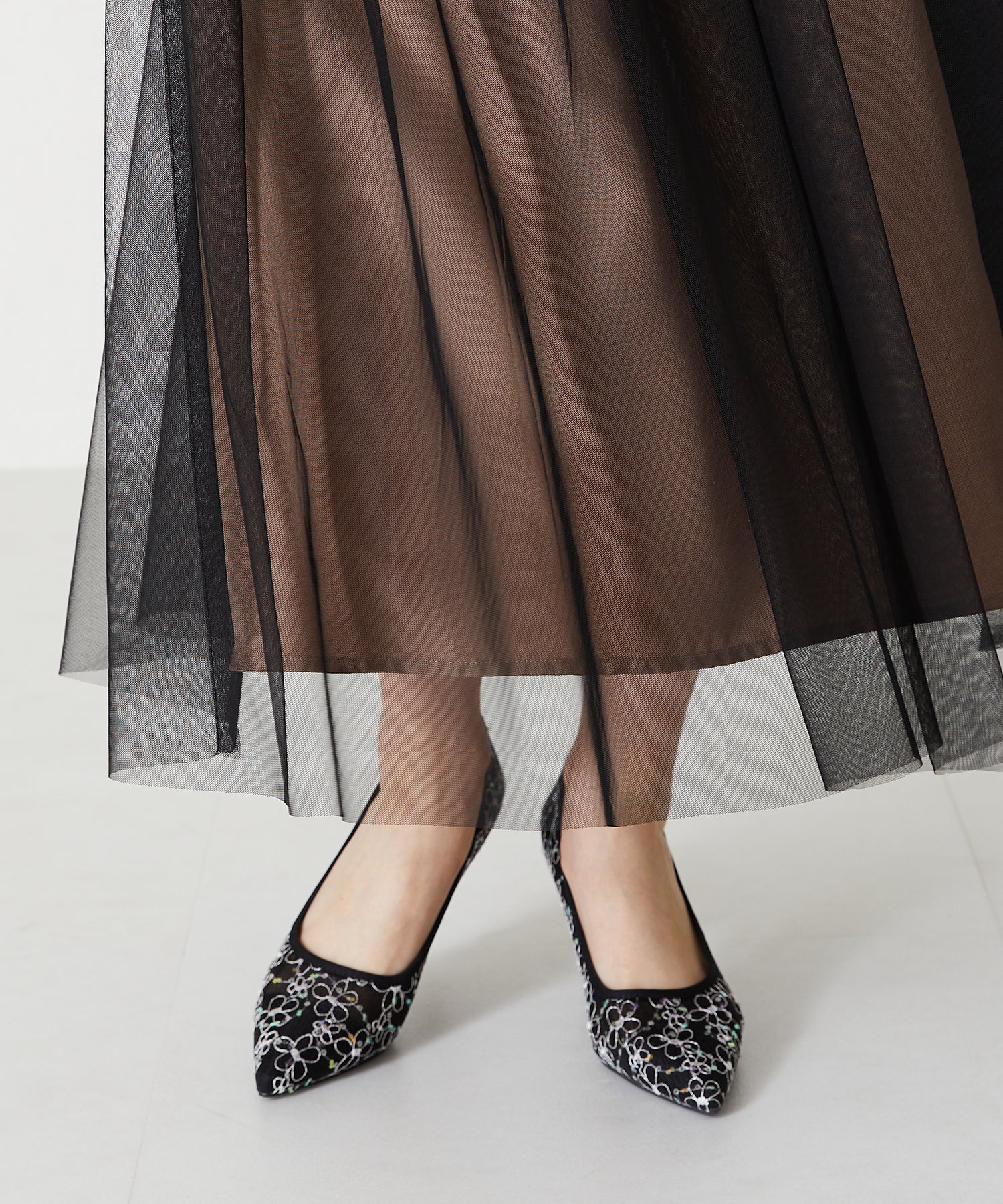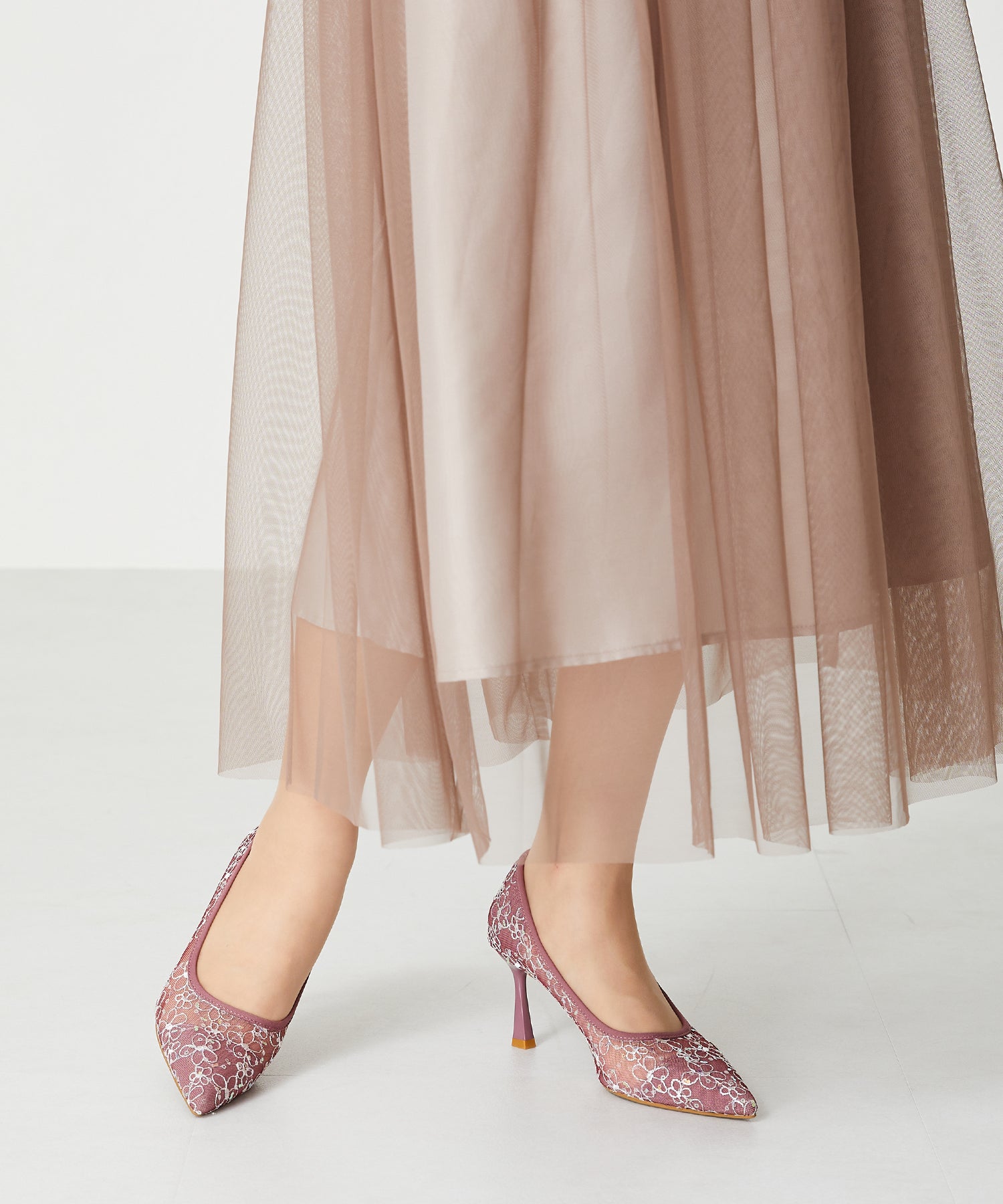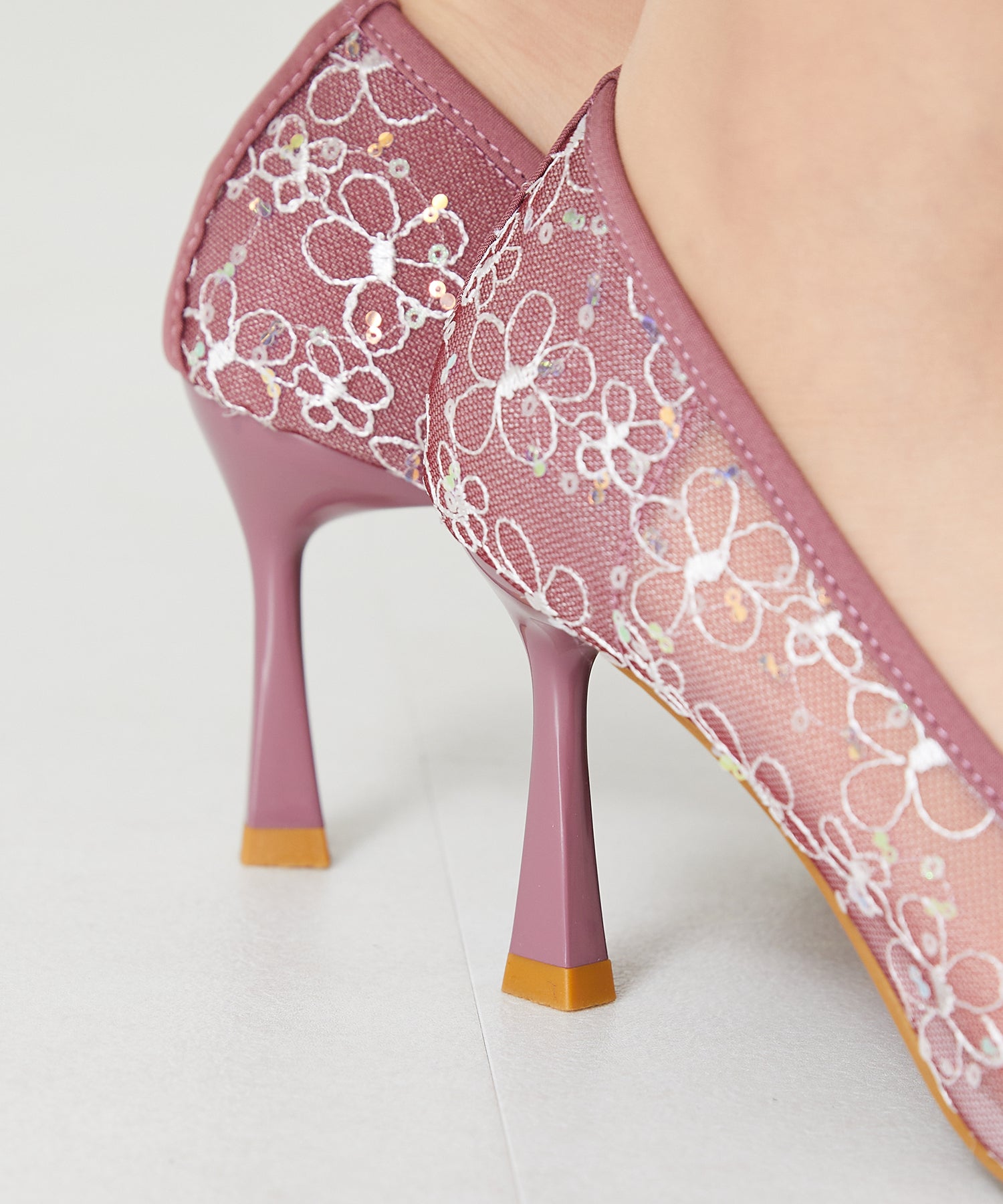 フラワーデザインの刺繍と散りばめられたスパンコールが可愛らしいレディライクな主役級パンプス。透け感のあるチュール素材なのでピンクやグリーンなど、カラーアイテムも肌馴染みが良く、取り入れやすい。ポインテッドトゥと華奢なヒールがすっきりとしたシルエットで甘くなりすぎず、大人の女性にもぴったり。サテン生地のパイピングでメリハリのある足元に。