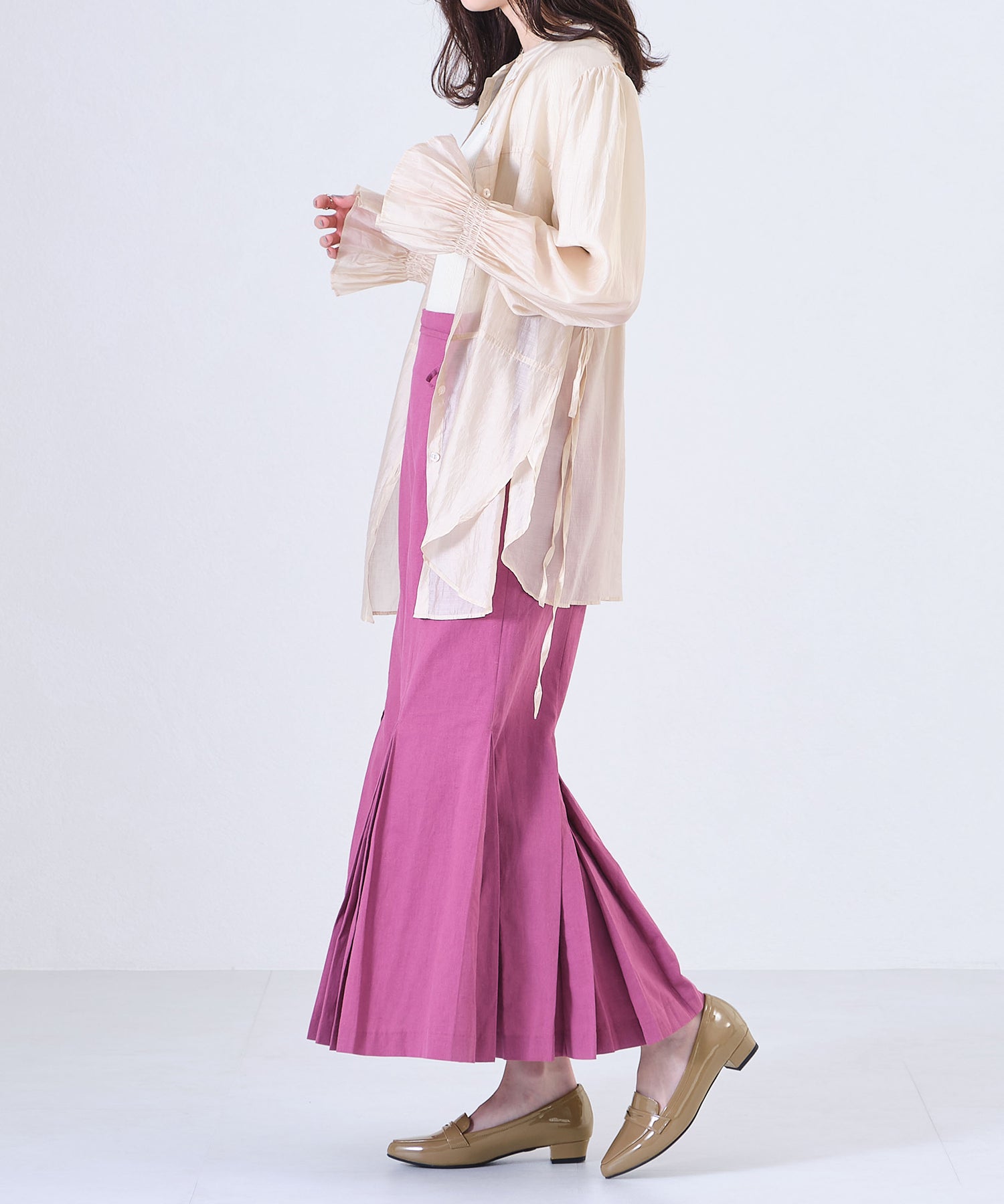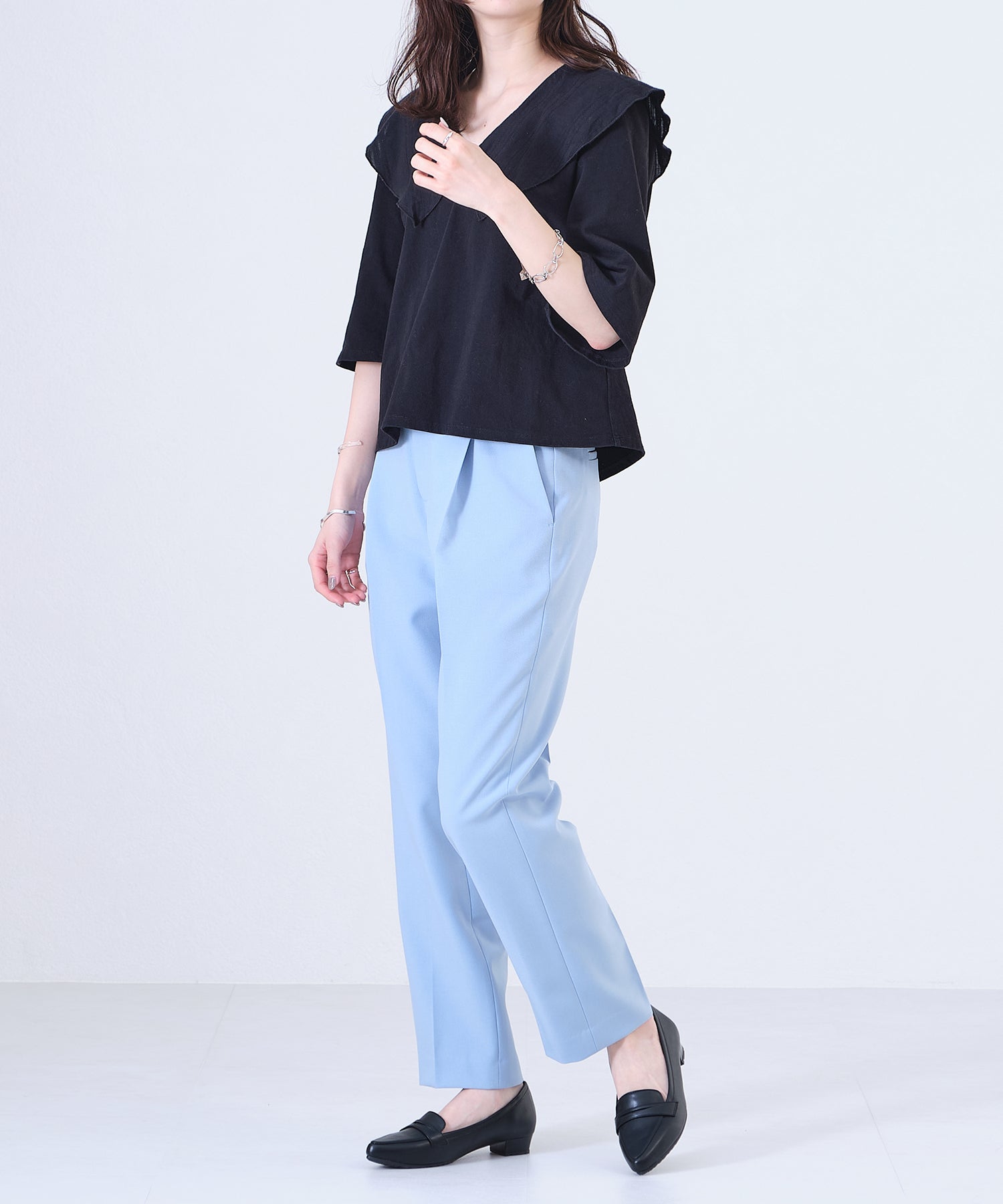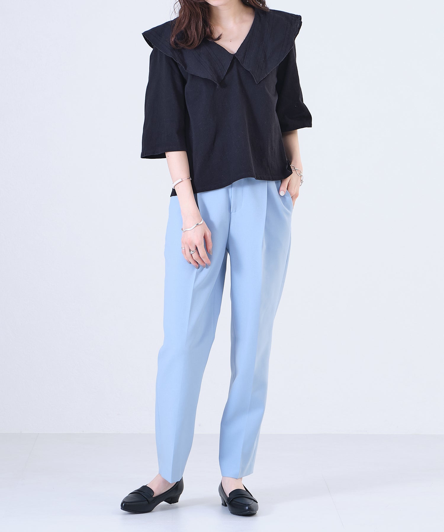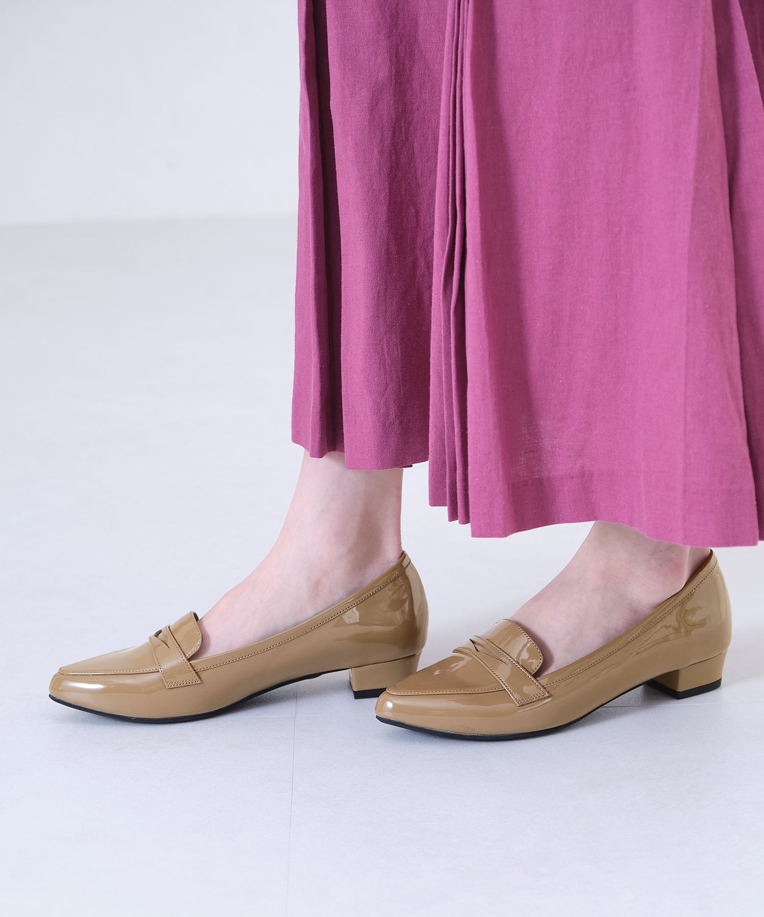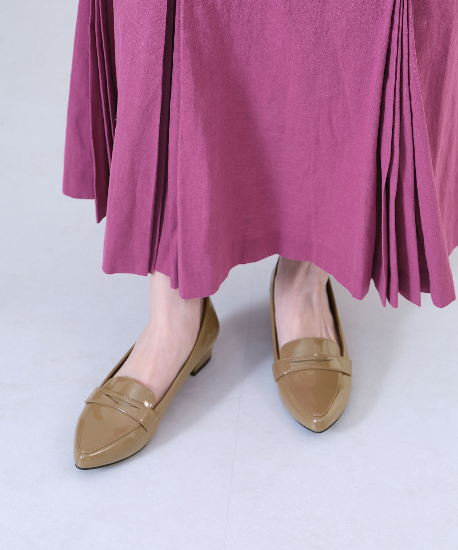細身のポインテッドトゥが足元をすっきり見せてくれるオペラパンプスは、ローファーデザインで程良くカジュアルダウン。少し浅めの履き口でボトムを選ばず、幅広いコーディネートに合わせられる優れもの。ブラックのみマットなスムース素材にすることで、より使いやすい仕様に。ベーシックカラーに加え、新鮮なくすみグリーンも魅力的。
