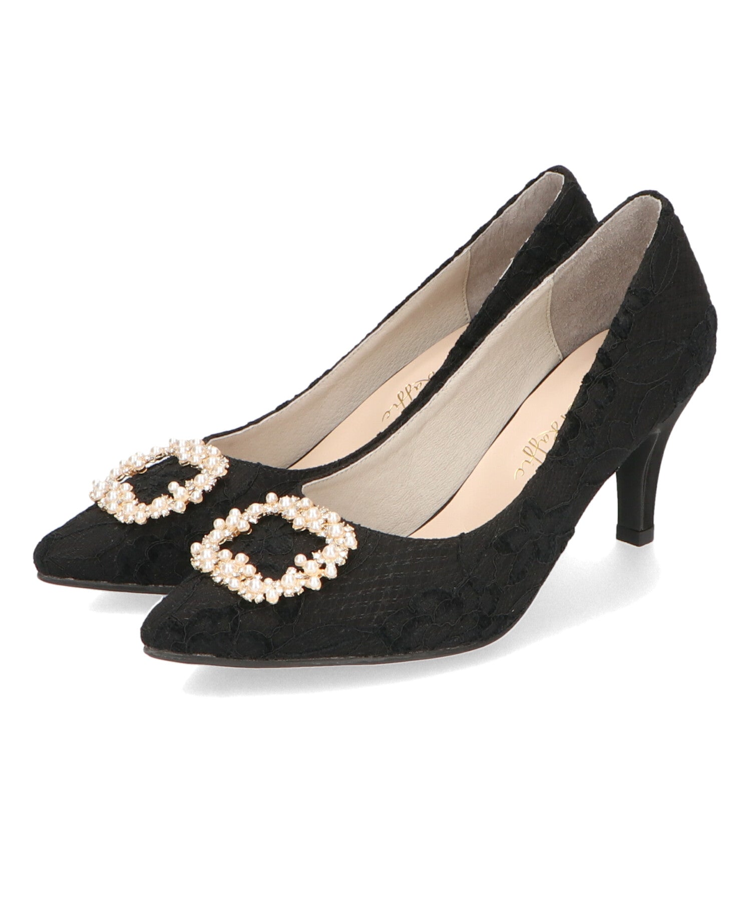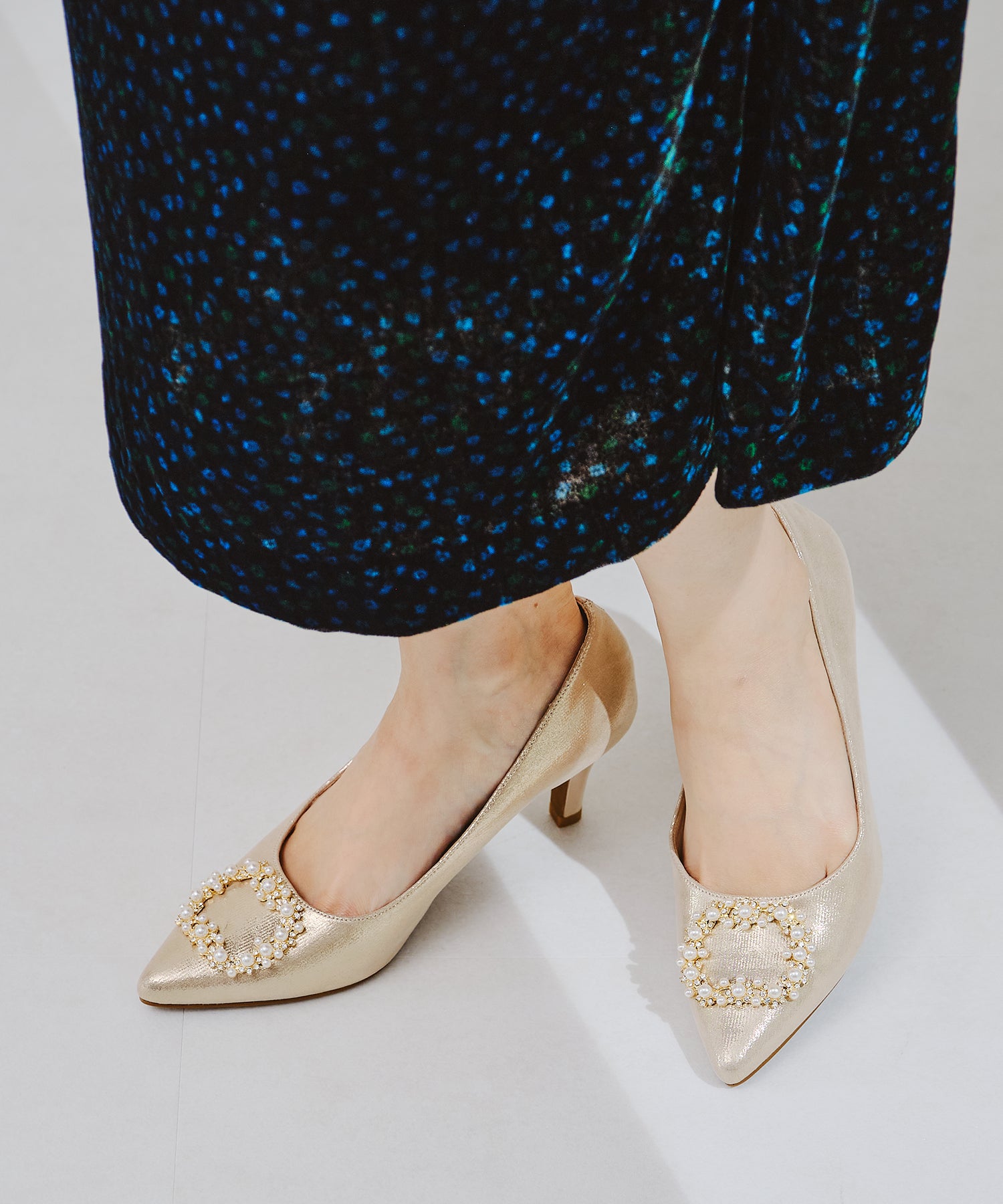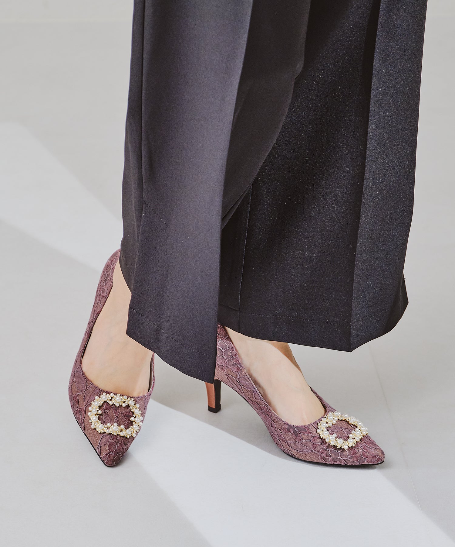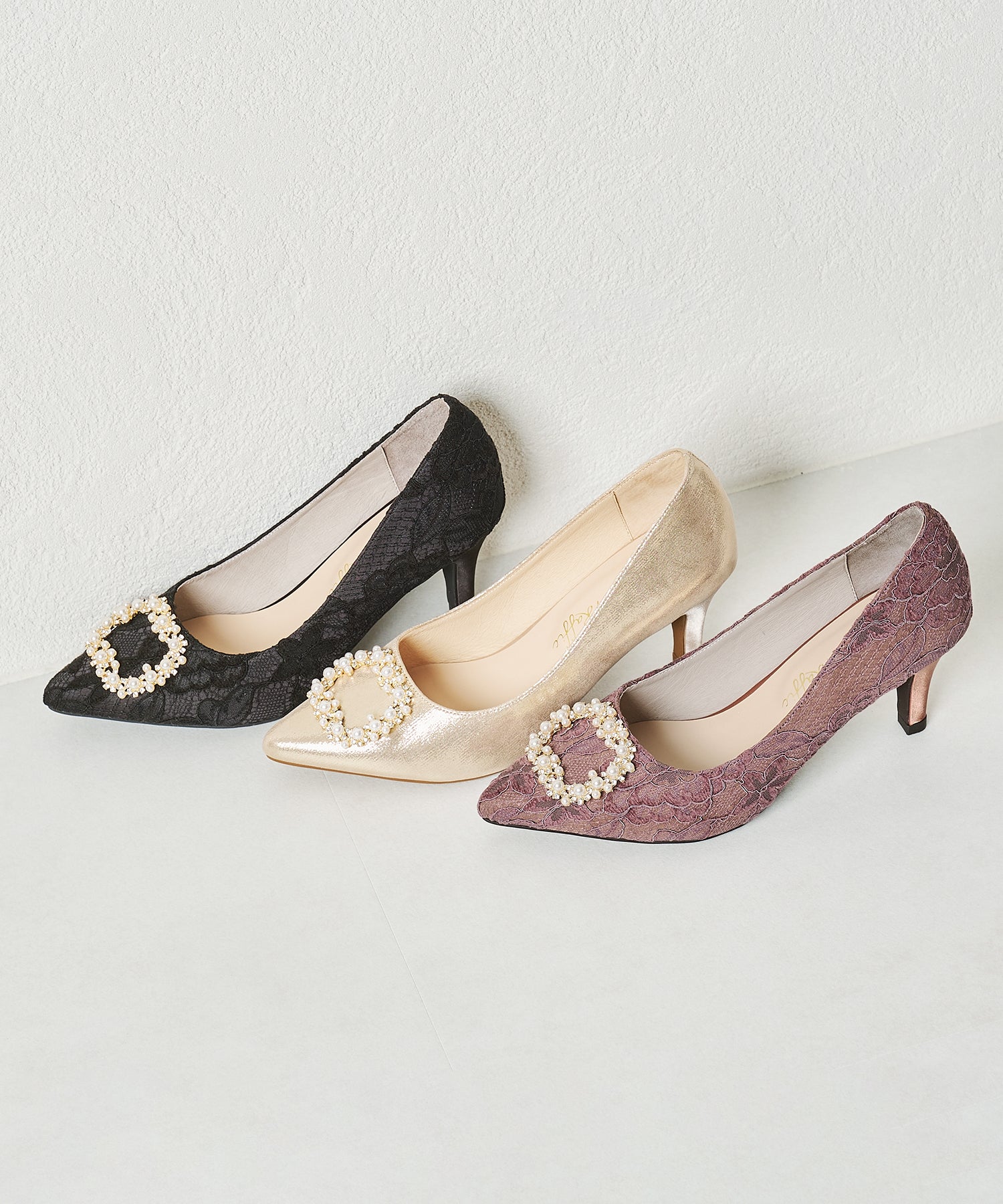 シャープなポインテッドトゥにパール×ビジューのスクエアバックルをあしらったドレッシーな1足。ランダムに配置した小粒のパールとクリアビジューを使用したモチーフで女性らしい足元に。カラーによってラメ素材やレース素材など、シーン別で選べる3色展開。フロントの華やかさにマッチしたサテンヒールで360度どこから見ても美しいディテールがこだわりポイント。お祝いの席など、お呼ばれシーンで華やかな足元を演出。