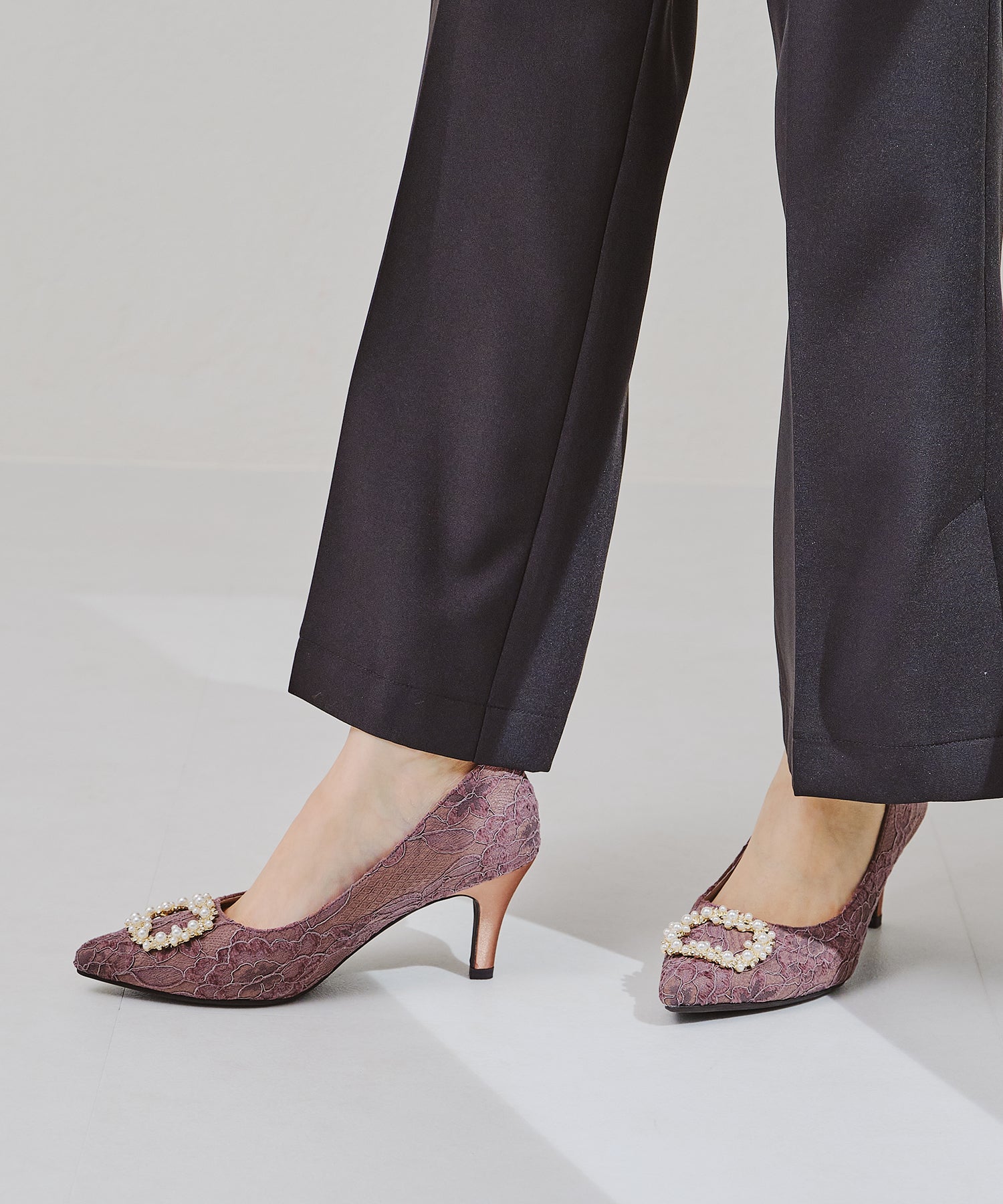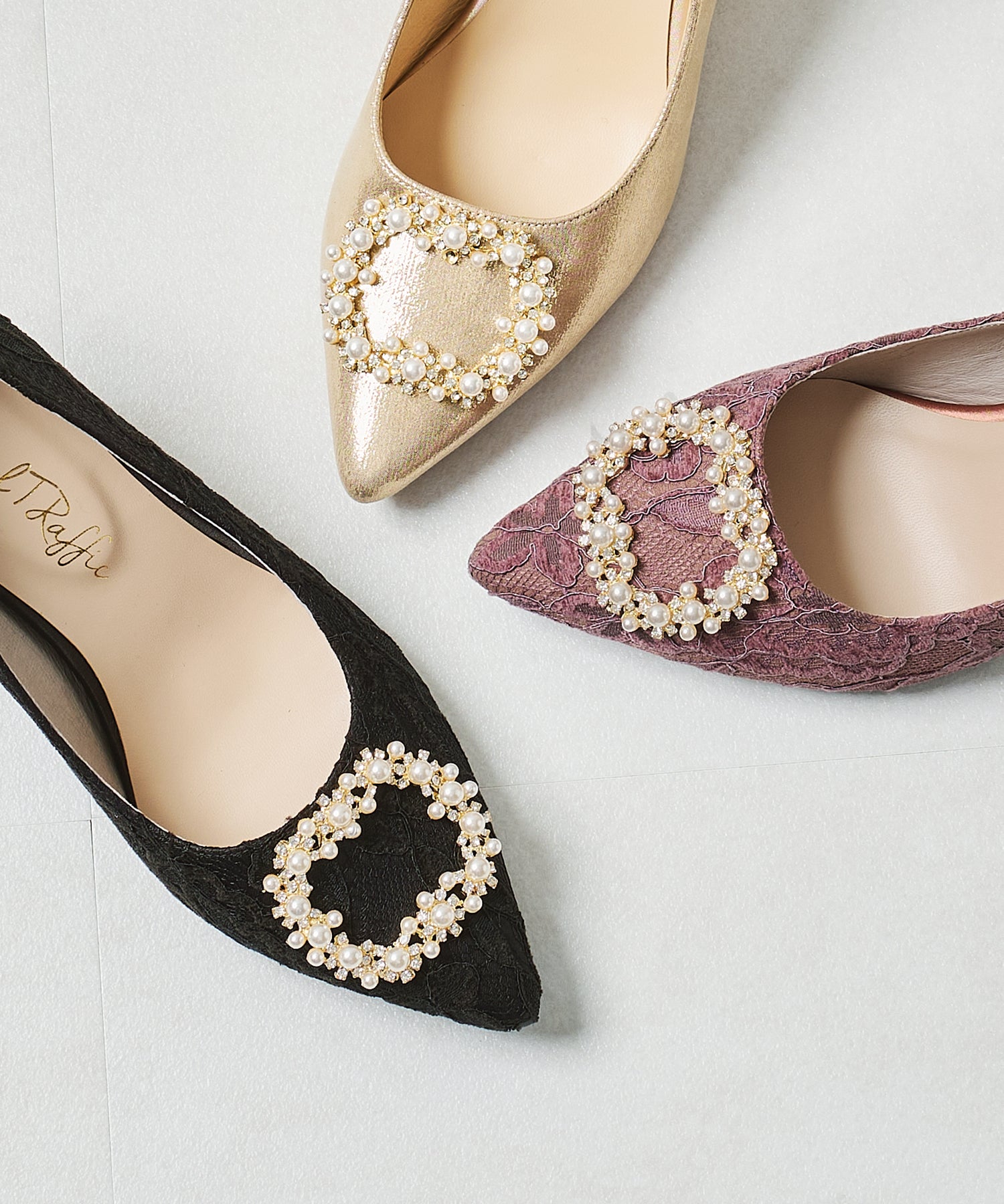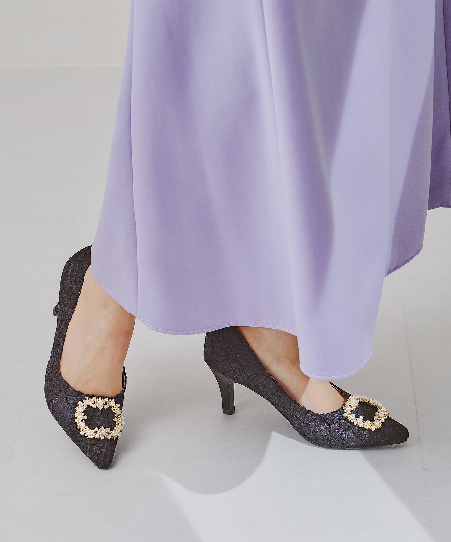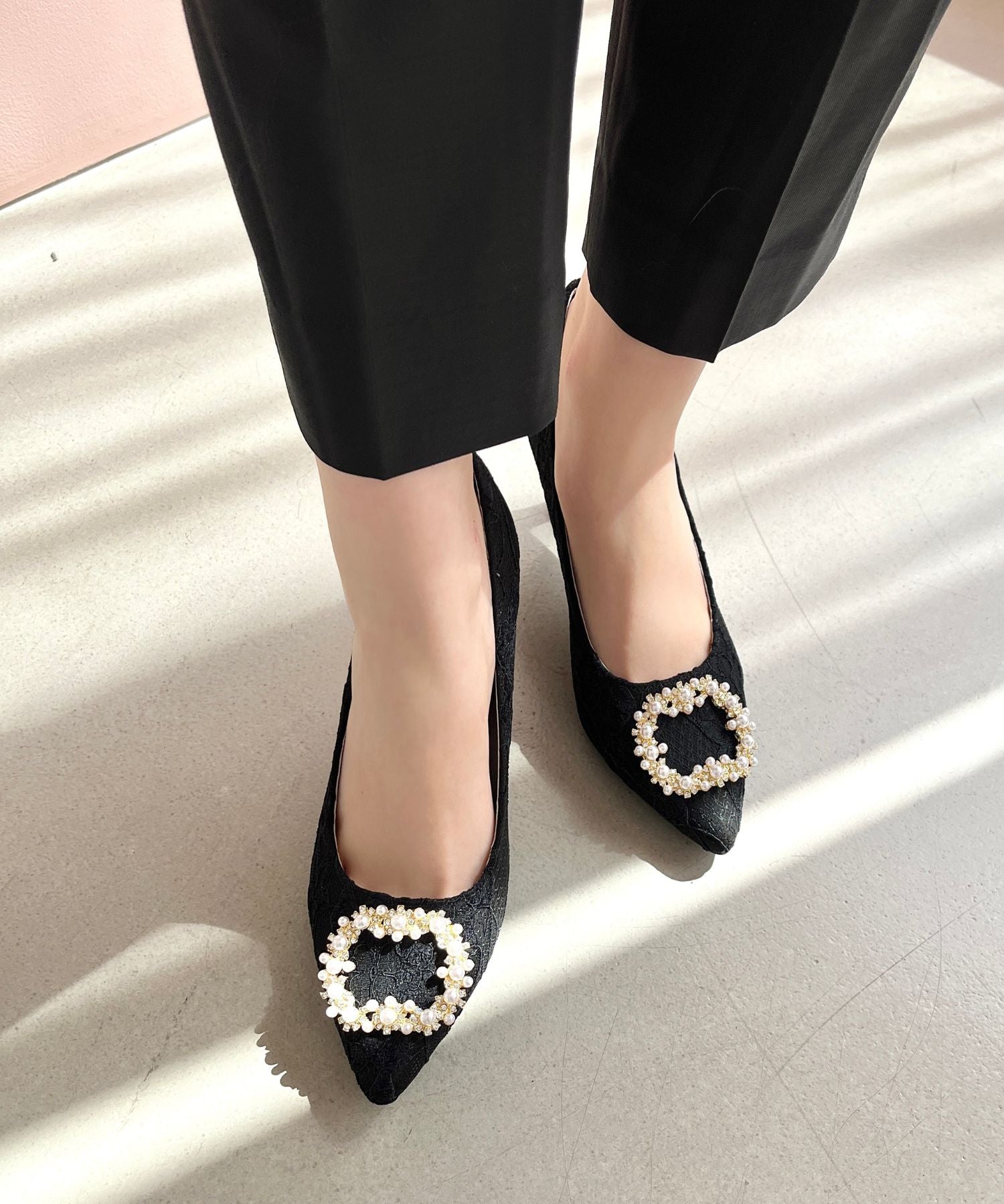 シャープなポインテッドトゥにパール×ビジューのスクエアバックルをあしらったドレッシーな1足。ランダムに配置した小粒のパールとクリアビジューを使用したモチーフで女性らしい足元に。カラーによってラメ素材やレース素材など、シーン別で選べる3色展開。フロントの華やかさにマッチしたサテンヒールで360度どこから見ても美しいディテールがこだわりポイント。お祝いの席など、お呼ばれシーンで華やかな足元を演出。