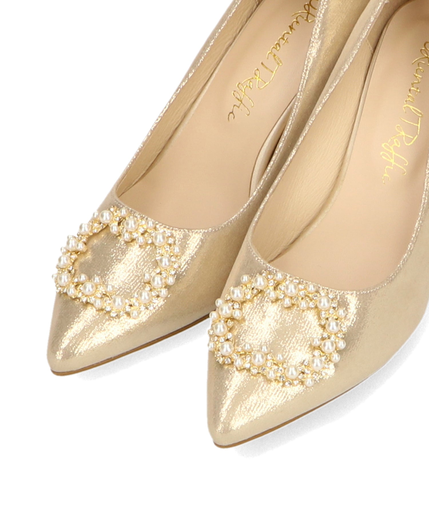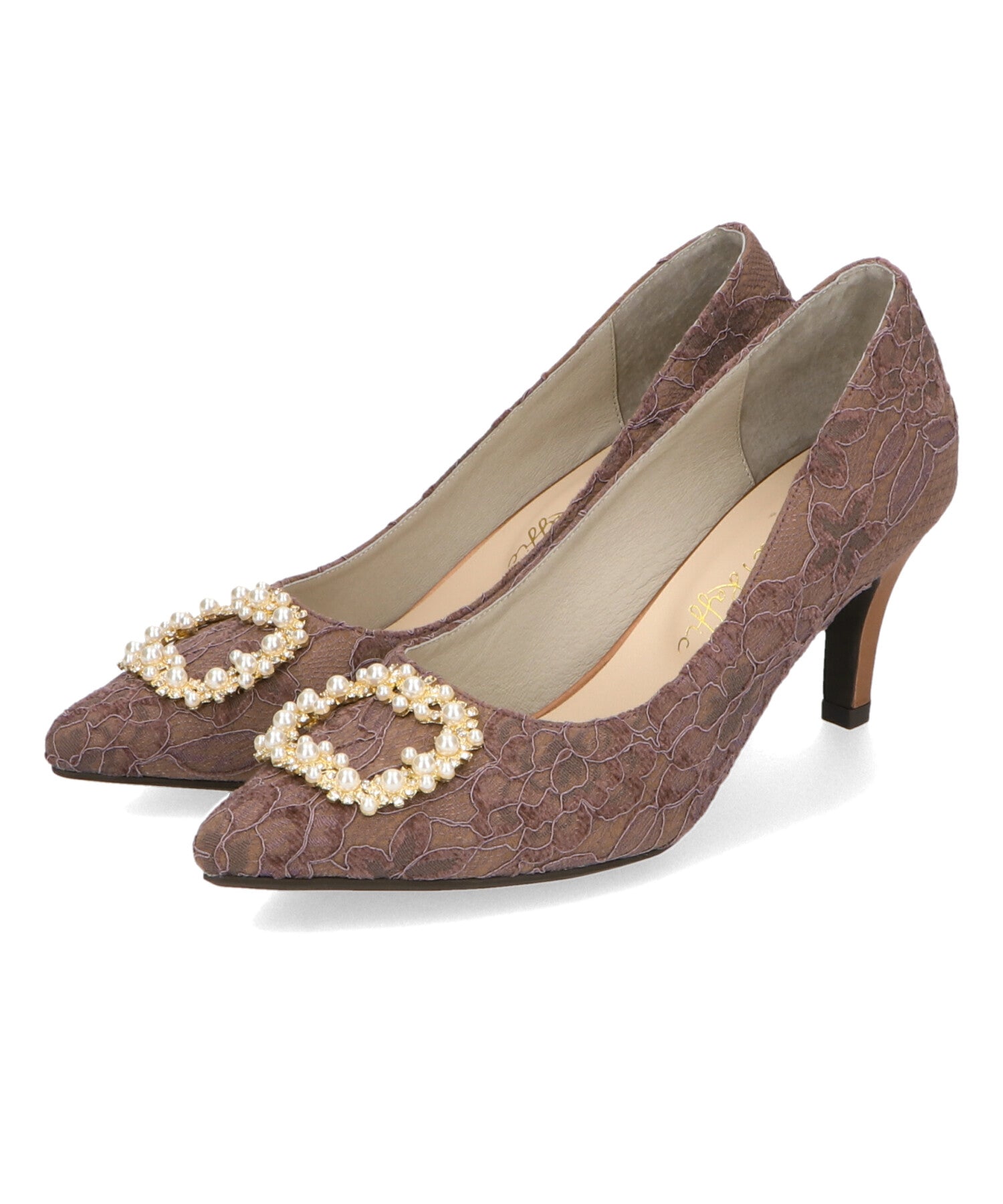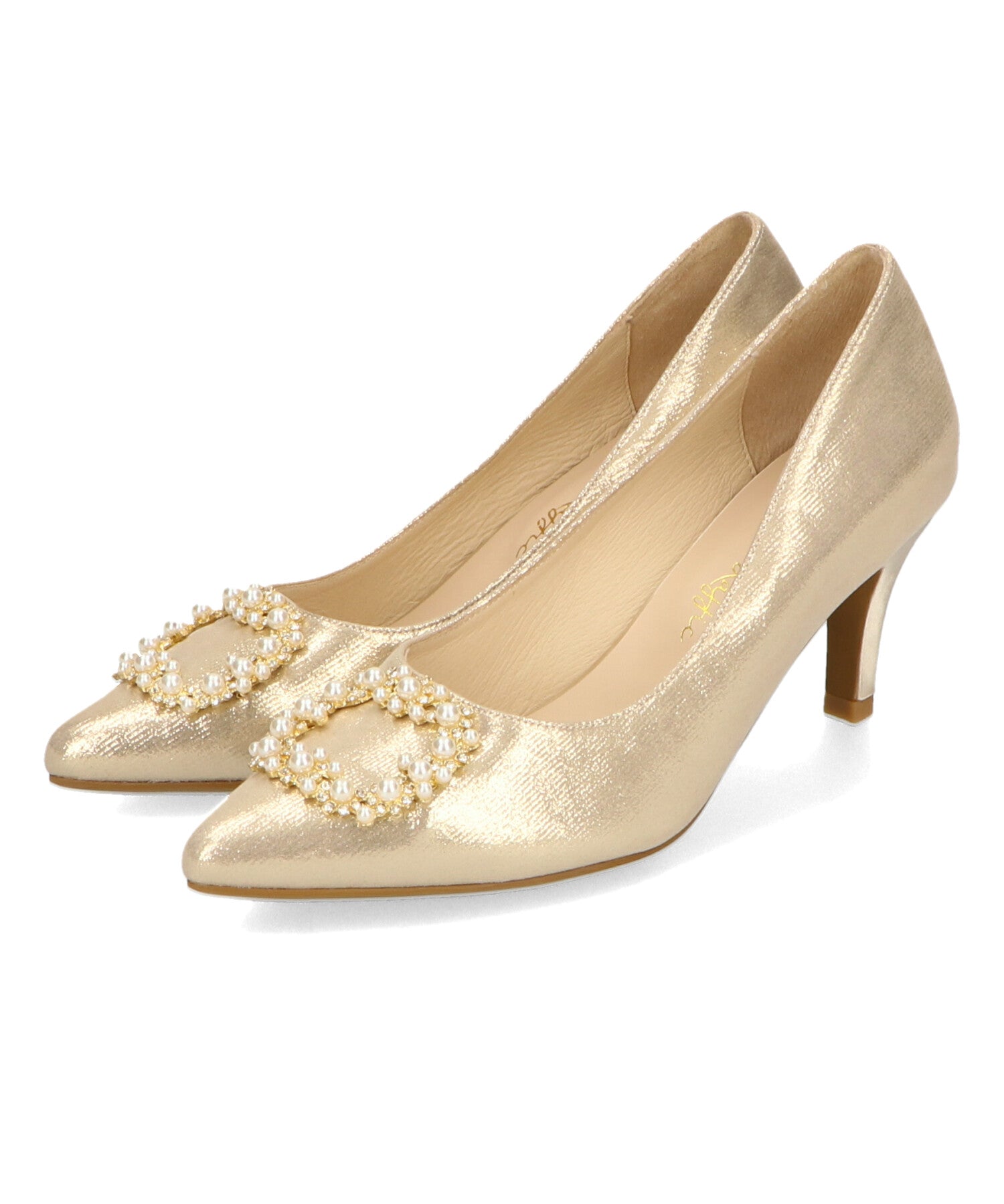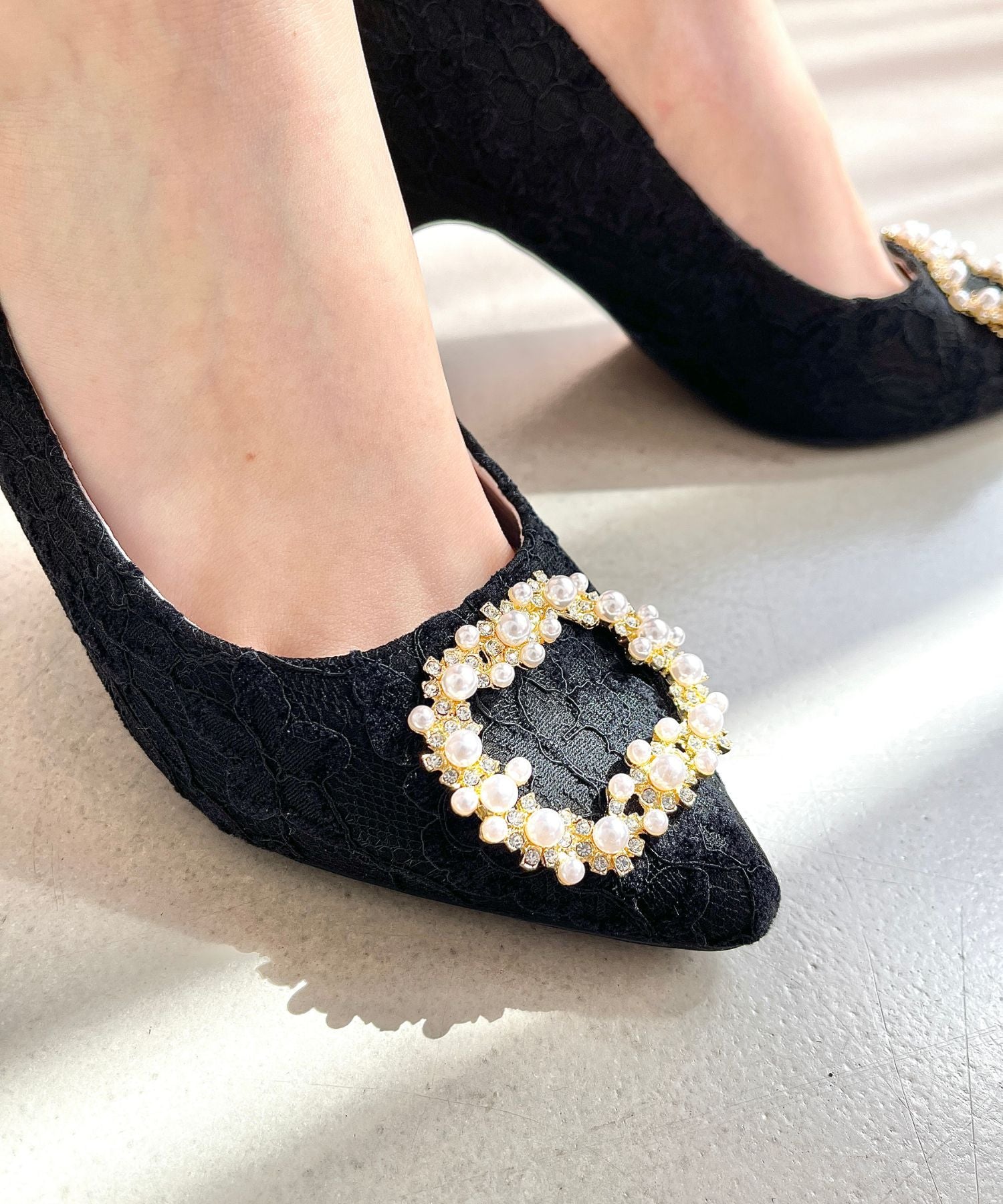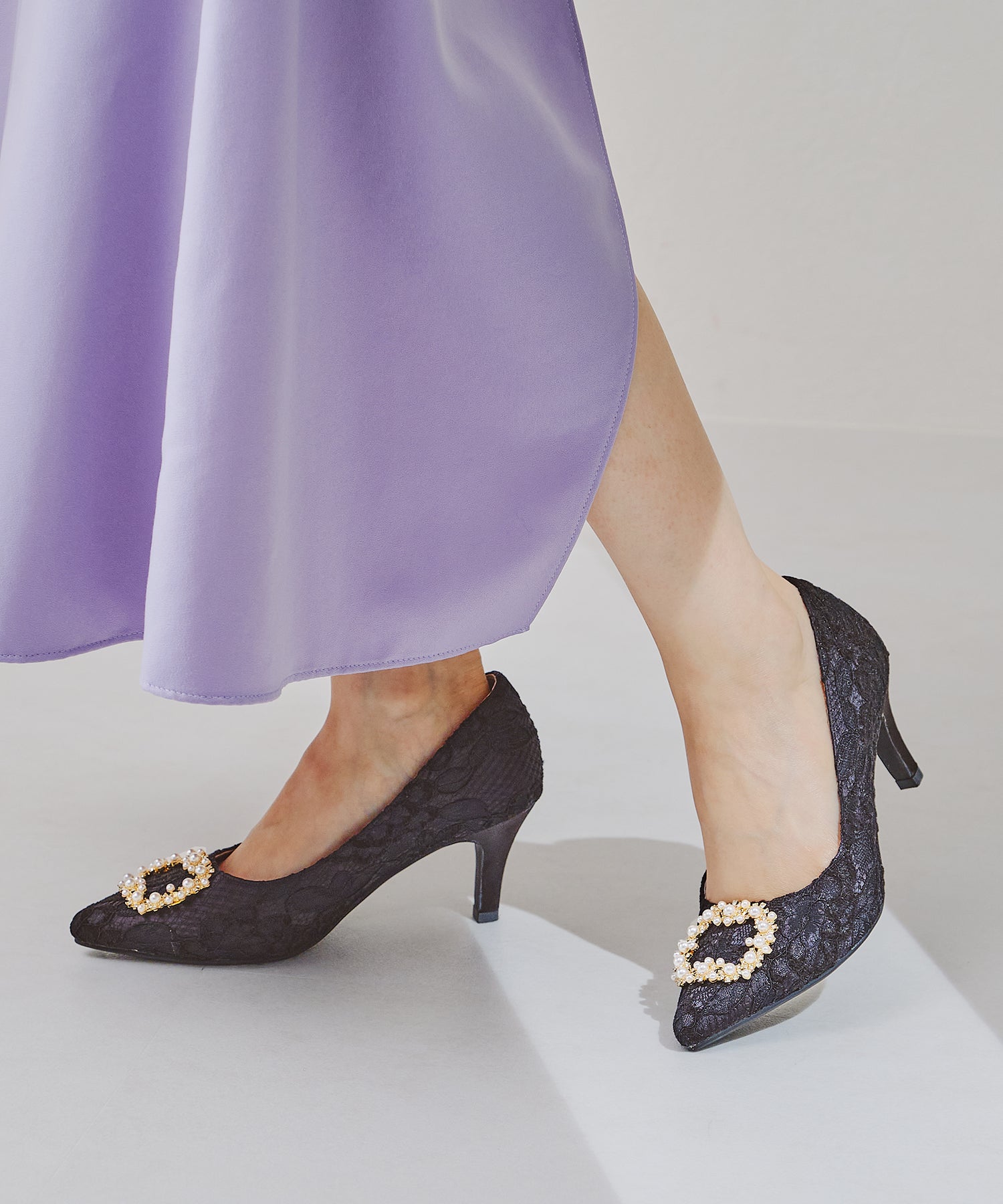シャープなポインテッドトゥにパール×ビジューのスクエアバックルをあしらったドレッシーな1足。ランダムに配置した小粒のパールとクリアビジューを使用したモチーフで女性らしい足元に。カラーによってラメ素材やレース素材など、シーン別で選べる3色展開。フロントの華やかさにマッチしたサテンヒールで360度どこから見ても美しいディテールがこだわりポイント。お祝いの席など、お呼ばれシーンで華やかな足元を演出。