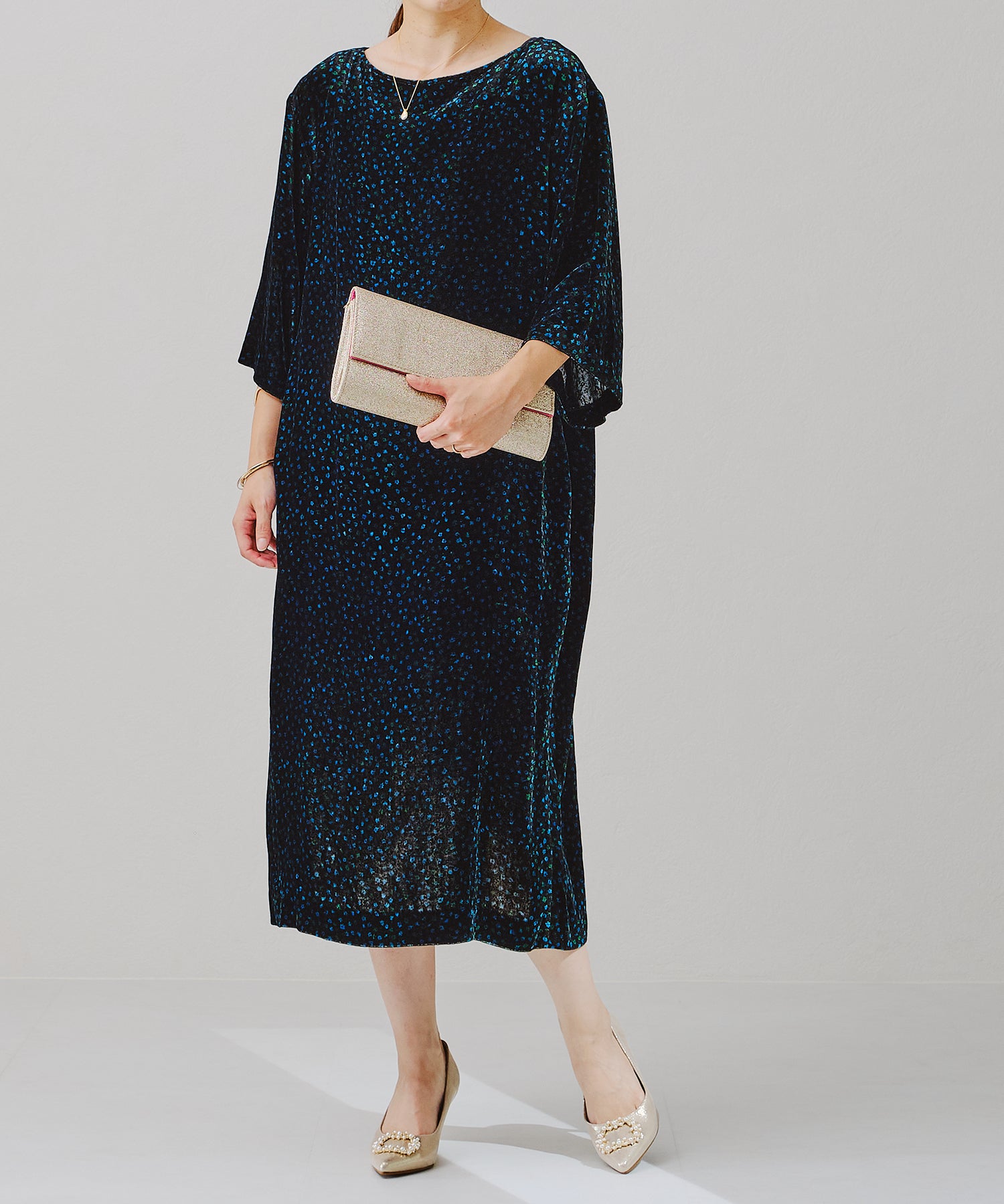 素材の種類:レース生地(ナイロン、レーヨン)、ゴールド→ラメプリント生地(レーヨン)