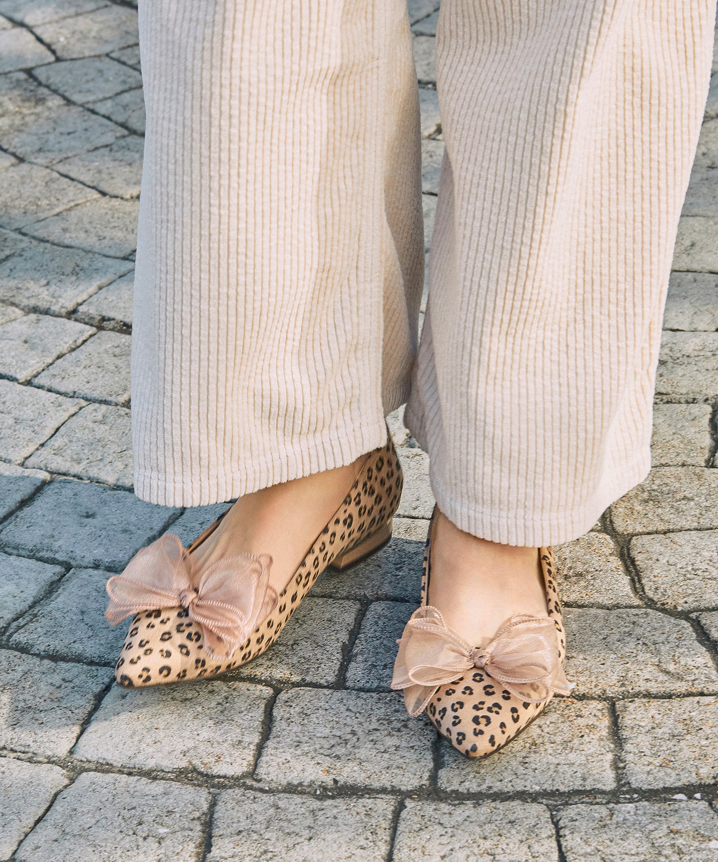 大ぶりのチュールリボンがフェミニンライクなパンプスは、フラットヒールで気軽に取り入れやすいアイテム。シャープなポインテッドトゥですっきりしたシルエットに、ゴールドのメタリックラインを入れたヒールで女性心くすぐるディテールをポイントにプラス。ラメがさりげなく輝くブラックとピンクに加え、小ぶりのレオパード柄をあしらったブラウンは足元に映える今季注目のカラー。