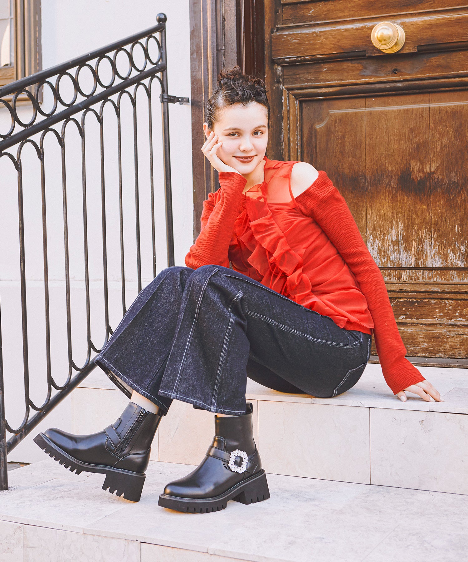サイドに輝く大ぶりのビジューが目を引くトレンドライクなブーツは、エレガンスな雰囲気ながらも厚底でカジュアルダウンさせた旬なアイテム。筒まわり部分を柔らかくした優しい履き心地が魅力的。高低差が少ないボリュームソールで長時間歩いても疲れにくいのも嬉しいポイント。注目のブラウンは明るめの色味でスタイリングを一気に格上げしてくれるカラー。